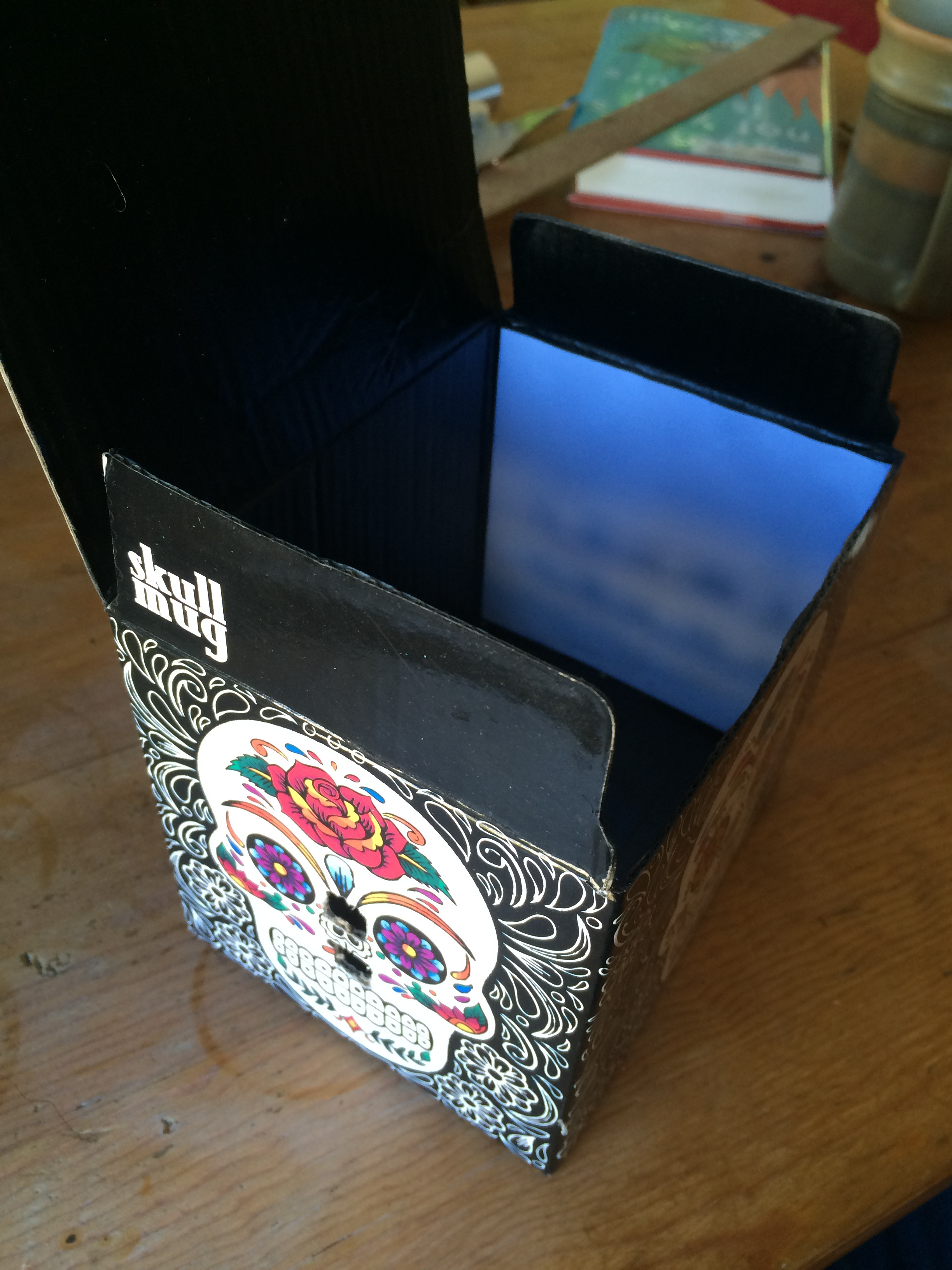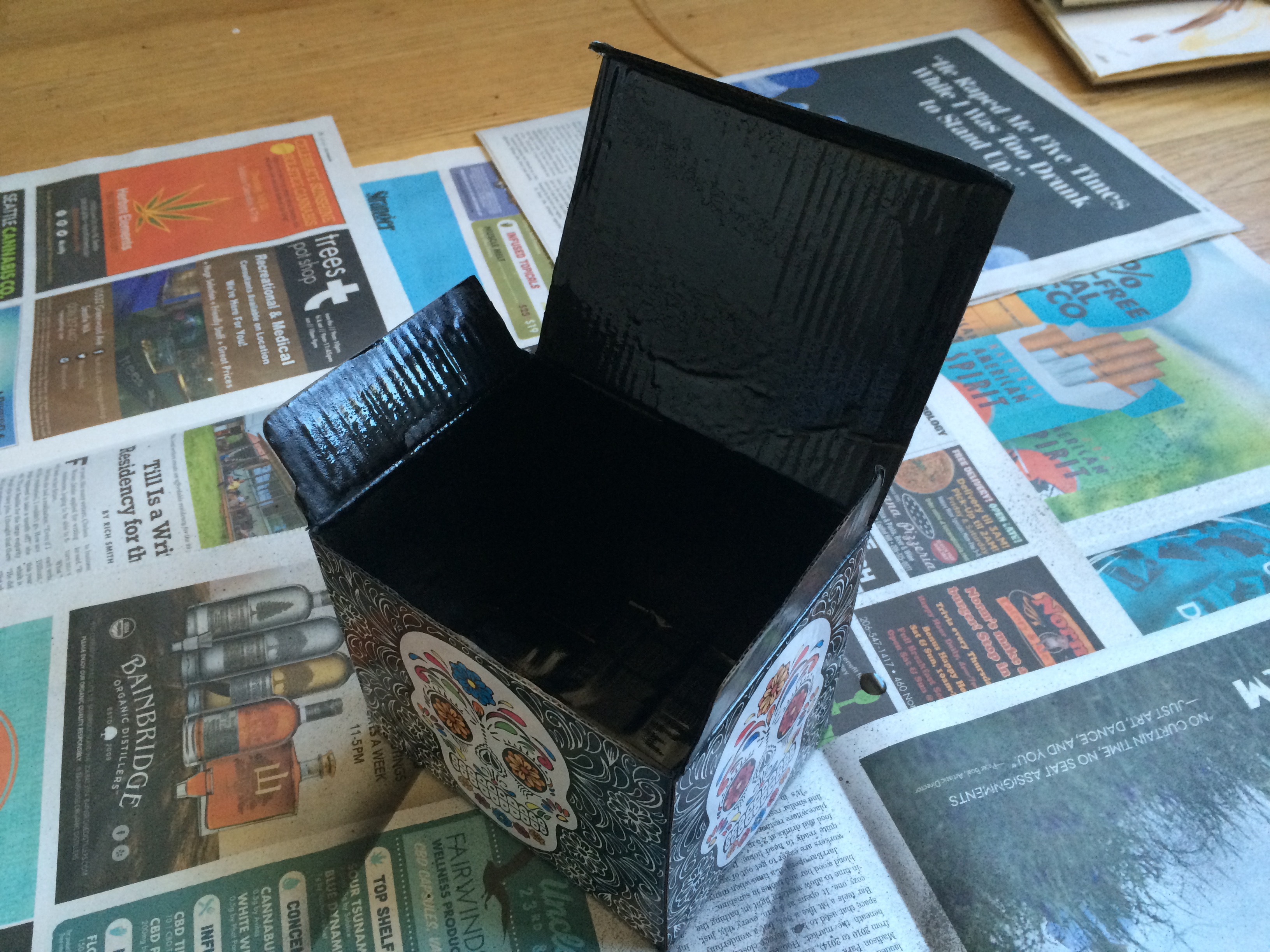 For an effective camera, there should be no internal reflections. Paint the inside black and seal up all the cracks (I used black electrician's tape). Paint the internal wall facing the pinhole white, to form your projection screen - or glue in a square of white cardboard.