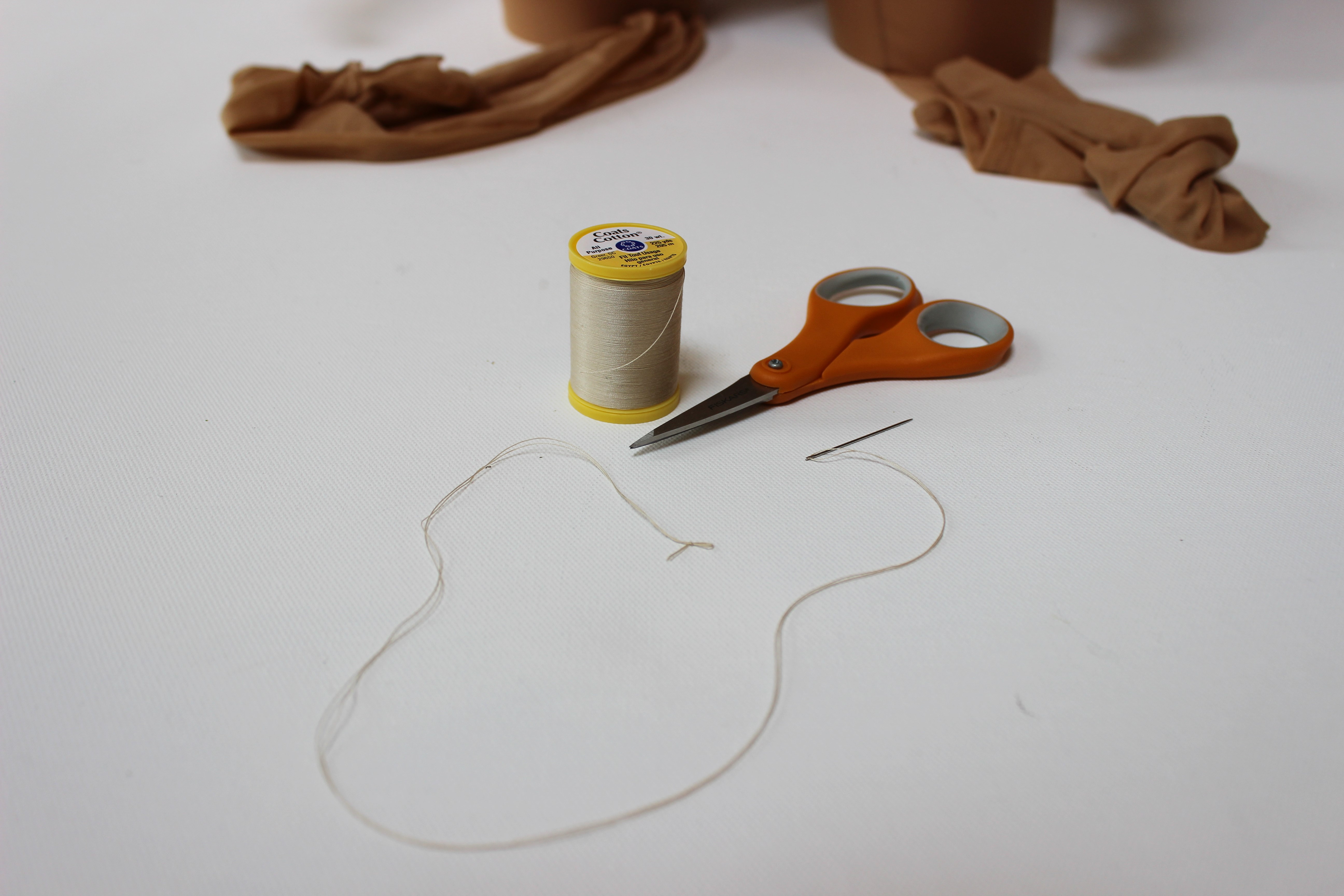 Cut a piece of nude thread. I like to use a piece that is from my finger tips to my nose or approximately three feet. Thread the needle and then match to two ends up and tie a basic knot. Use a basic running stitch to go all the way around the molded cup. You can use a different stitch if you like but a running stitch will suffice. As you may have noticed in the pictures, I did not follow the same distance all the way around the edge. I followed along the edge until the bodysuit was not naturally making contact with the molded bra cup. To not disturb the way the bodysuit natural lays on the form, I followed the line of contact between the bodysuit and the molded cup. When you return to where you started, tie a knot and trim away the excess thread.