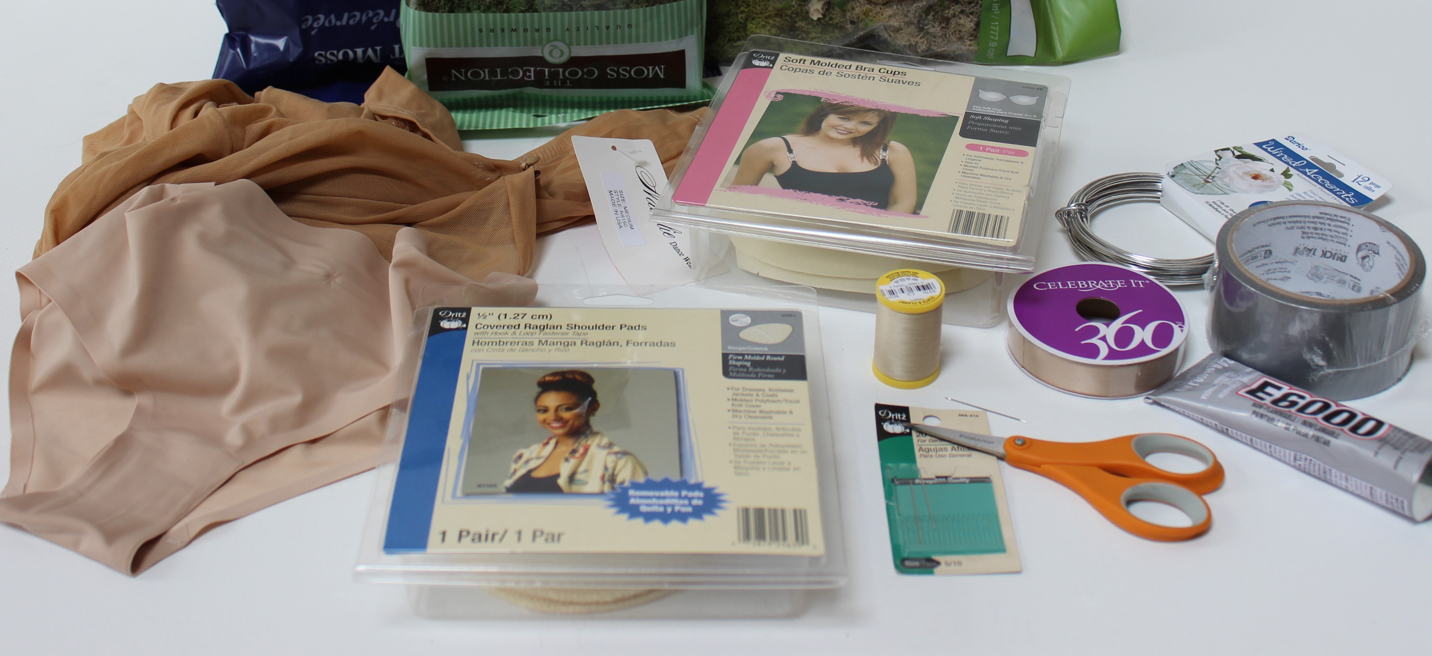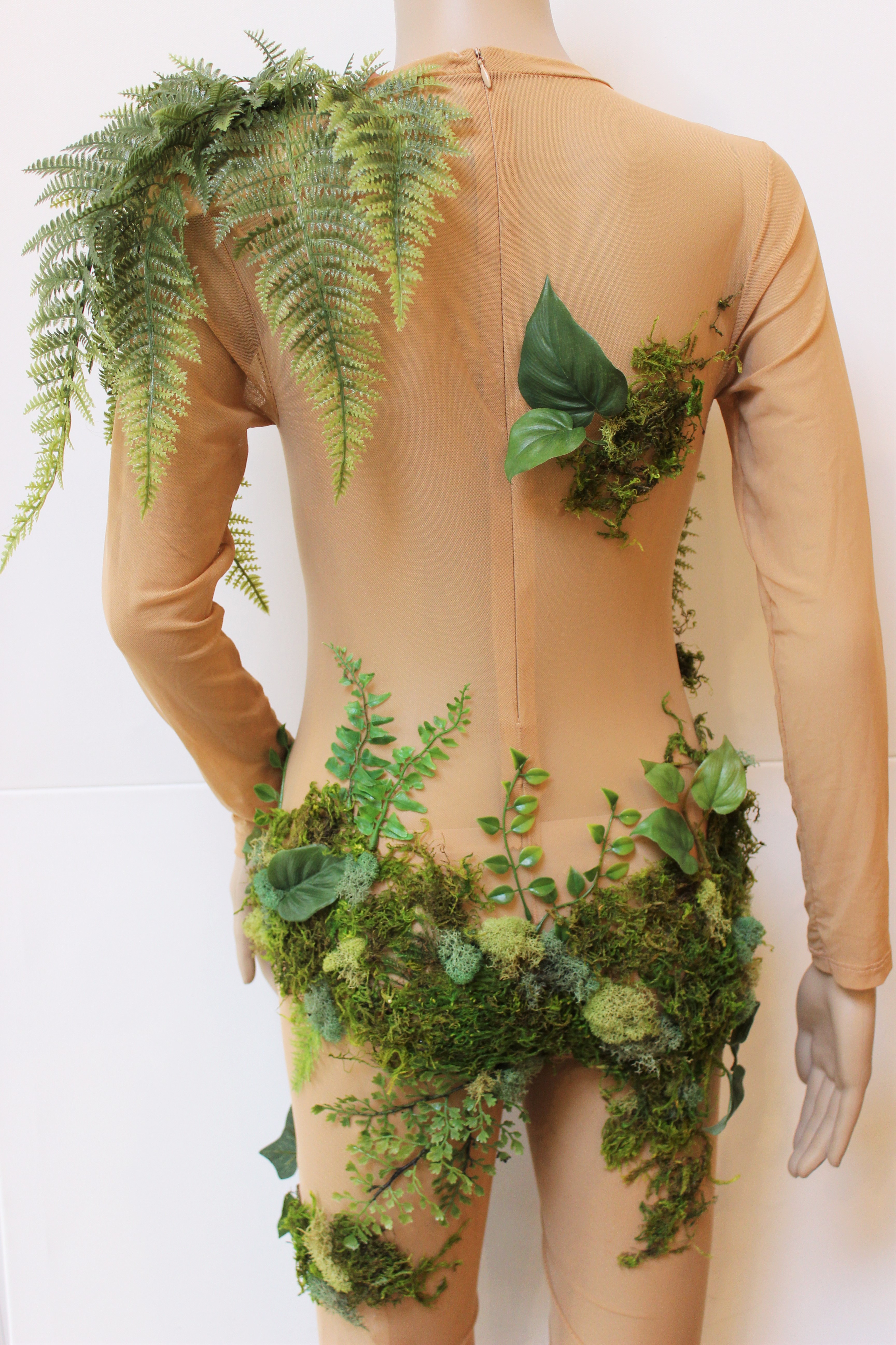 Moss comes in a variety of colors and varieties. Since many of them are colored, I would suggest looking for one that says it wont bleed the color. I got one large bag of plain green moss and a medium variety bag.I still had a lot left over to go towards making shoes and a purse to coordinate. I personally liked the look of having a mix of mosses. There are many ferns and other leafy greens you can use. I really like ivy and it is particularly fitting for this bodysuit. One thing to look for in the ferns are wired stems. It makes it much easier to get them to stay just were you want them.