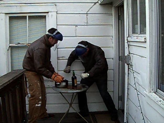 Using a heating element (in this case a gas stove) we heated the coil until it was glowing. Quickly looping it over the top of the bottle, Levi pulled the two ends straight and held it in place as tight as he could for a few seconds. Levi then released the tension and let it drop around the base of the neck. Jesse quickly wrapped the ice-filled towel around the bottle and the neck easily and cleanly broke off.