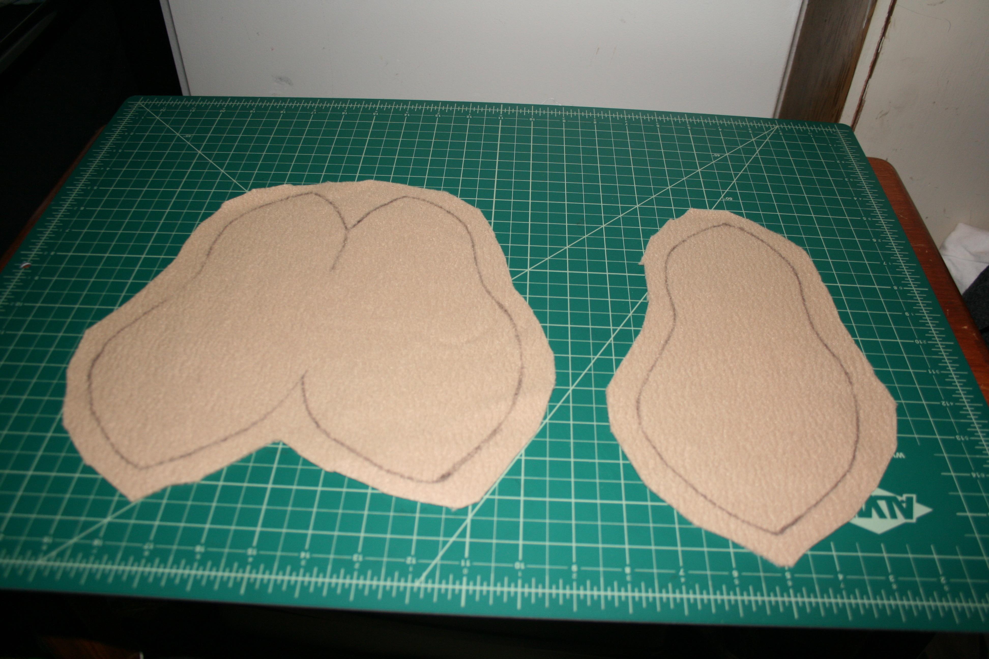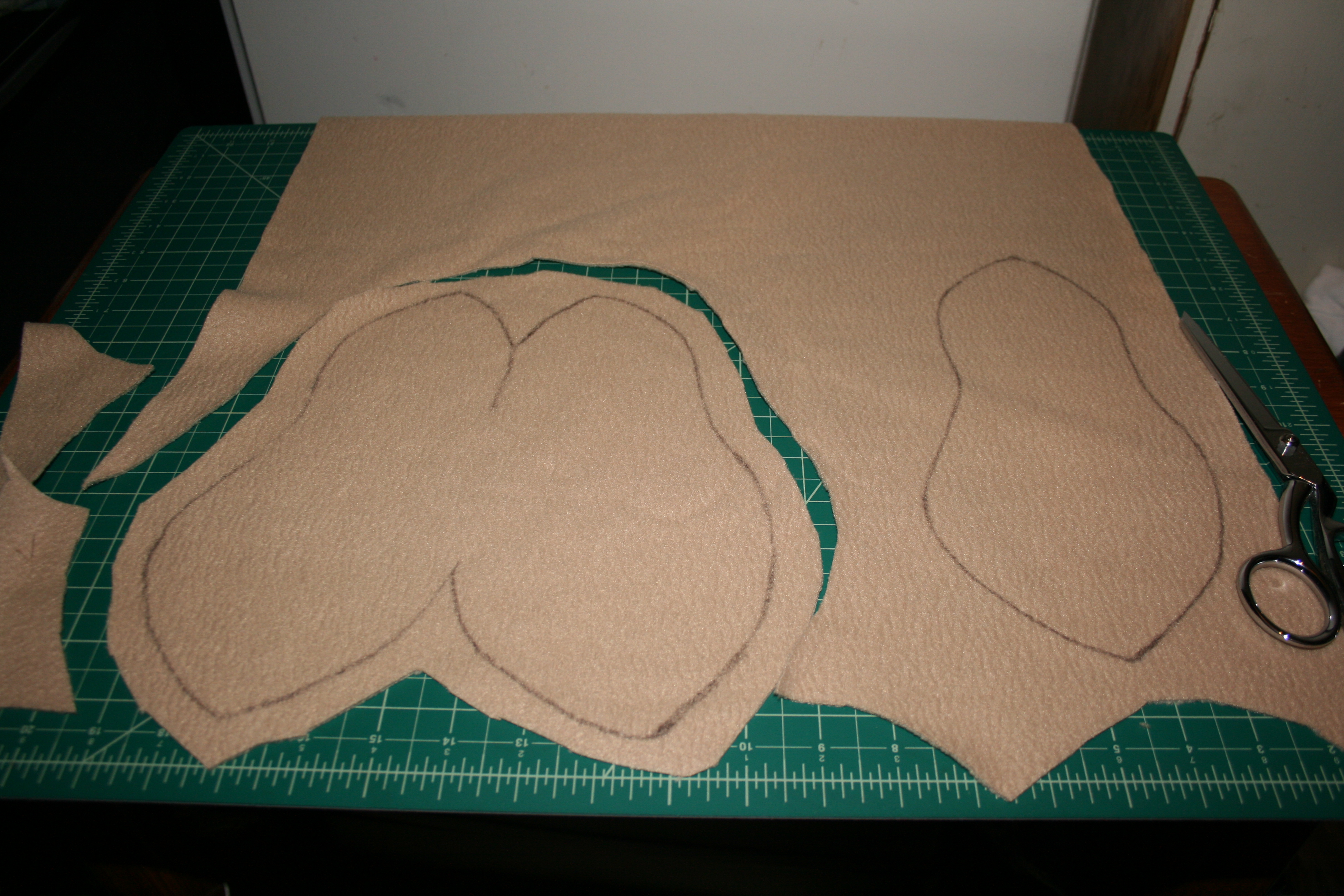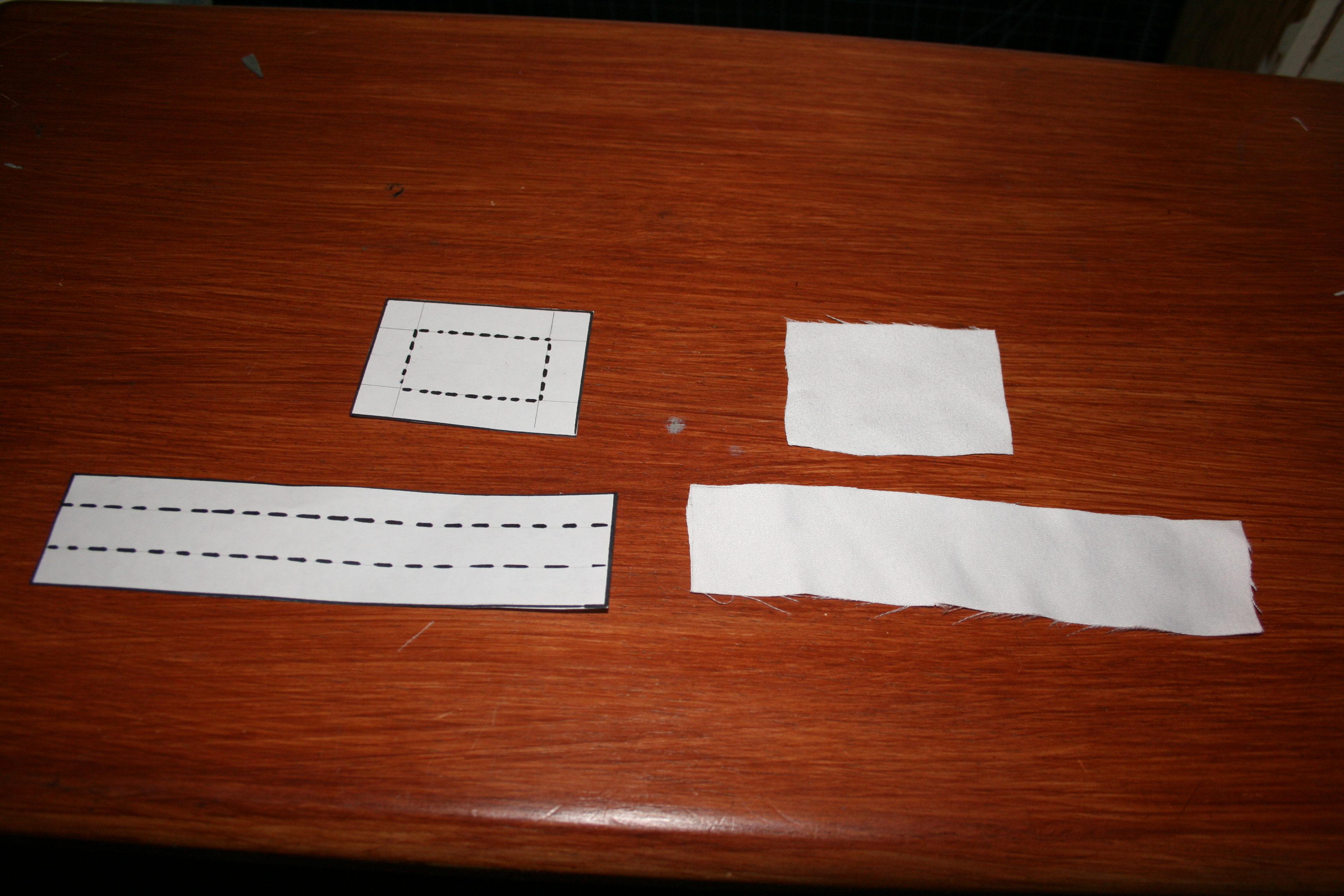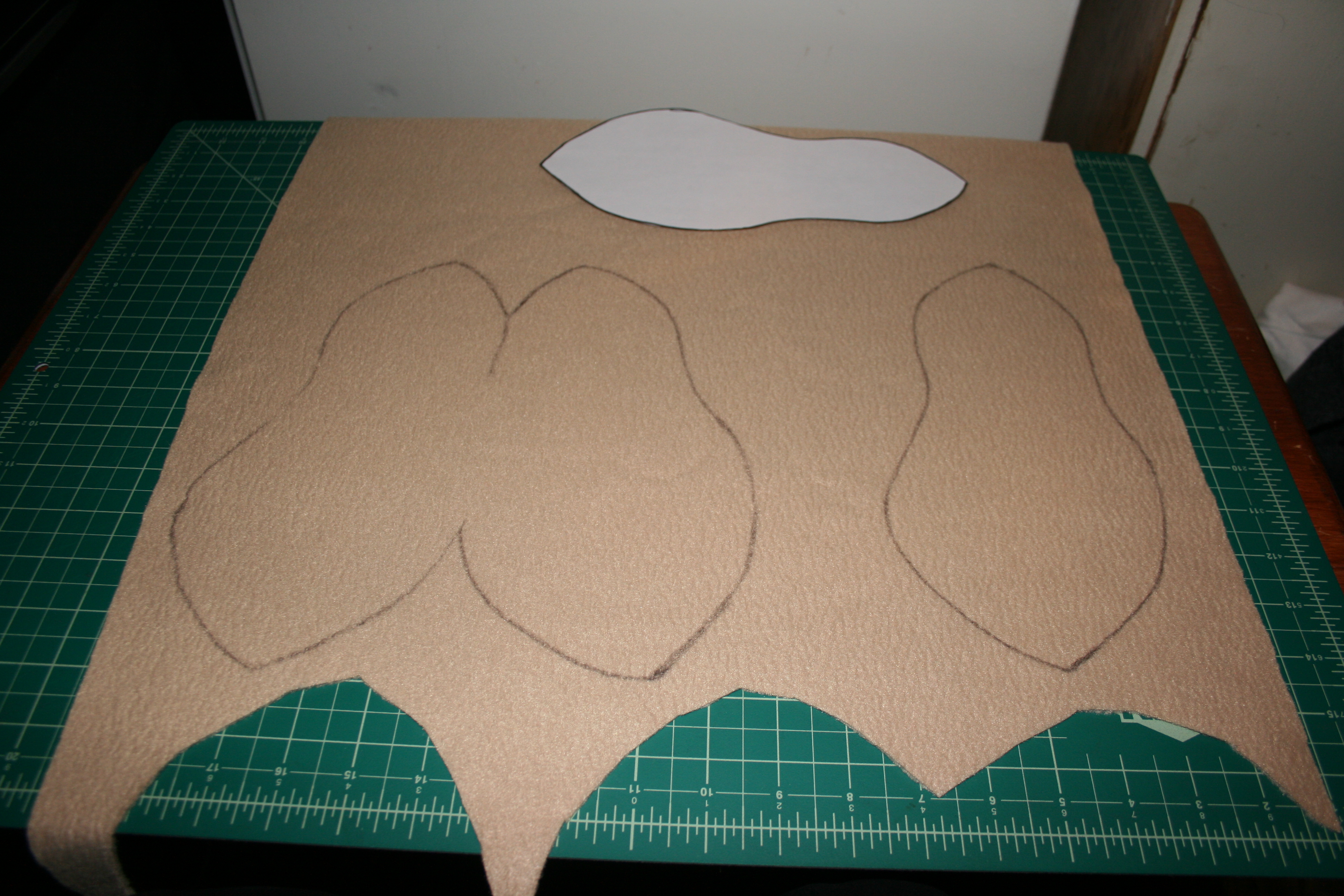 Take out your white fabric and trace out the four shapes that make up the front and sides of the two computer parts. The solid line is where you should trace and cut your fabric, and the dotted line will be the folded edge of the fabric where the seam will be. If you can, trace the dotted line onto your fabric as well in washable marker.