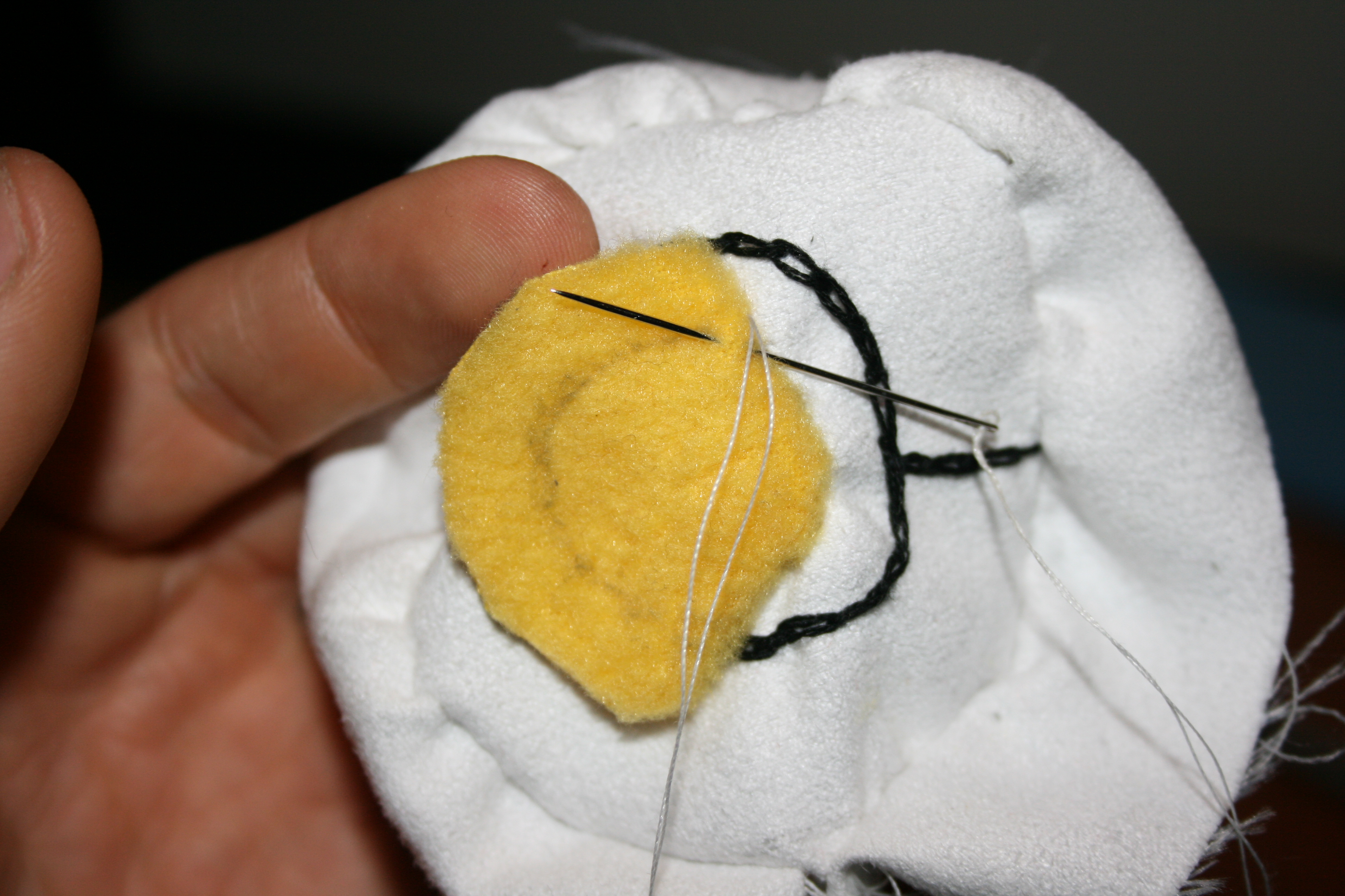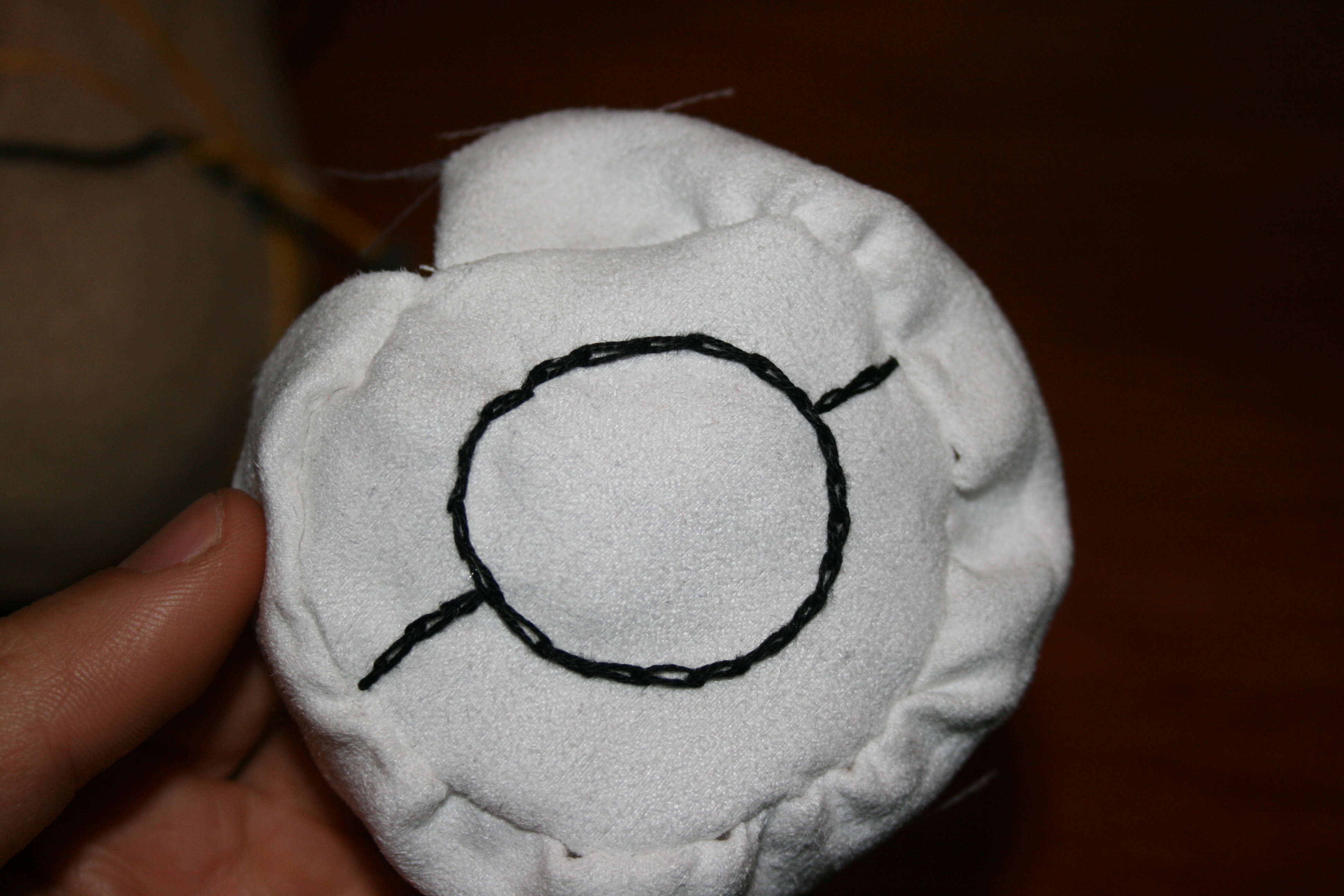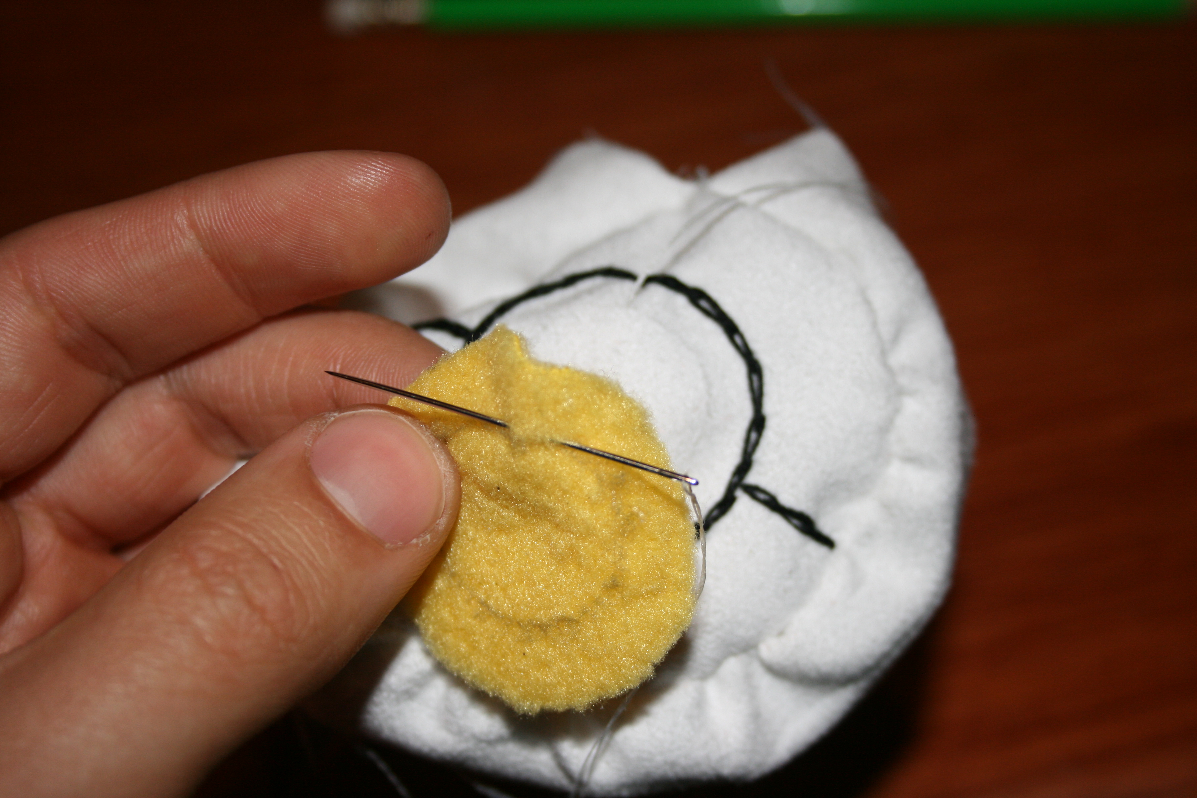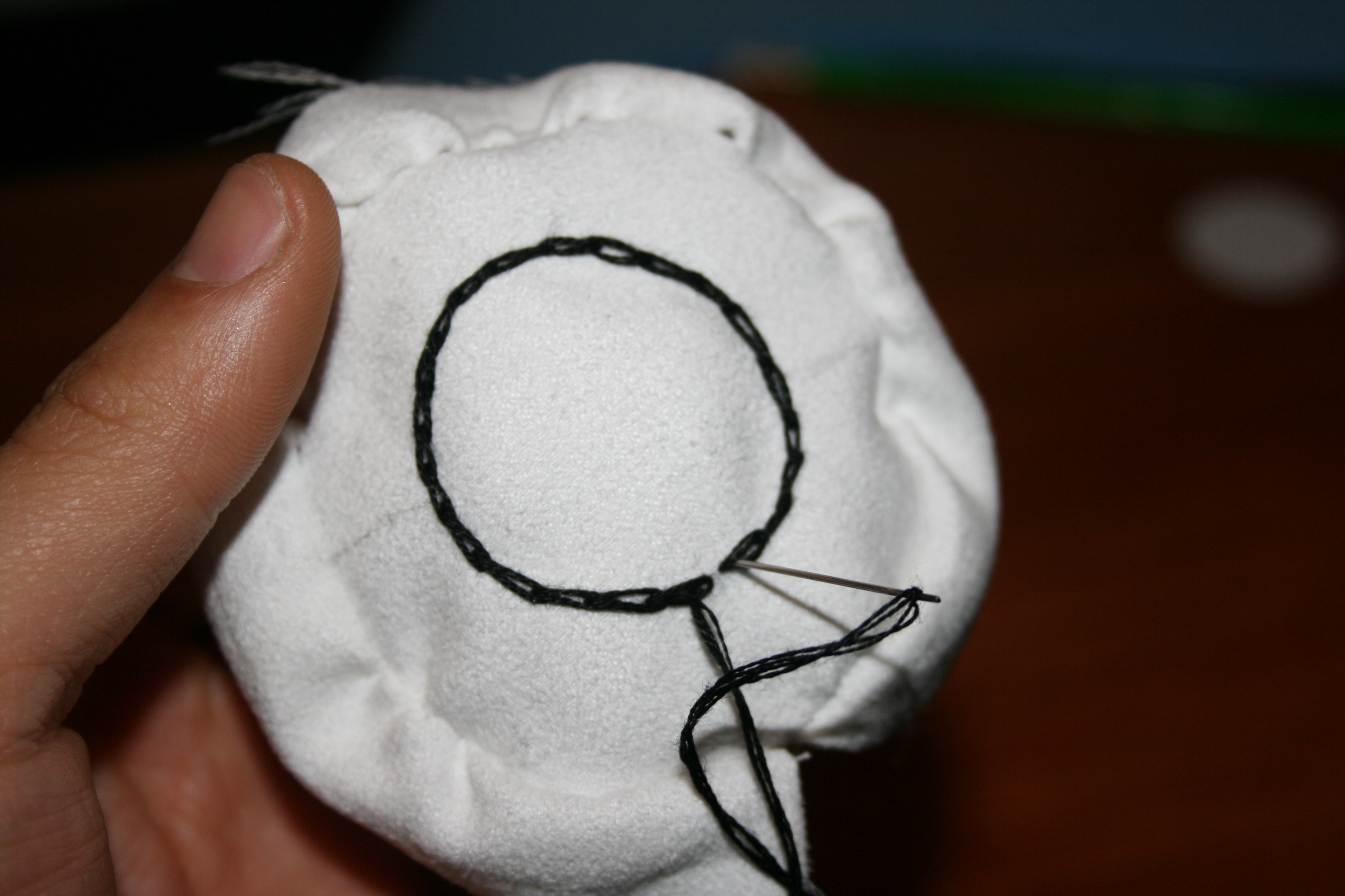 With that done, you may resume stitching around the face. If you are using foam pad to stuff the face, cut and insert your foam circle now, while half of it is still open. If you are using regular fiberfill, keep stitching until there is only a small opening left before you stuff, then finish the job when it is full.