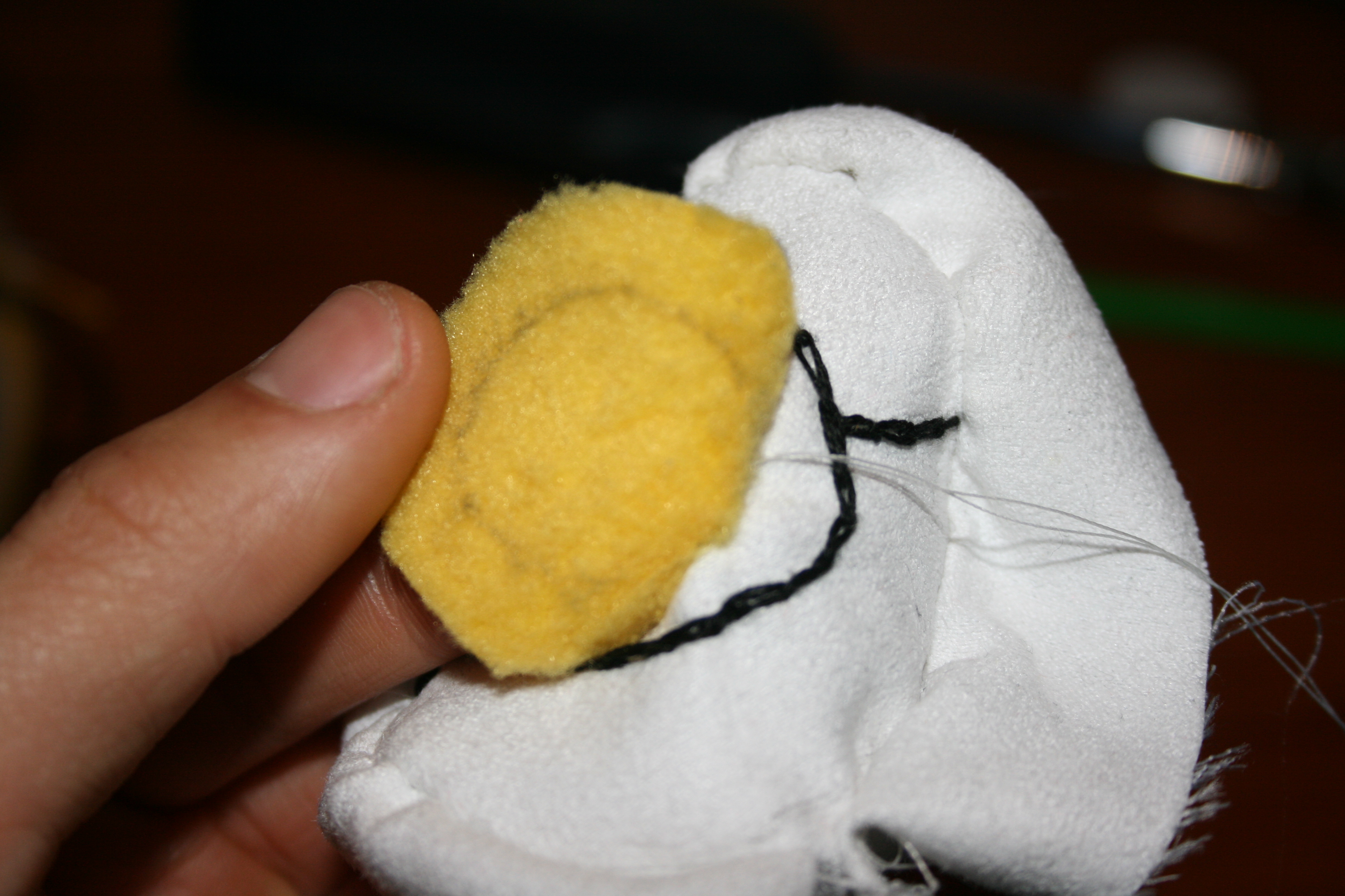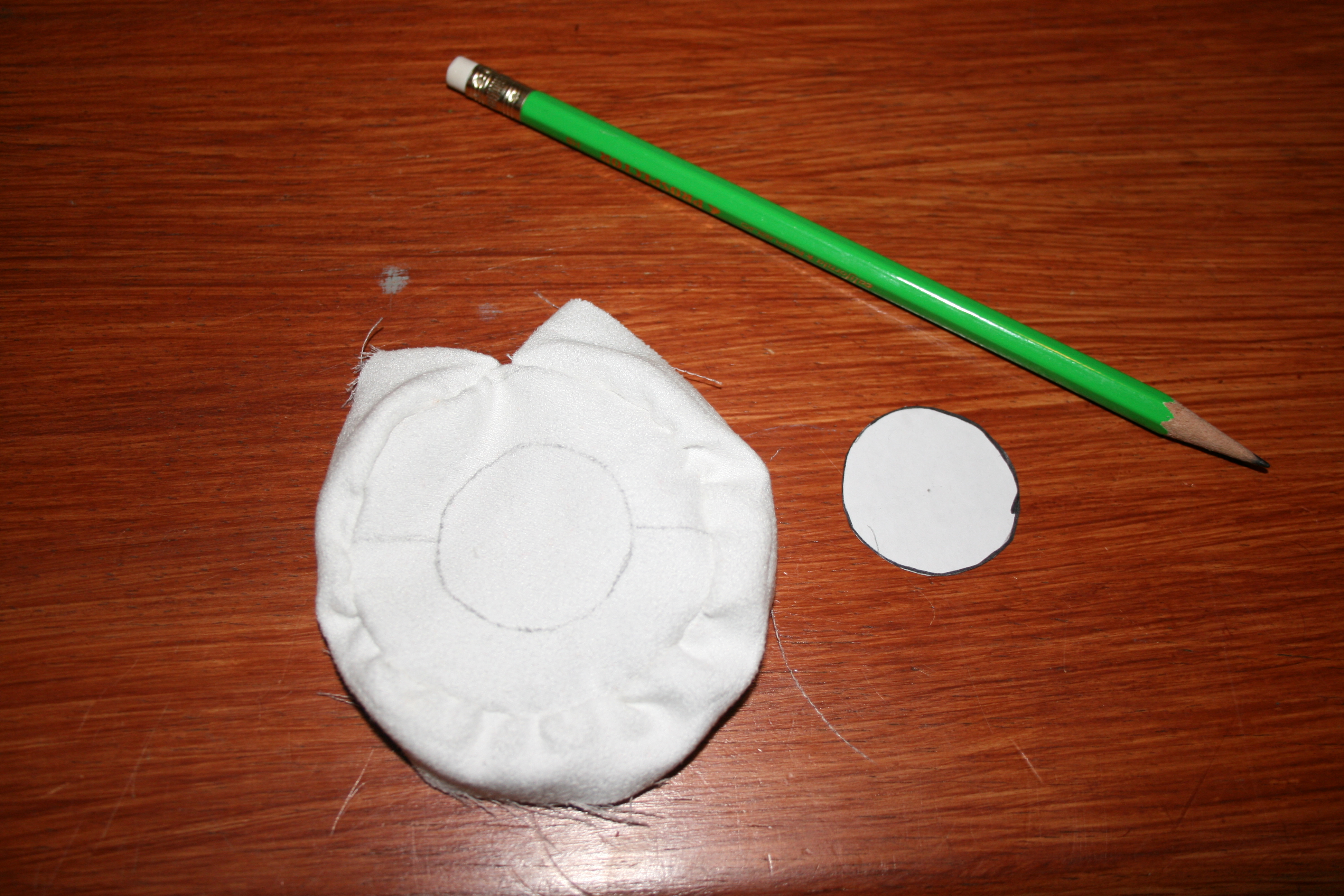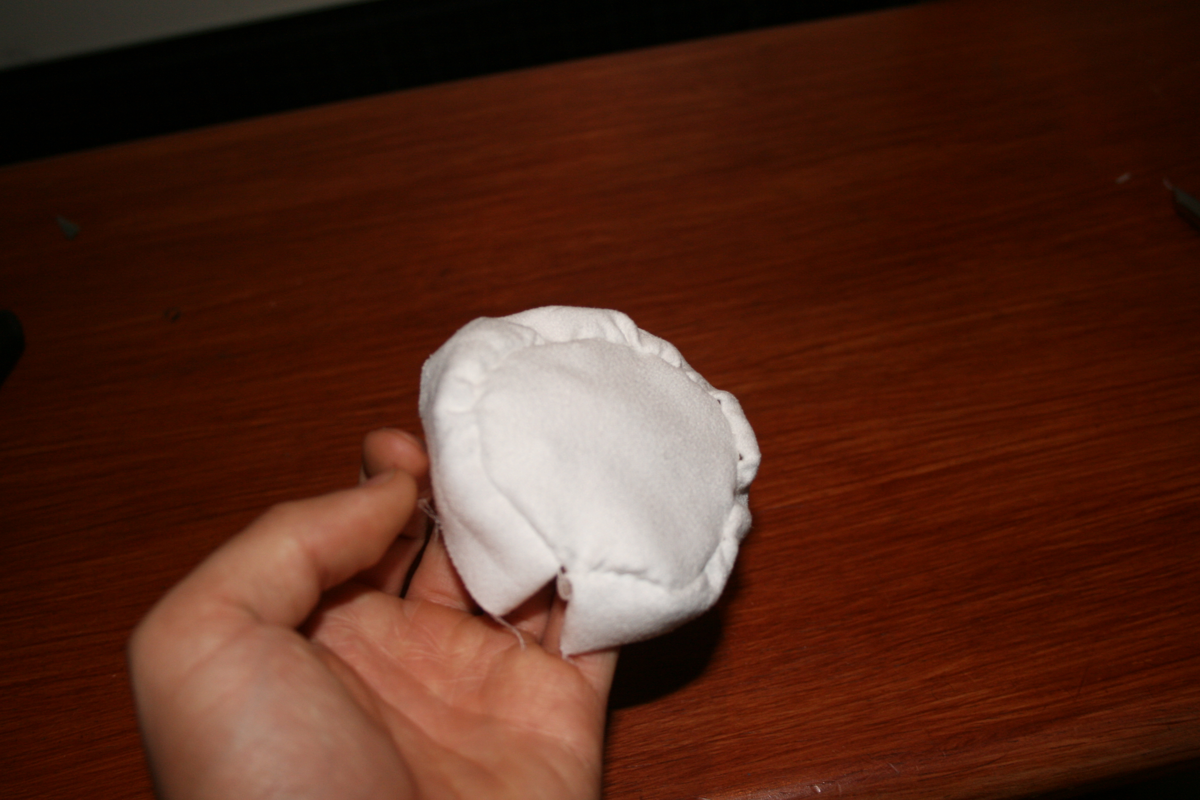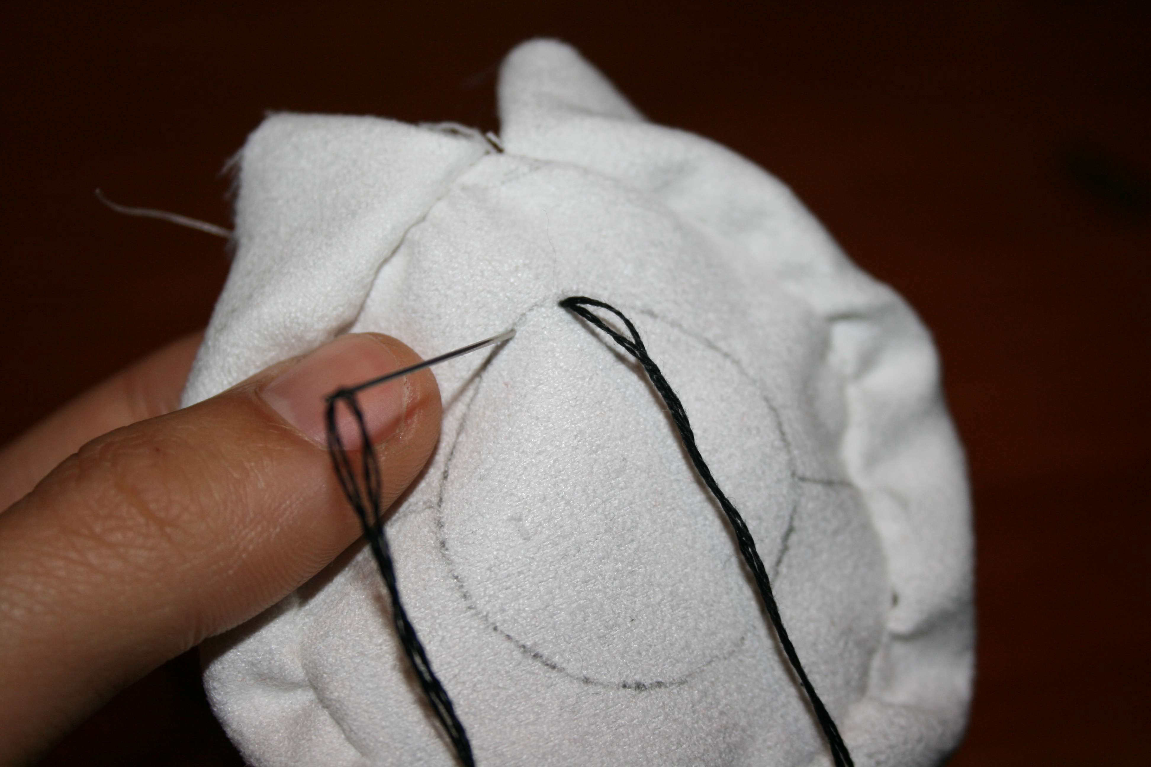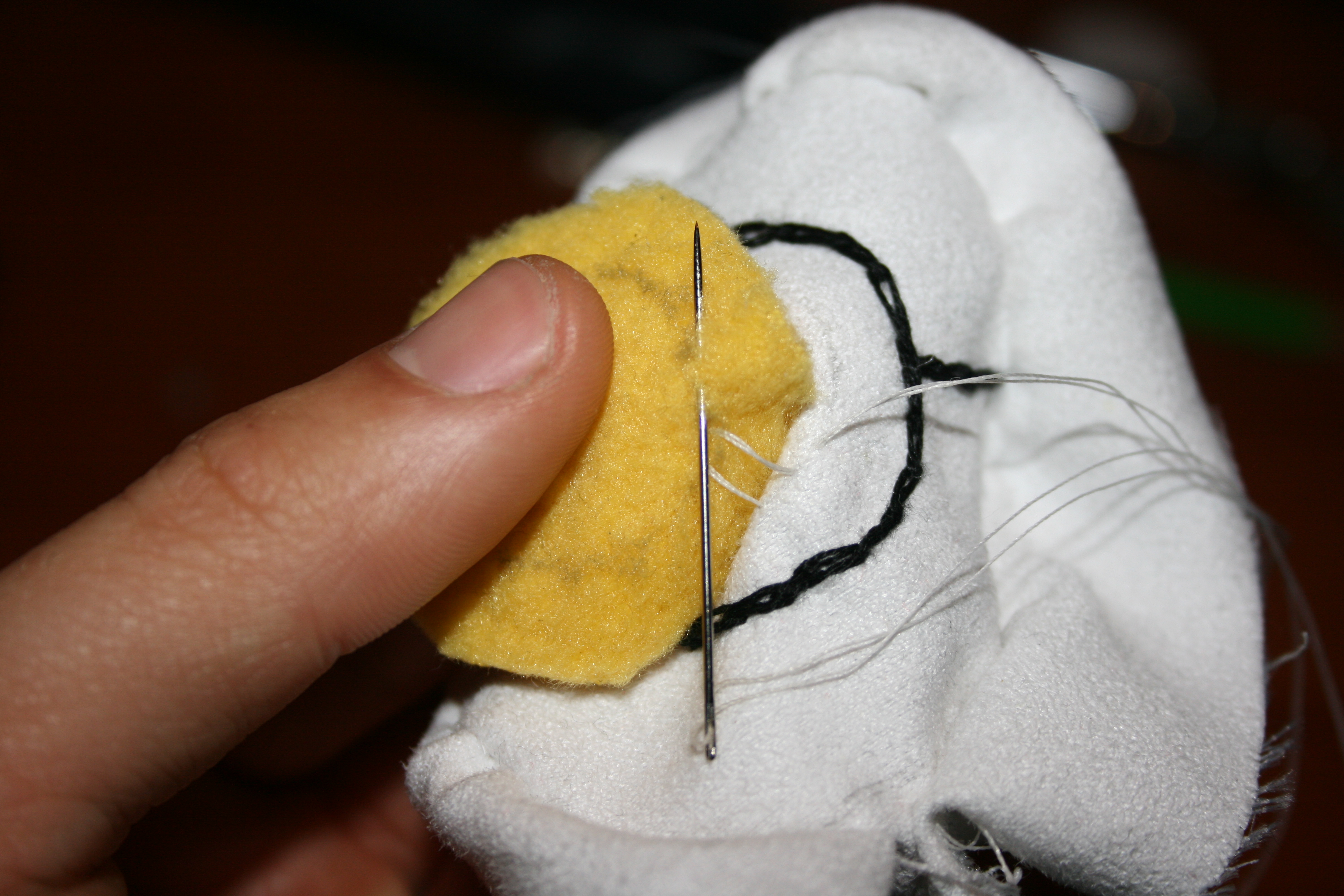 With that done, you may resume stitching around the face. If you are using foam pad to stuff the face, cut and insert your foam circle now, while half of it is still open. If you are using regular fiberfill, keep stitching until there is only a small opening left before you stuff, then finish the job when it is full.