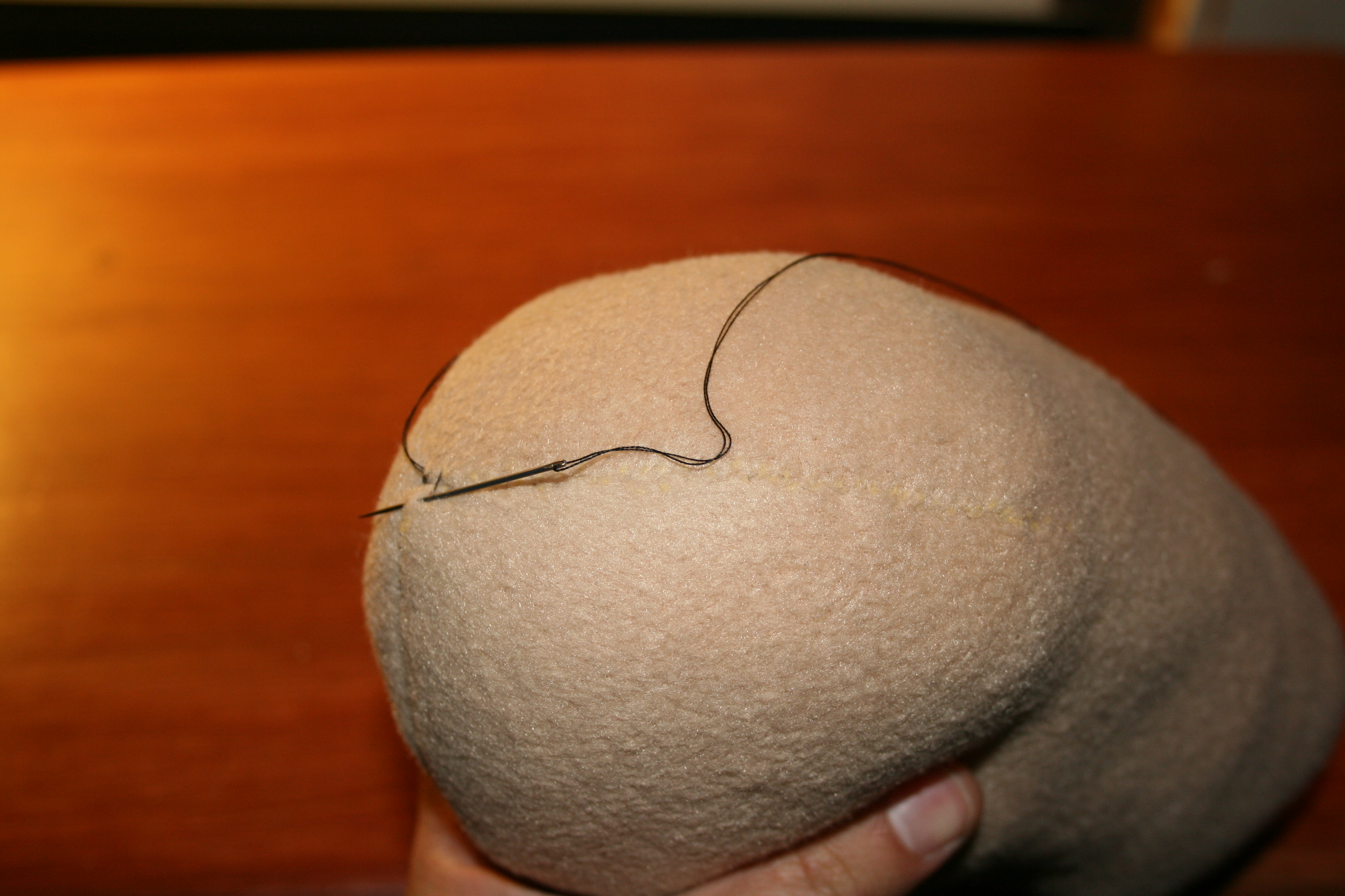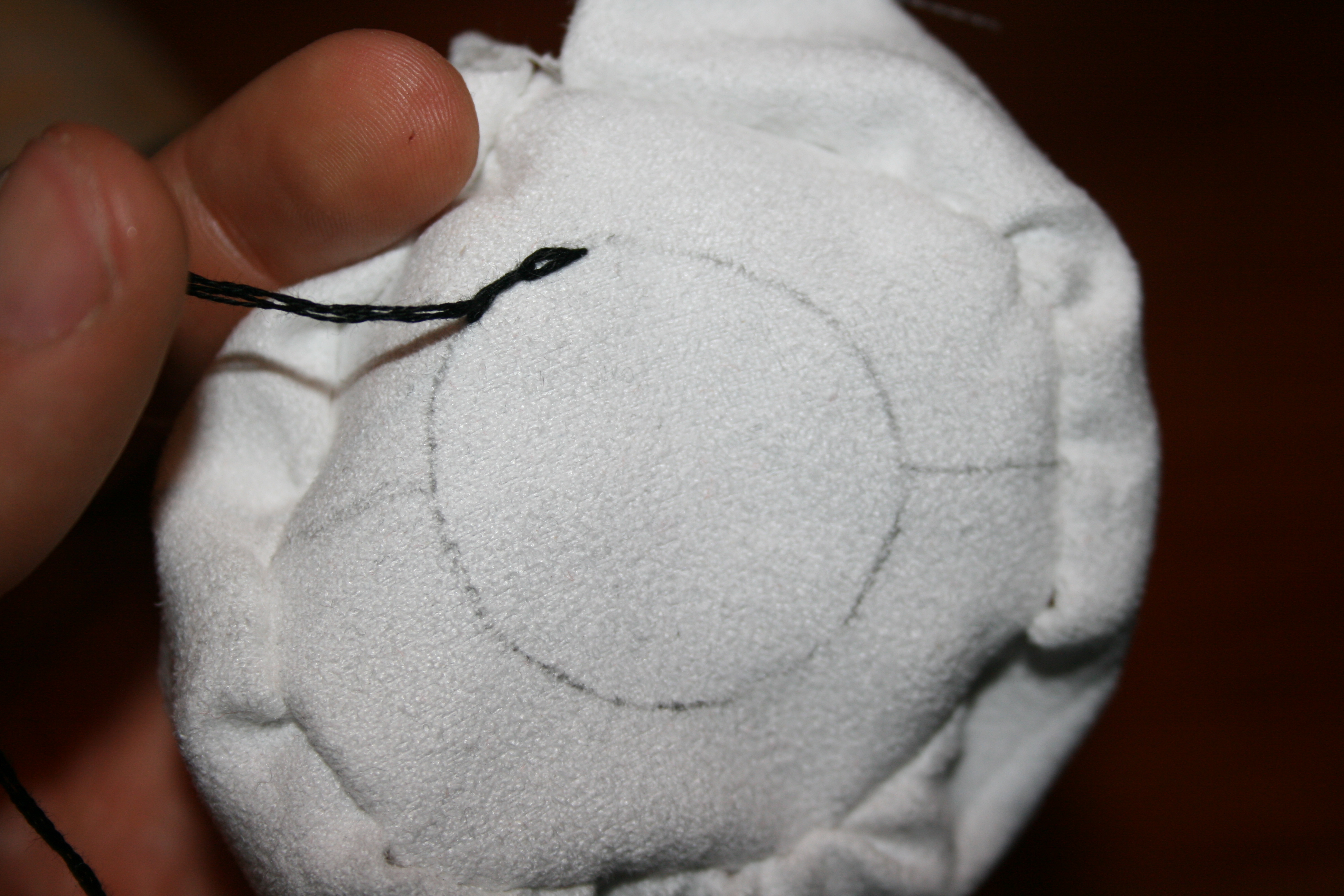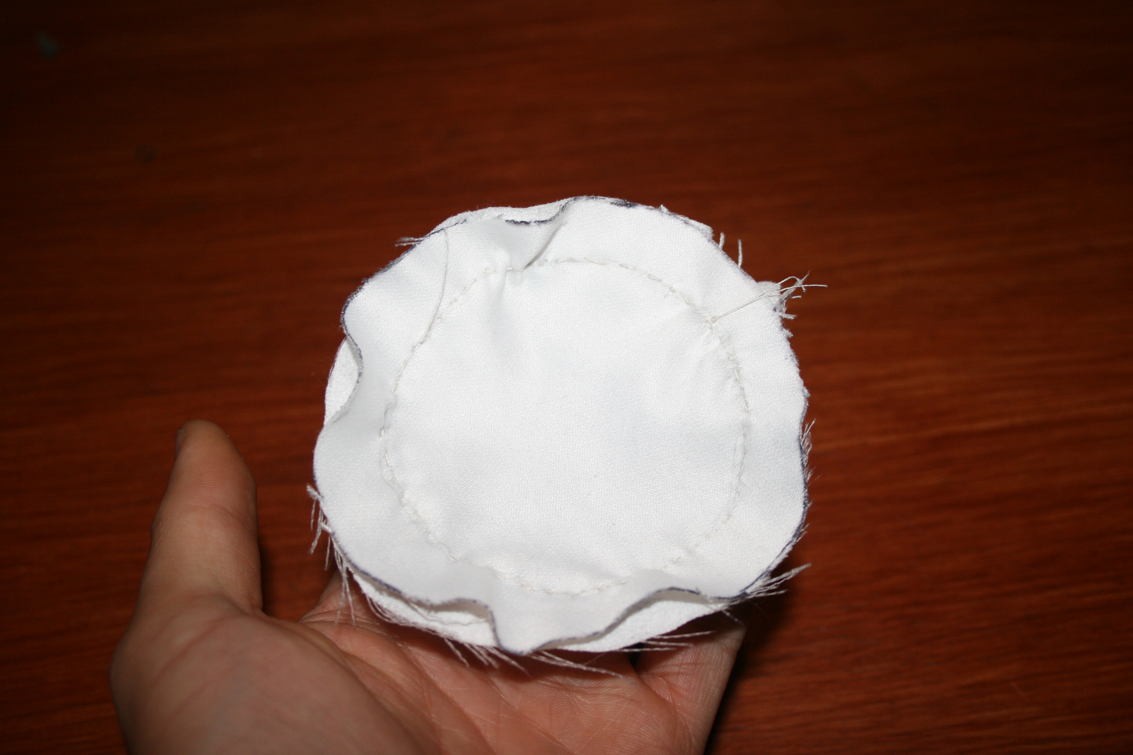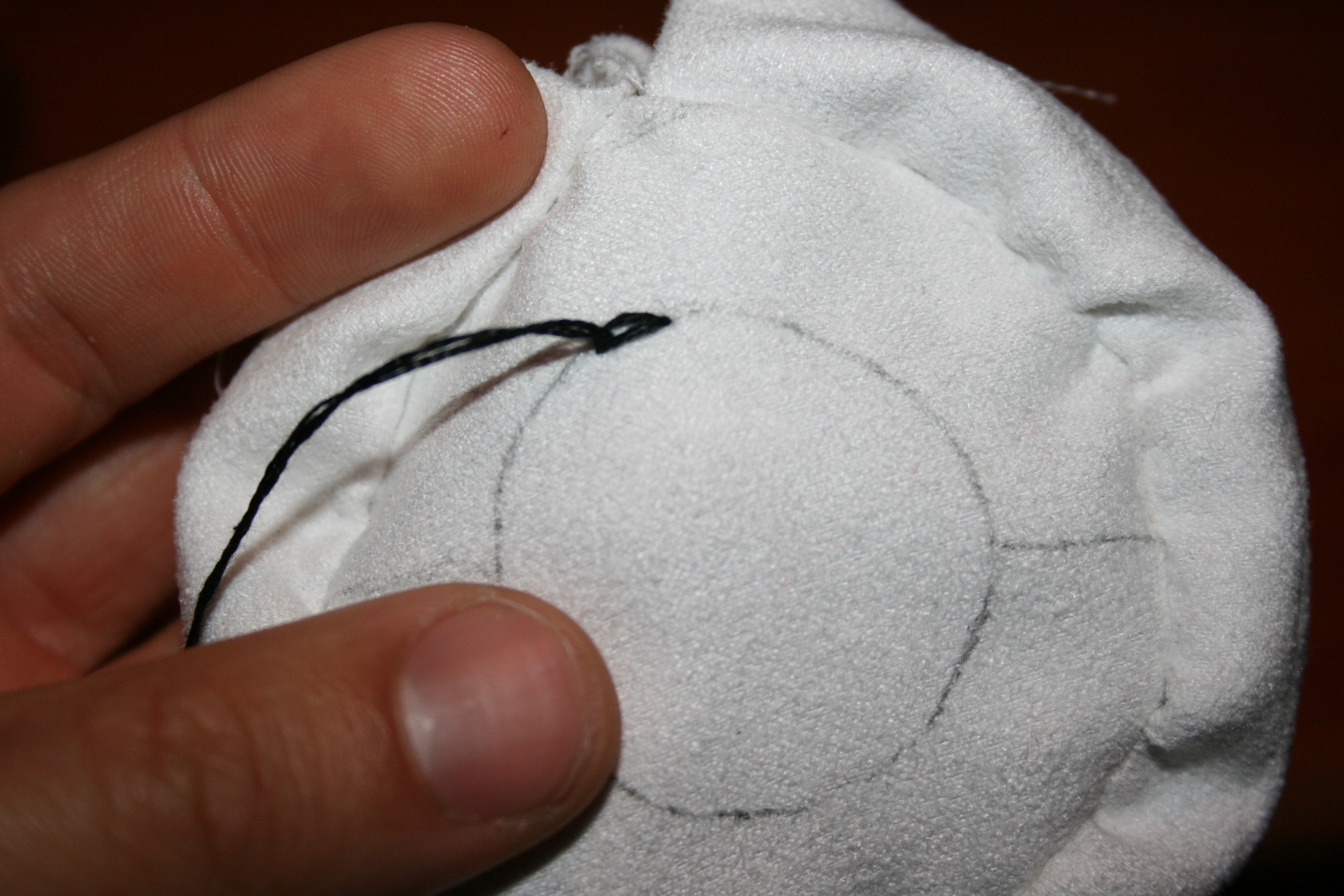 With that done, you may resume stitching around the face. If you are using foam pad to stuff the face, cut and insert your foam circle now, while half of it is still open. If you are using regular fiberfill, keep stitching until there is only a small opening left before you stuff, then finish the job when it is full.