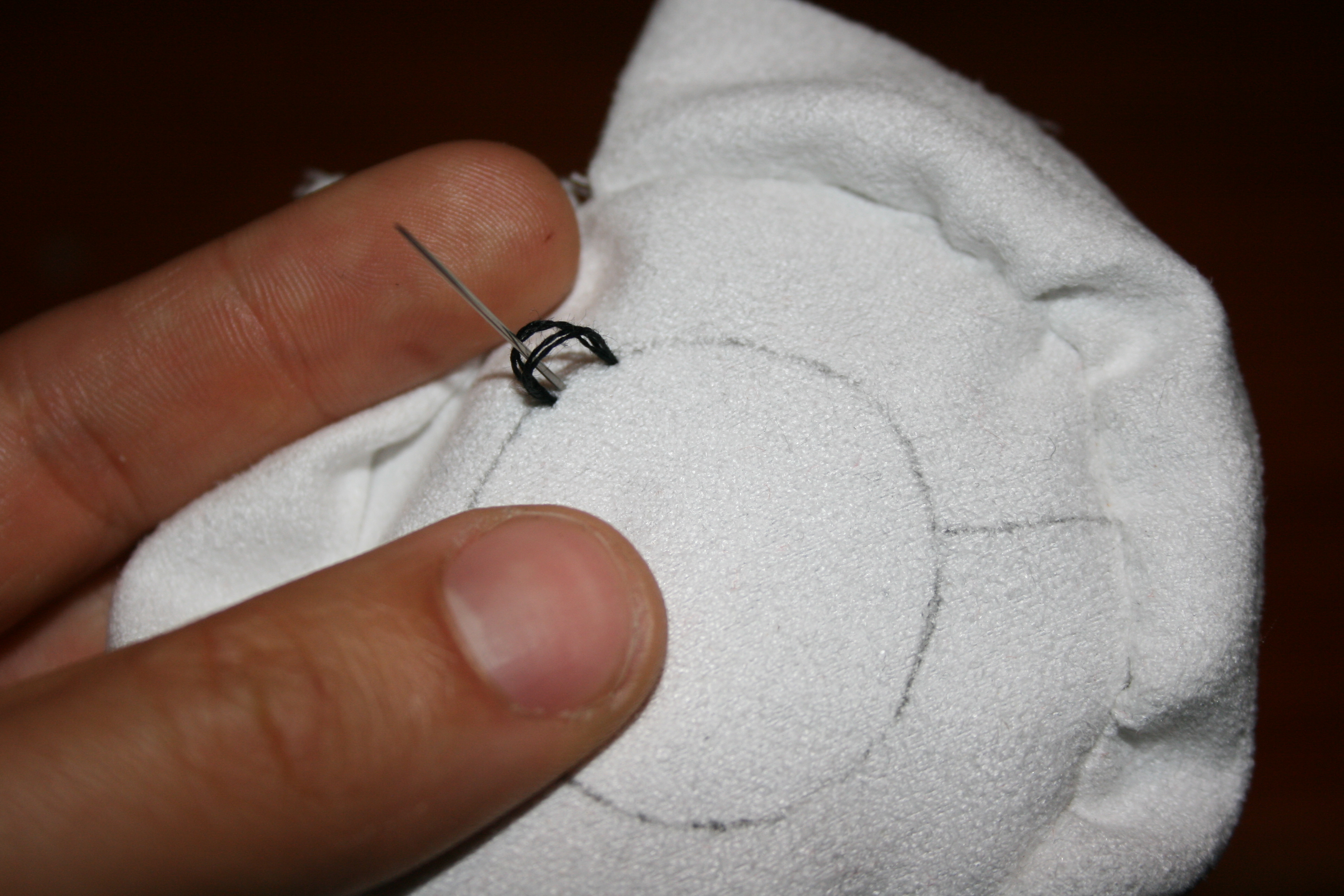 Cut out the small circle template and place it in the middle of GLaDOS' face. Trace around the circle and add two lines straight across from each other outside this circle. These are the lines you will embroider on with your black embroidery thread. To ready your needle, clip off a length of embroidery floss and separate two strands from the rest of the bundle. String both of these strands together through the eye of your embroidery needle and knot the end, as you would a normal sewing needle.