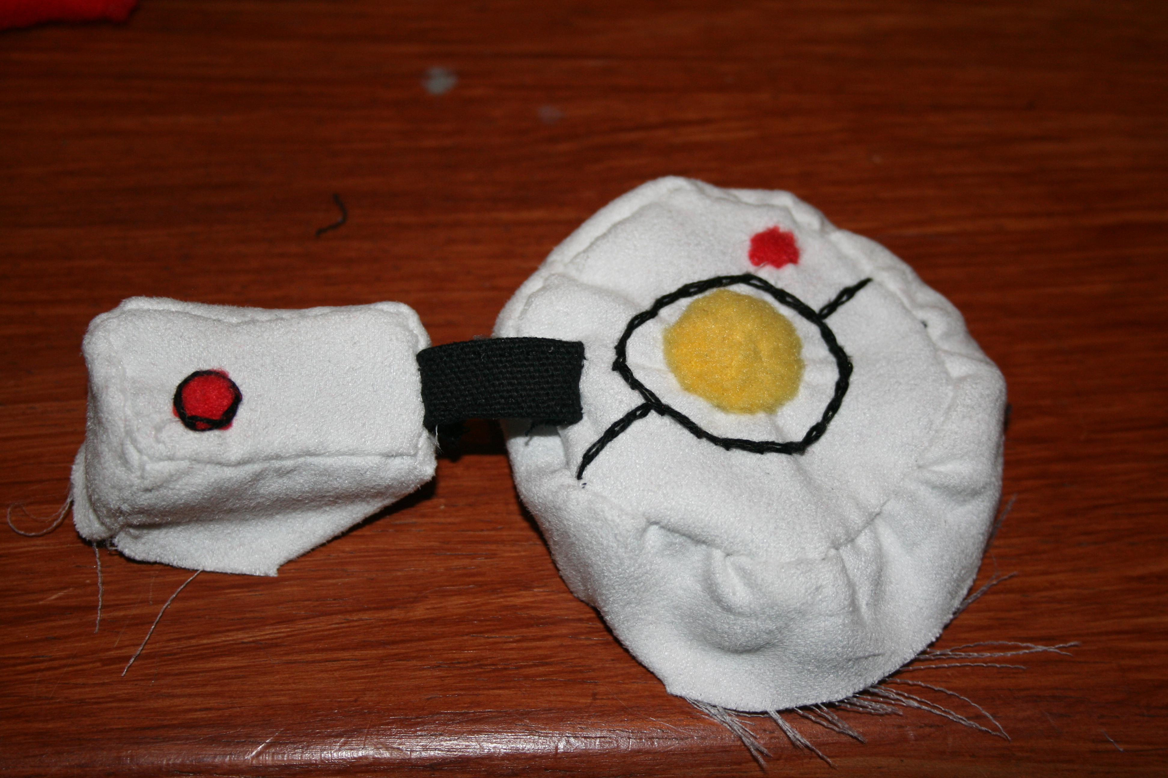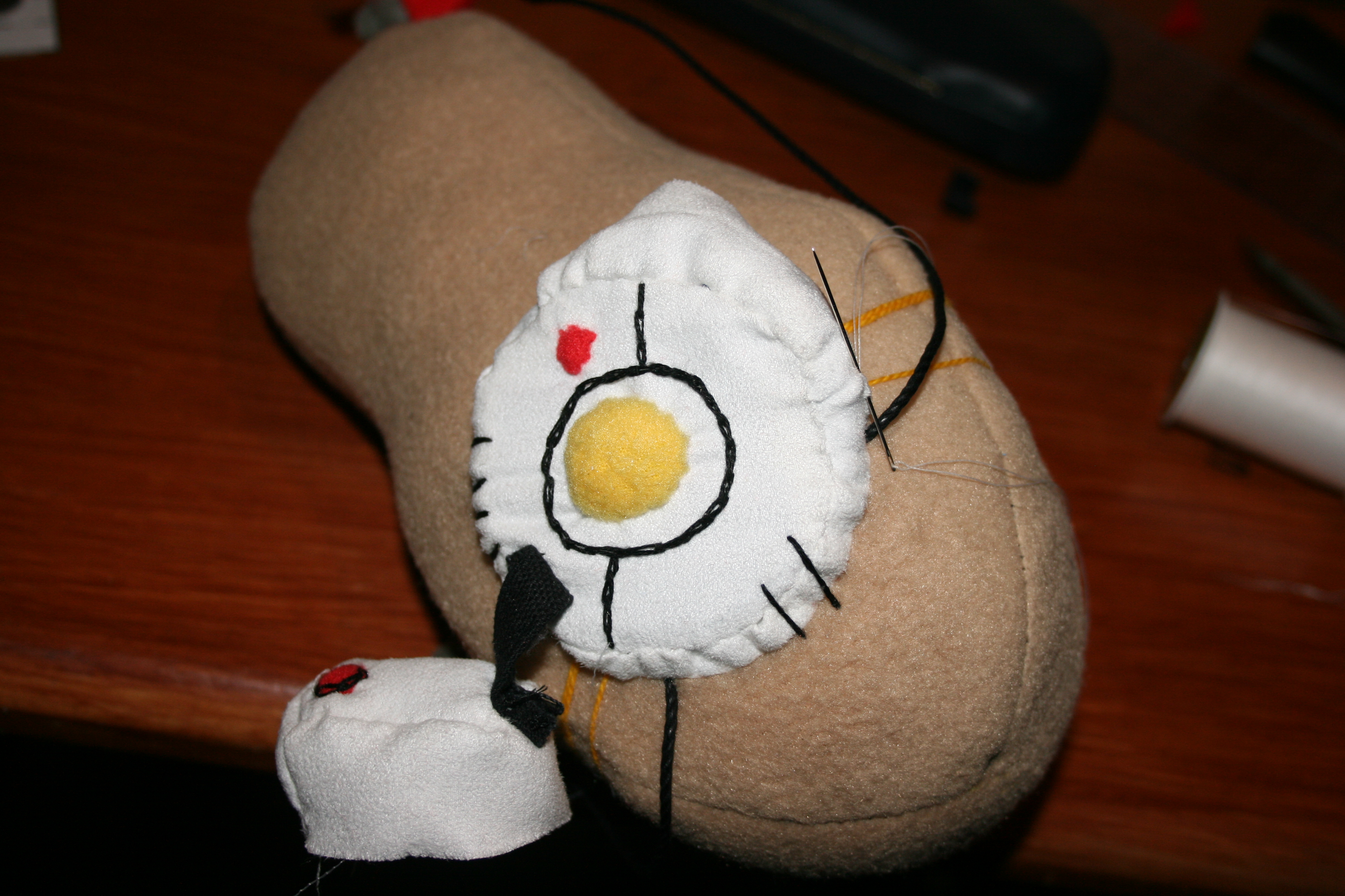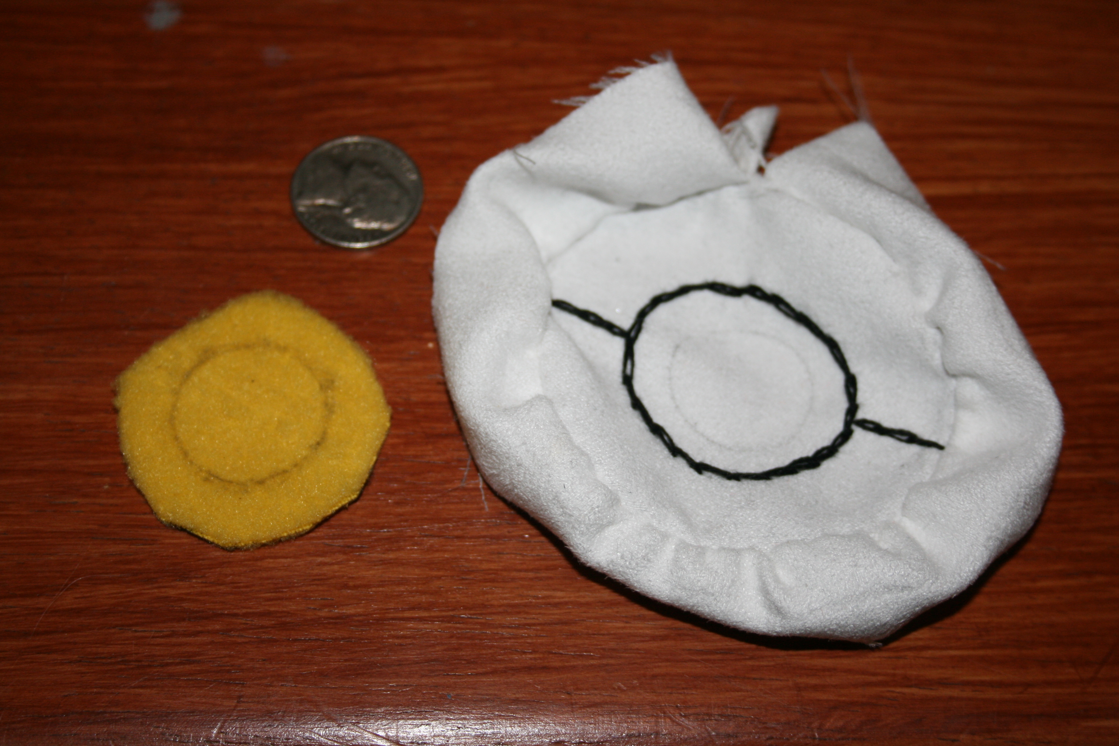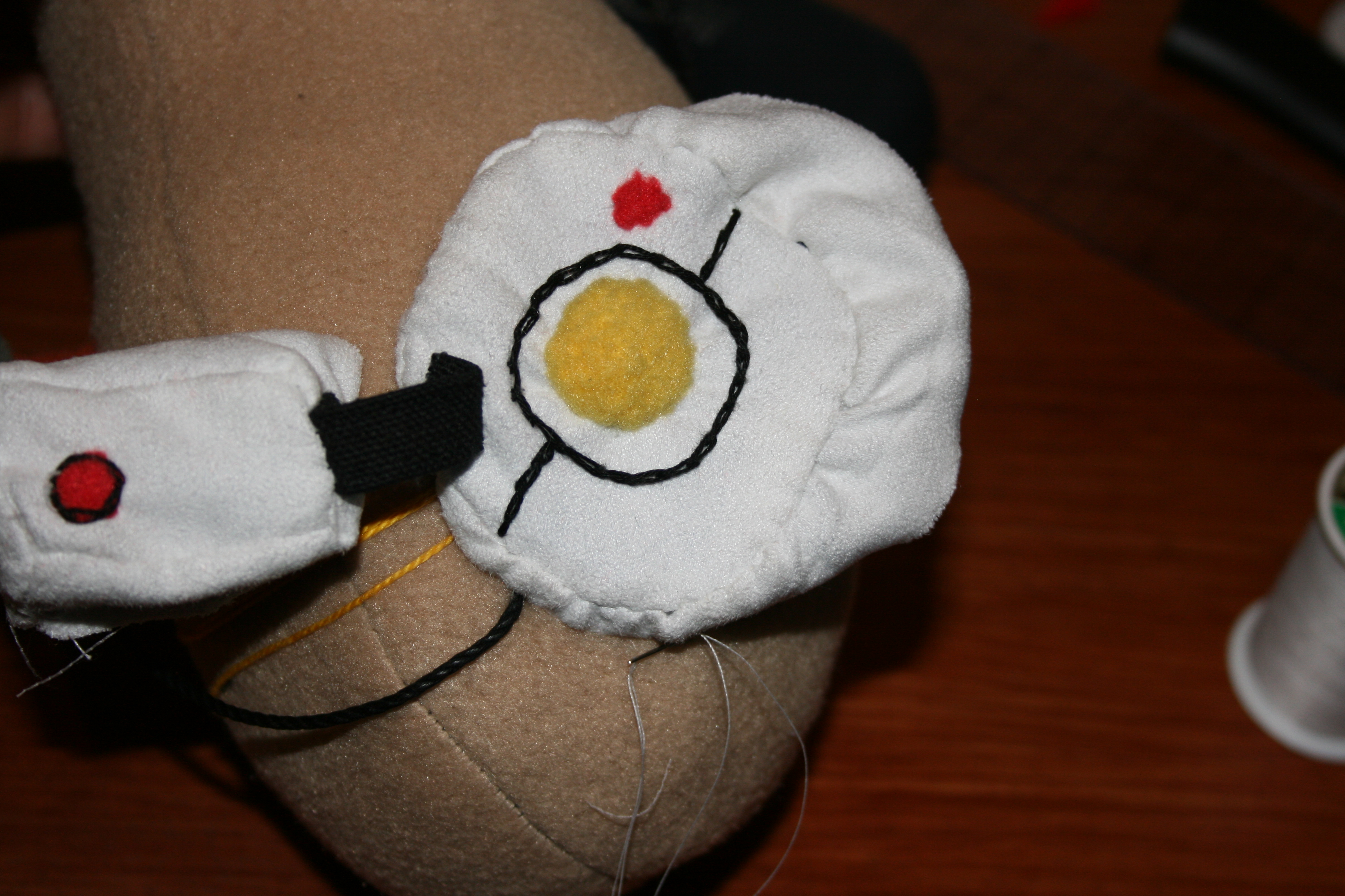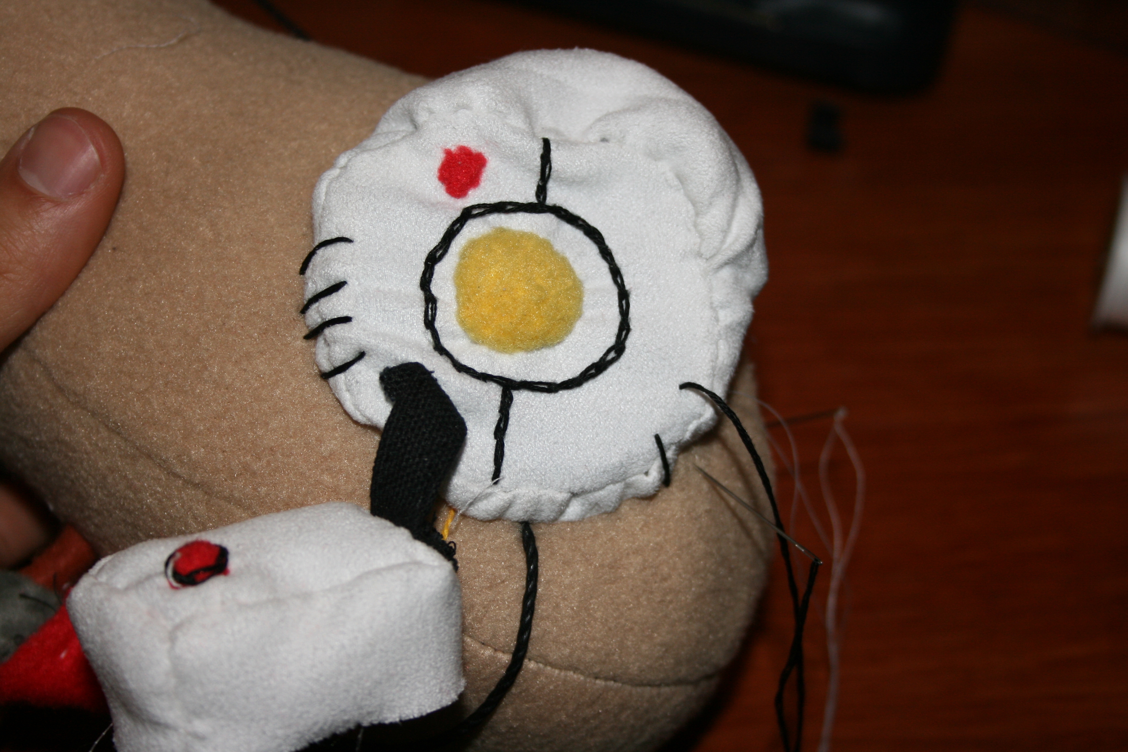 For the eye, trace around a nickel on your yellow fabric. Cut outside the line to cut the shape out. Use the nickel to trace the same circle in the center of GLaDOS' face. Using your white thread, perform a slip stitch between the two lines you traced, tucking the edges in underneath as you stitch. The small red lights on her face and other computer part are added the same way, but with smaller circles cut from red fabric.