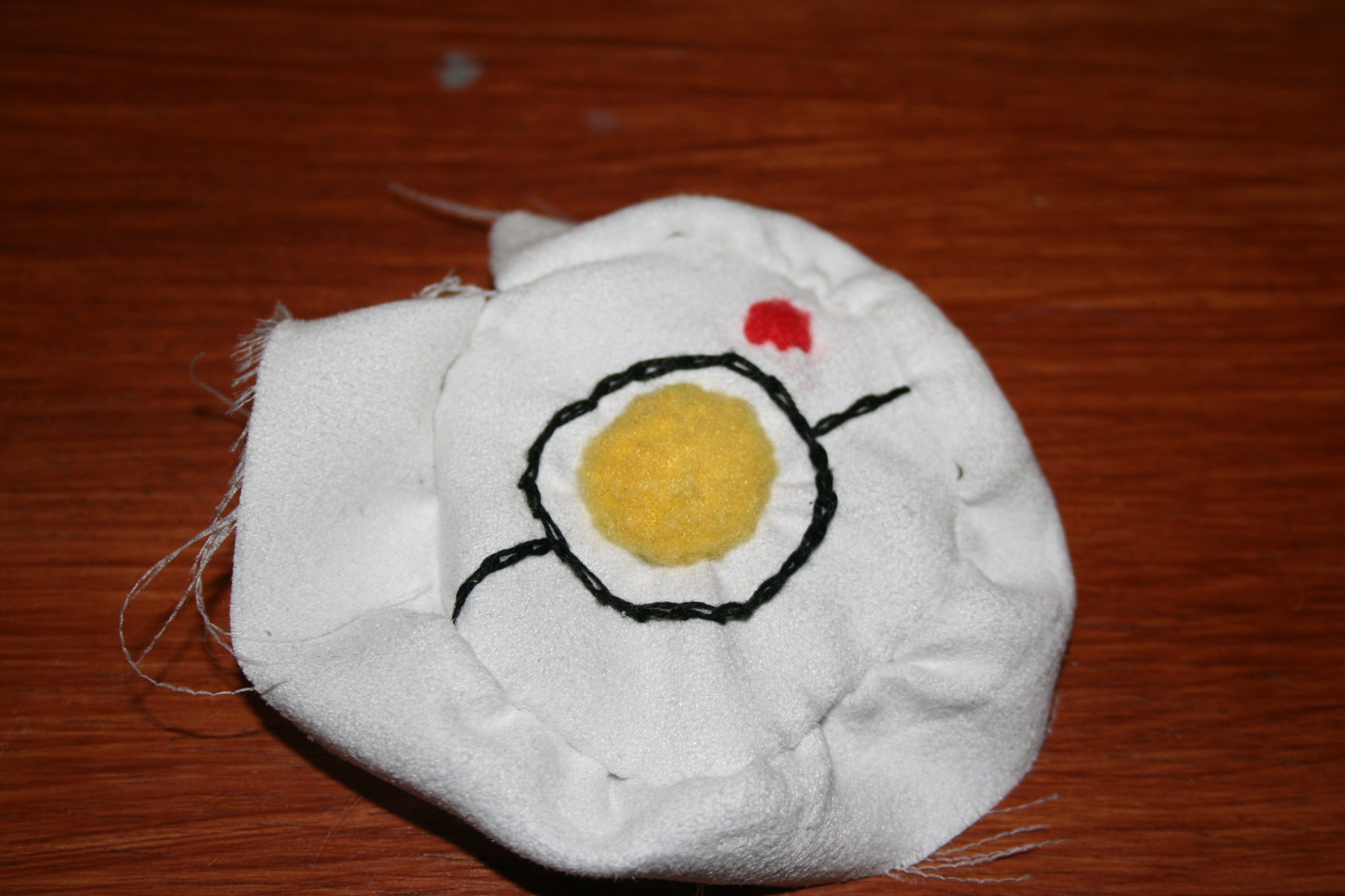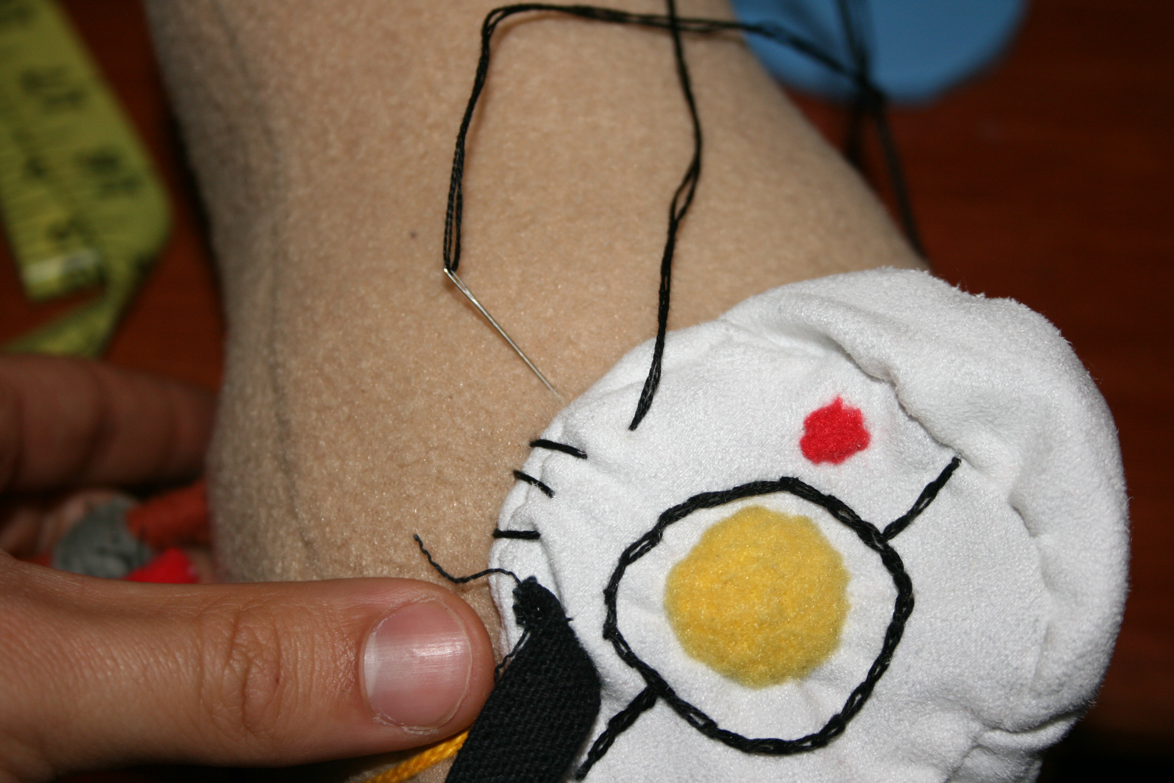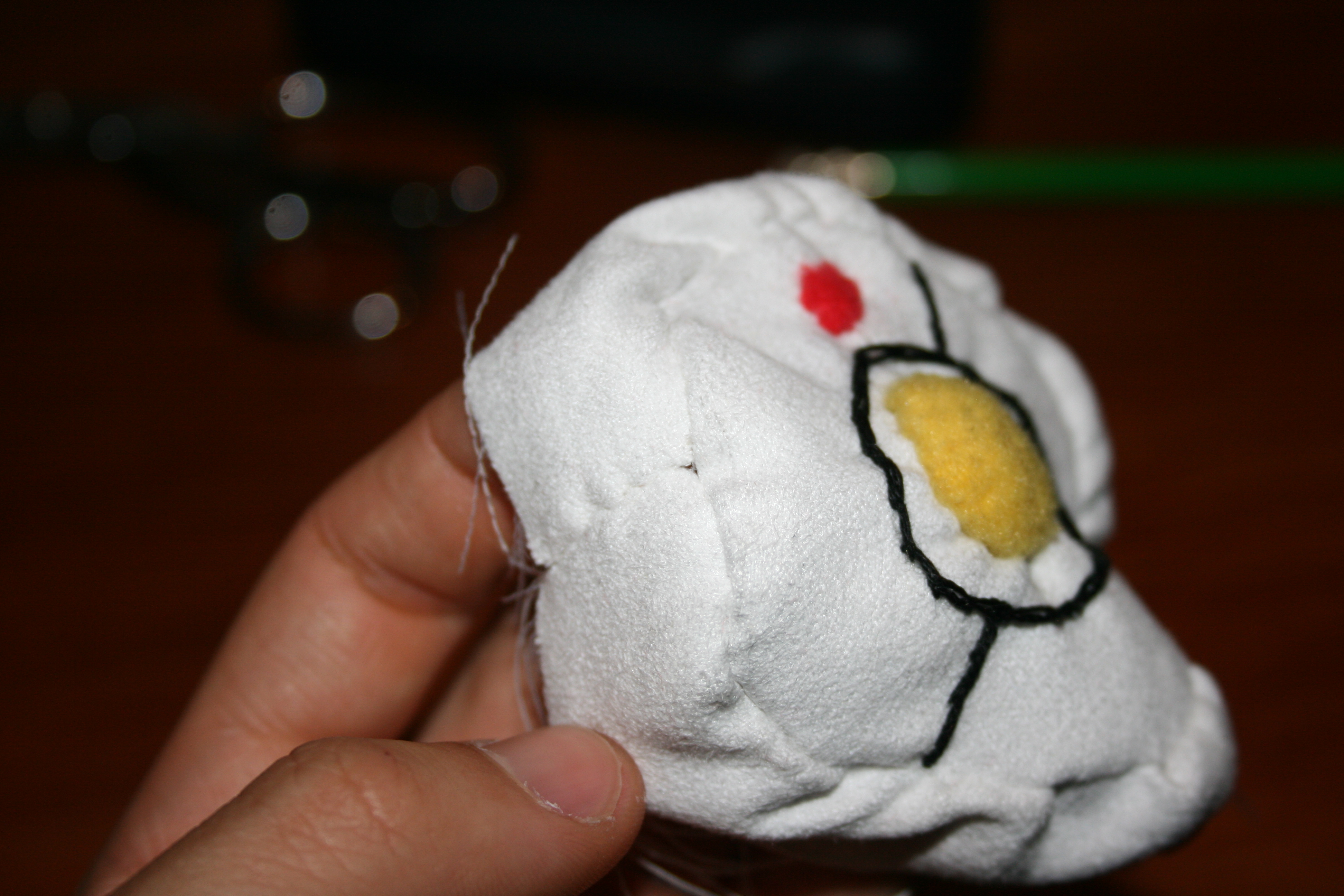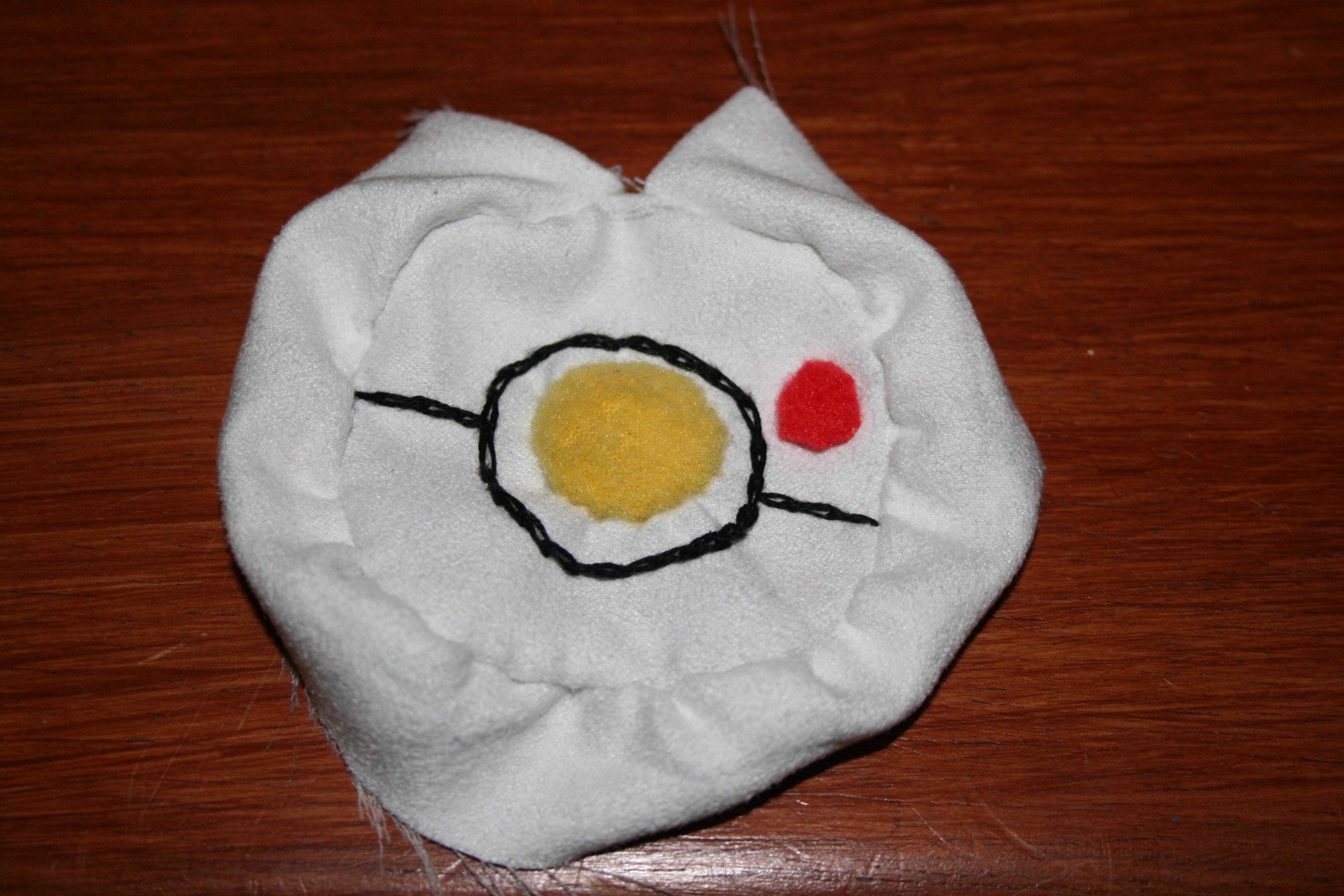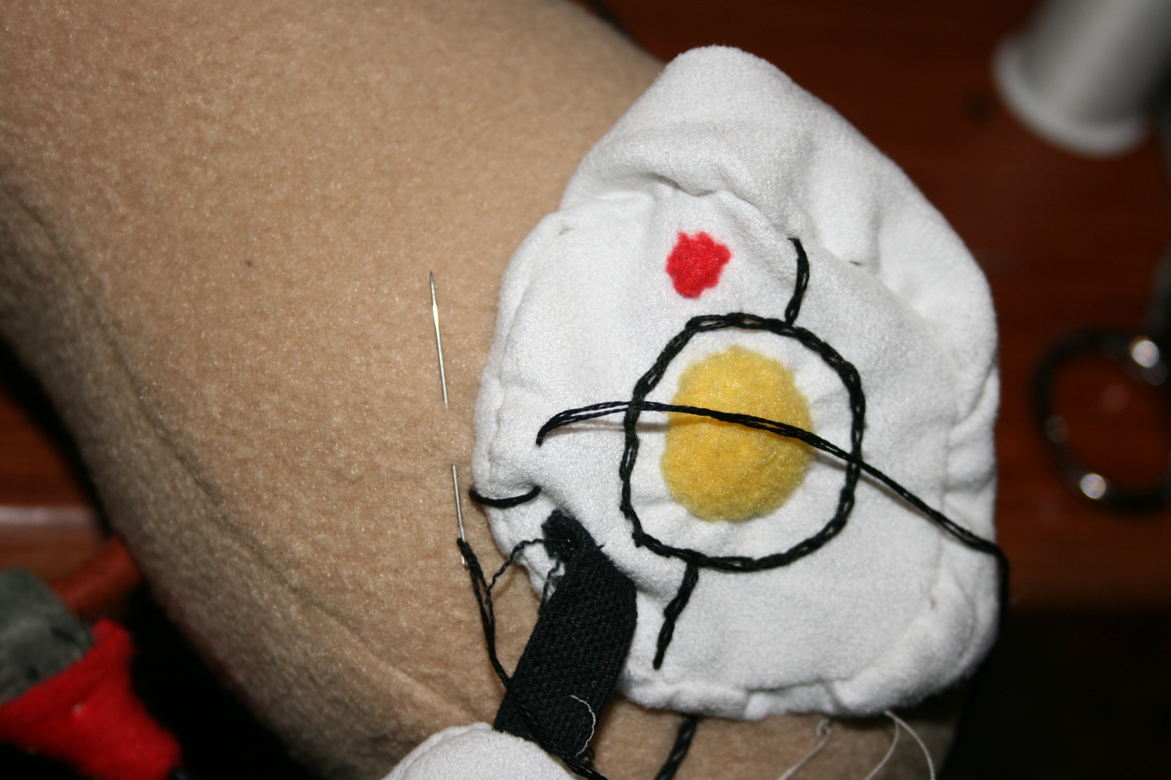 For the eye, trace around a nickel on your yellow fabric. Cut outside the line to cut the shape out. Use the nickel to trace the same circle in the center of GLaDOS' face. Using your white thread, perform a slip stitch between the two lines you traced, tucking the edges in underneath as you stitch. The small red lights on her face and other computer part are added the same way, but with smaller circles cut from red fabric.