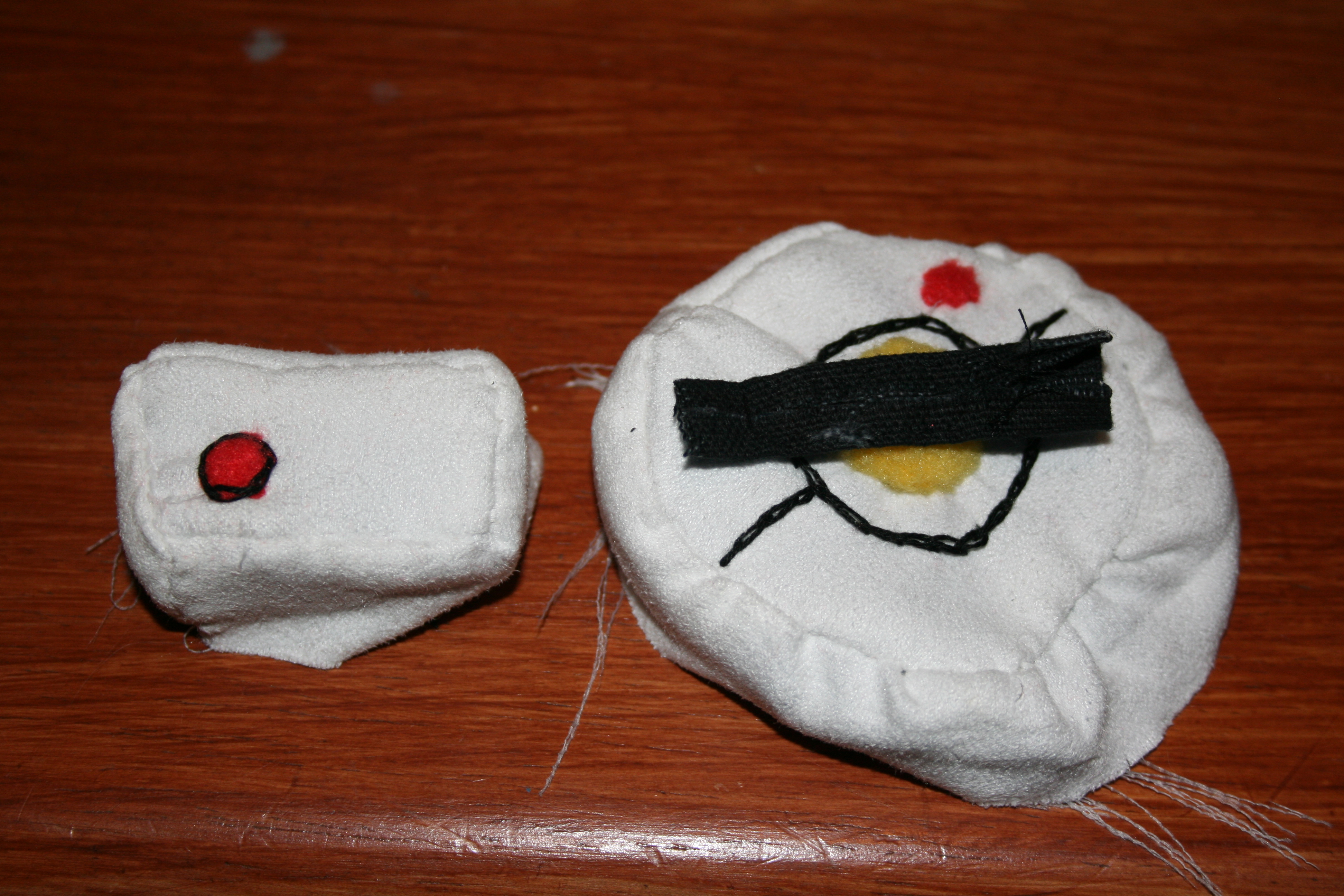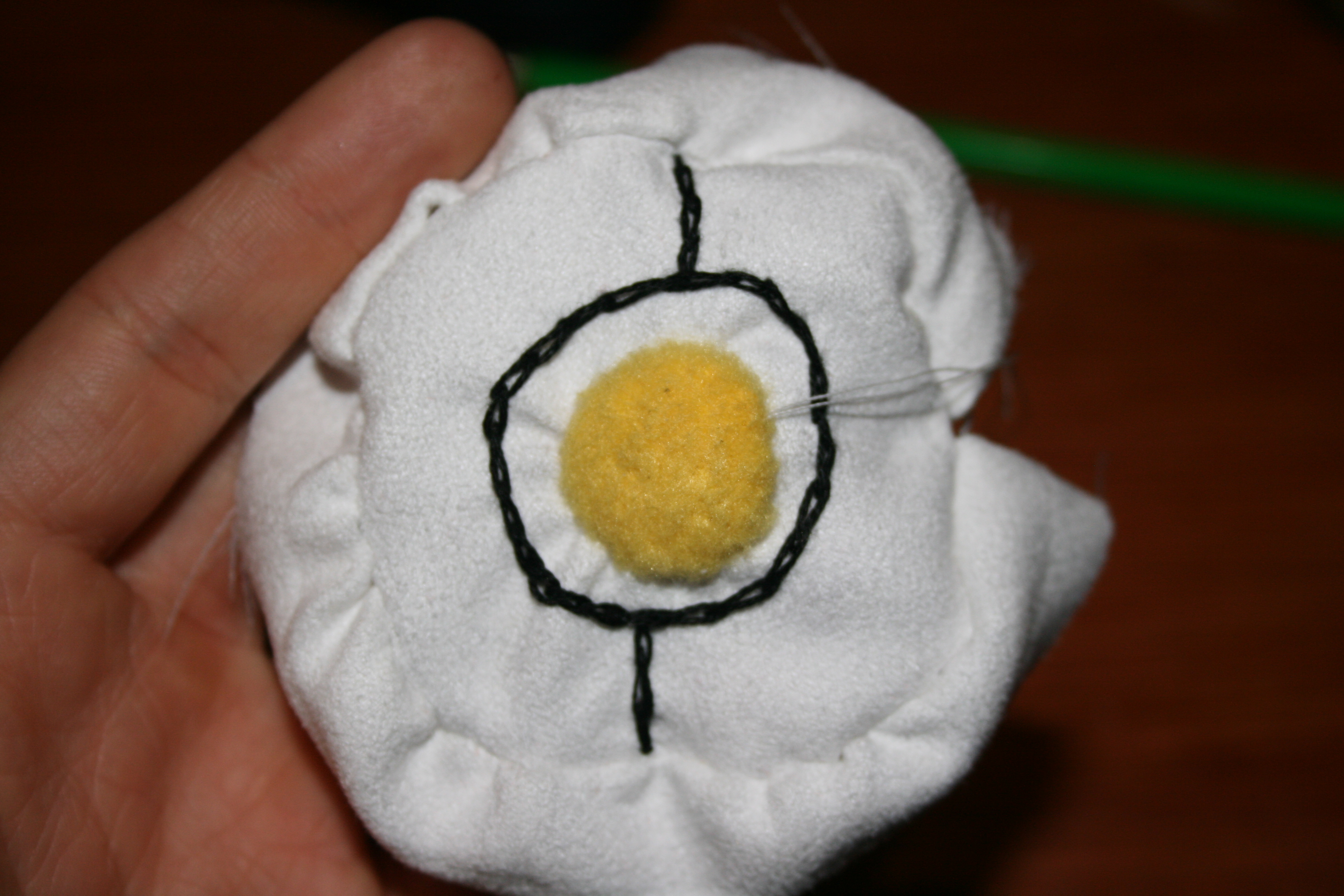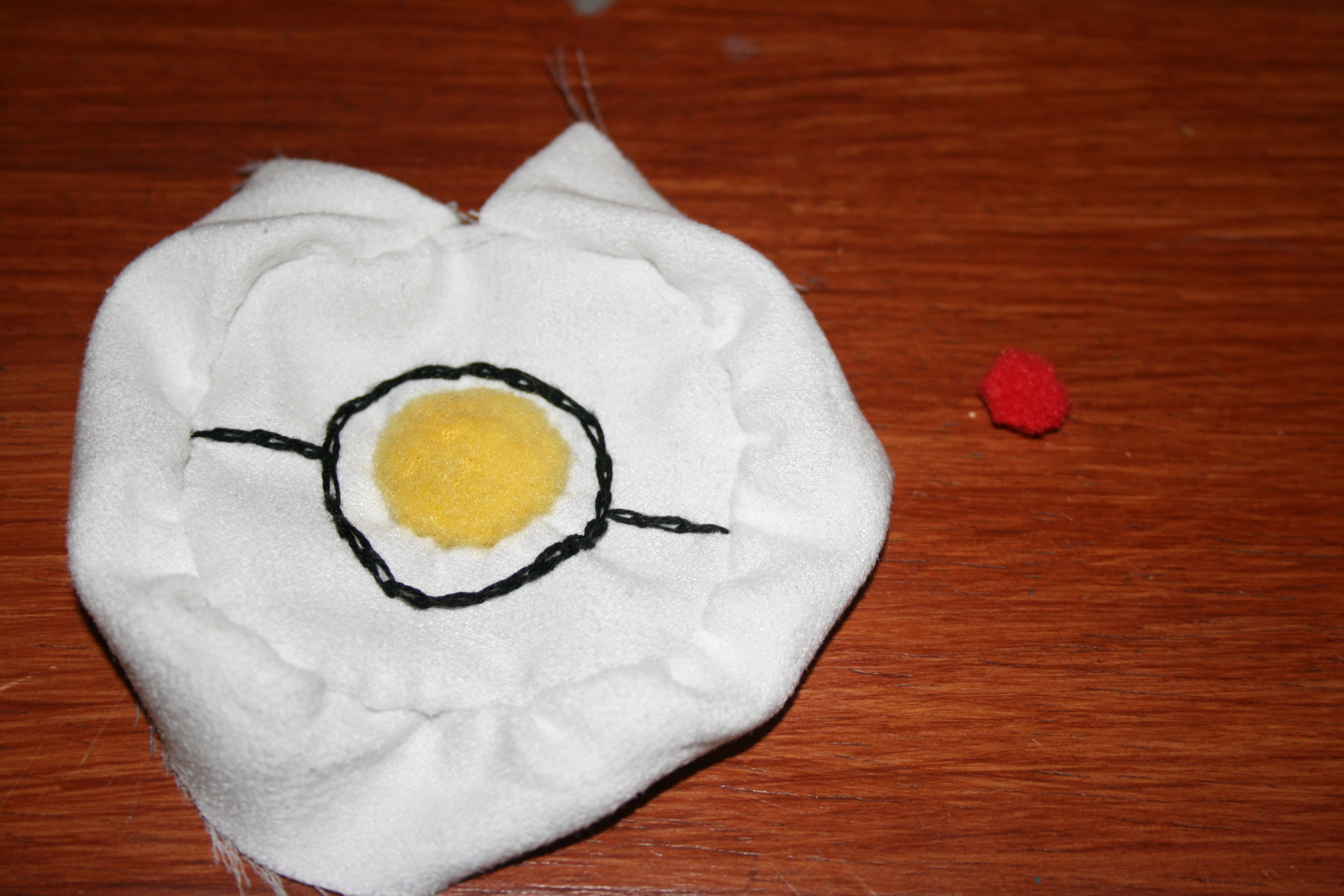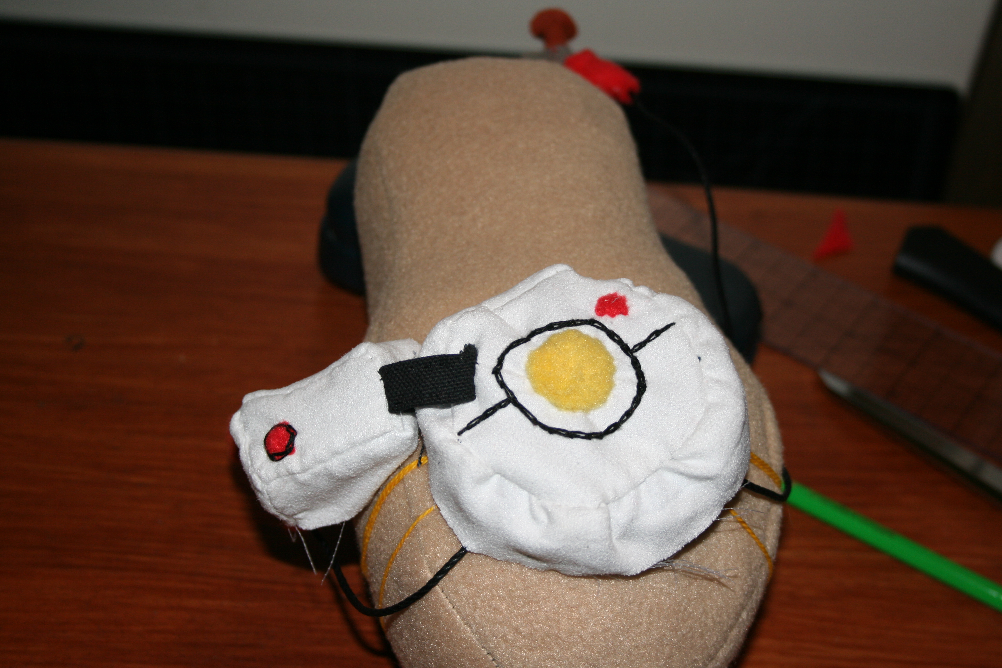 For the eye, trace around a nickel on your yellow fabric. Cut outside the line to cut the shape out. Use the nickel to trace the same circle in the center of GLaDOS' face. Using your white thread, perform a slip stitch between the two lines you traced, tucking the edges in underneath as you stitch. The small red lights on her face and other computer part are added the same way, but with smaller circles cut from red fabric.