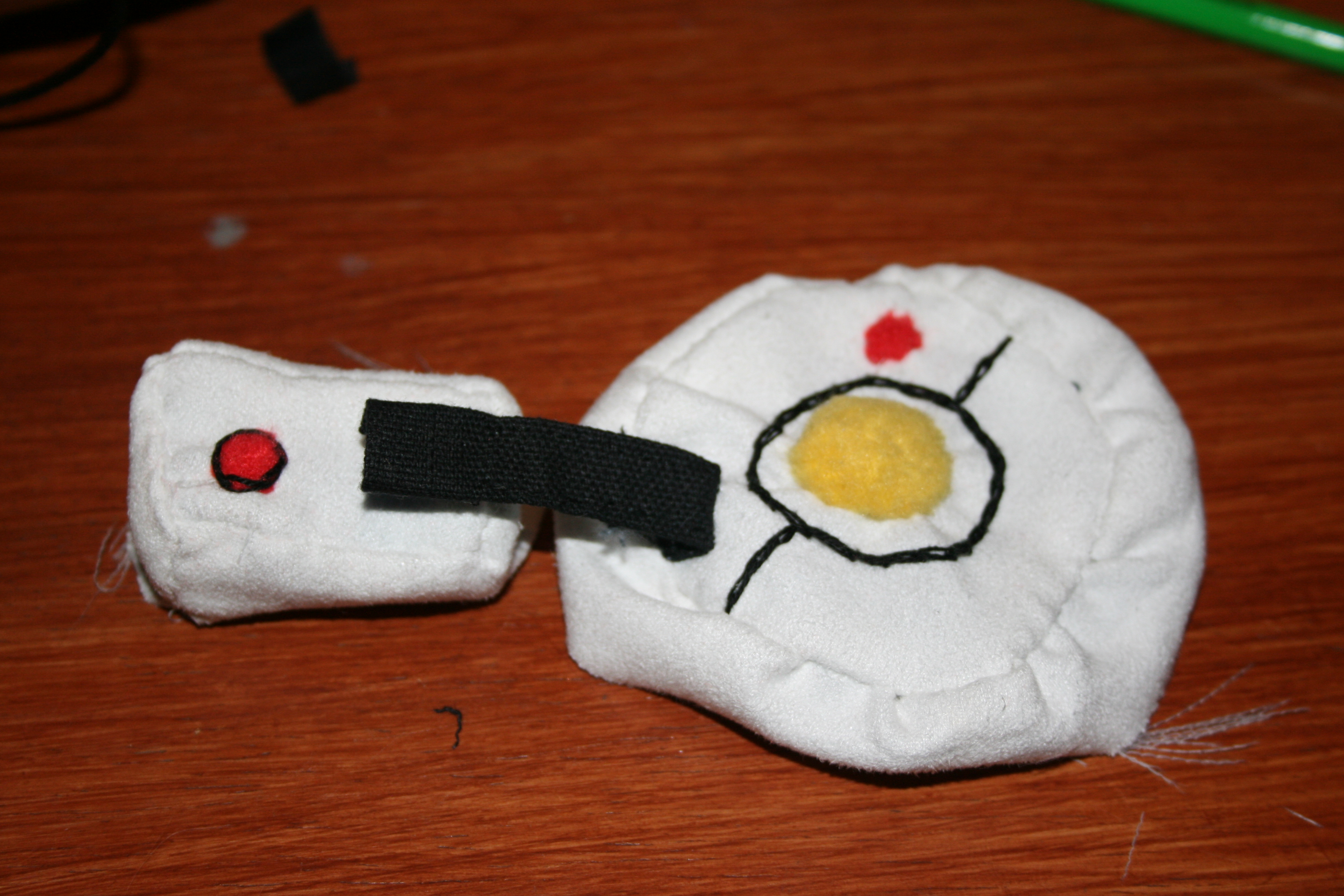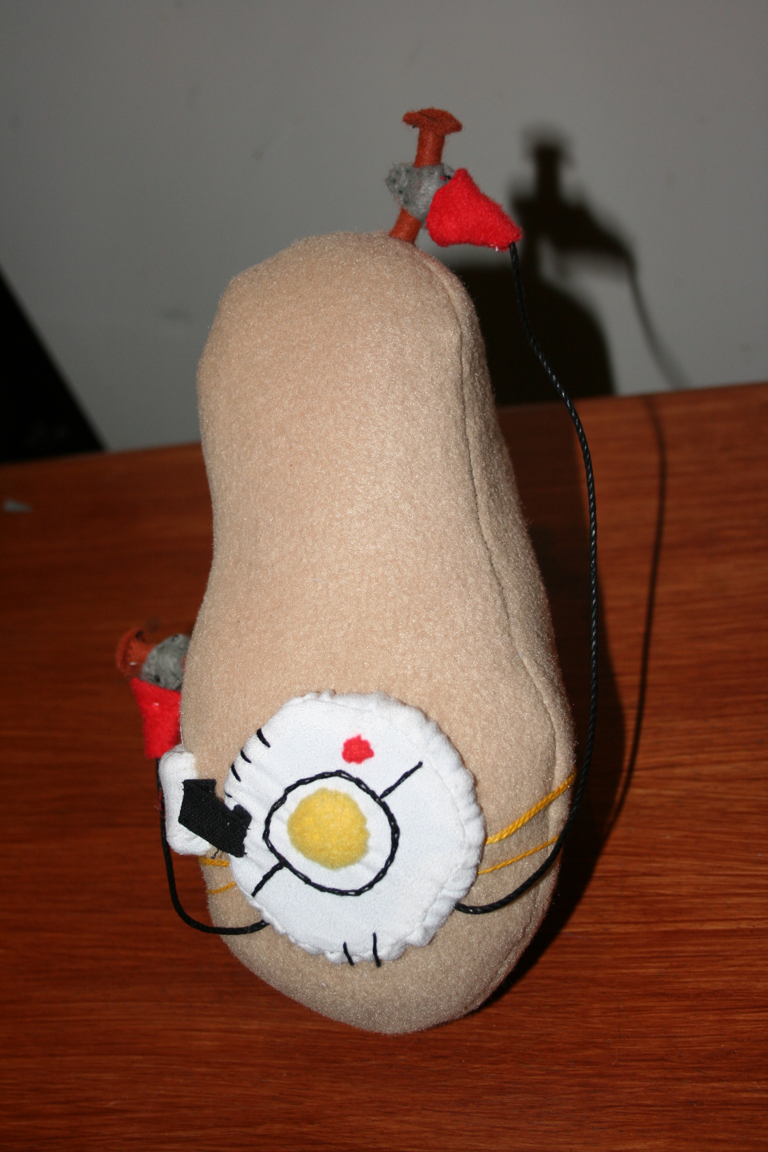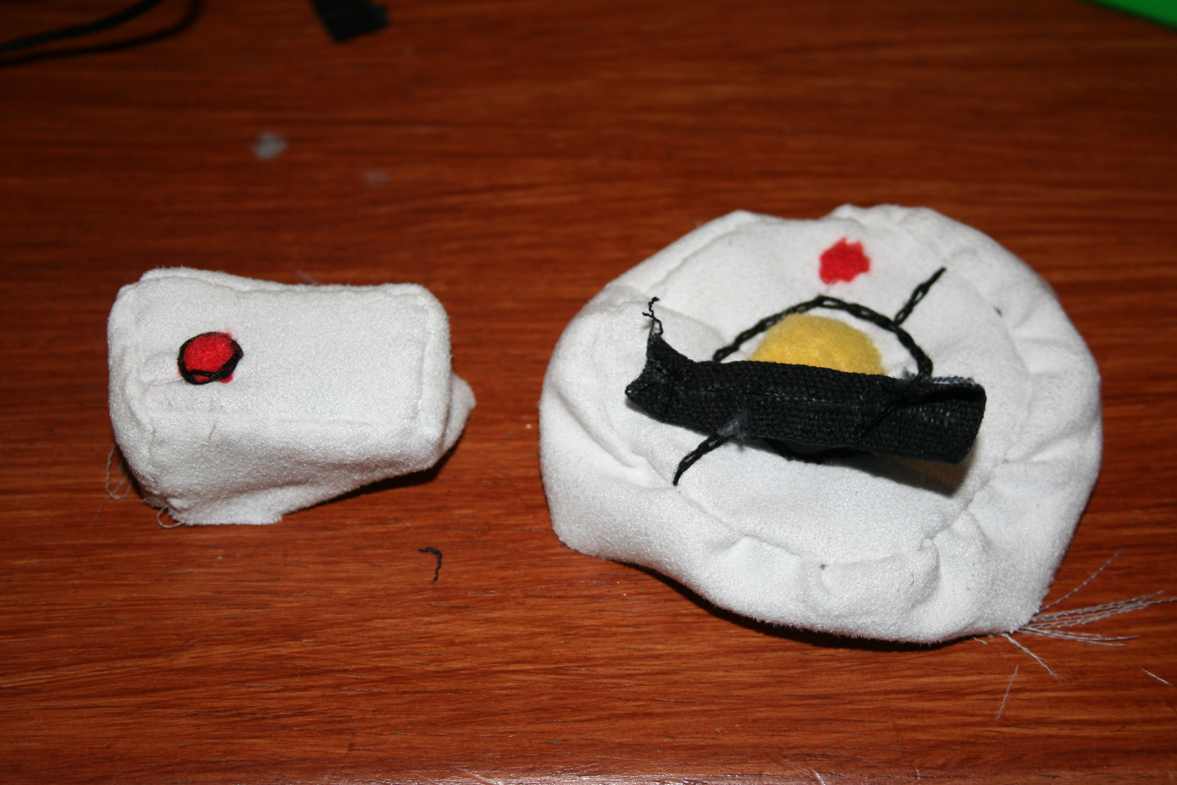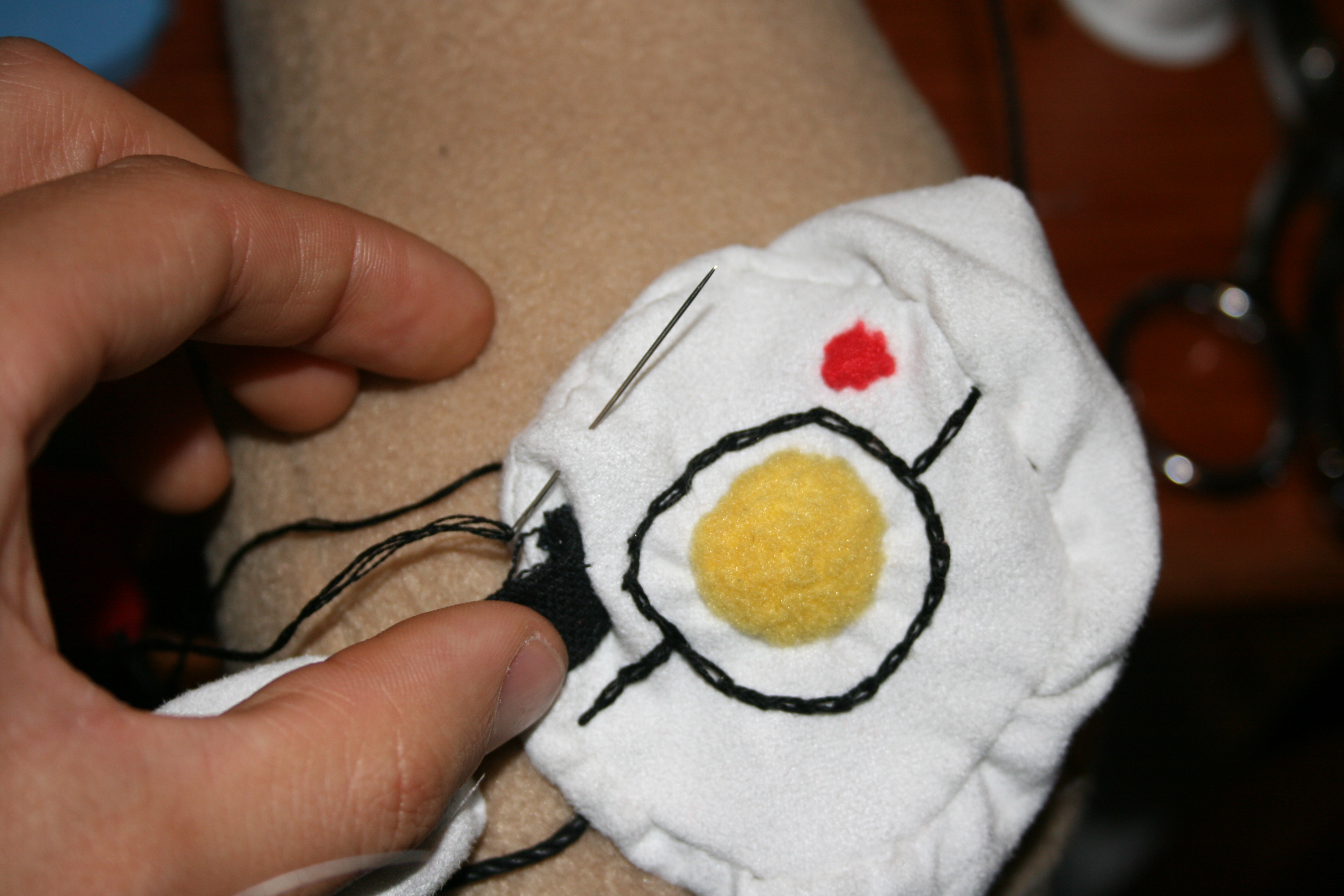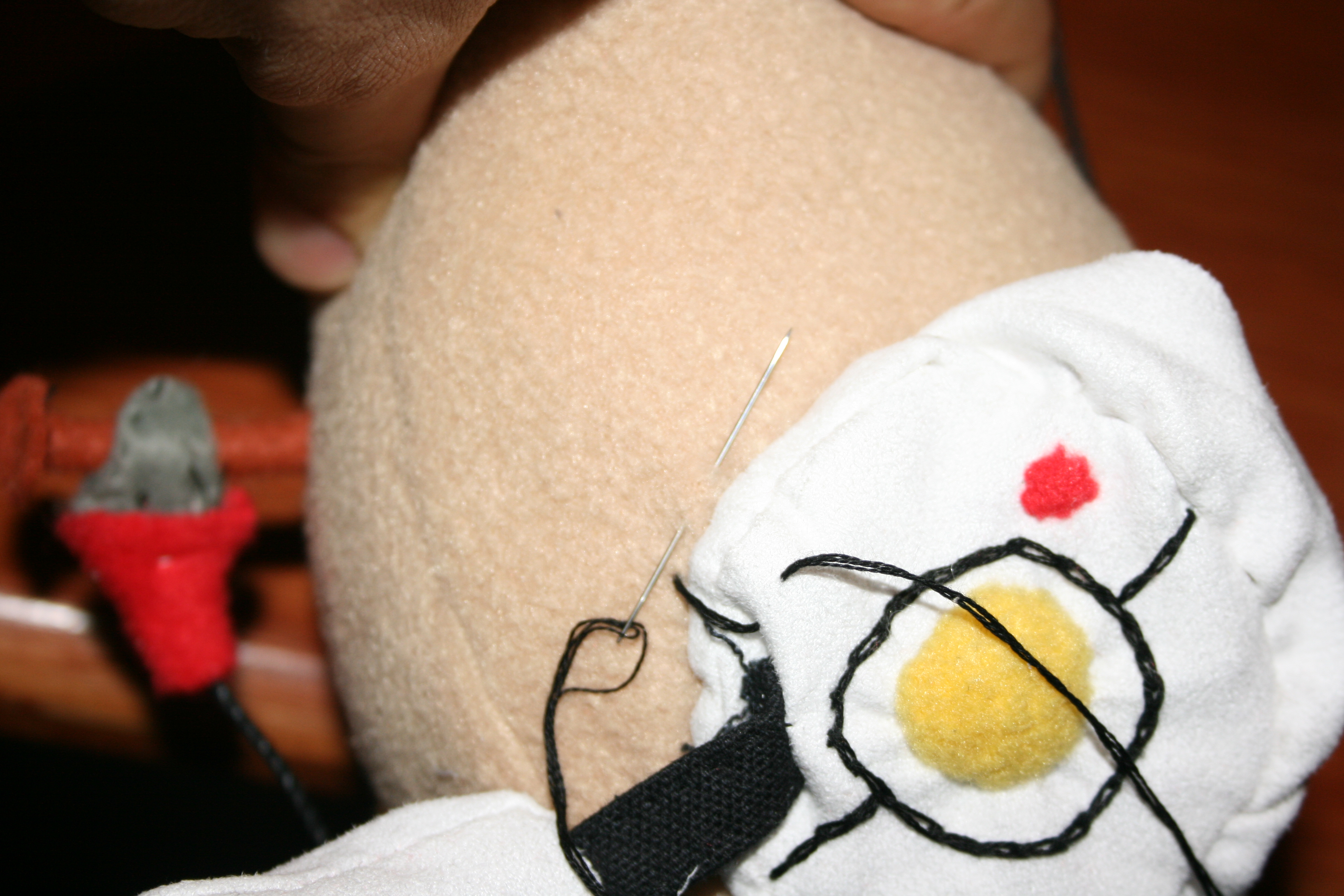For the eye, trace around a nickel on your yellow fabric. Cut outside the line to cut the shape out. Use the nickel to trace the same circle in the center of GLaDOS' face. Using your white thread, perform a slip stitch between the two lines you traced, tucking the edges in underneath as you stitch. The small red lights on her face and other computer part are added the same way, but with smaller circles cut from red fabric.