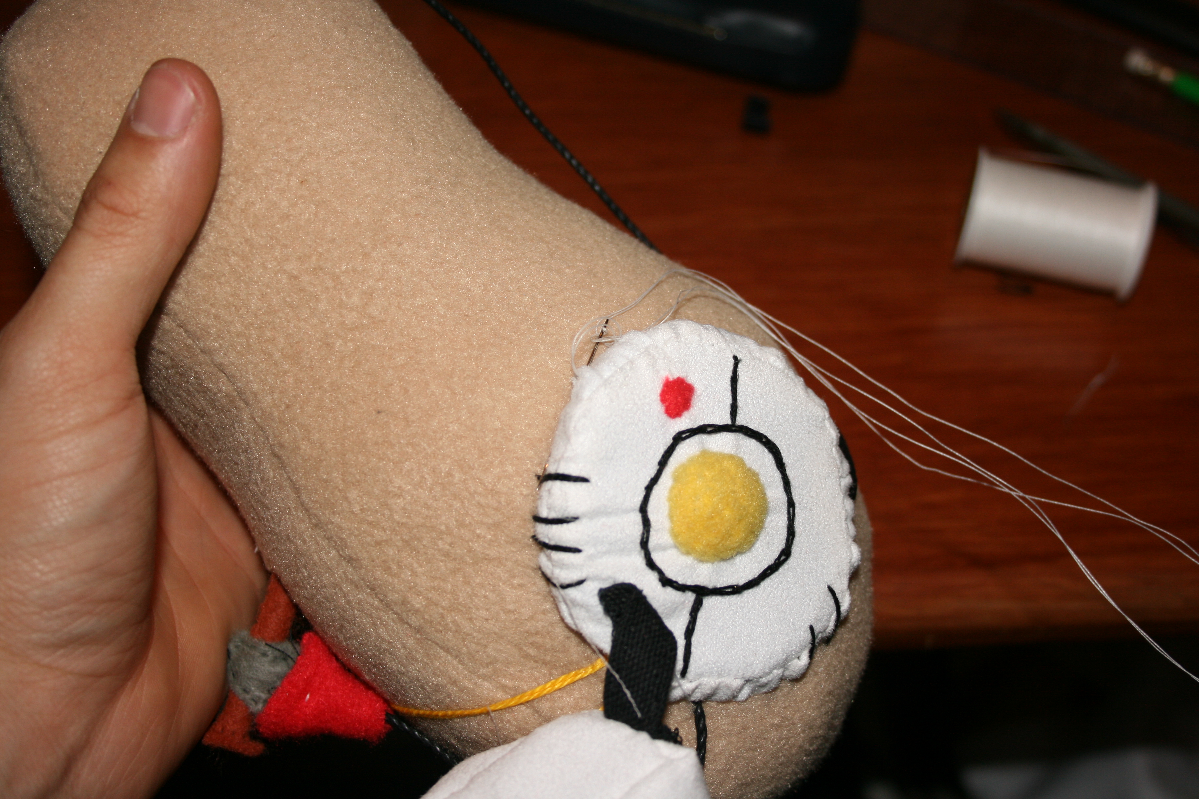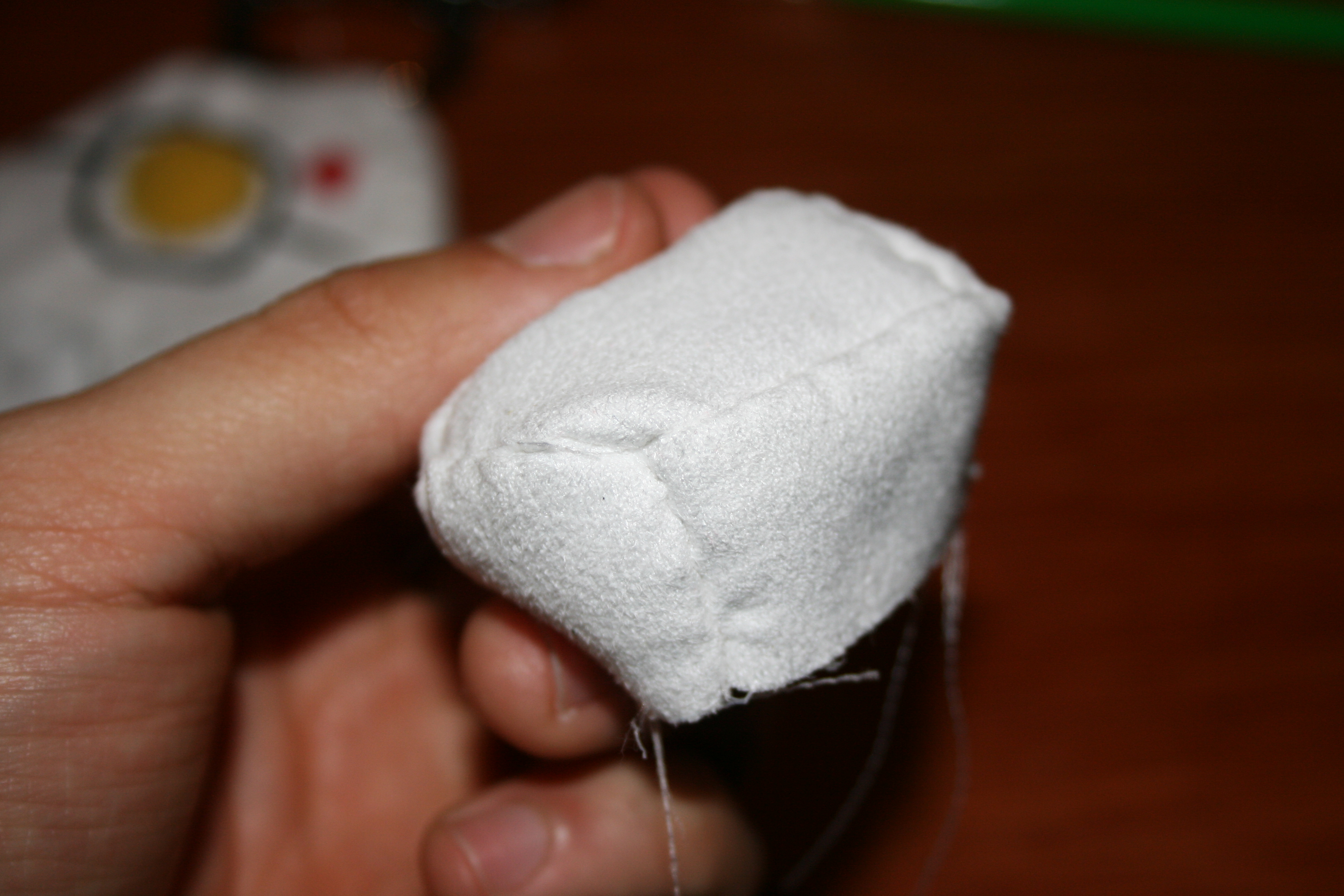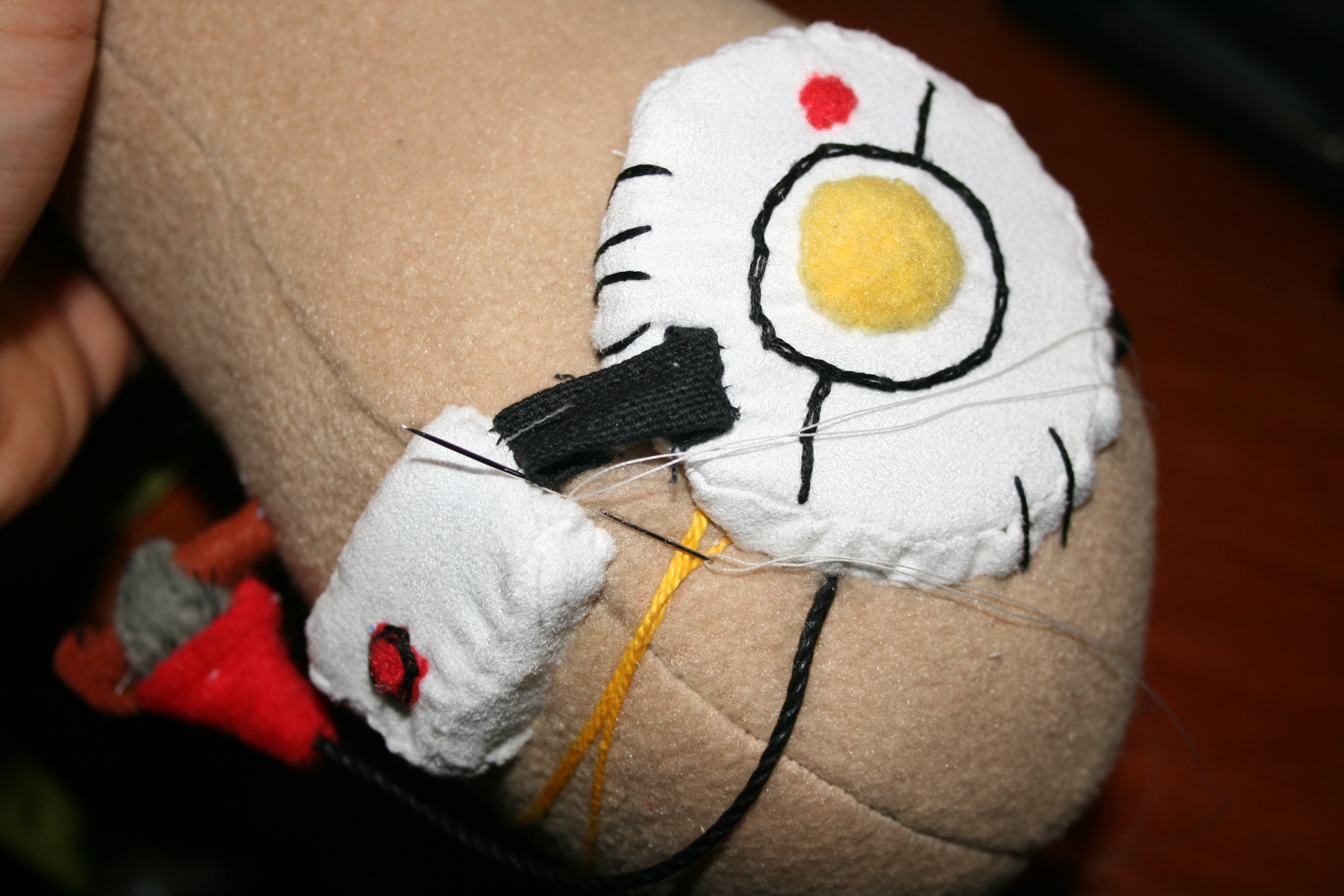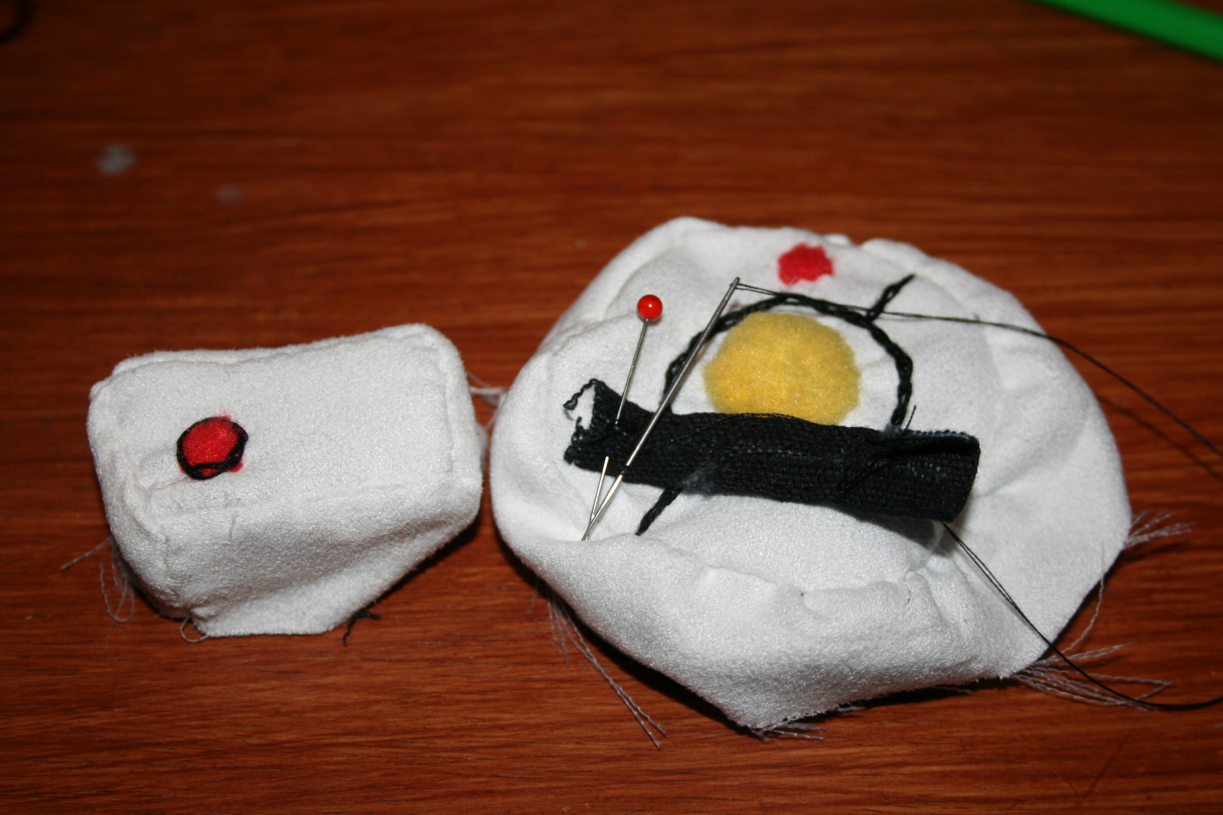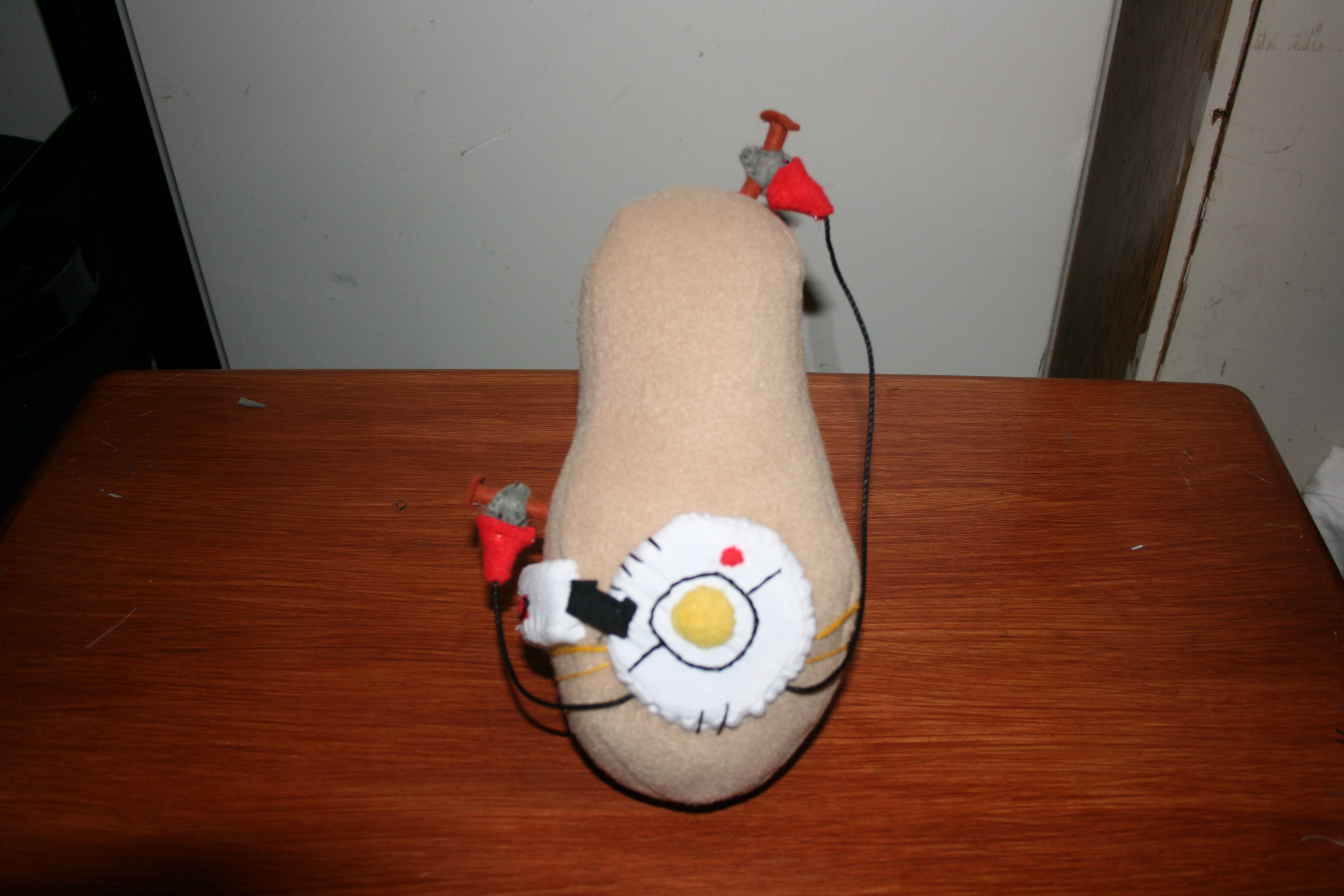For the eye, trace around a nickel on your yellow fabric. Cut outside the line to cut the shape out. Use the nickel to trace the same circle in the center of GLaDOS' face. Using your white thread, perform a slip stitch between the two lines you traced, tucking the edges in underneath as you stitch. The small red lights on her face and other computer part are added the same way, but with smaller circles cut from red fabric.