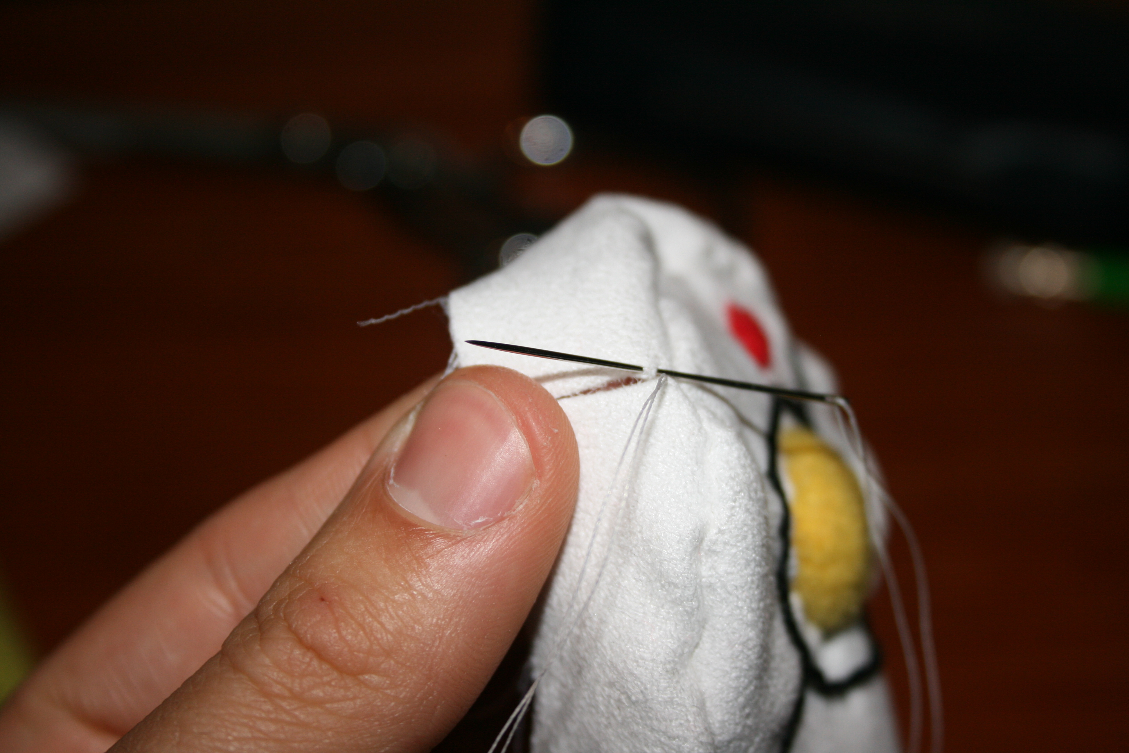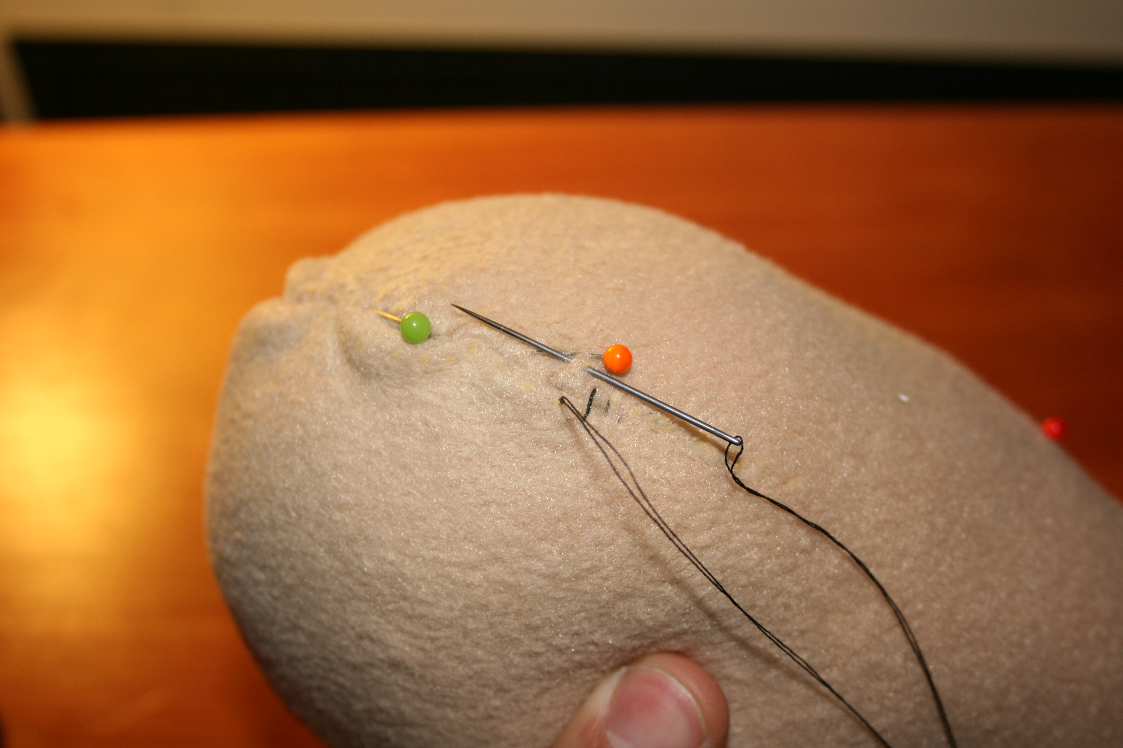 Start by aligning the fabric on either side of the seam and folding in the edges to the inside of the doll. After you've threaded the needle (directions on the 'running stitch' page) start your stitch from the underside of the fabric at one end of the seam. The best place you can put it will probably be along the fold from the inside. Pull your needle from the inside of the fabric to the outside on the folded edge.