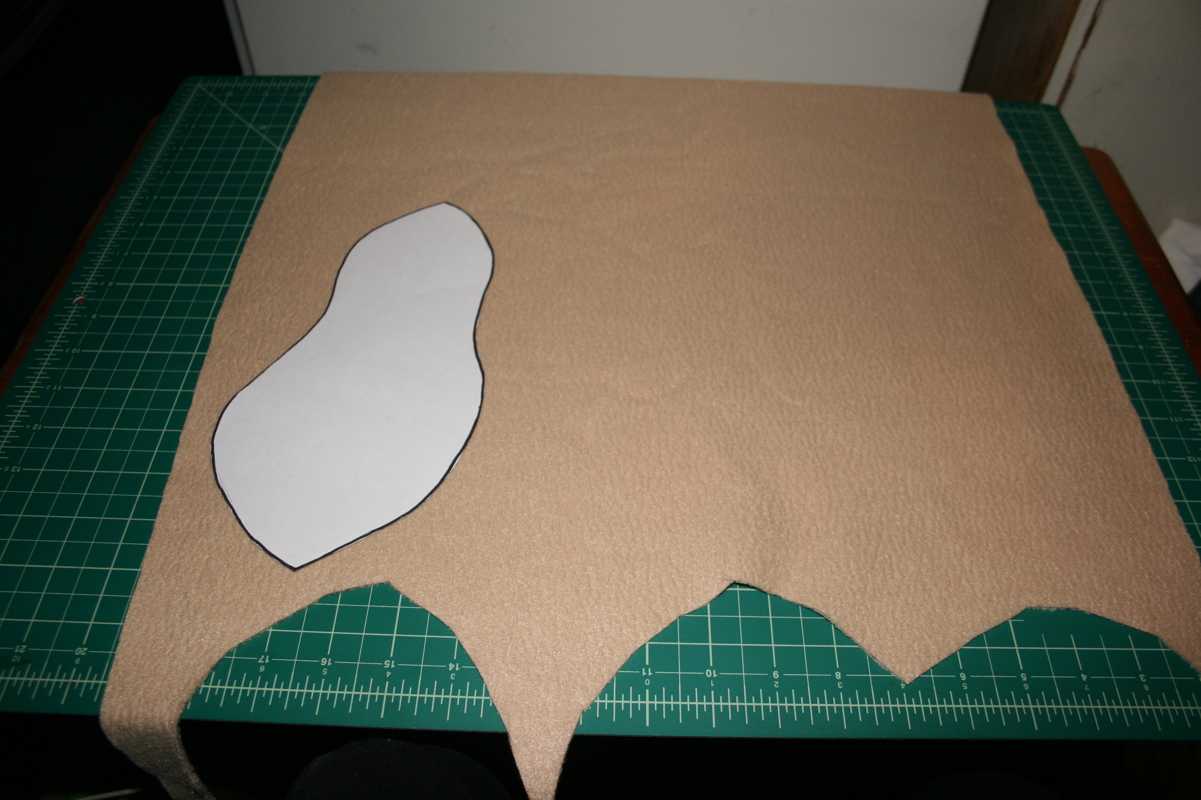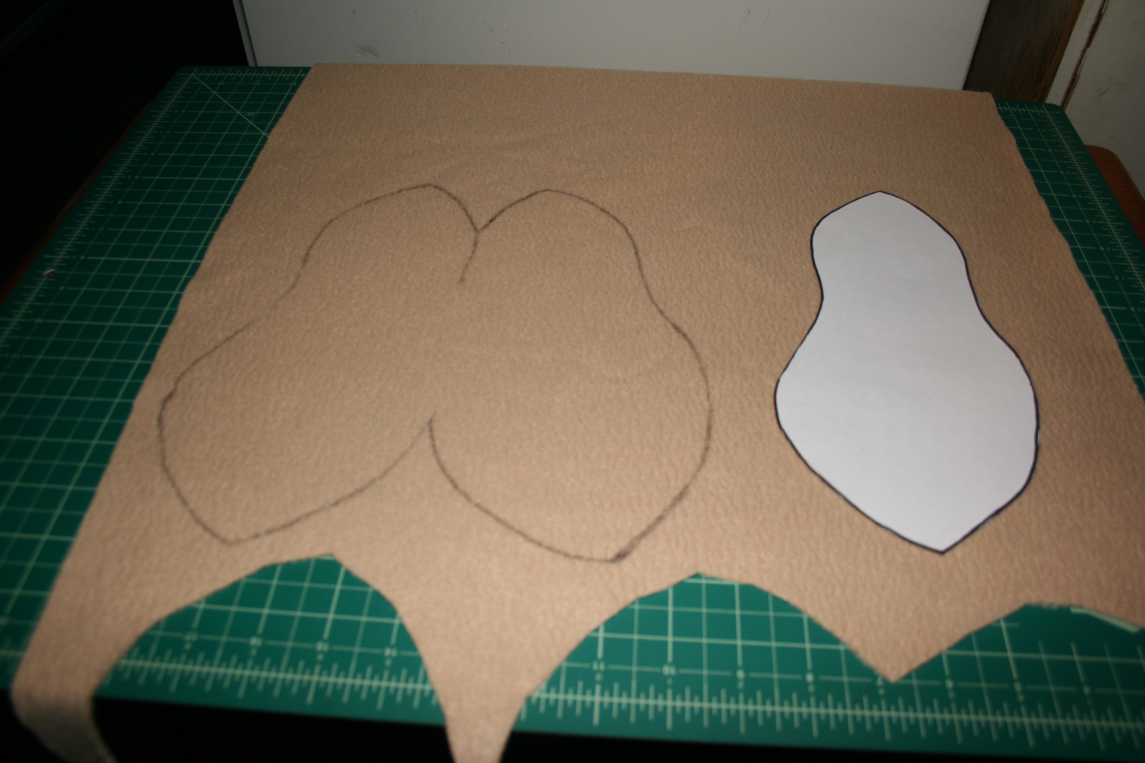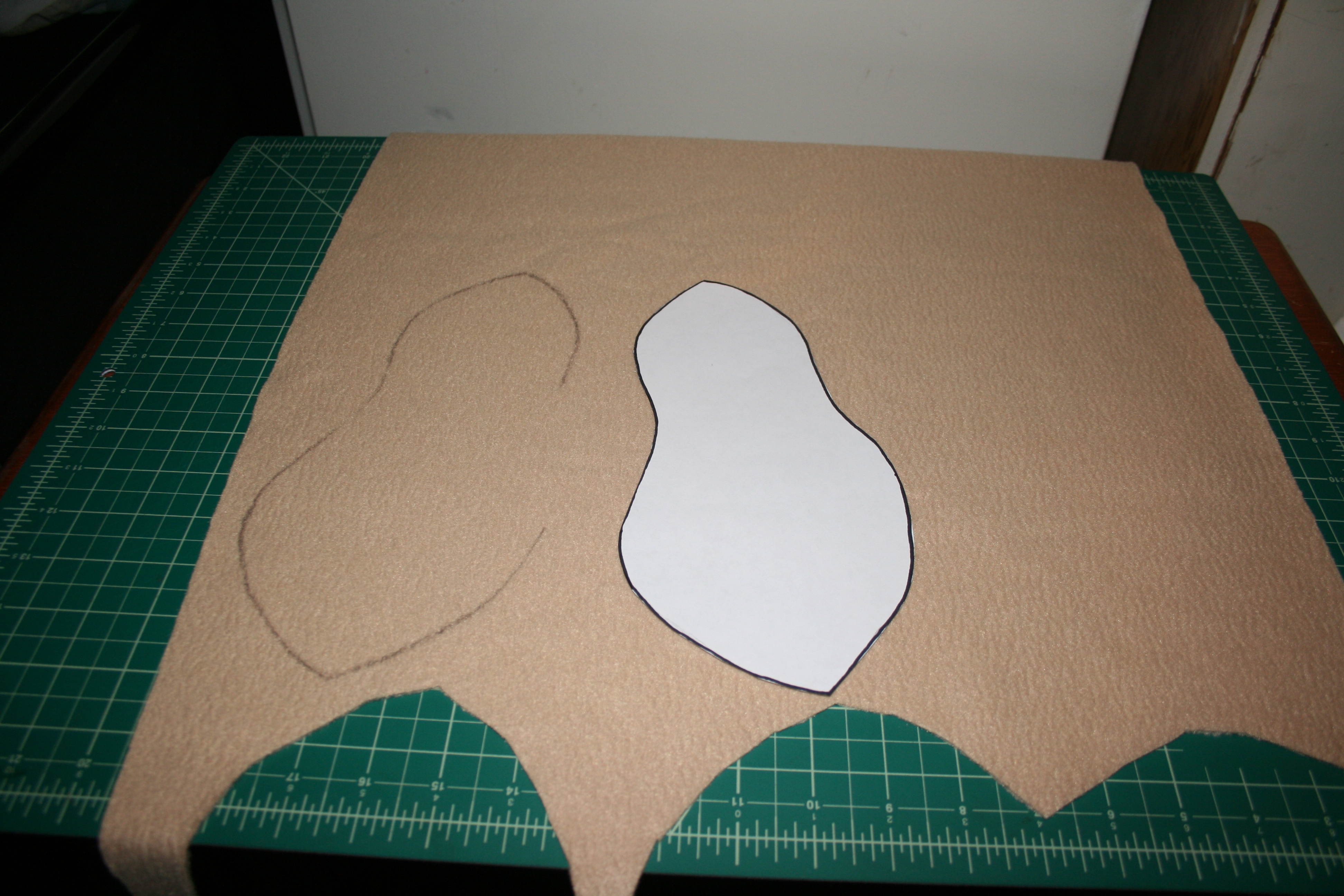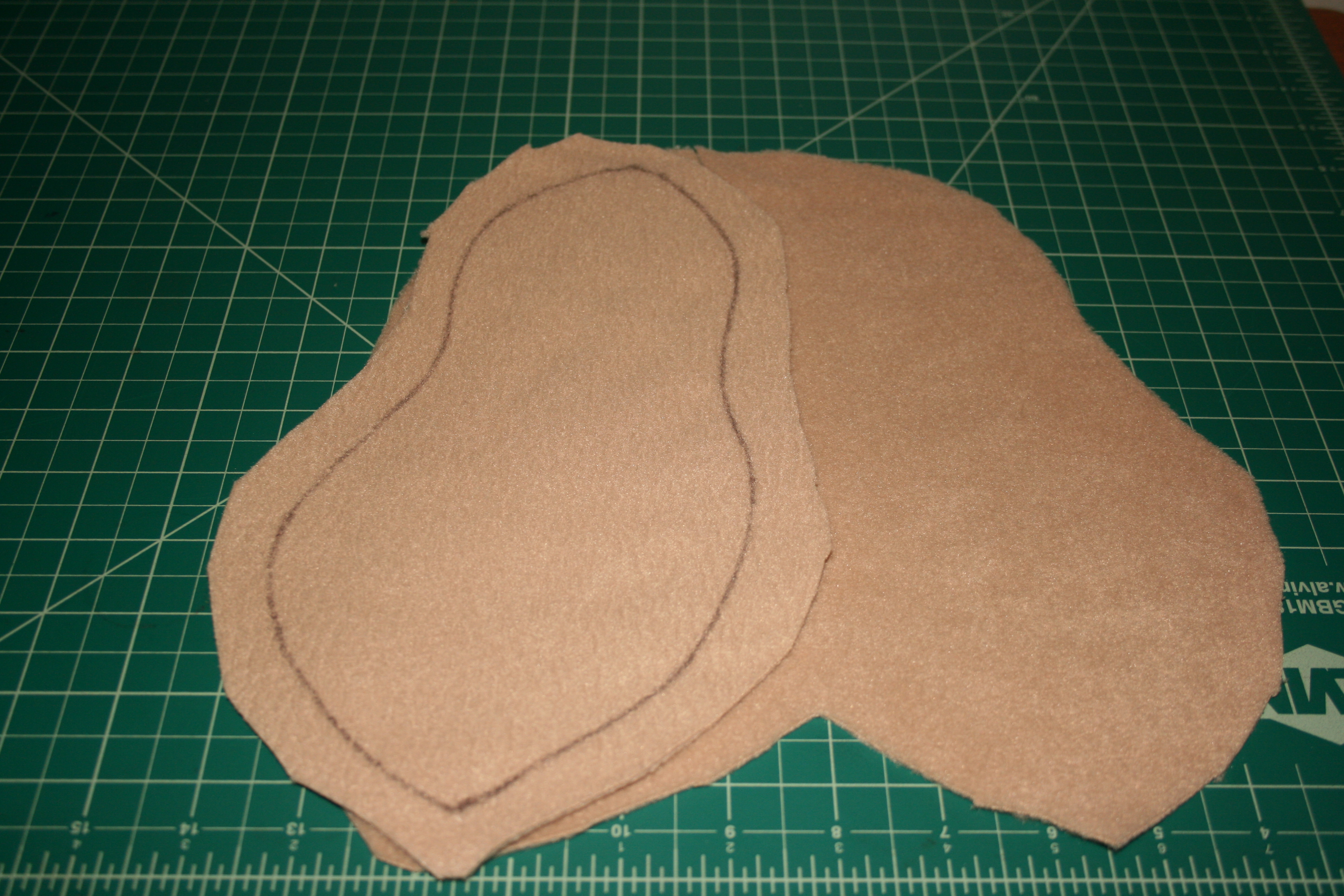 Cut out your potato stencil and lay it on your brown fabric. Leaving plenty of room on the stencil's right side, trace around the edges, except with a gap between the two points that stick out furthest toward the right. Move your stencil over and place the two points that fall furthest left against the open portion of the outline you previously traced. Draw around the stencil creating one shape made up of two joined potato faces.