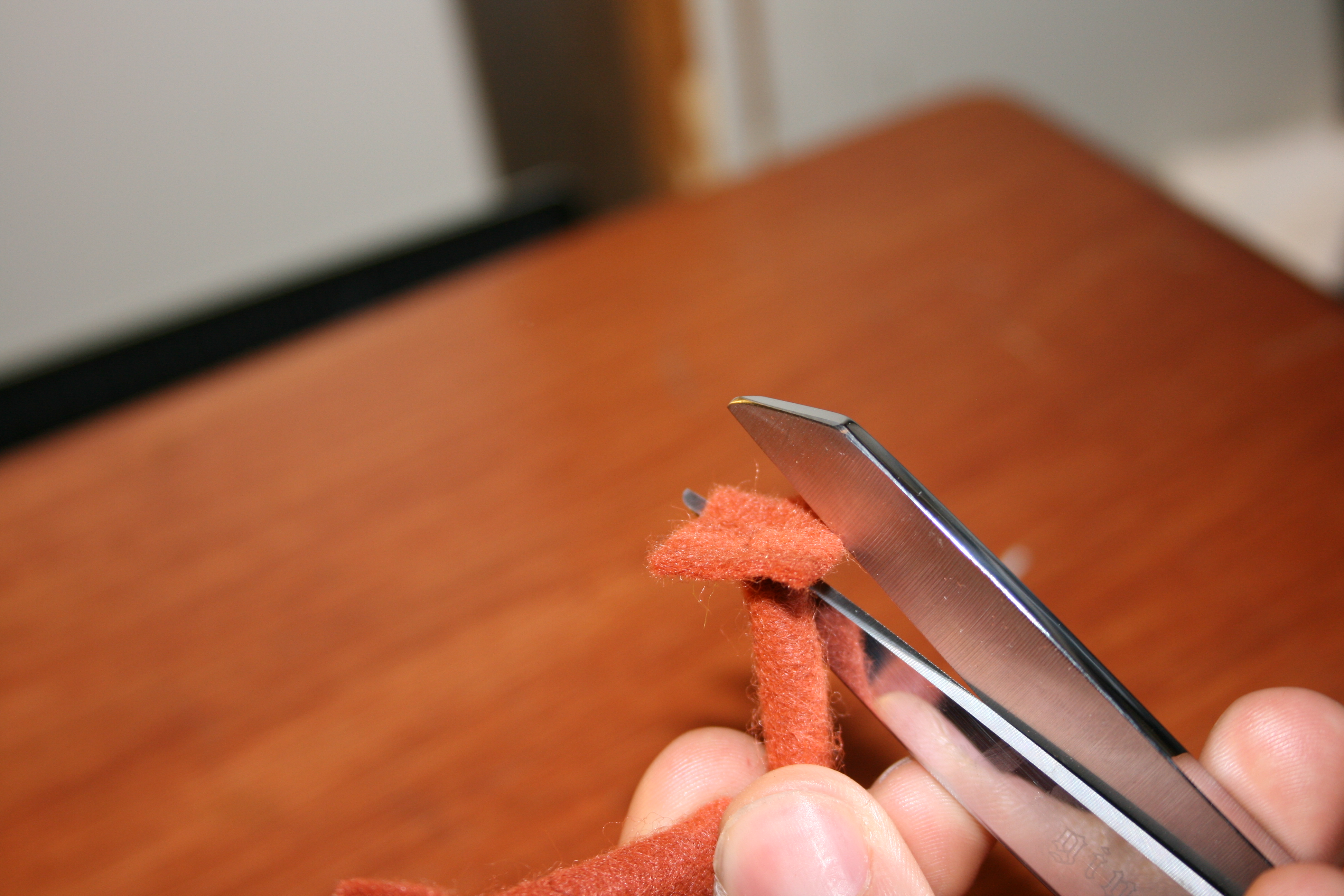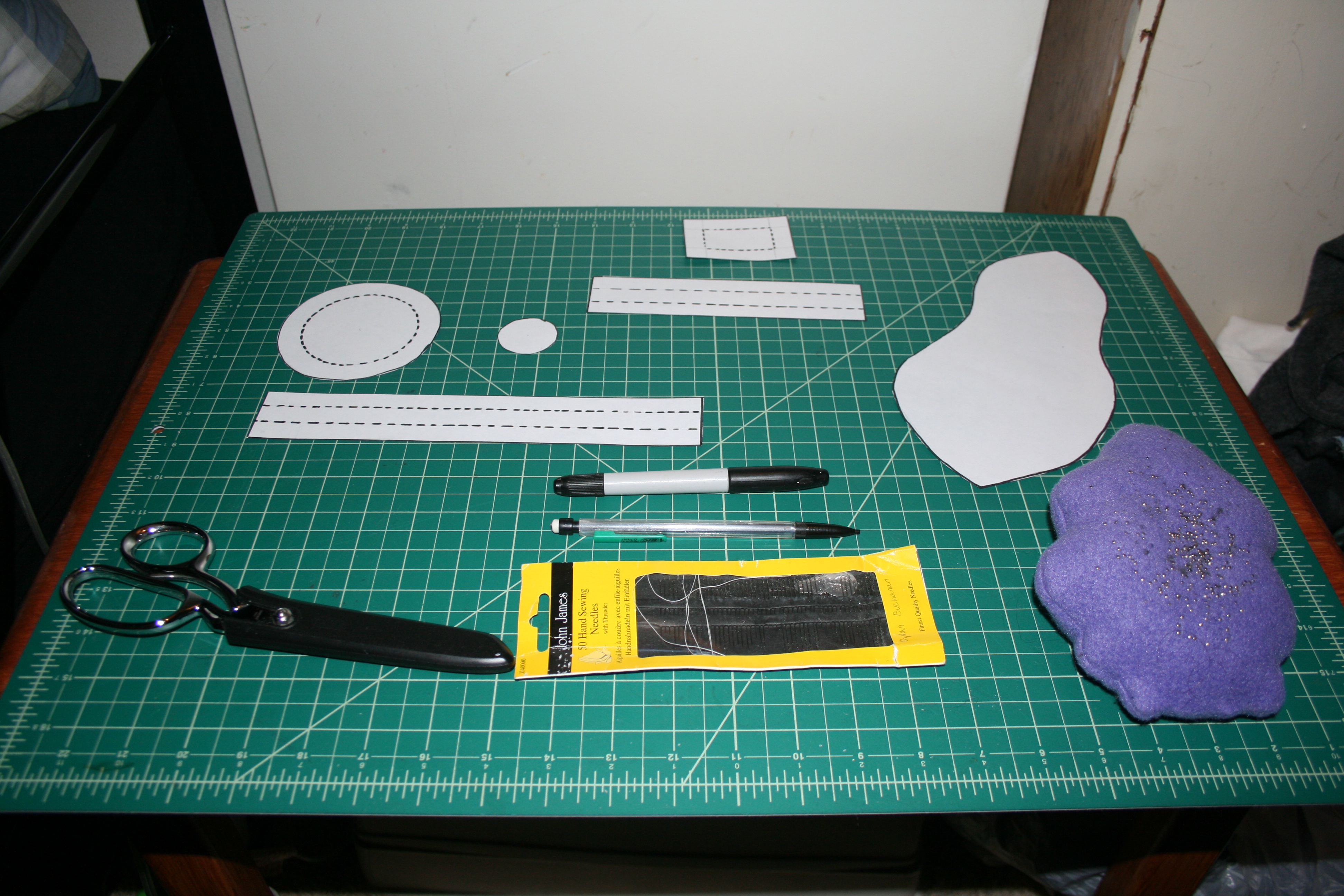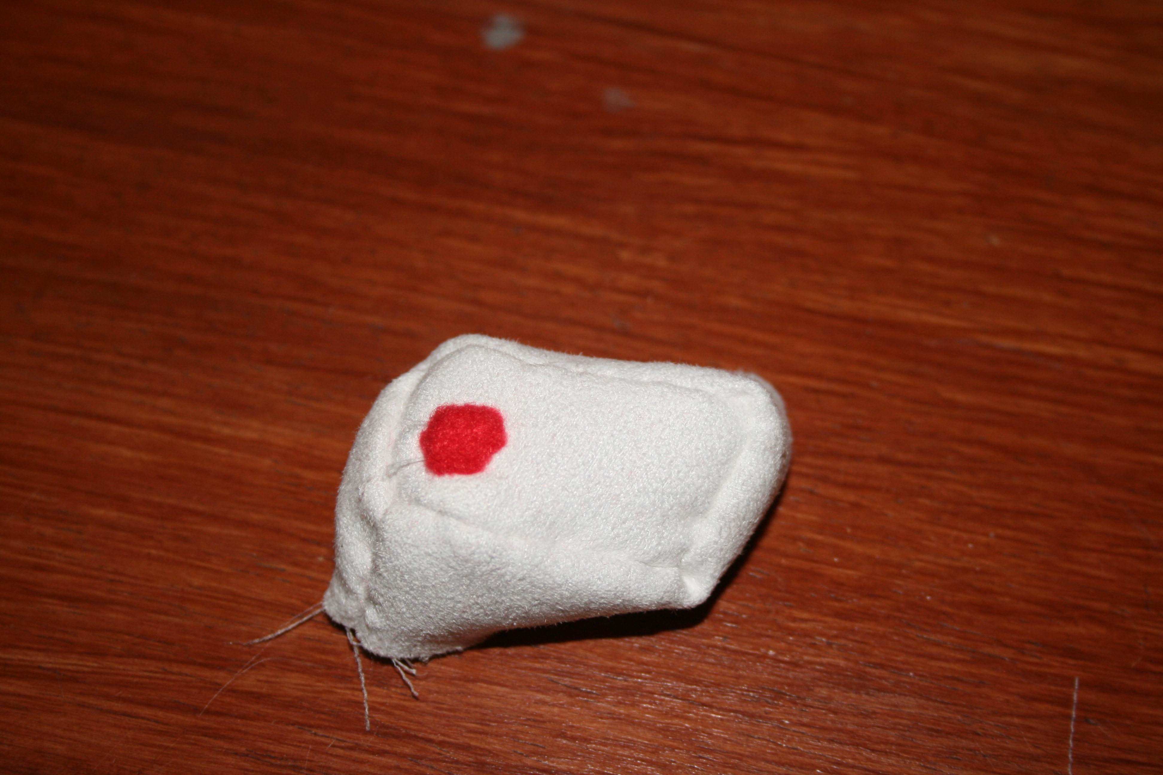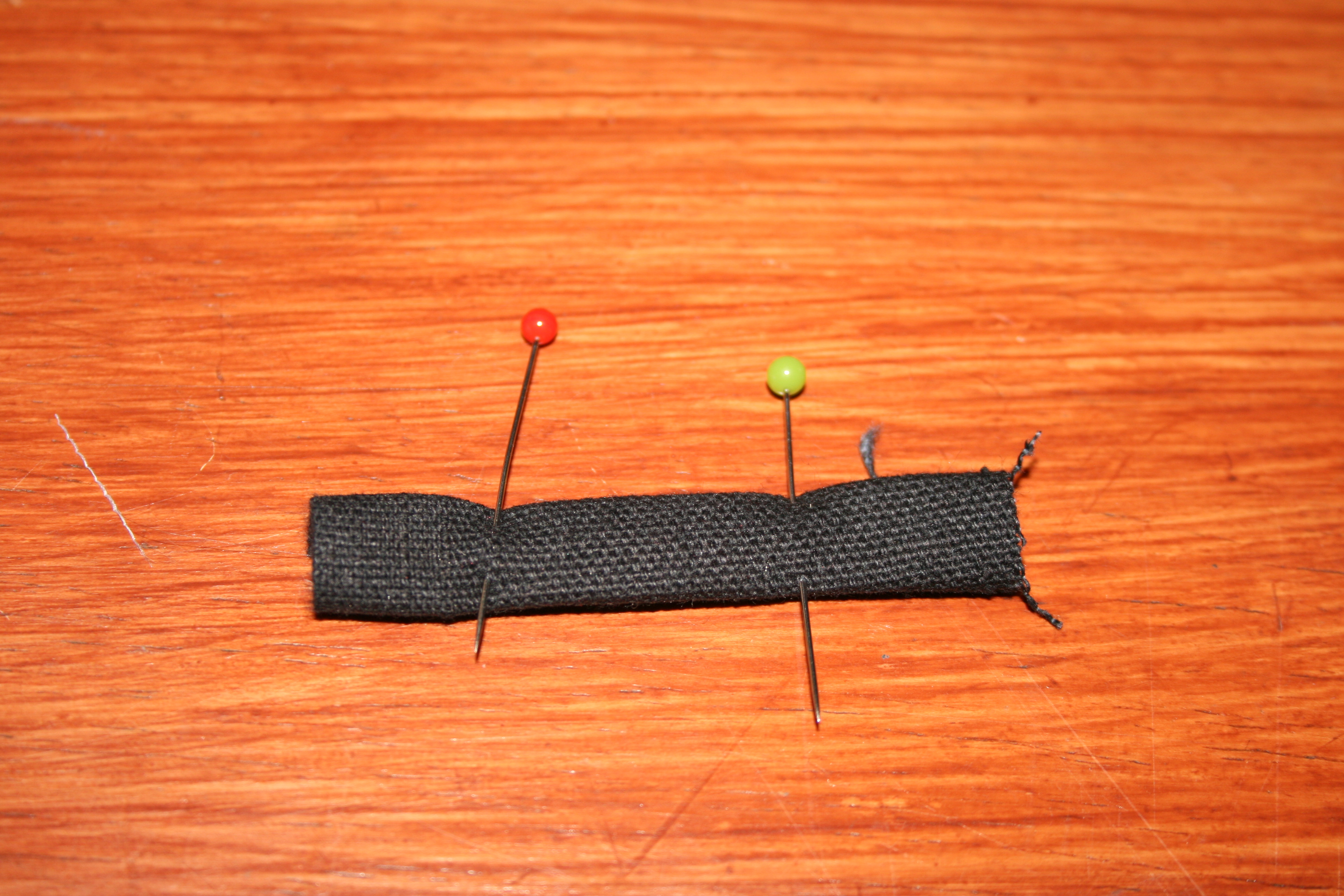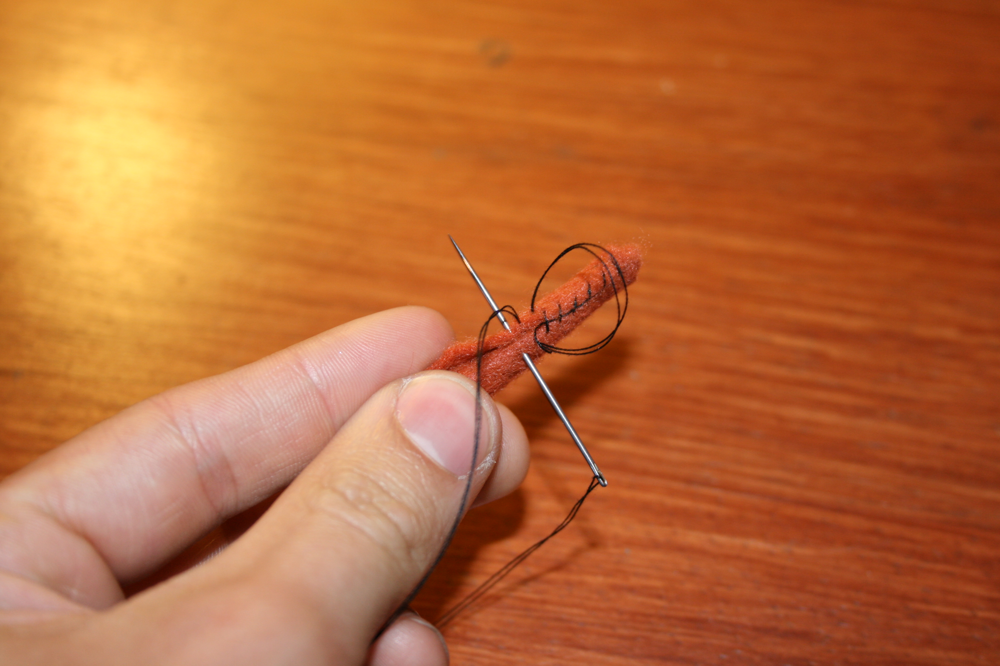 Using your felt (or other thick fabric) cut out a strip about an inch and a half wide. The length needed will vary from person to person. Roll up the fabric as tightly as you can until it is stiff enough to hold its shape. Shave off the excess and stitch the loose end down. Do this twice.