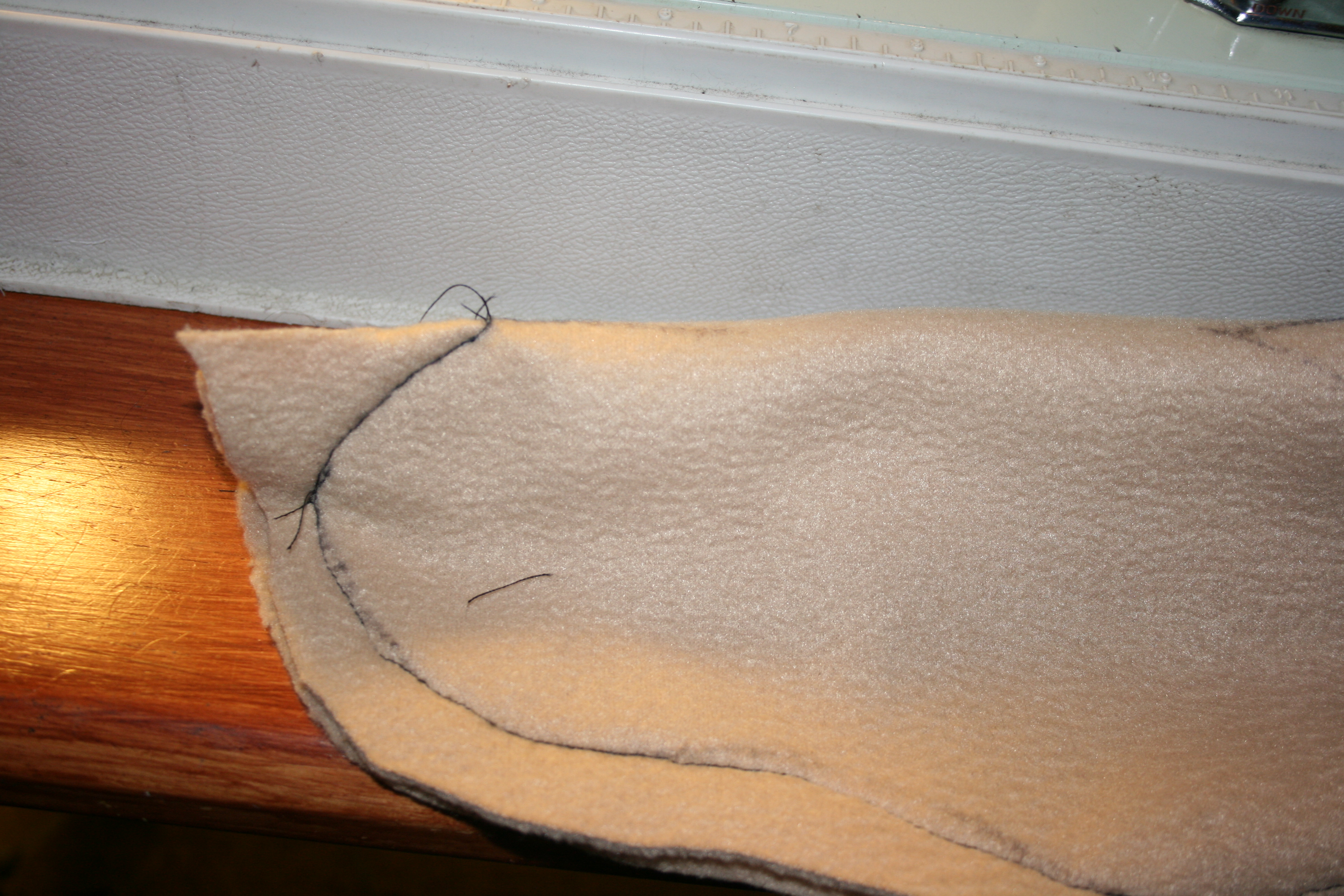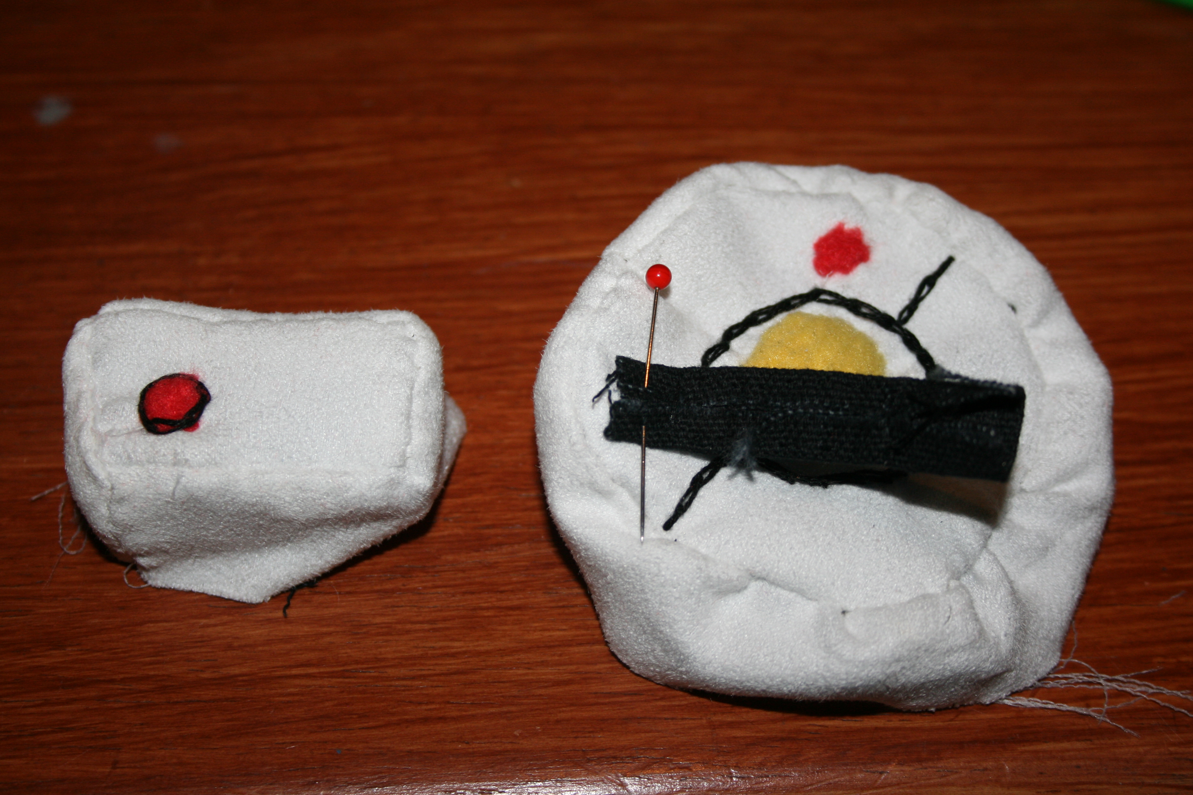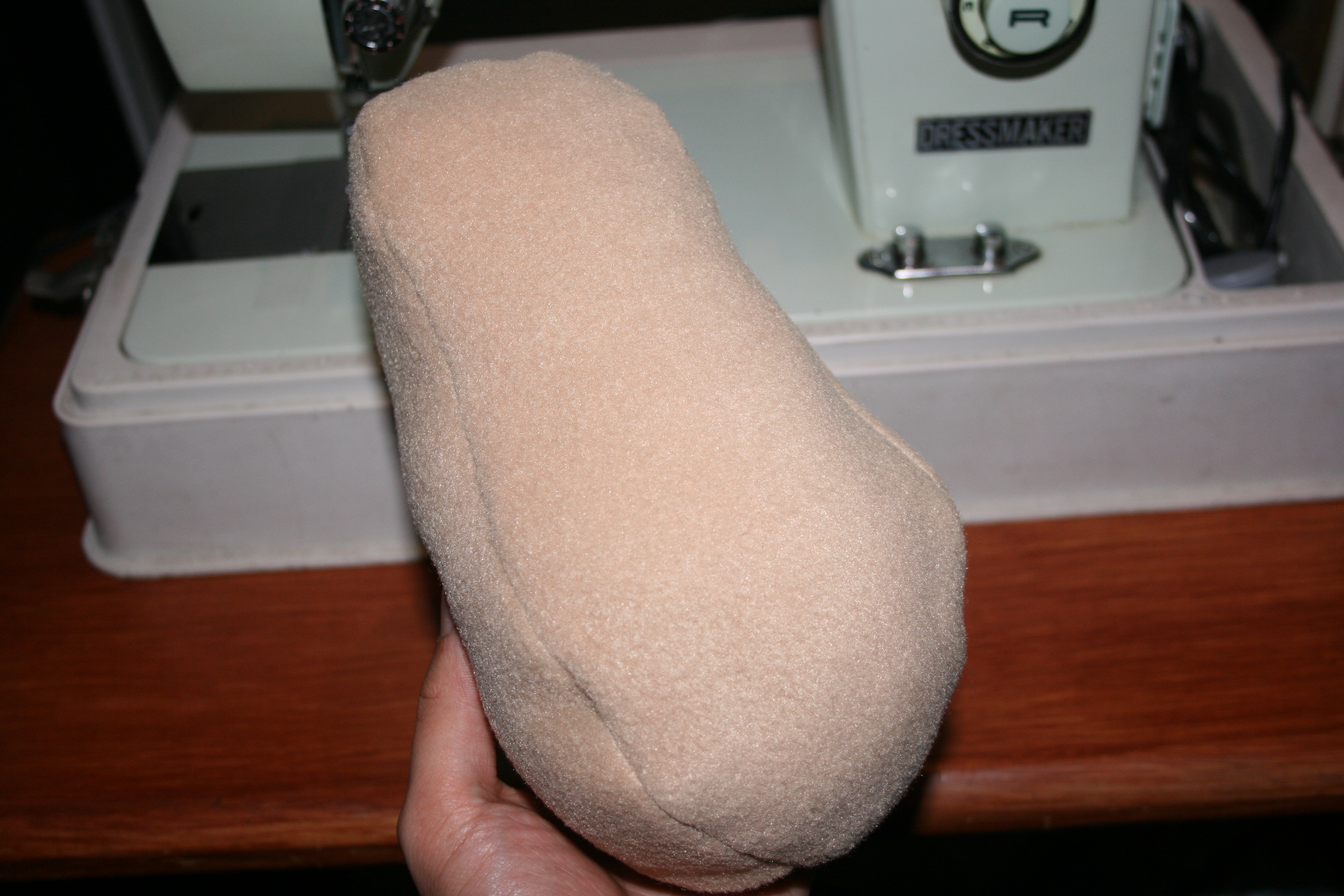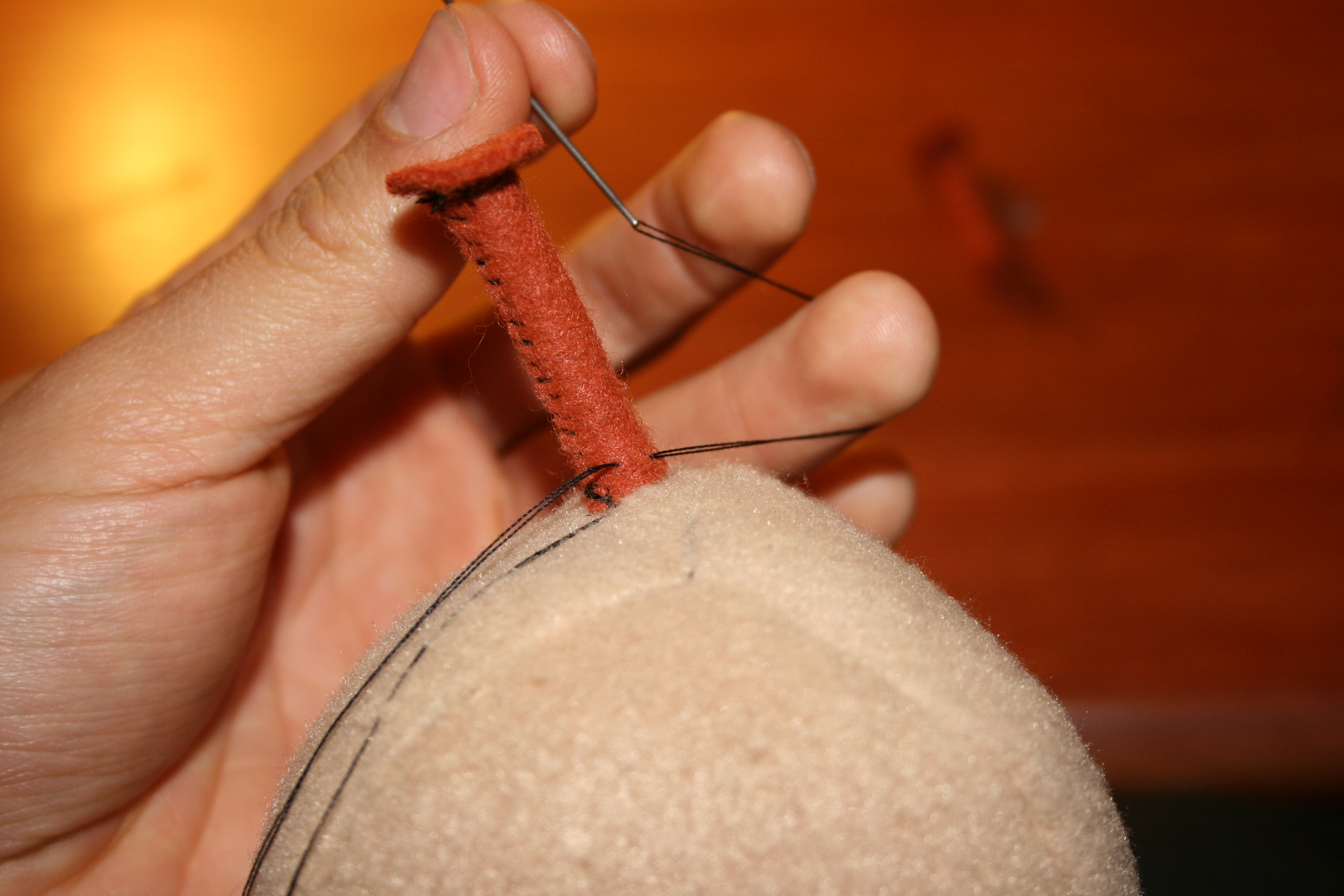 Using your felt (or other thick fabric) cut out a strip about an inch and a half wide. The length needed will vary from person to person. Roll up the fabric as tightly as you can until it is stiff enough to hold its shape. Shave off the excess and stitch the loose end down. Do this twice.