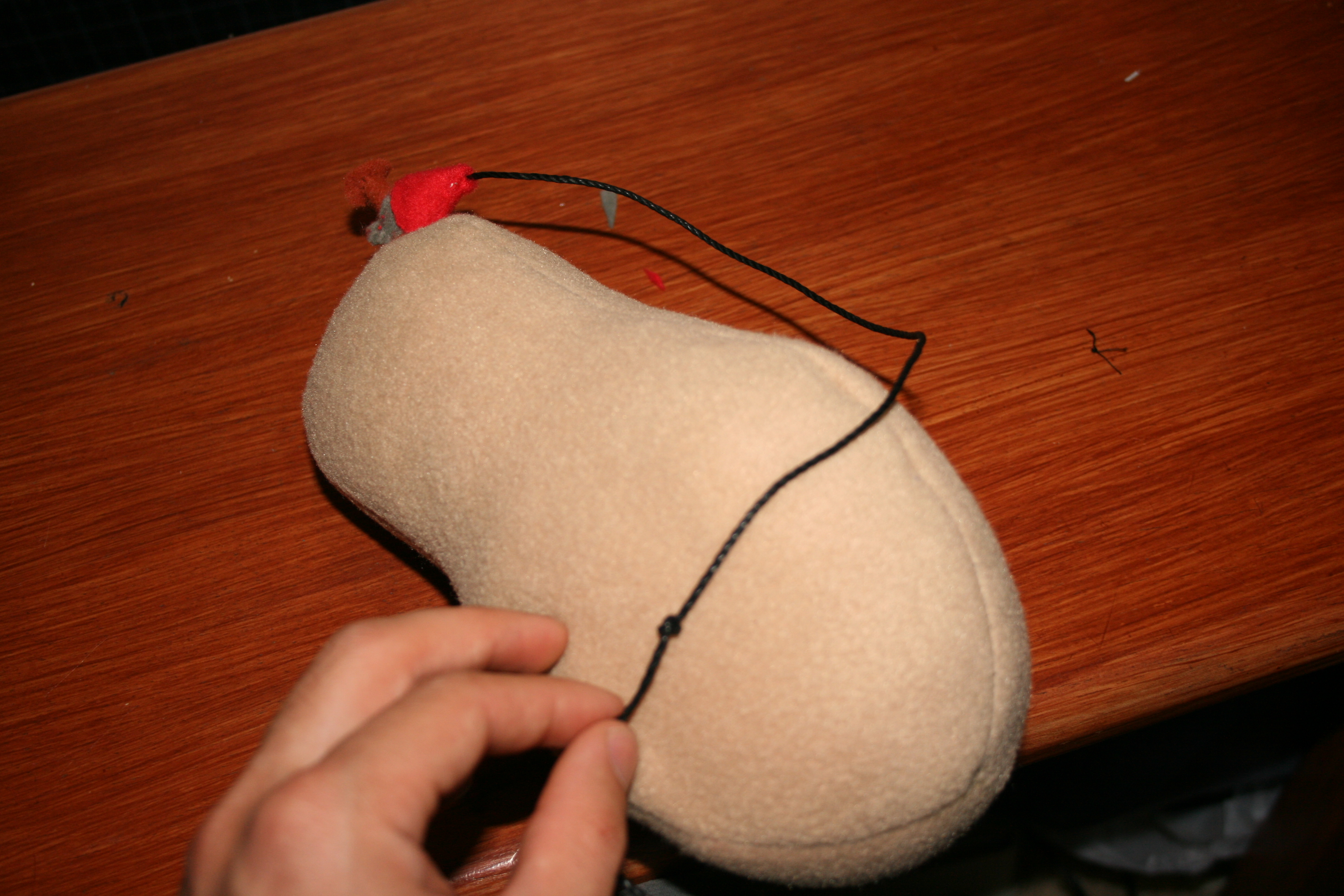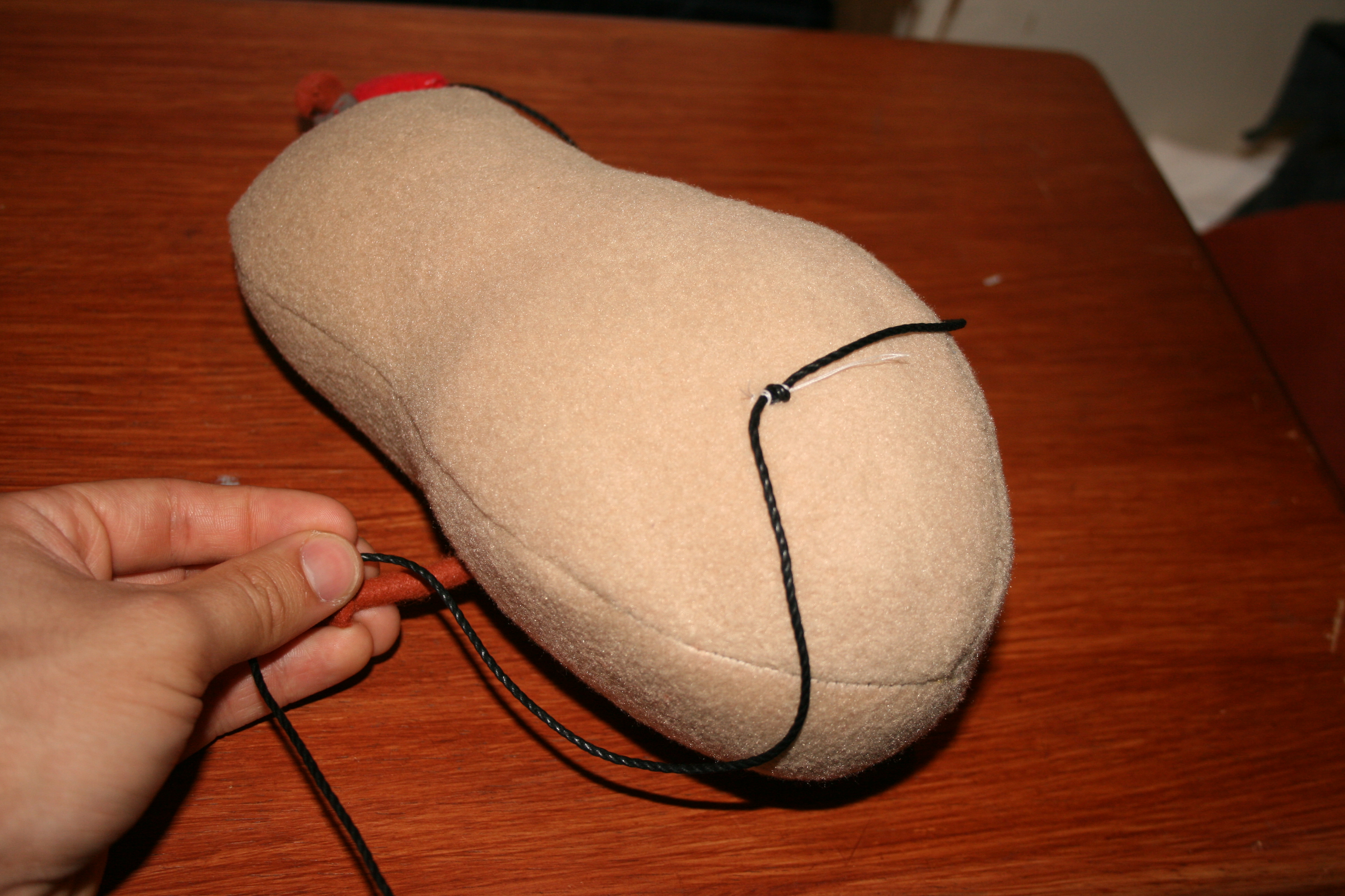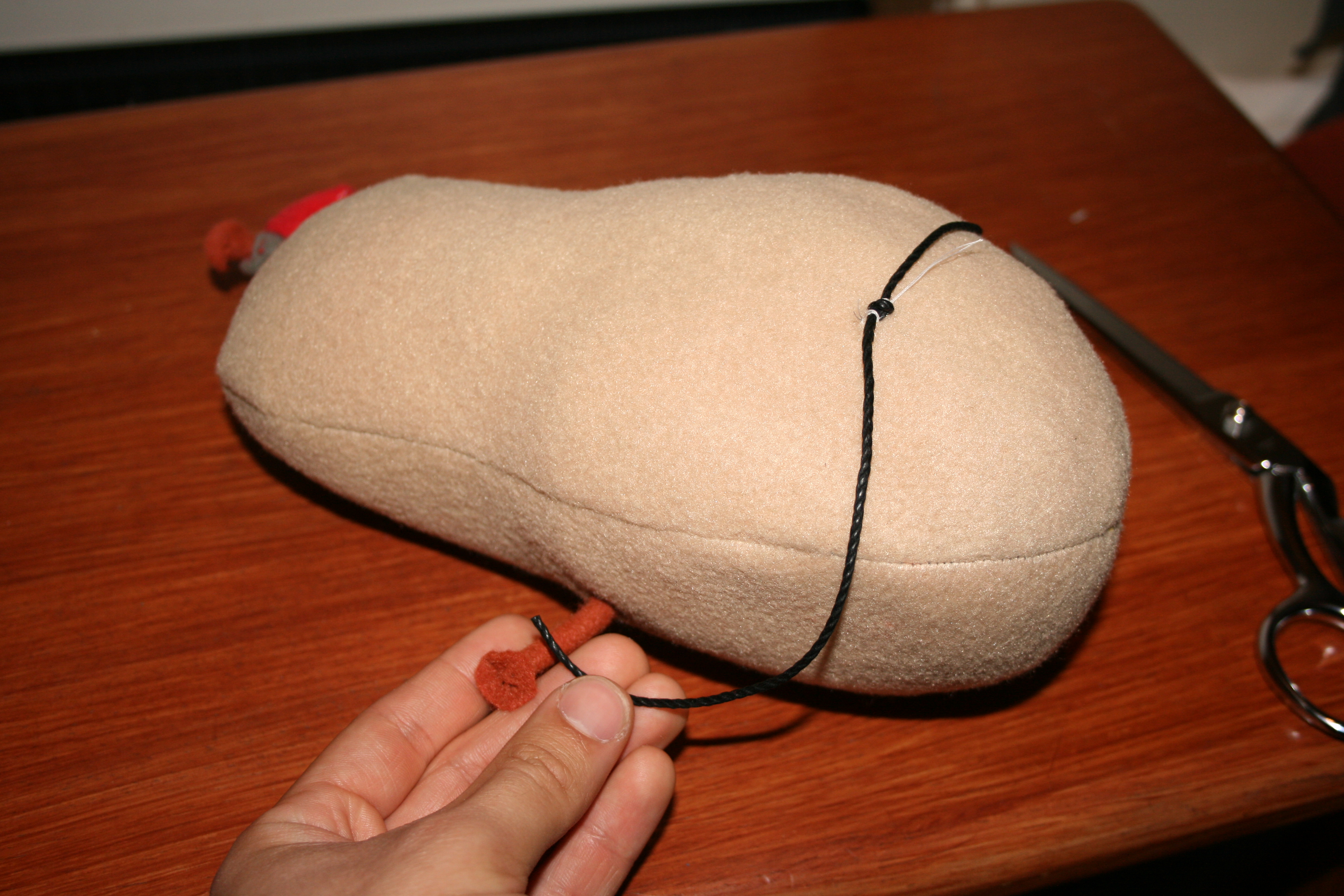 Run the length of the cord down to the fattest section of the potato. The center of the front face is where you will be placing GLaDOS' face. Tie a large knot about 11 1/2 inches down the line from the alligator clip and place it down at the center of where her face will be. Place a few tight stitches on either side of the knot to hold it in place.