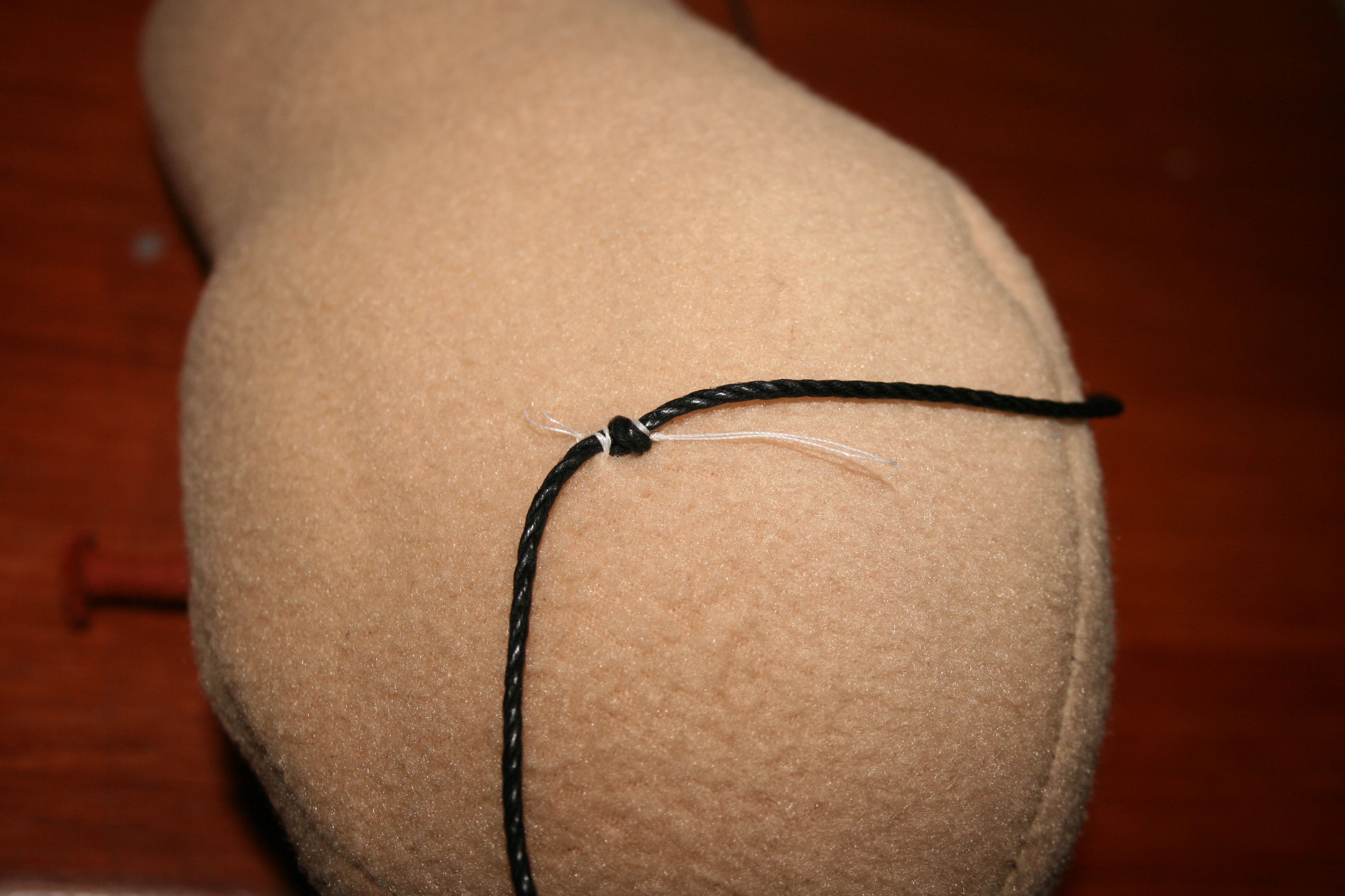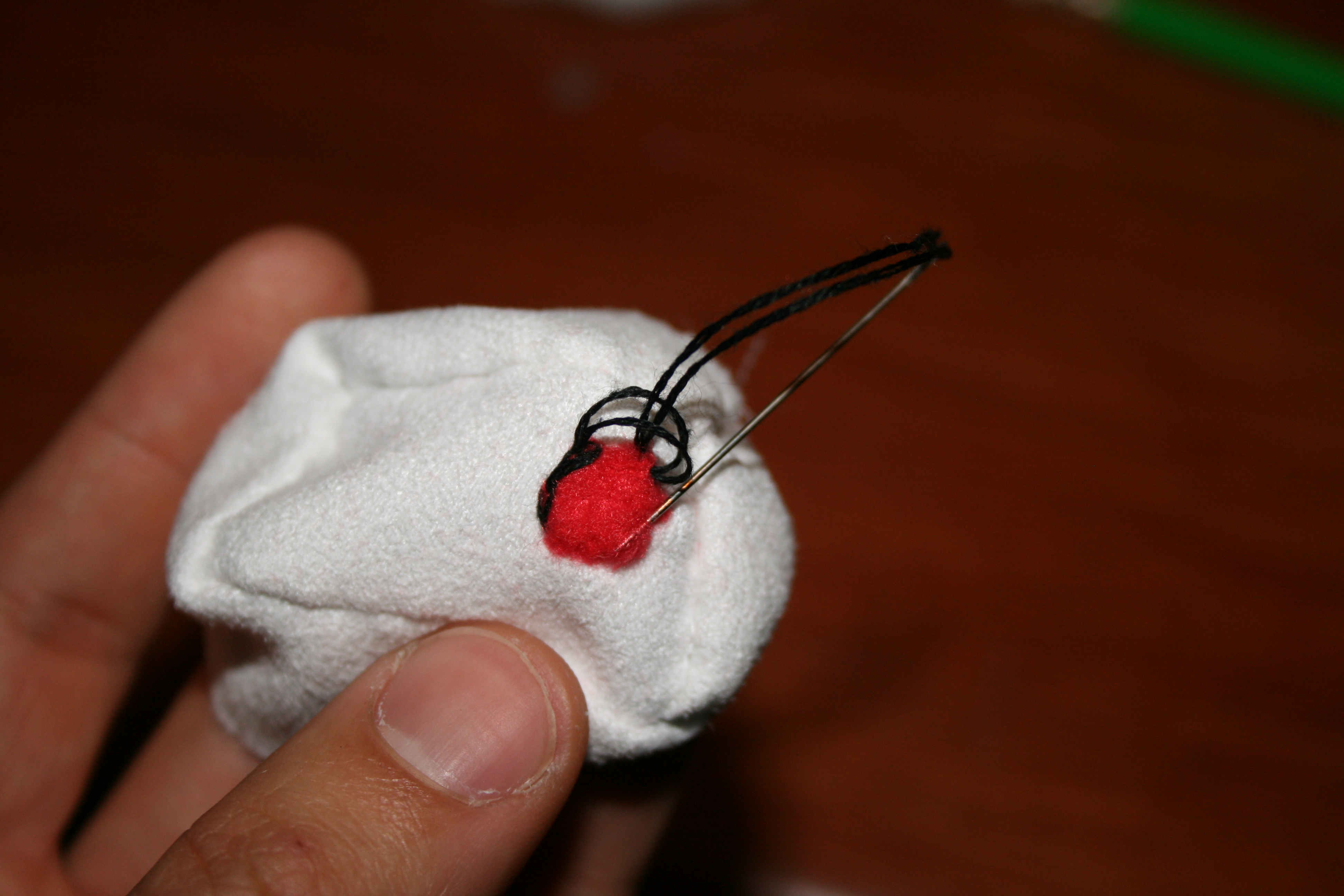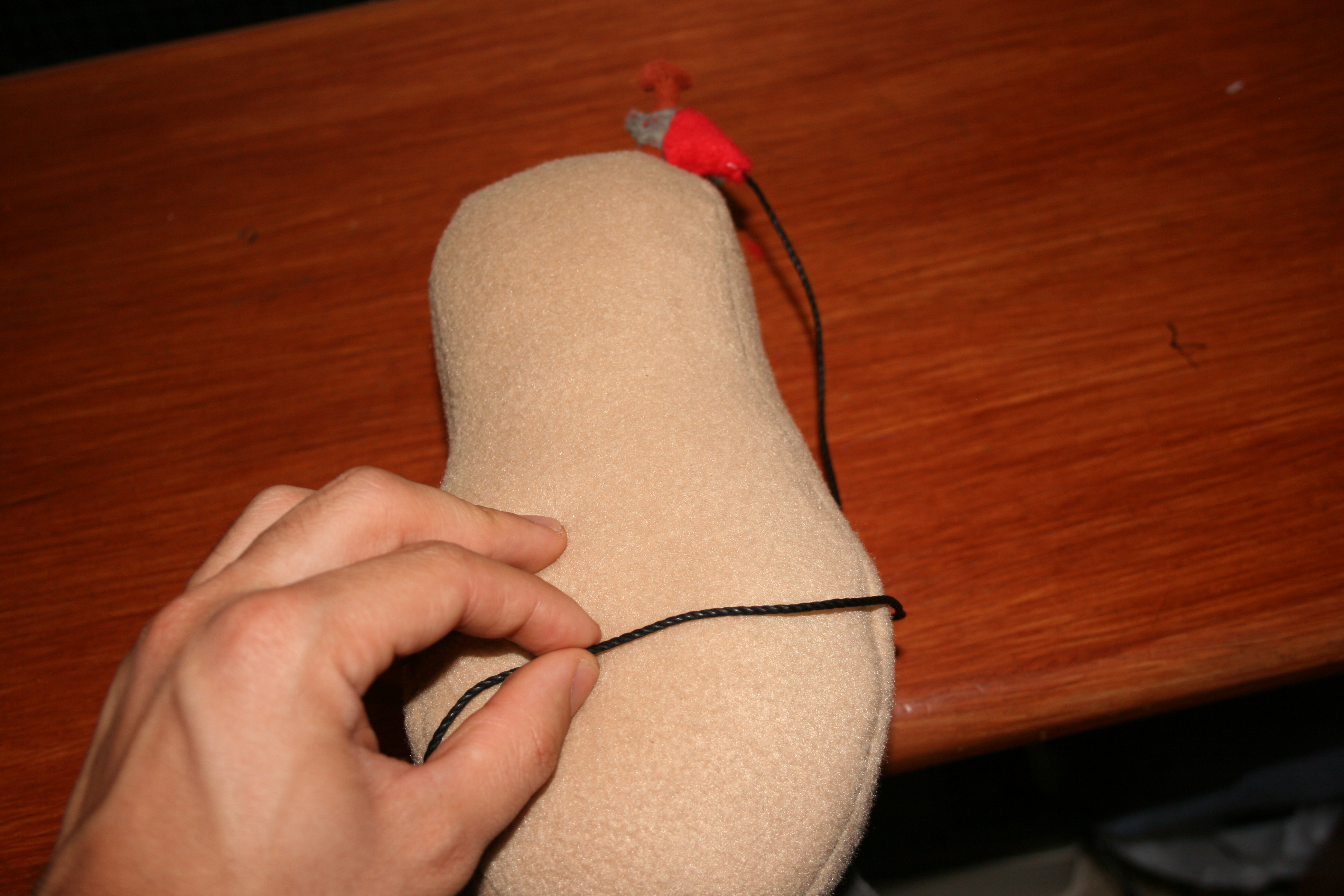 Run the length of the cord down to the fattest section of the potato. The center of the front face is where you will be placing GLaDOS' face. Tie a large knot about 11 1/2 inches down the line from the alligator clip and place it down at the center of where her face will be. Place a few tight stitches on either side of the knot to hold it in place.