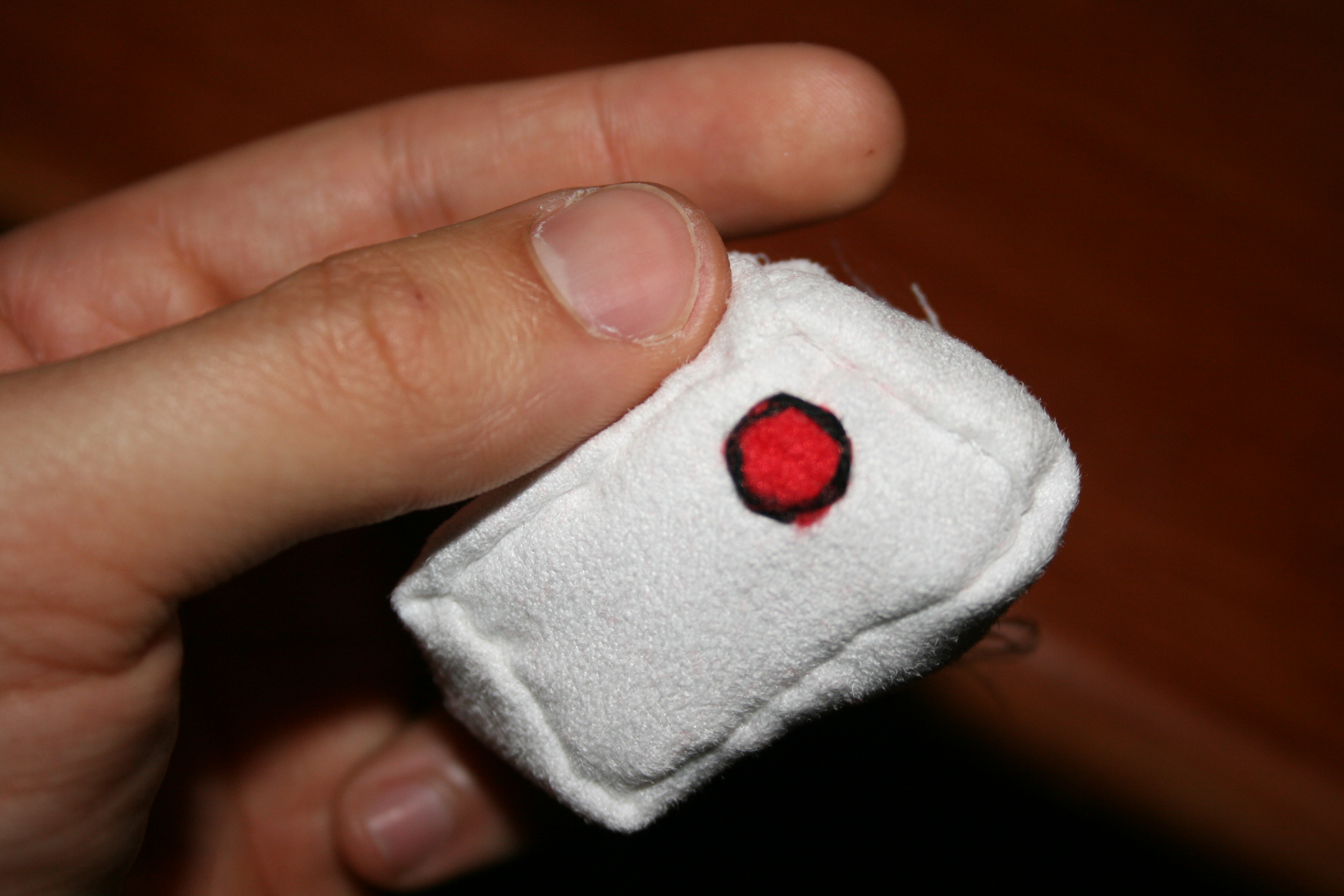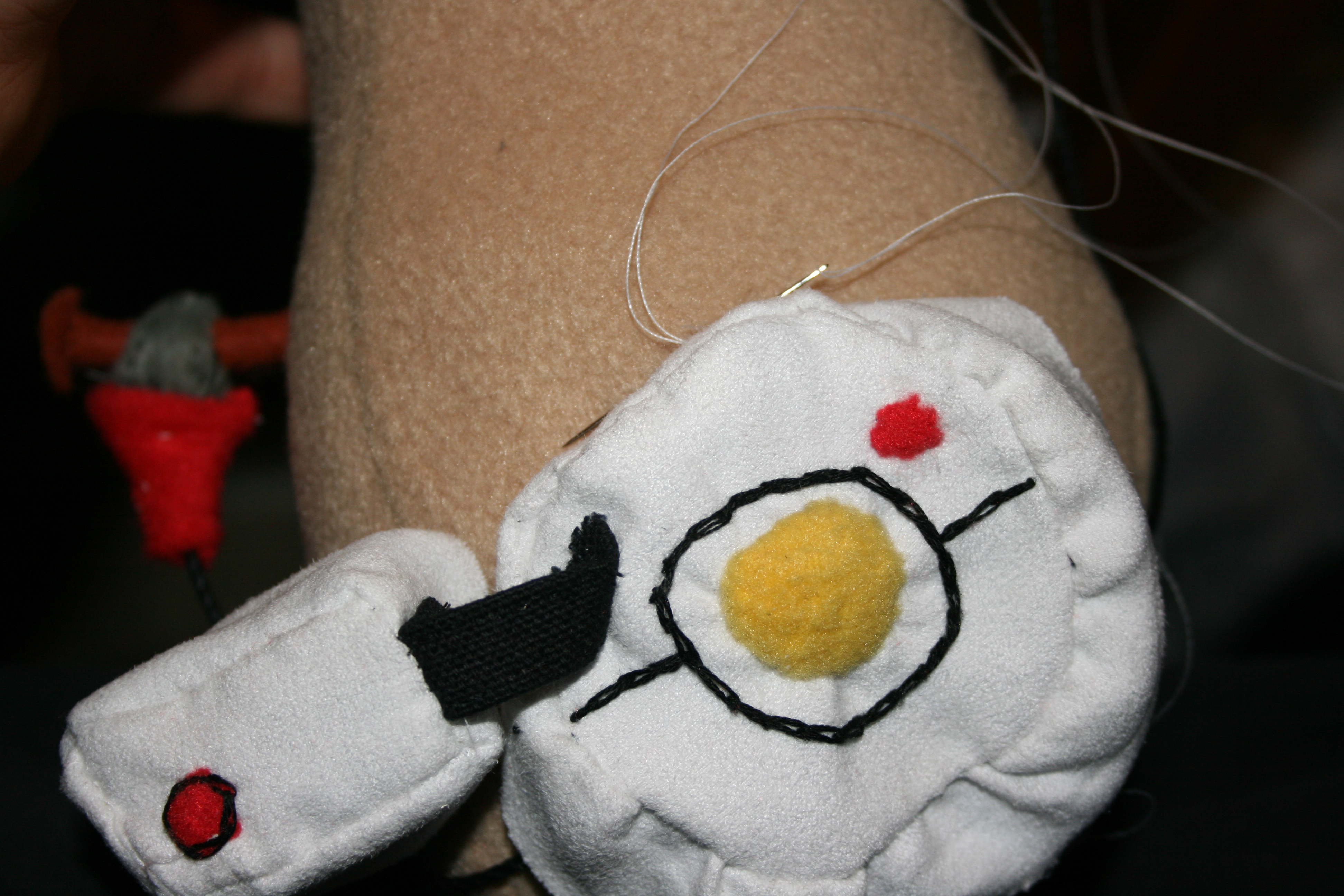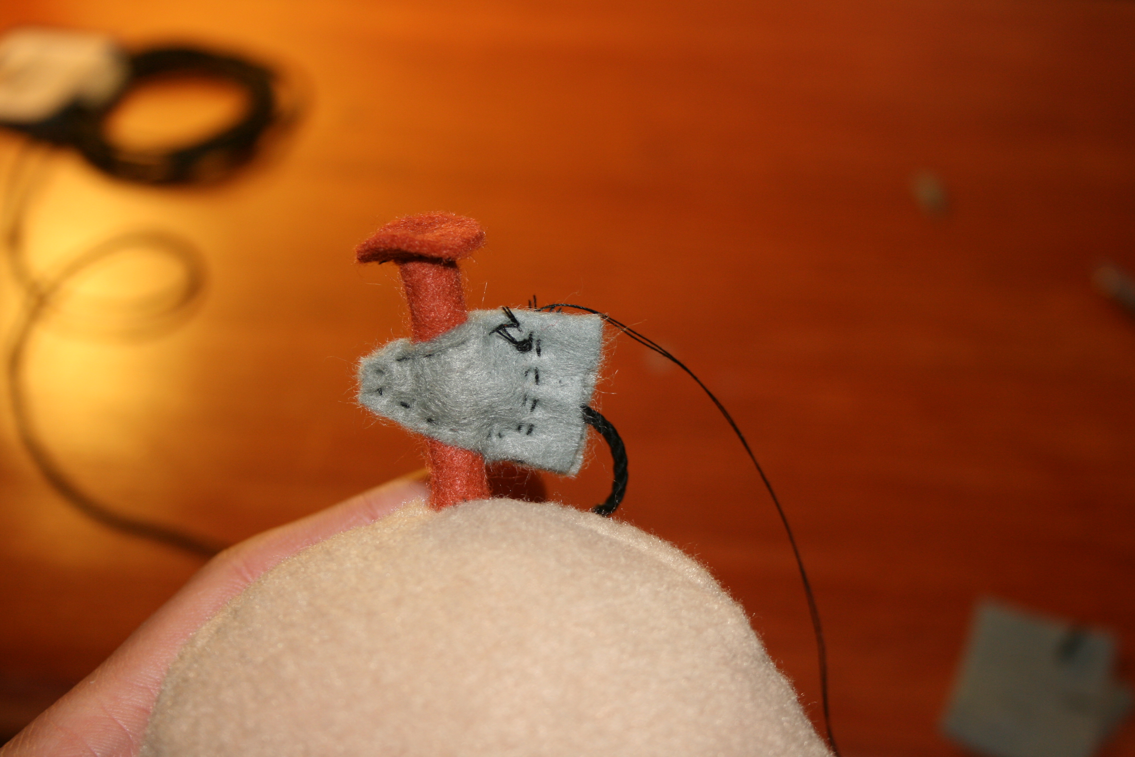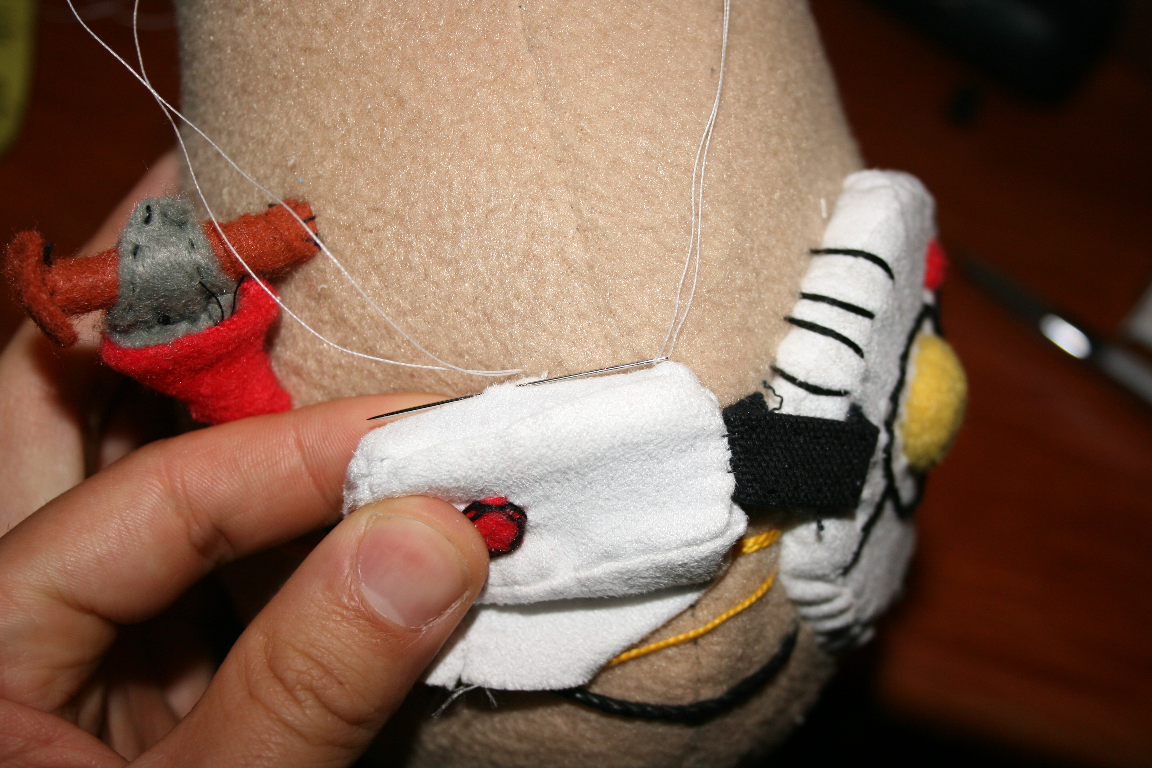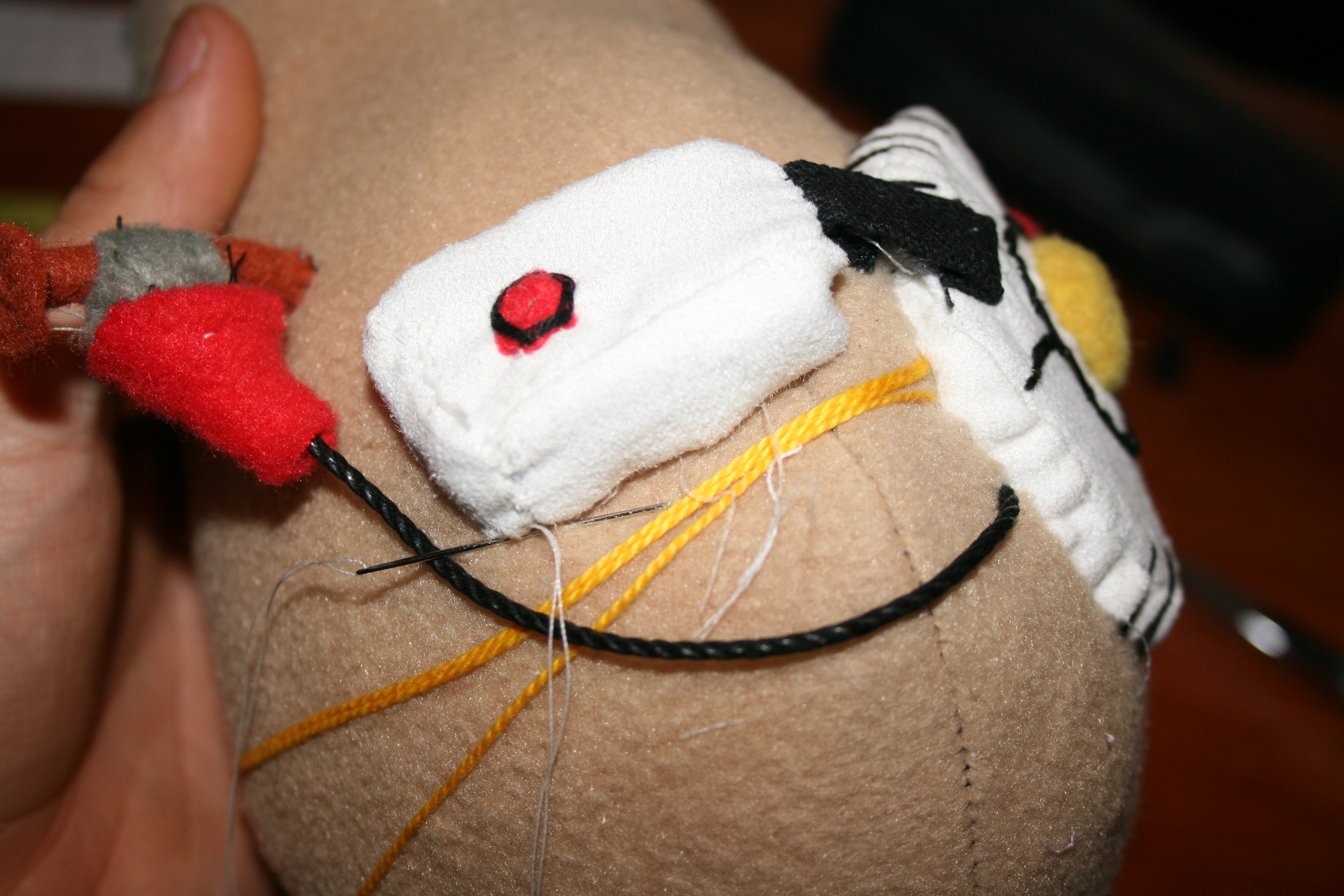 The rectangular computer chip is secured the same way, with a slip stitch around the edges. Be sure to start on the edge closest to the face, otherwise the black strip running between them could get in your way later. Remember to leave enough room to stuff before stitching it down all the way.
