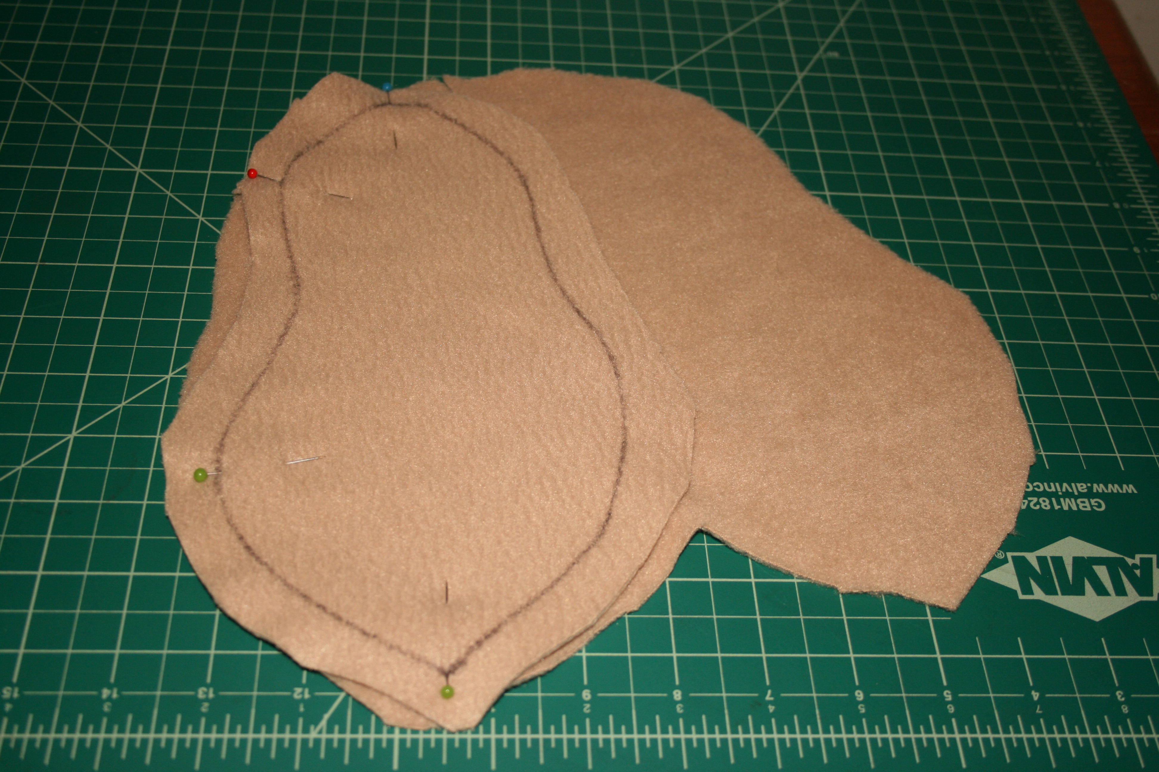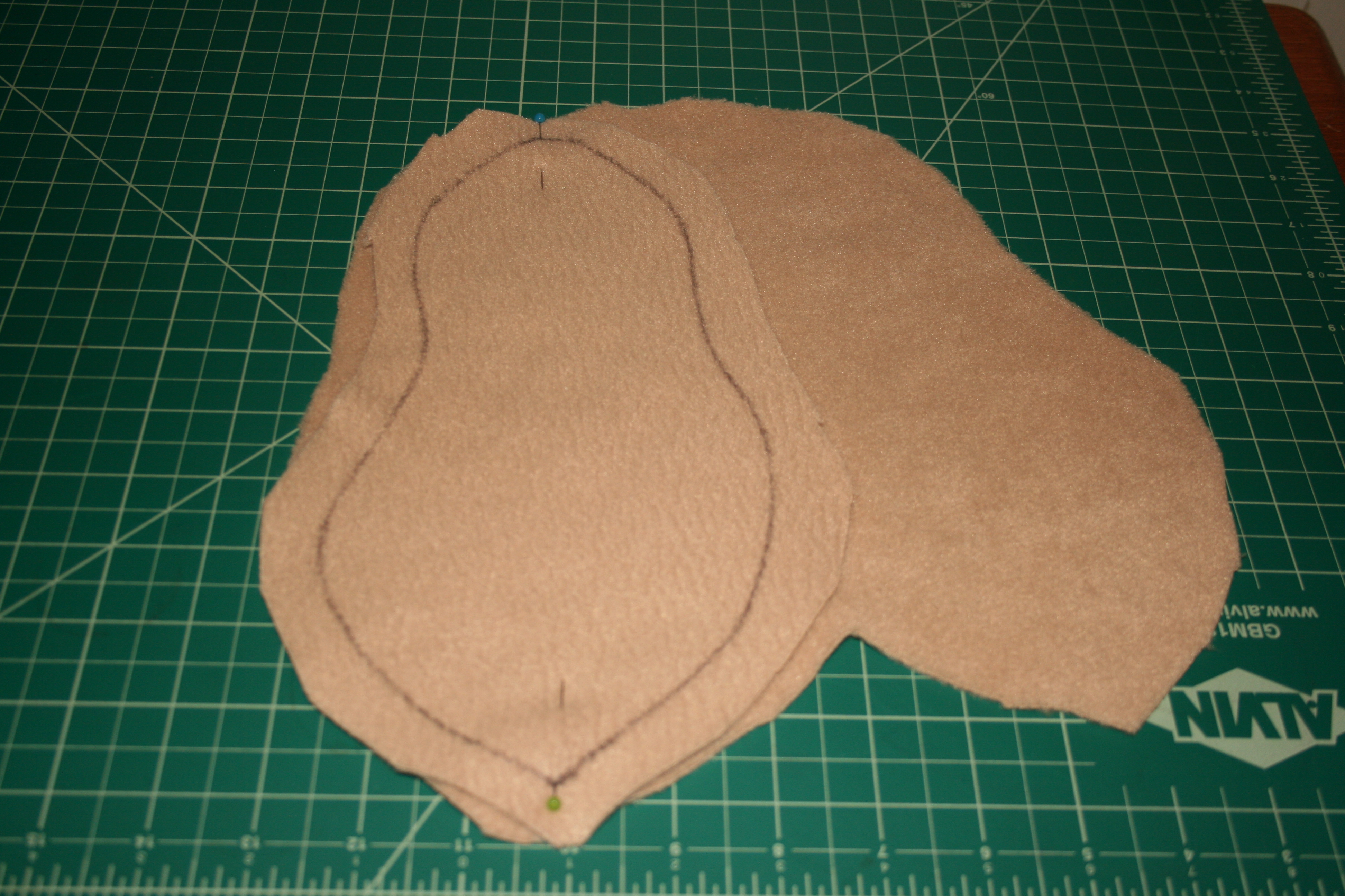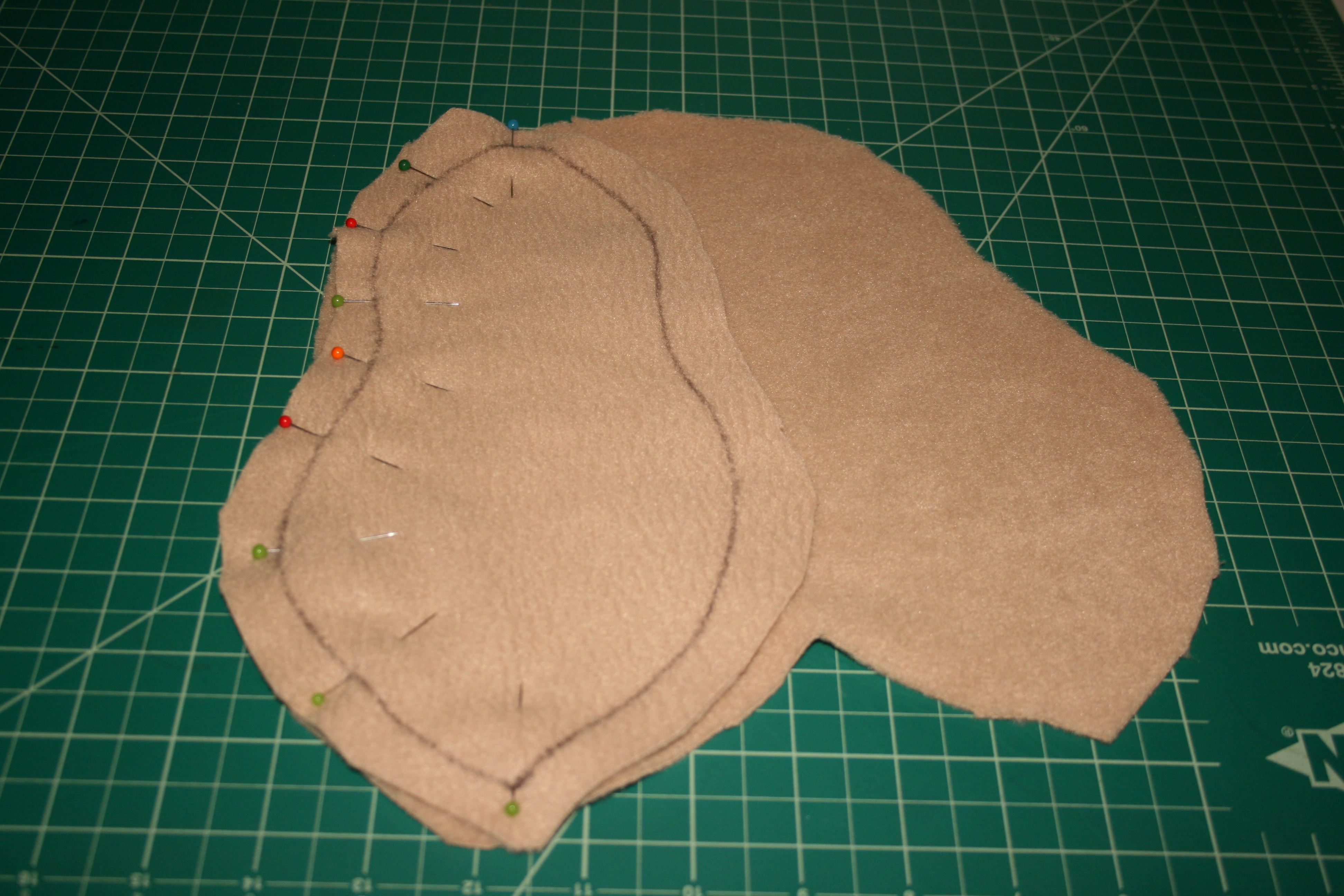 Align the single potato face with the left half of the two-face panel and pin in place with the good sides of the fabric facing in. Even though they are on opposite sides, try to align the outlines as best as you can. You can explore with the pins to make sure they lie on top of one another. Stitch down the left half of the single face panel.