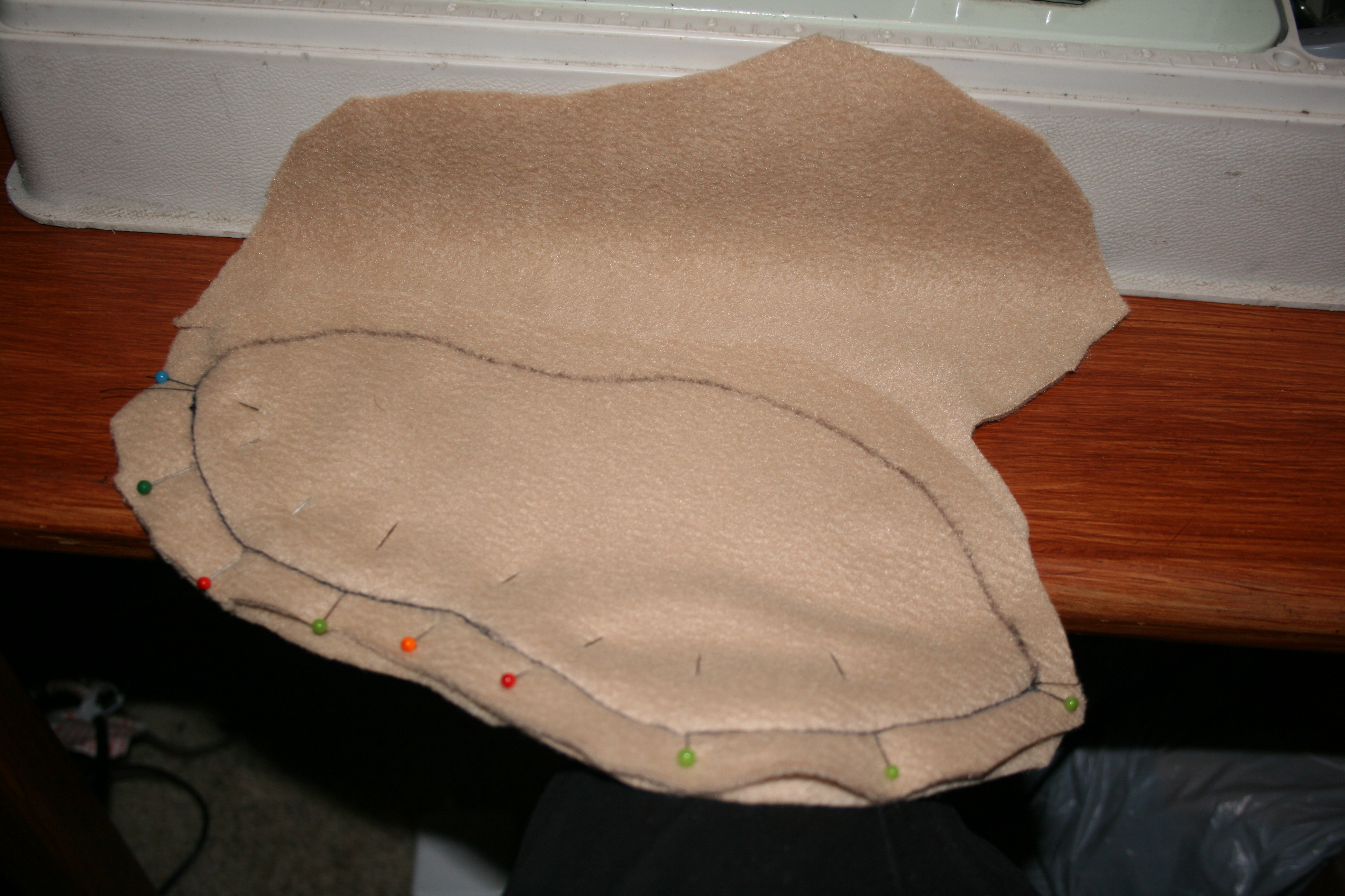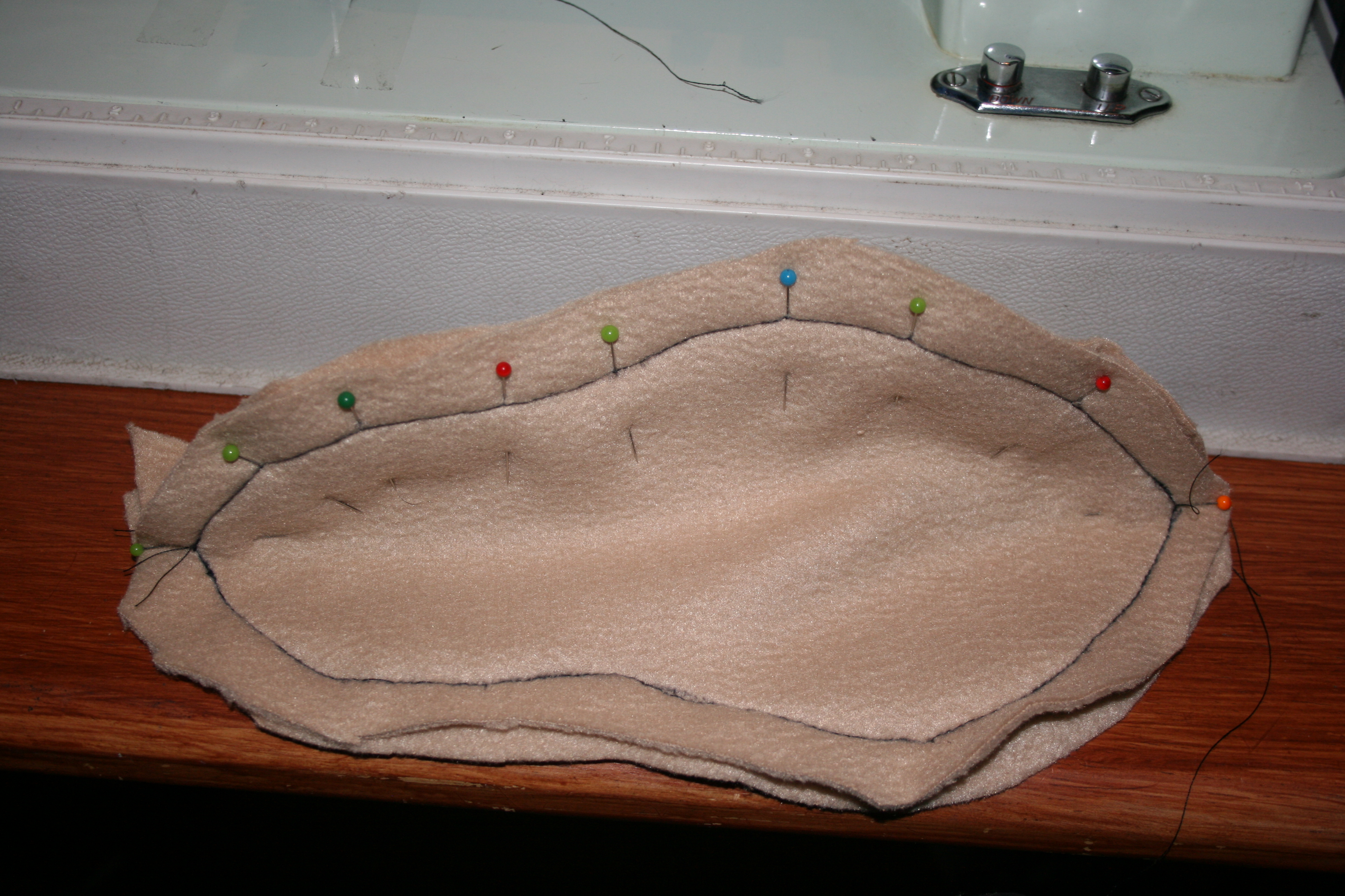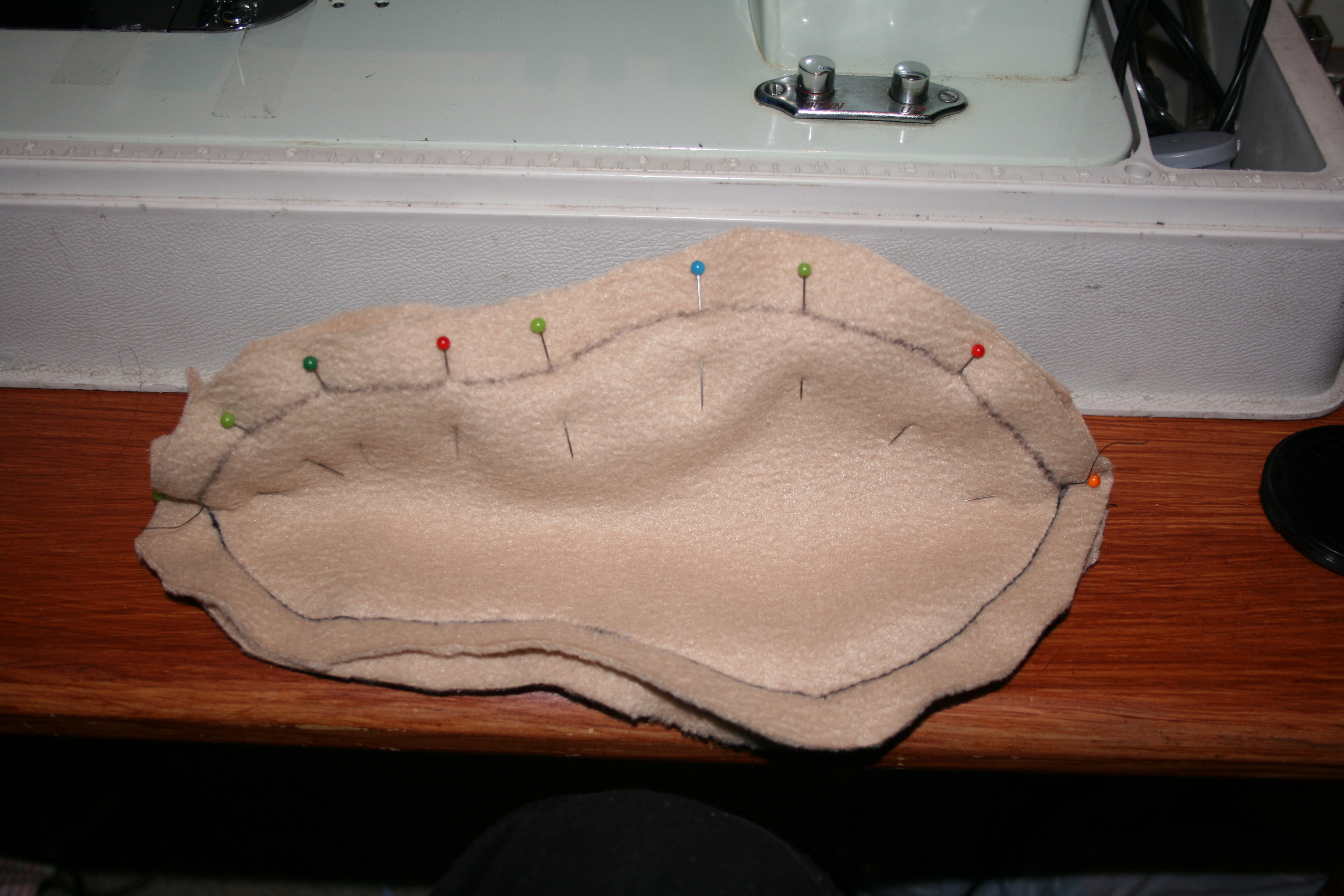 Align the single potato face with the left half of the two-face panel and pin in place with the good sides of the fabric facing in. Even though they are on opposite sides, try to align the outlines as best as you can. You can explore with the pins to make sure they lie on top of one another. Stitch down the left half of the single face panel.