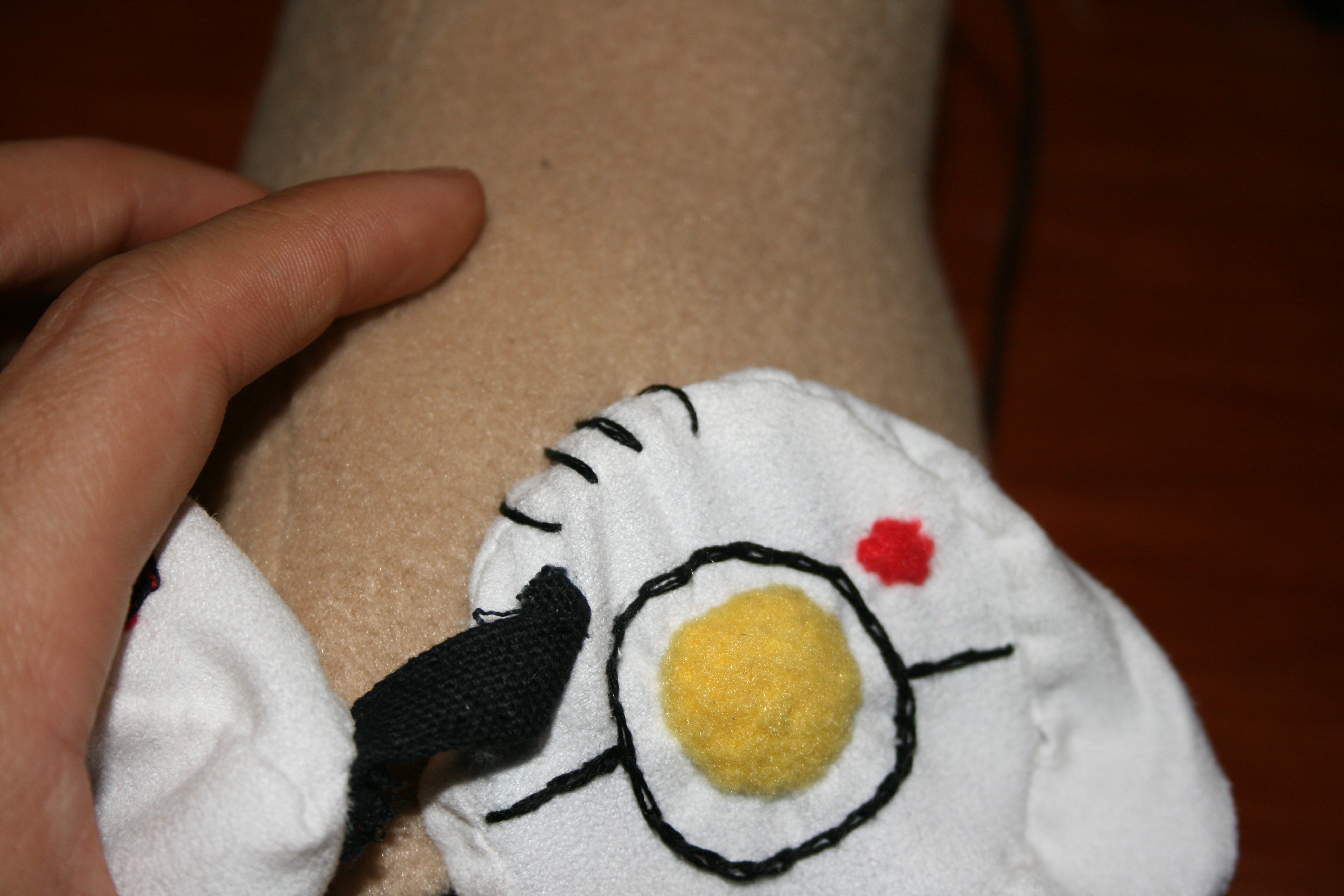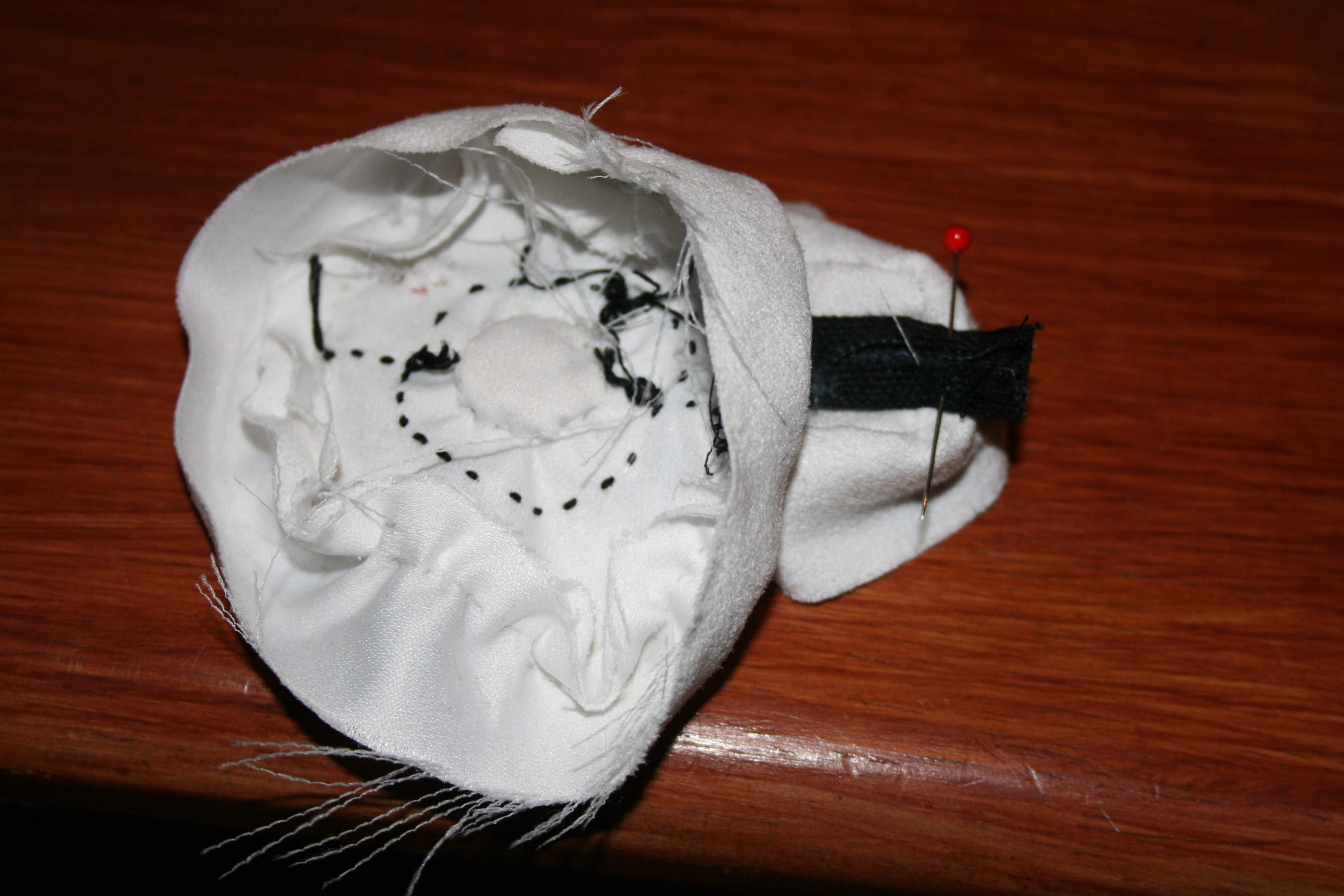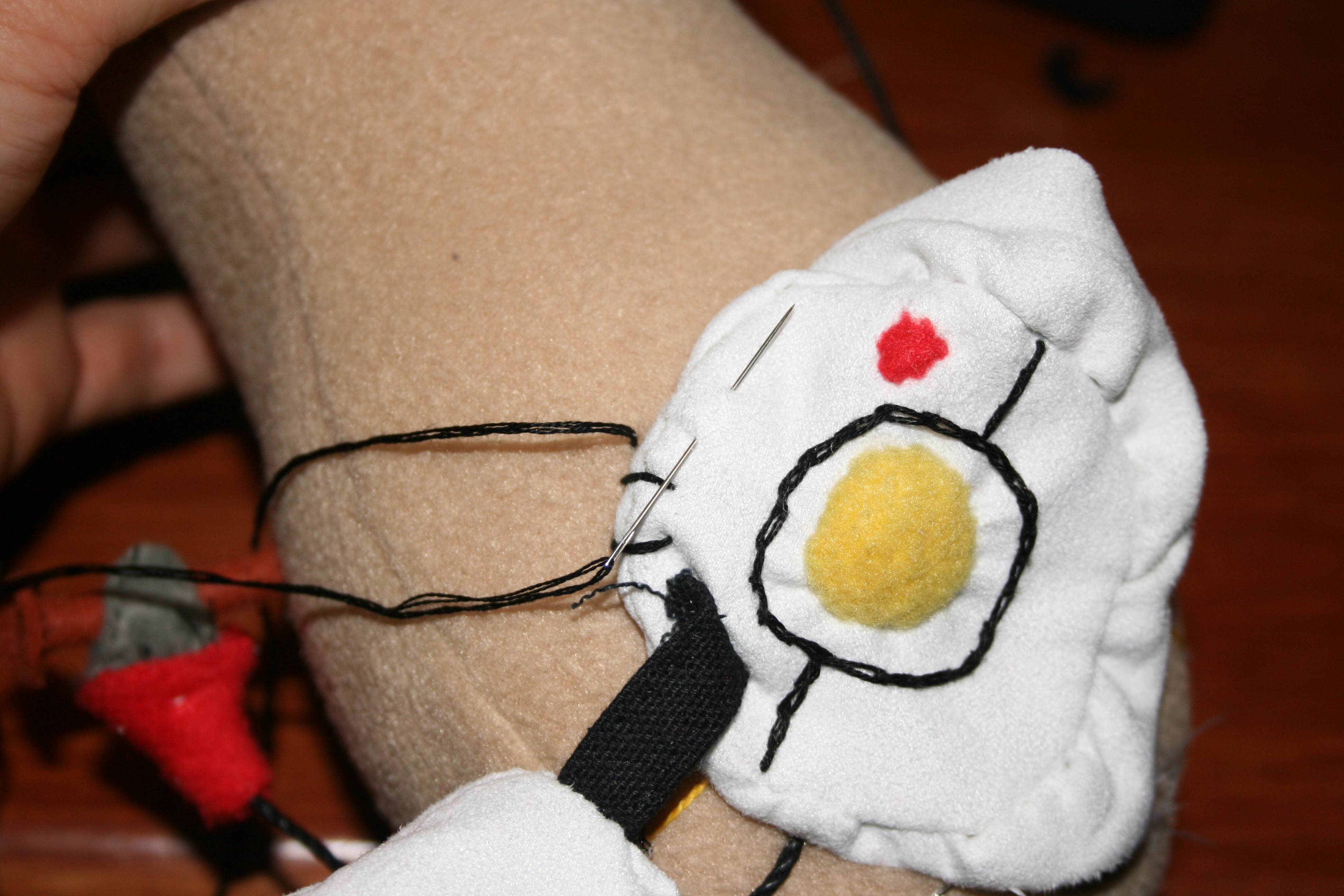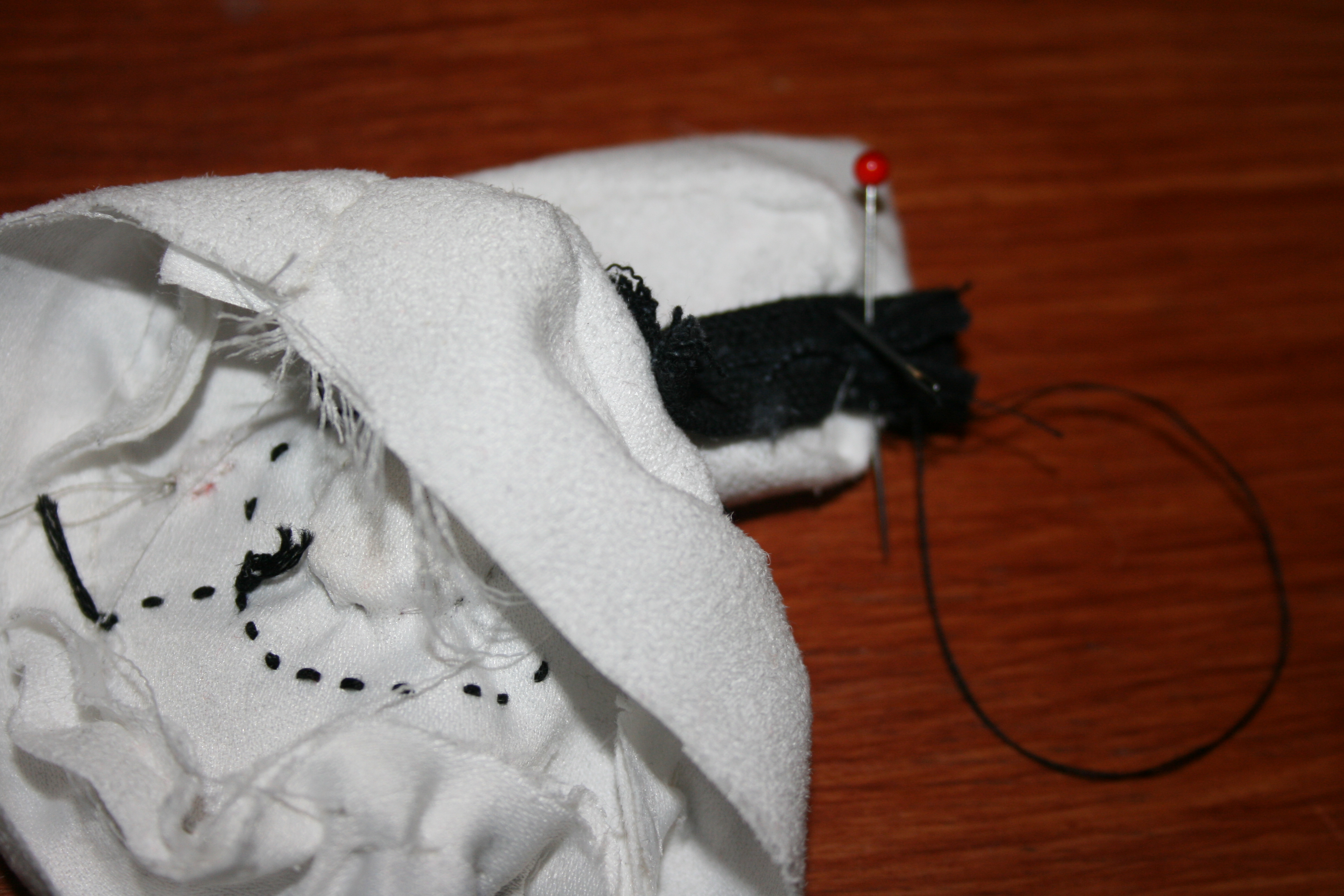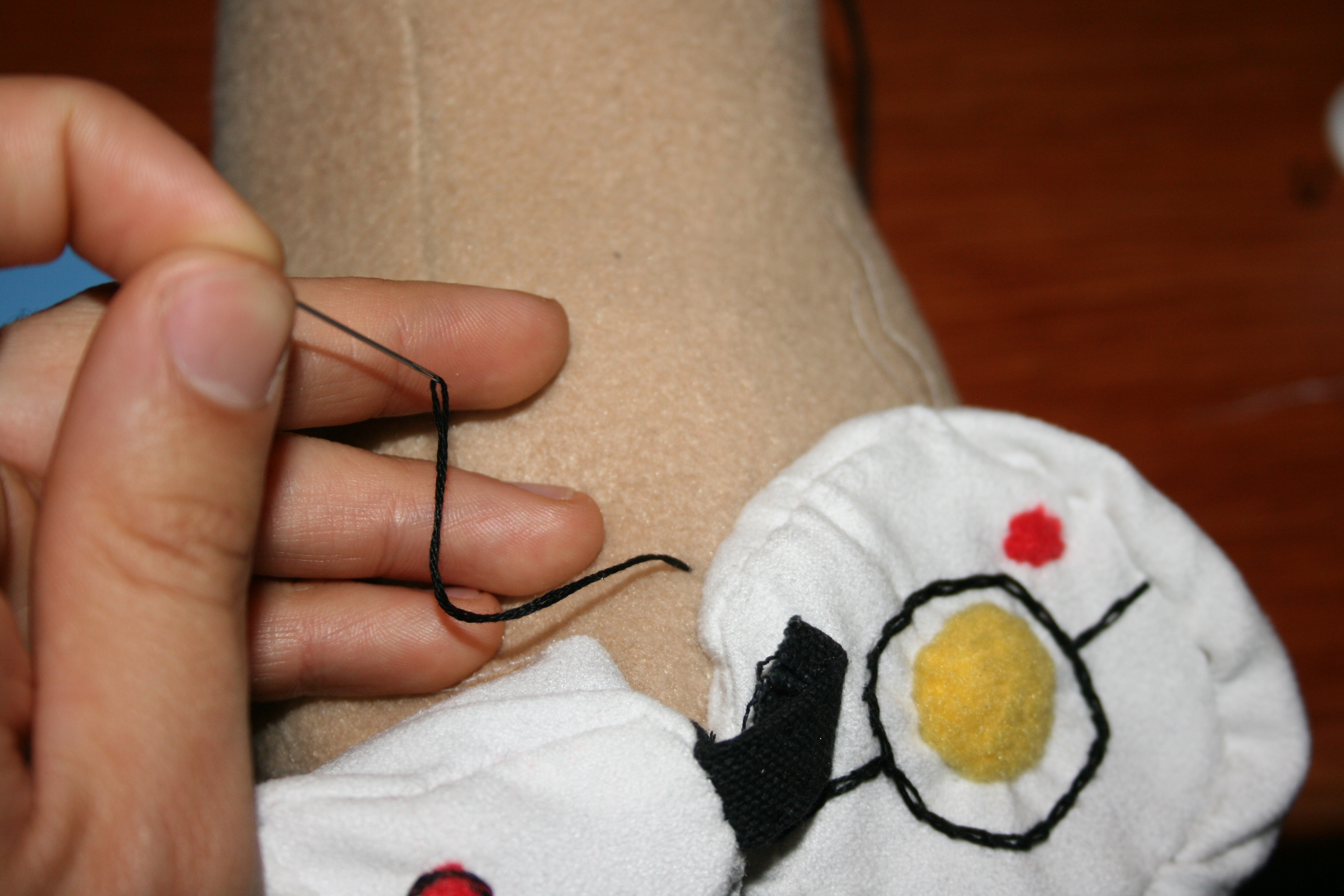 Cut out a strip of black fabric about an inch wide. Fold back the edges and use a running stitch in black thread to hold them in place. Find the place on GLaDOS' face where the black strip attaches and runs back to the other chip. Pin the black strip down here, with the bad side facing up and the long end lying across the eye. Stitch down with a running stitch and fold over where the stitches are so the raw edge is hidden beneath the rest as it runs back to the computer chip. Secure the other end to the edge of the white rectangle using the same method.