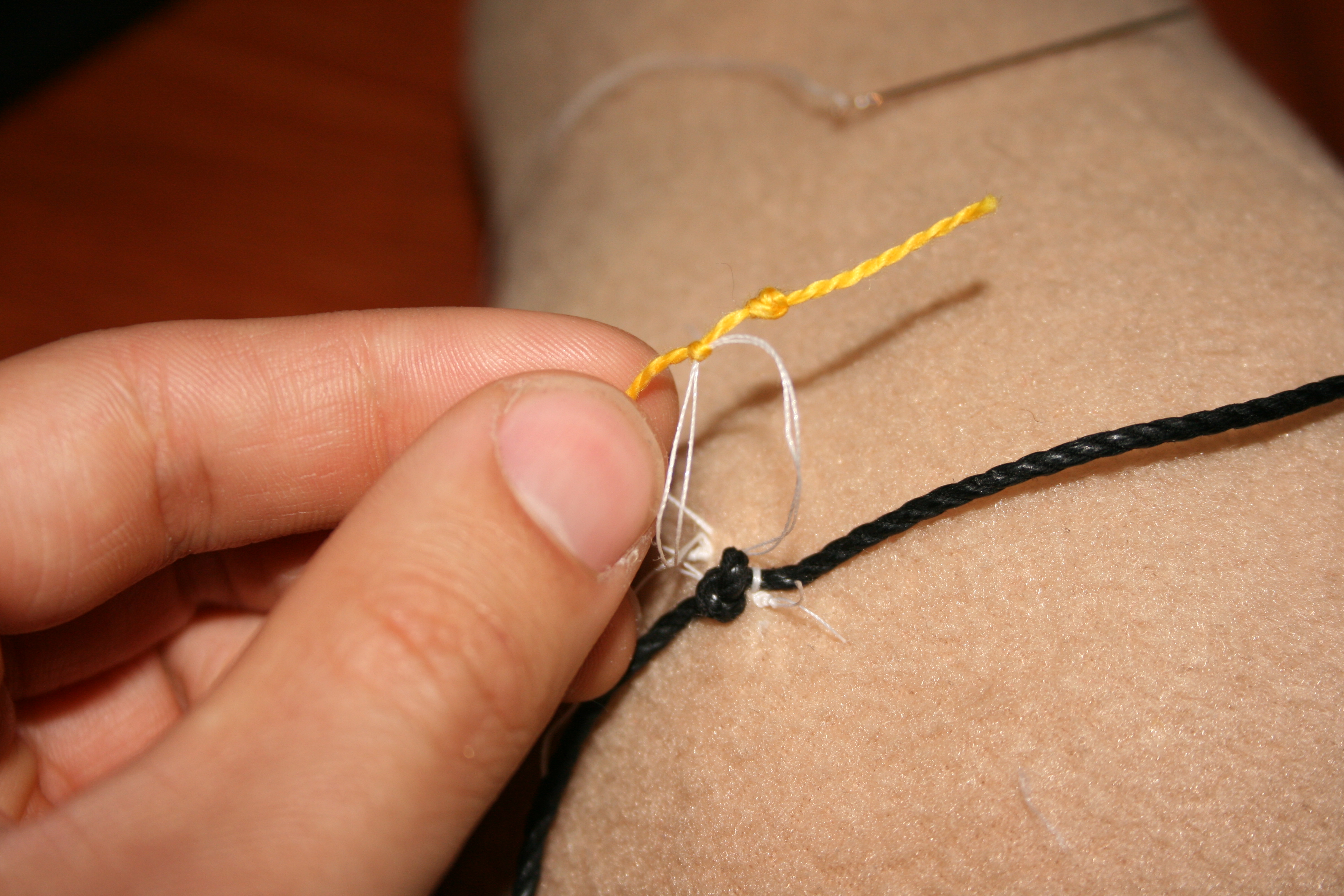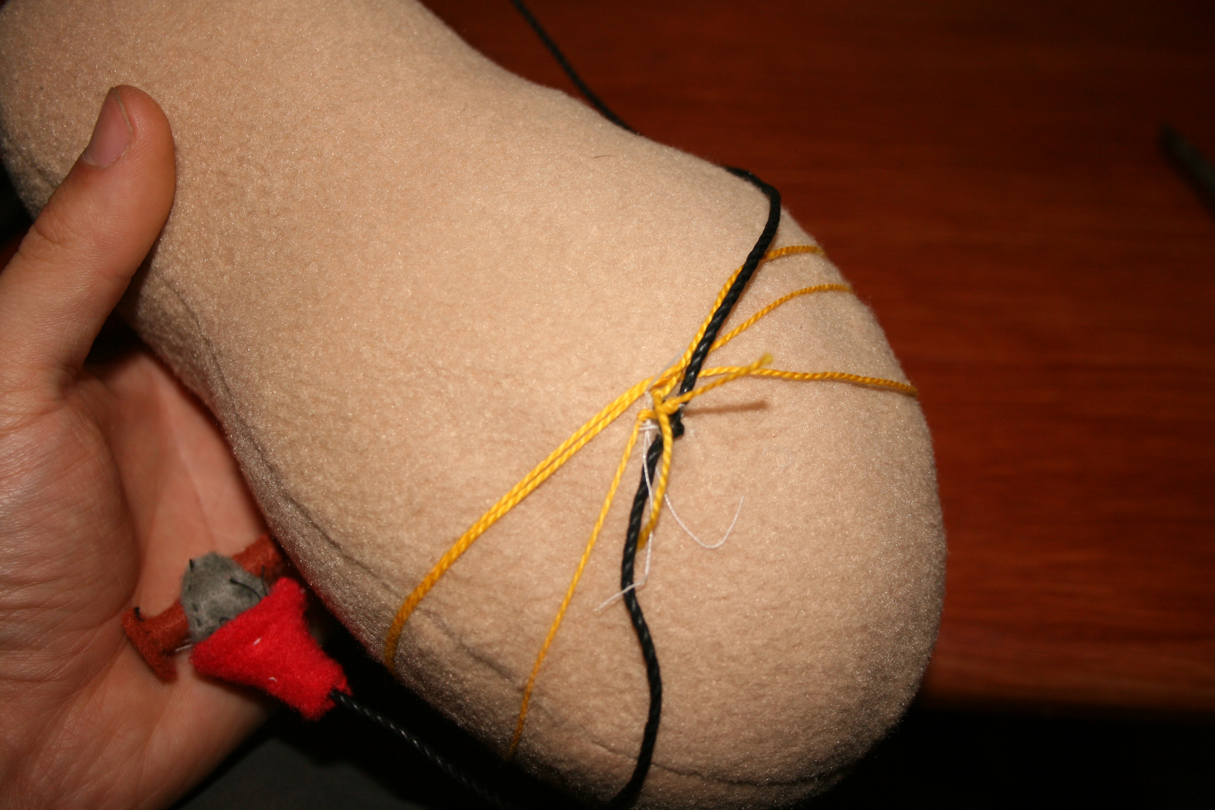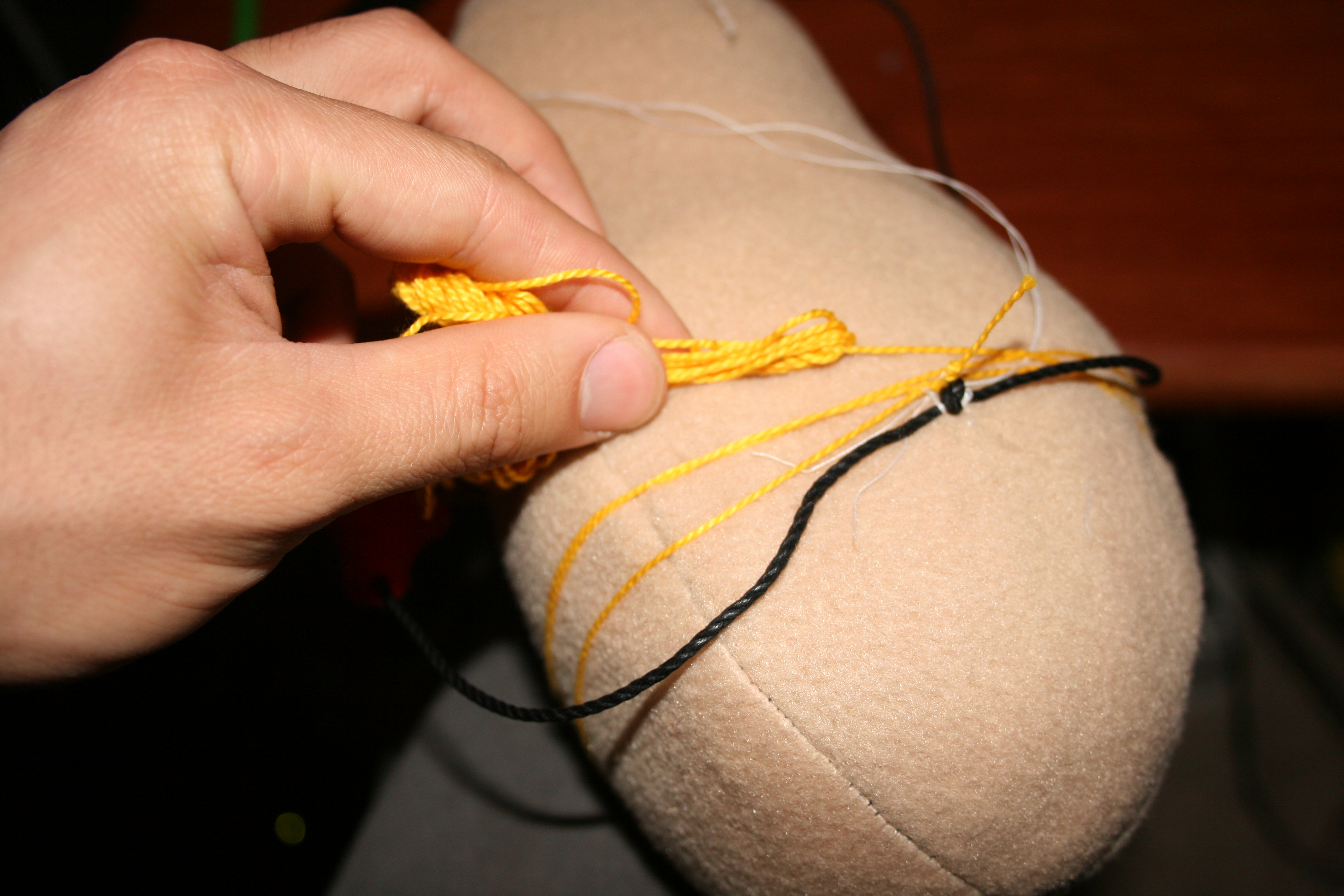 For the yellow wires use your pearl cotton string, sewing needle and thread. Anchor your thread on the potato near where the center knot is on your black cord. Tie a loose knot on the end of your cotton string and run the sewing needle through the knot. Make a stitch on the potato in the same place and tighten the knot on your cotton string. This should hold the end in place. Wrap the yellow string around the wide portion of your potato three times and cut off the excess. Anchor this end the same way you stitched down the first.