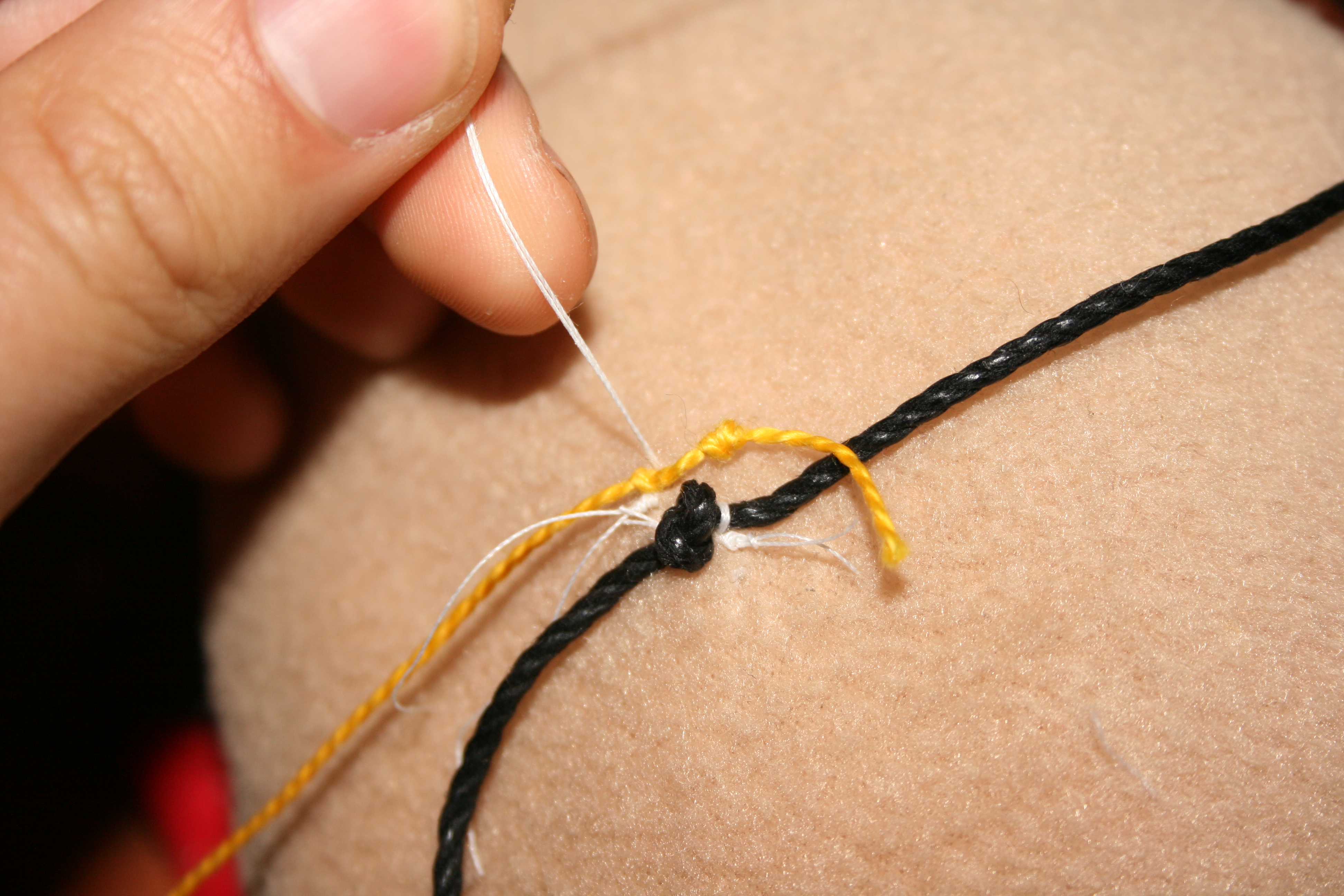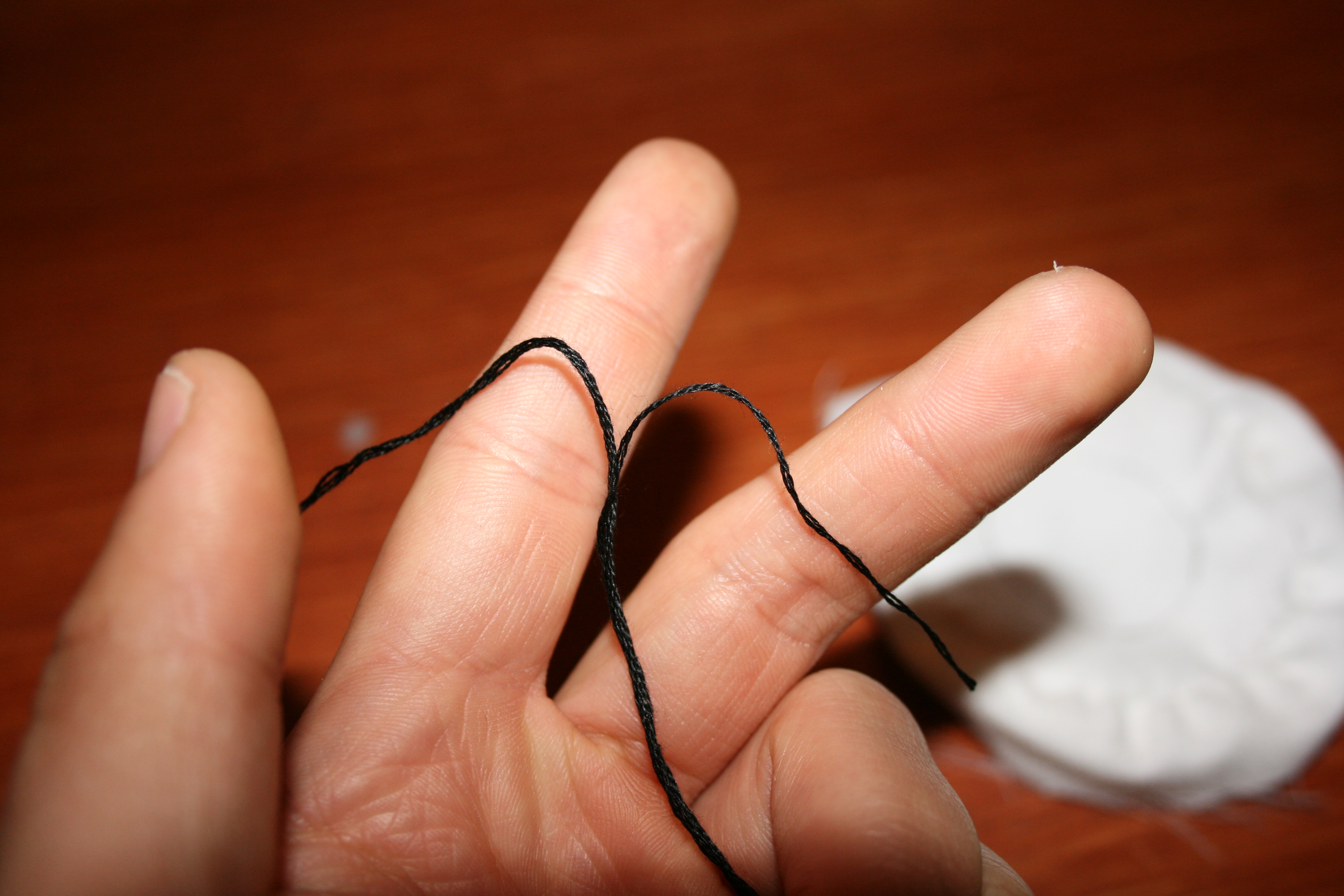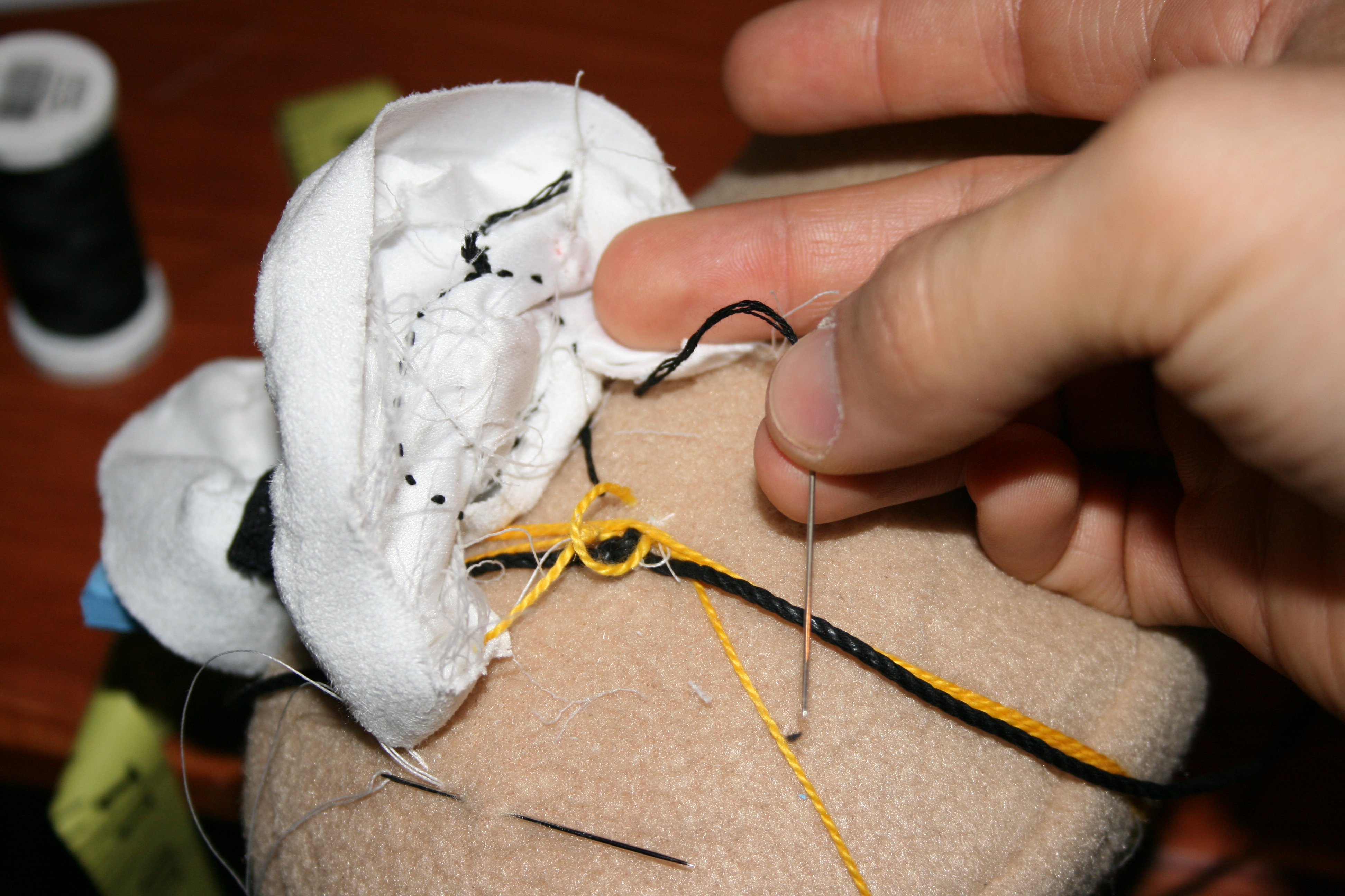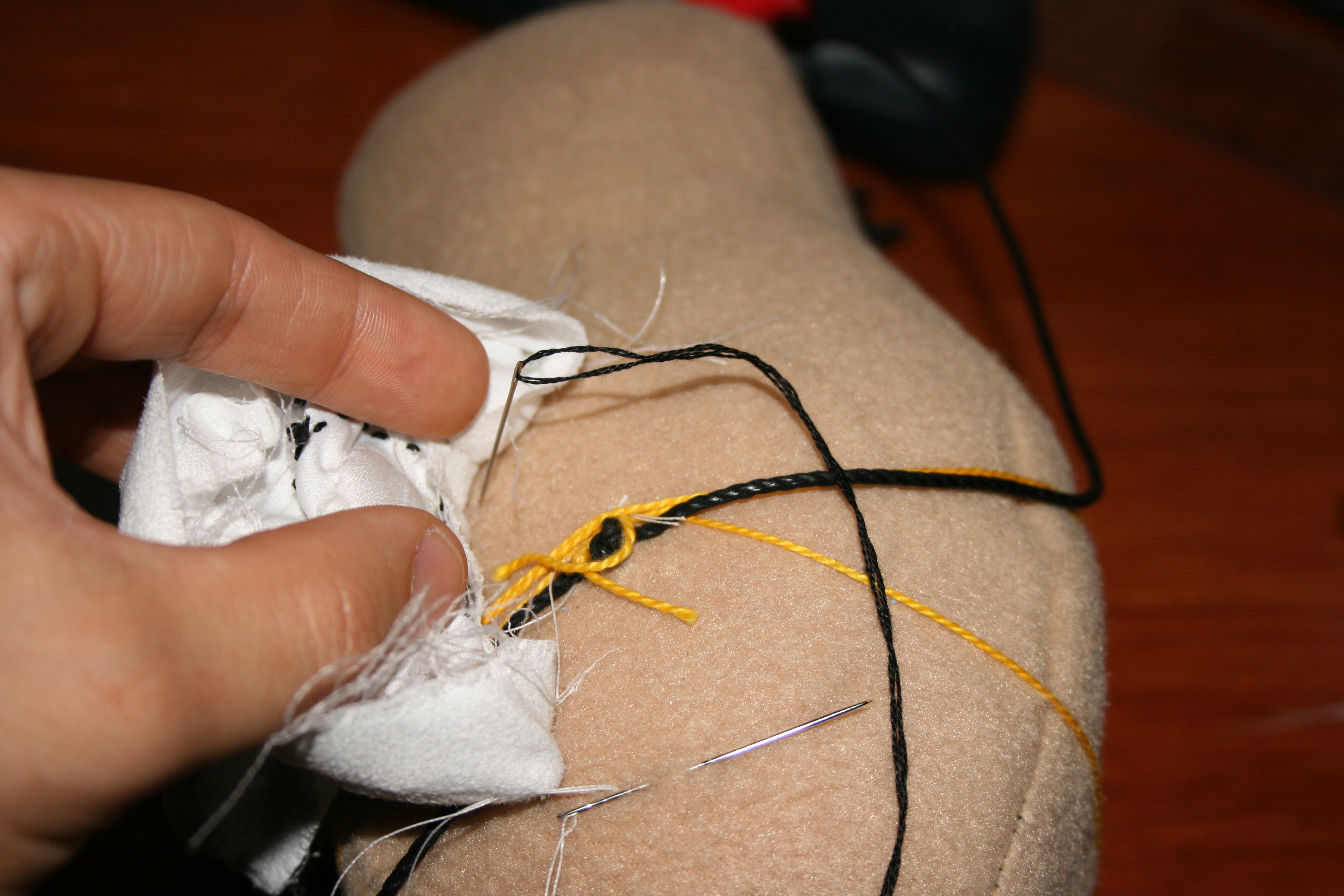 For the yellow wires use your pearl cotton string, sewing needle and thread. Anchor your thread on the potato near where the center knot is on your black cord. Tie a loose knot on the end of your cotton string and run the sewing needle through the knot. Make a stitch on the potato in the same place and tighten the knot on your cotton string. This should hold the end in place. Wrap the yellow string around the wide portion of your potato three times and cut off the excess. Anchor this end the same way you stitched down the first.