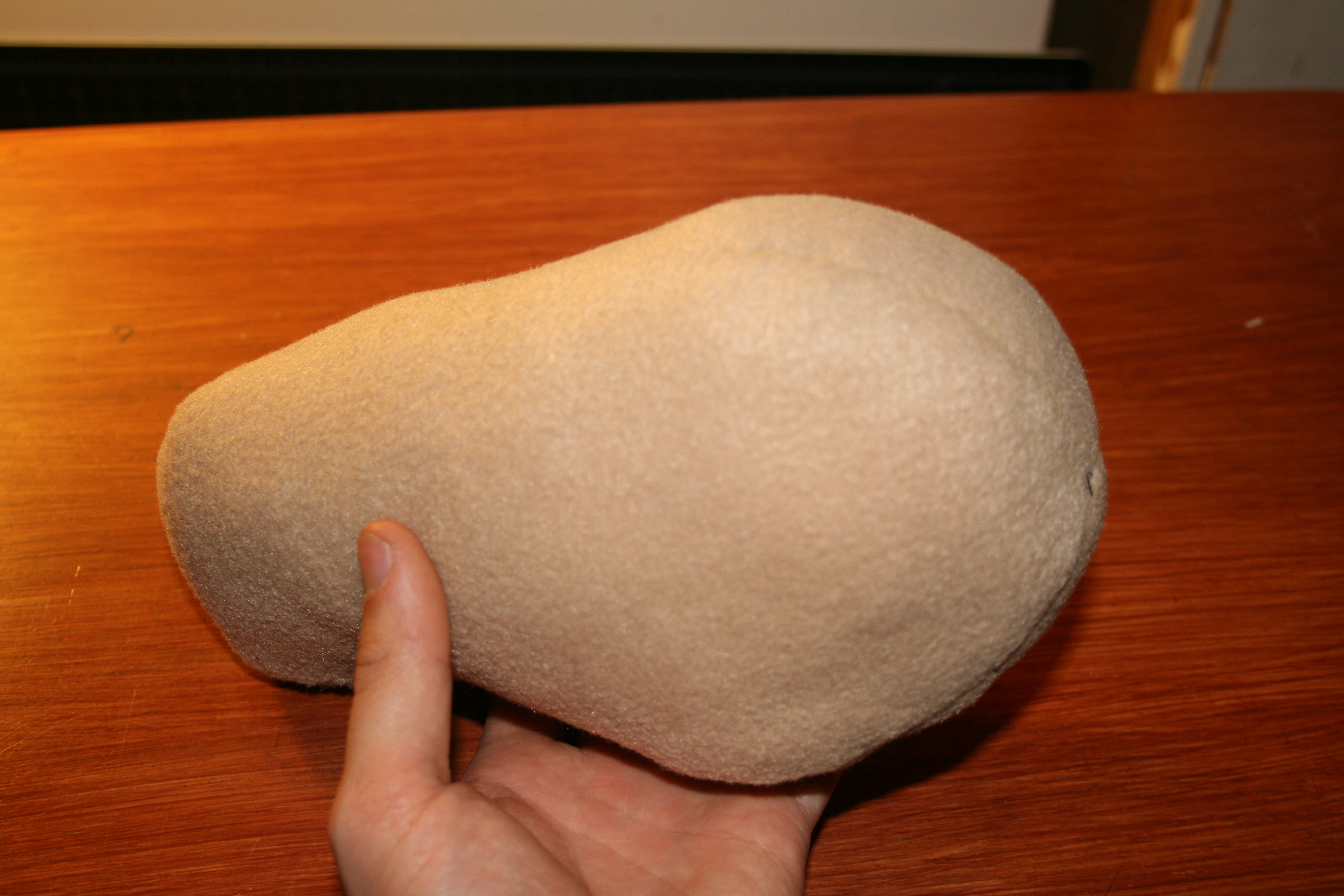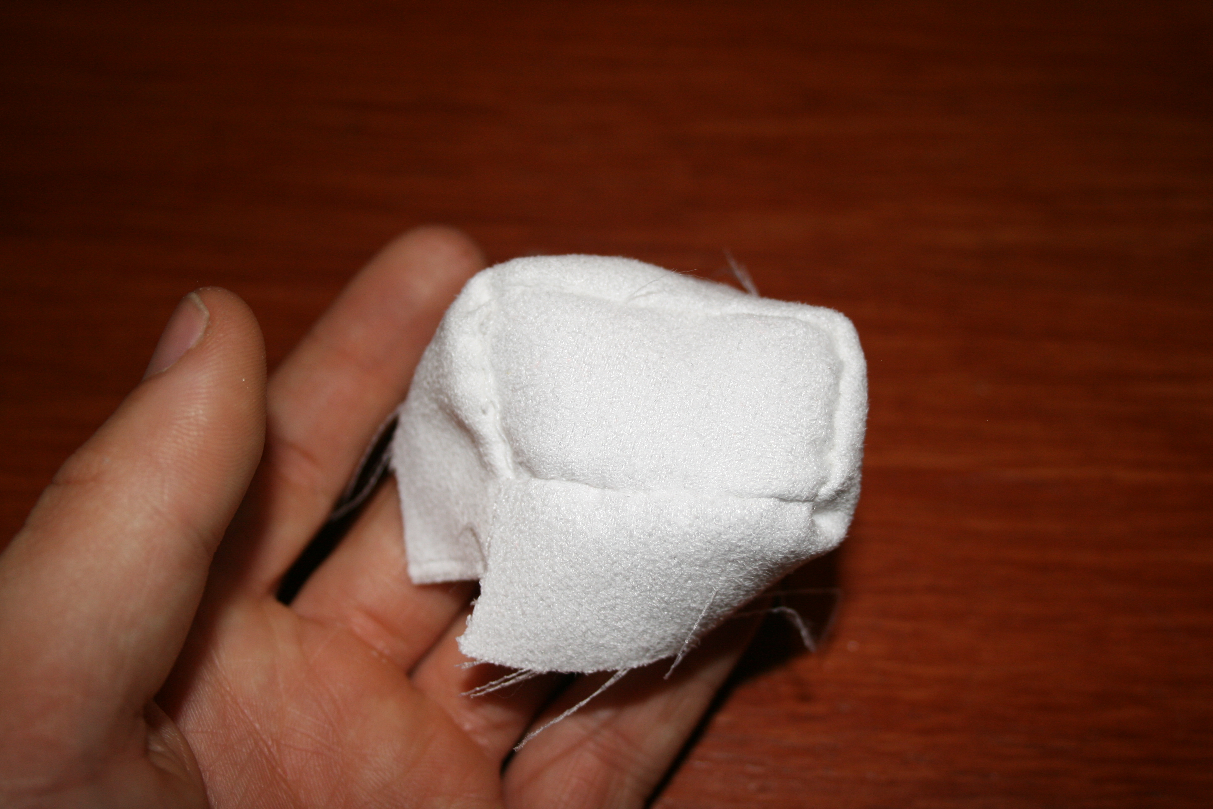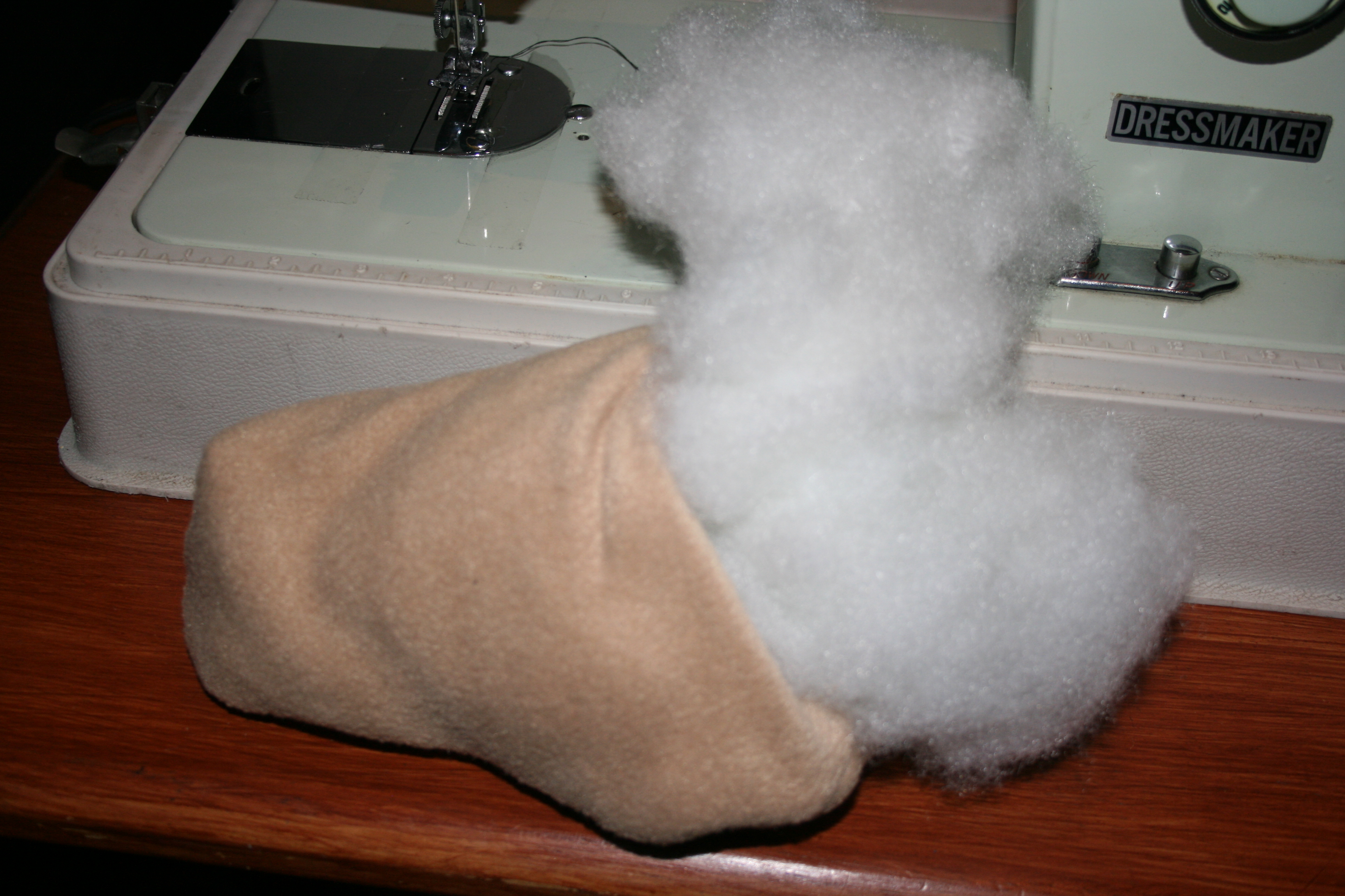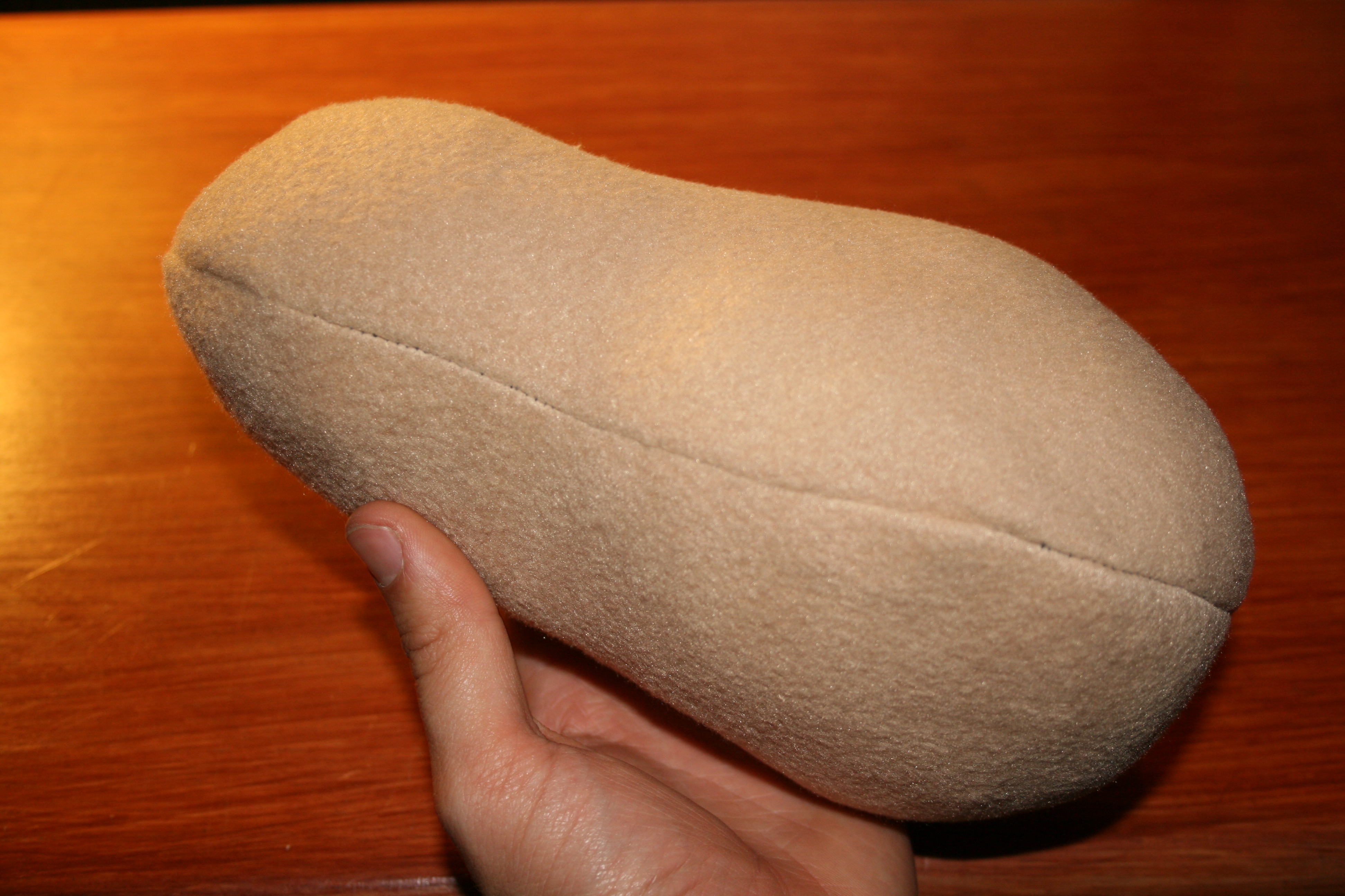 Pull the whole potato inside out through the hole left open at the bottom. Stuff it with fiberfill and seal up the opening with a slip stitch, maintaining the curved shape along the bottom.