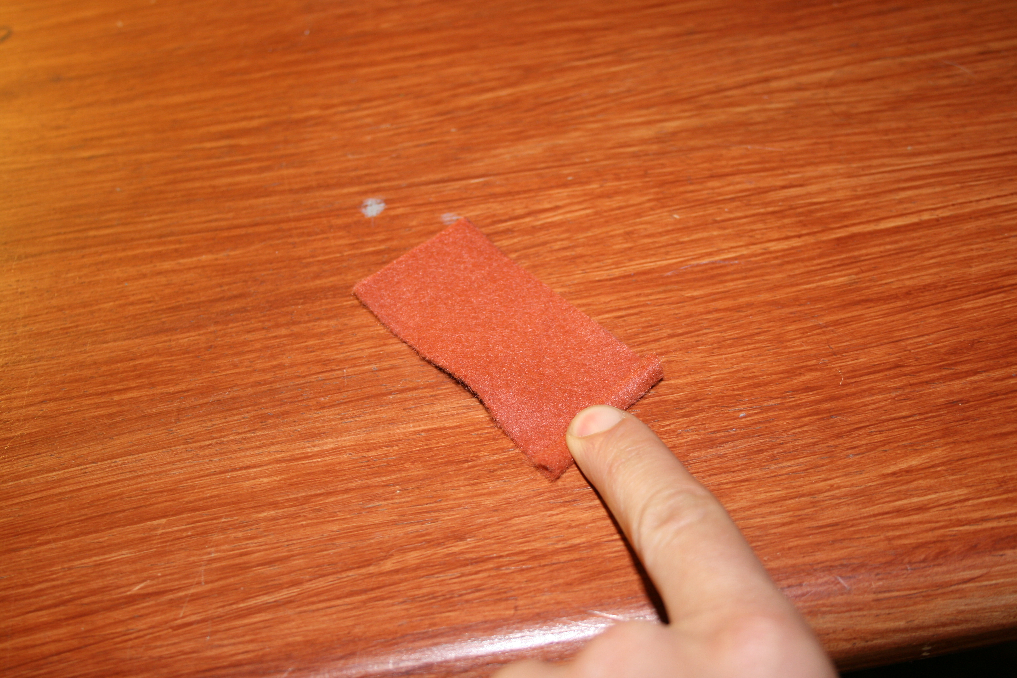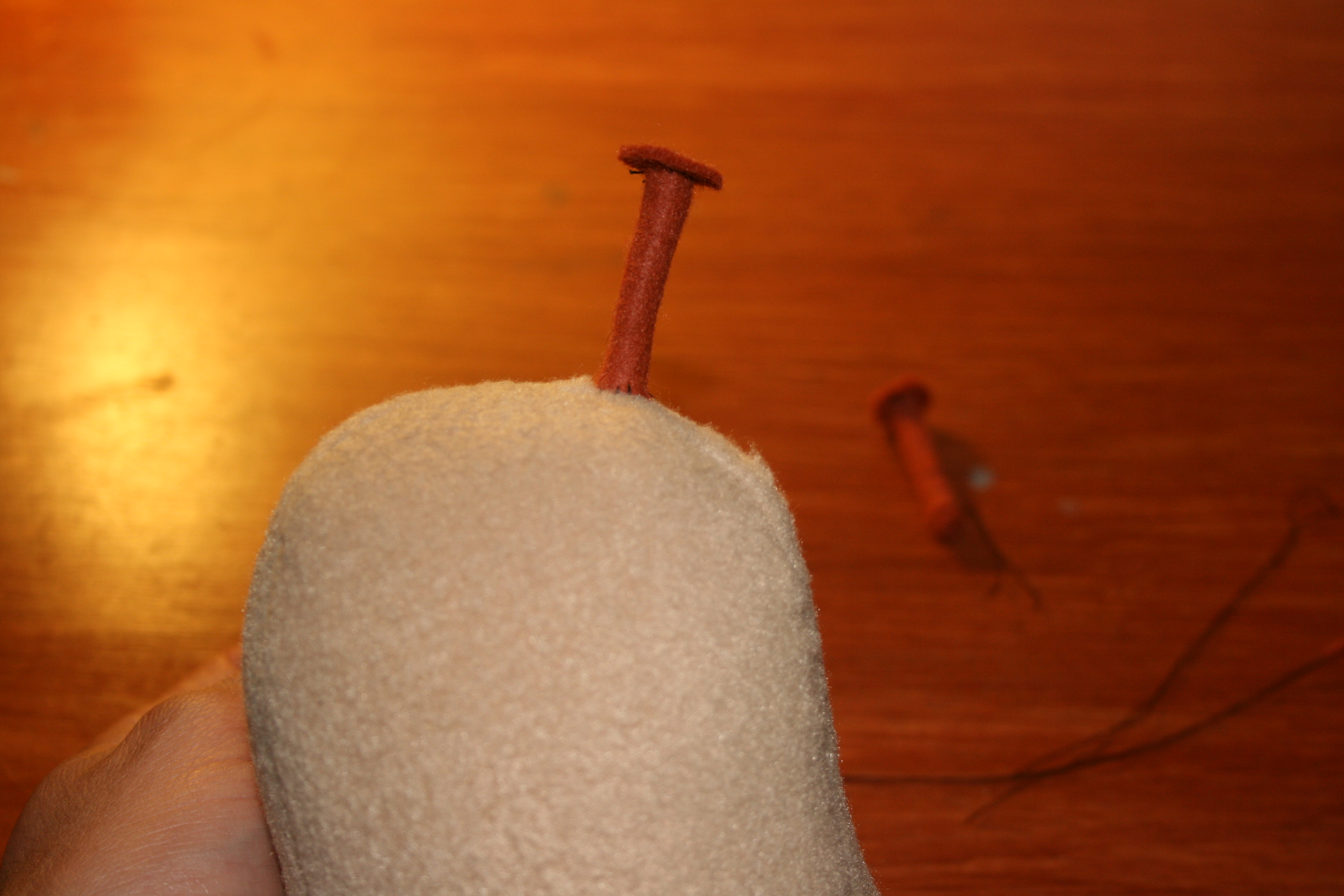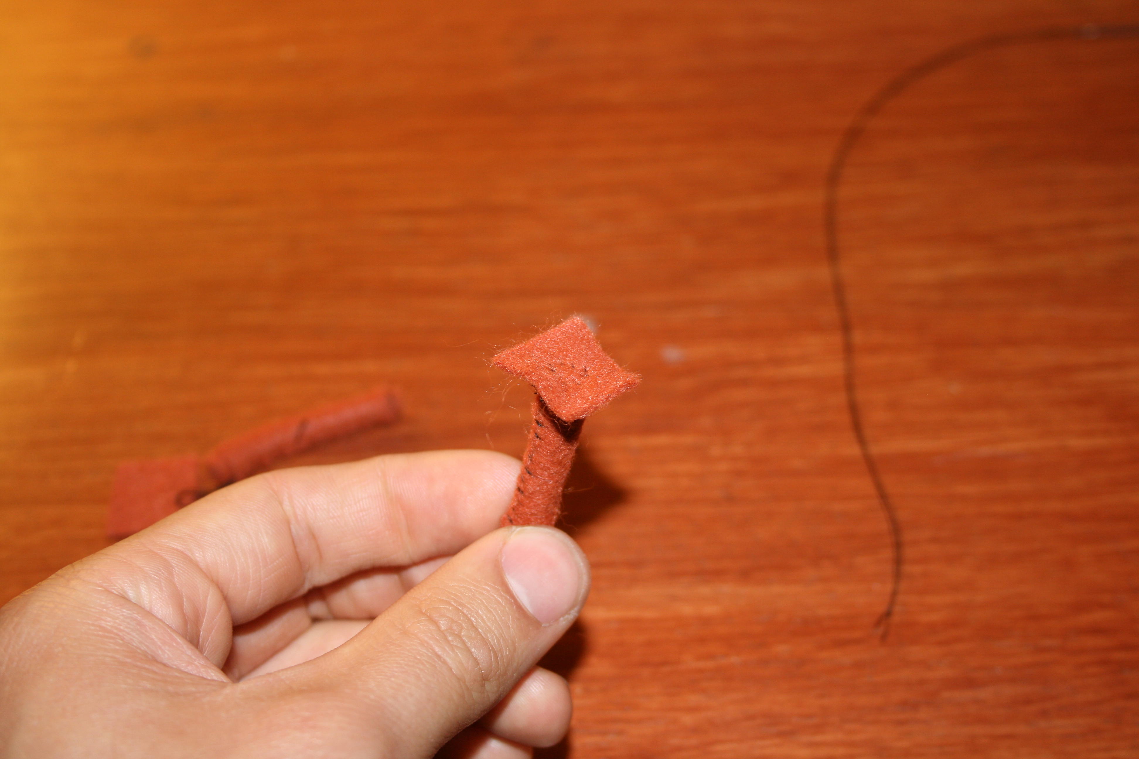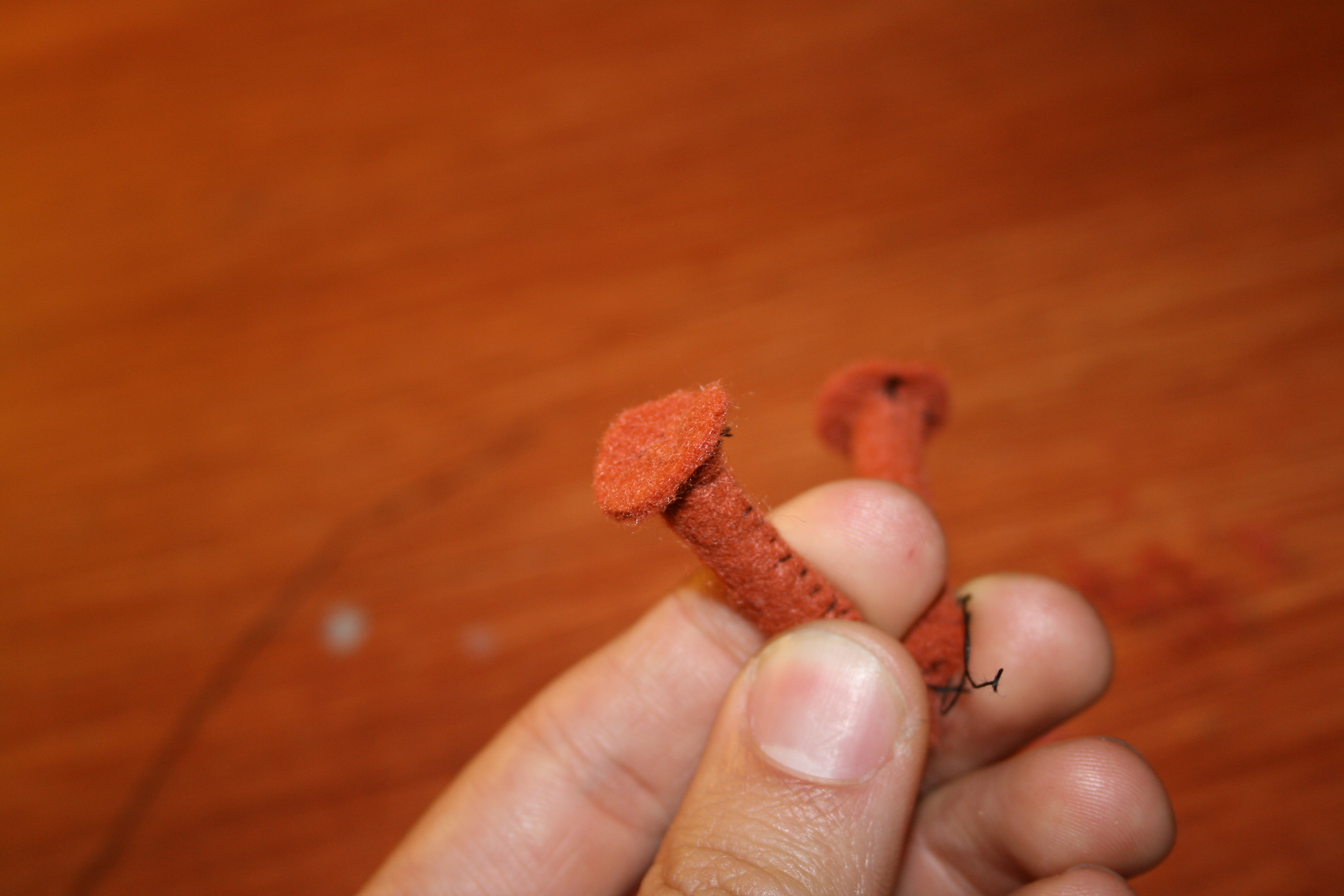 Clip out a square around three quarters of an inch on each side and lay it down on one end of one of the rolls. Stitch it down and shave off the corners of the square to make it a circular nail head. Do this for both rolls.