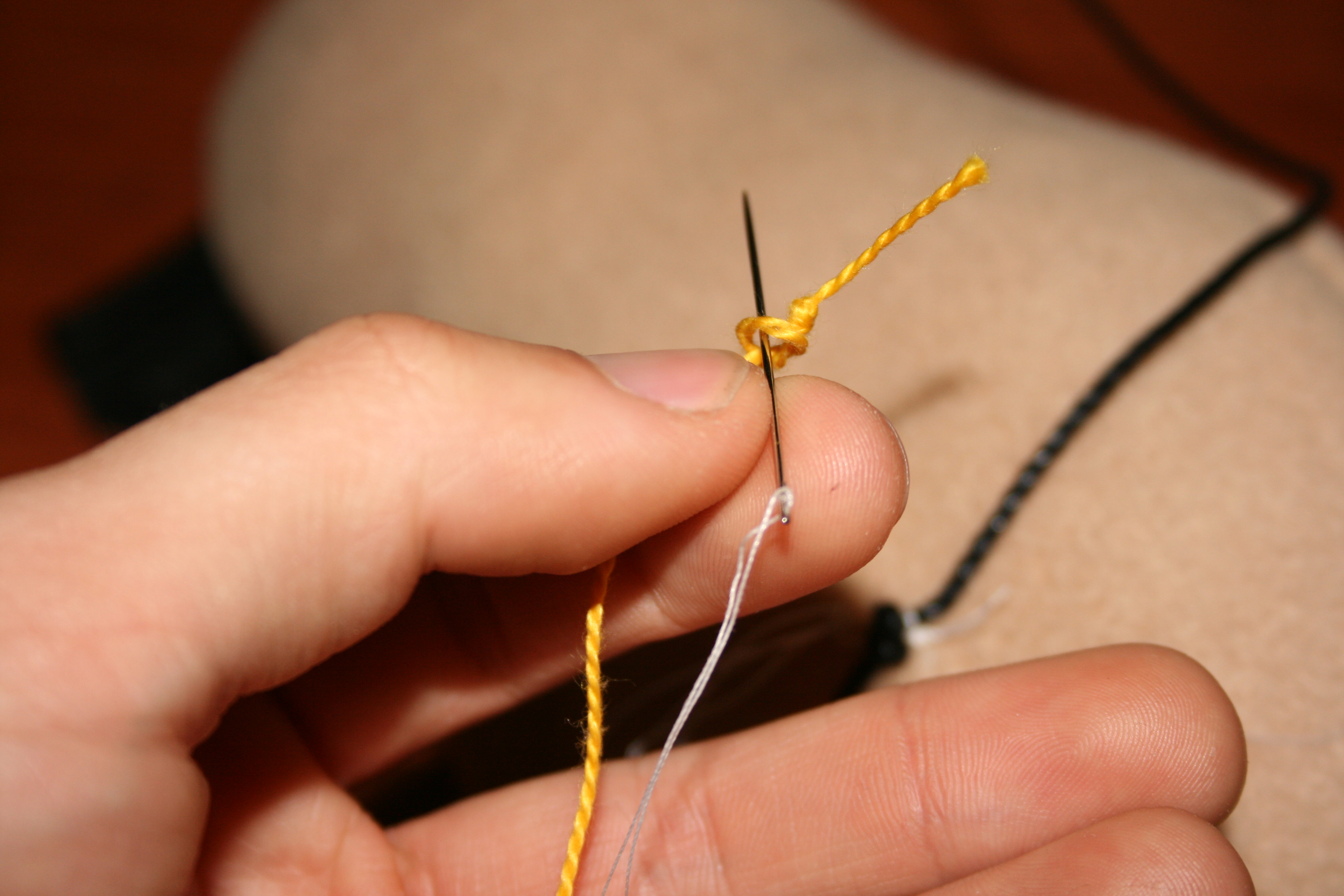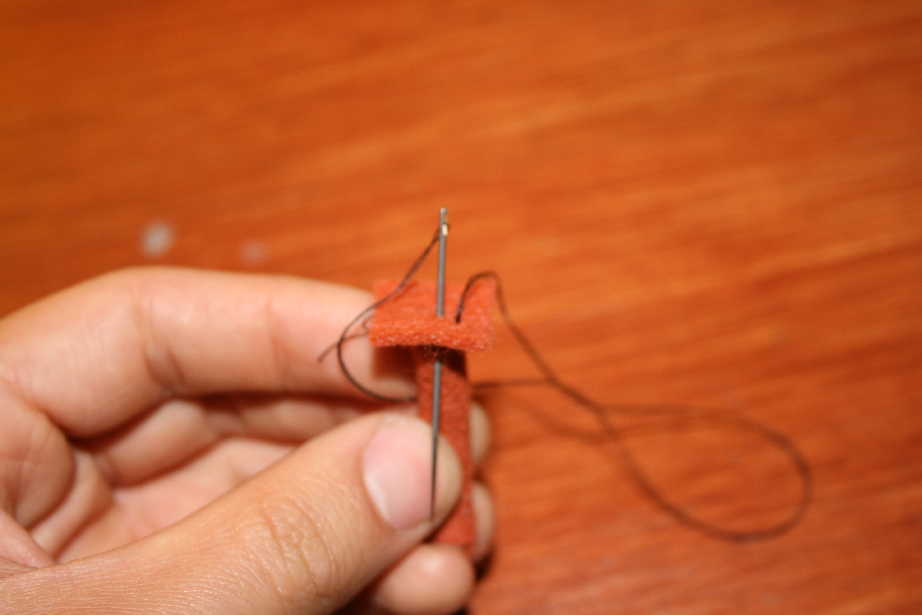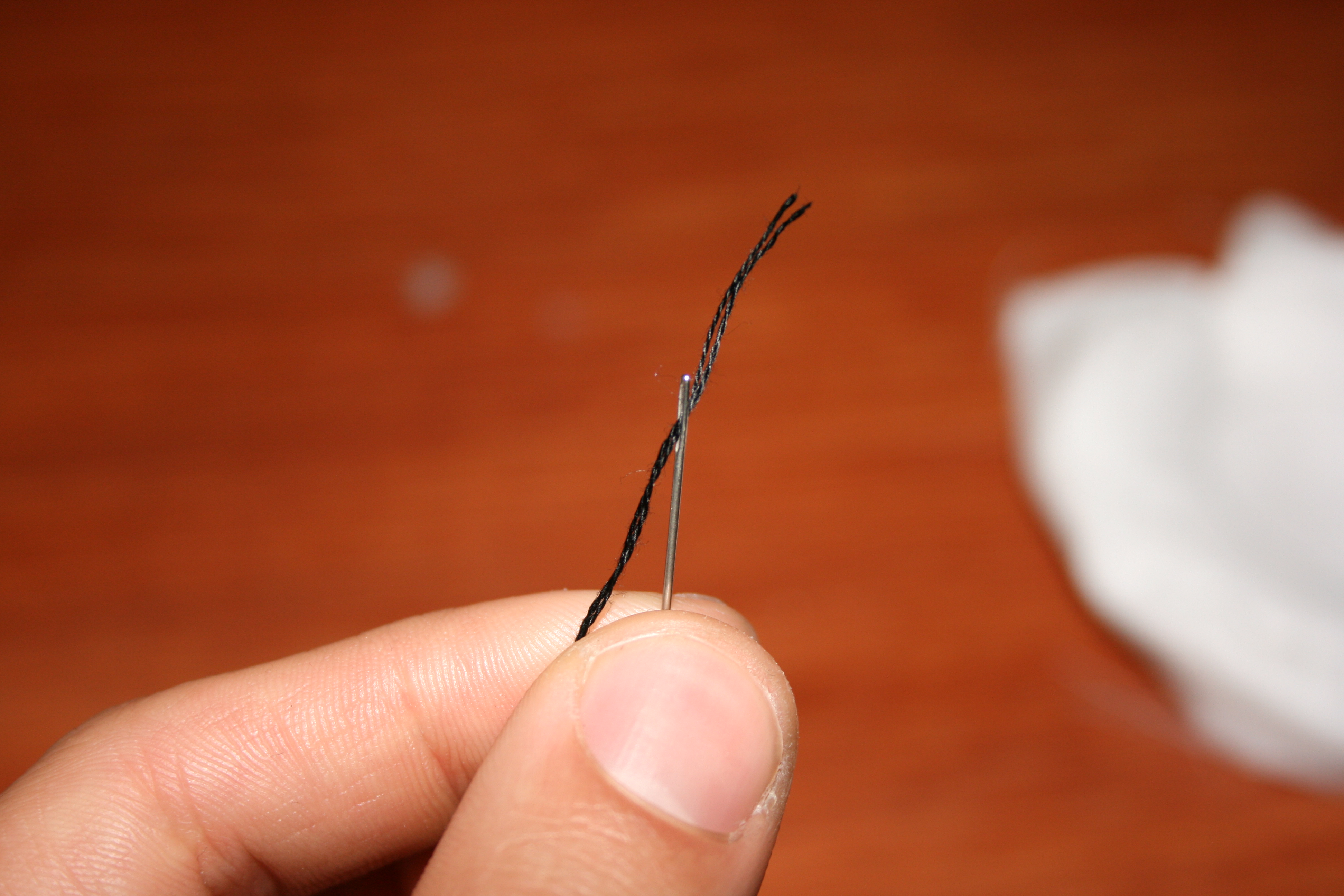 To start off, poke the end of your thread through the eye of your needle. Pull a fair length of thread through the eye. Unravel enough thread from the spool so that there are matching lengths of thread trailing from both sides of the eye and cut off.