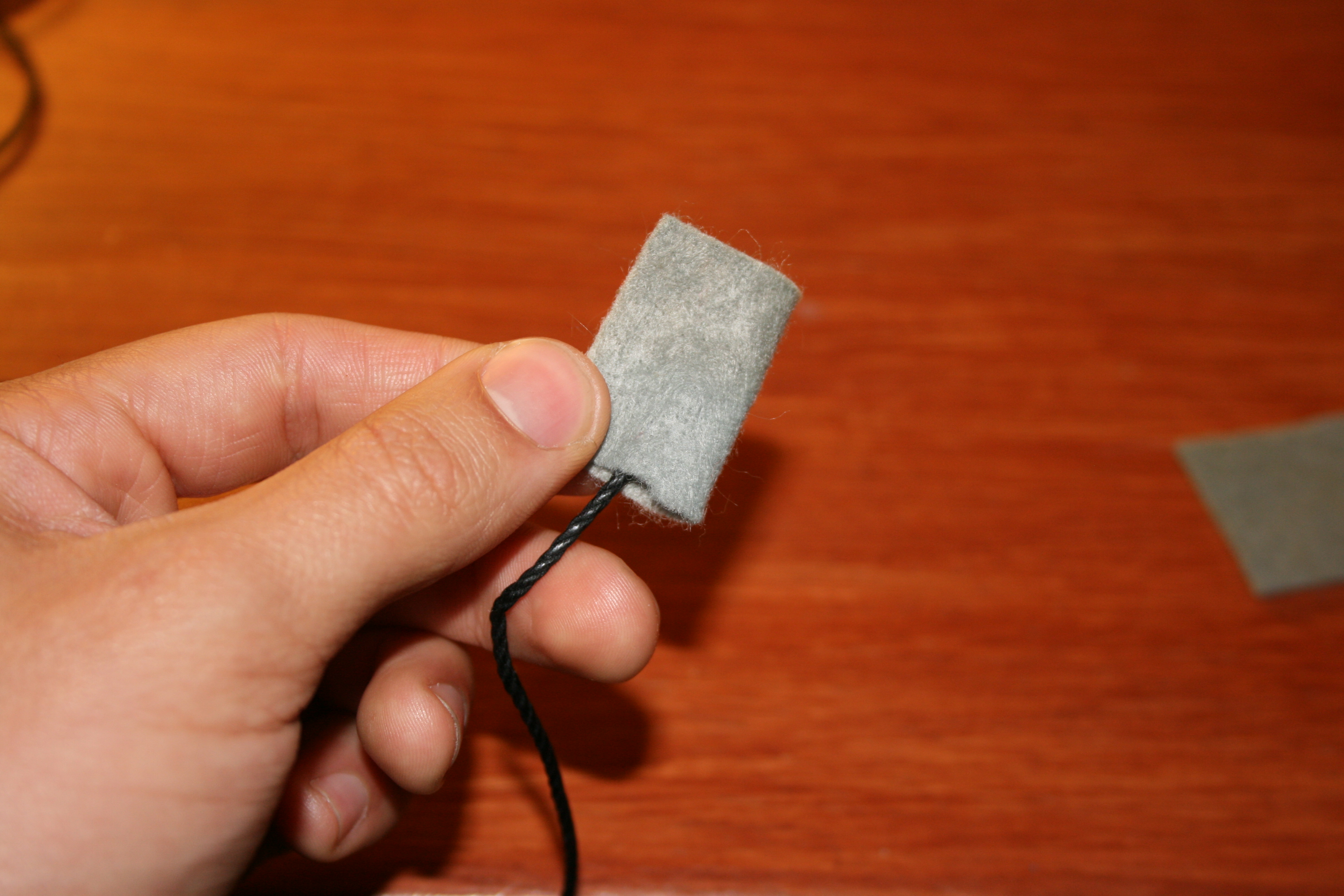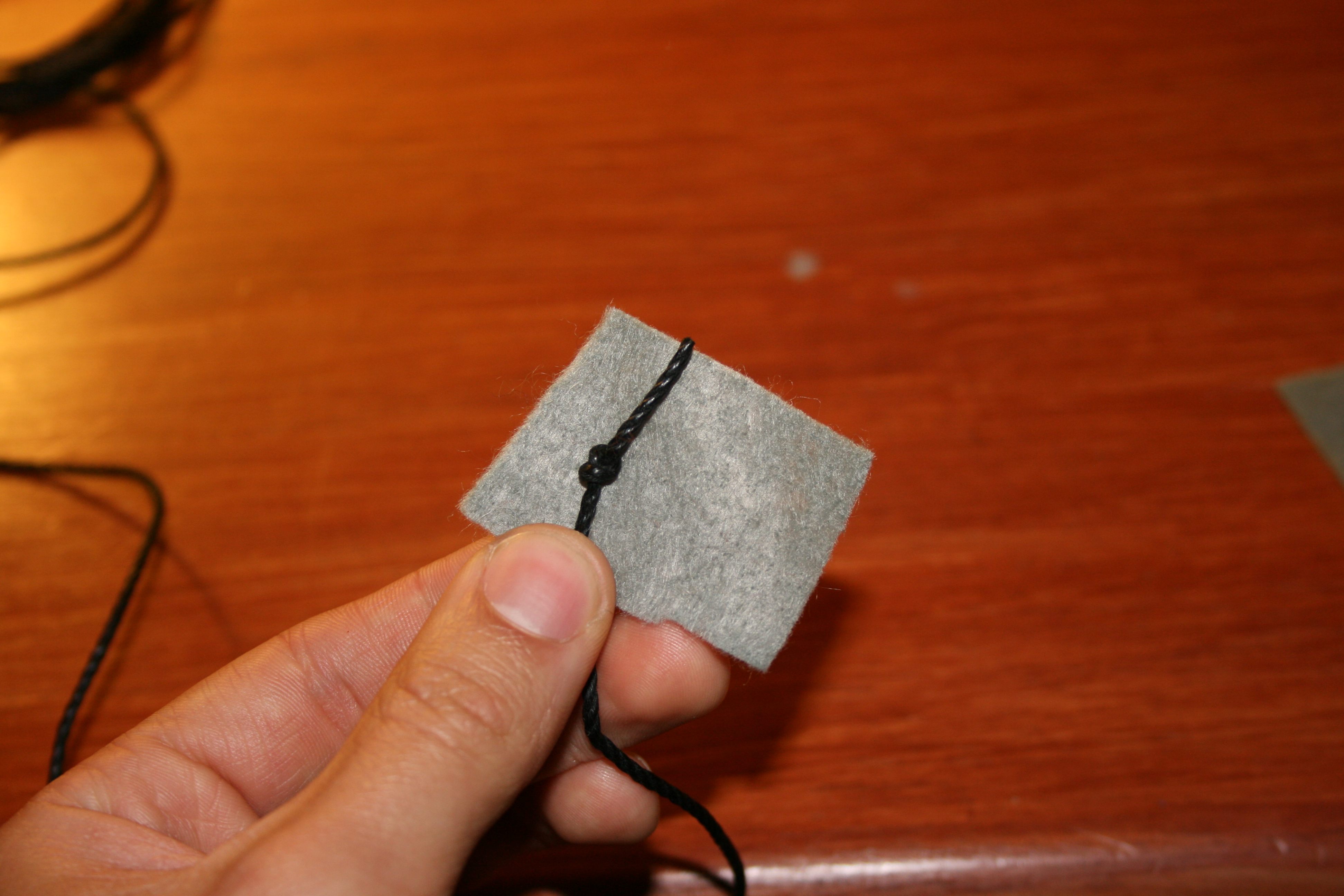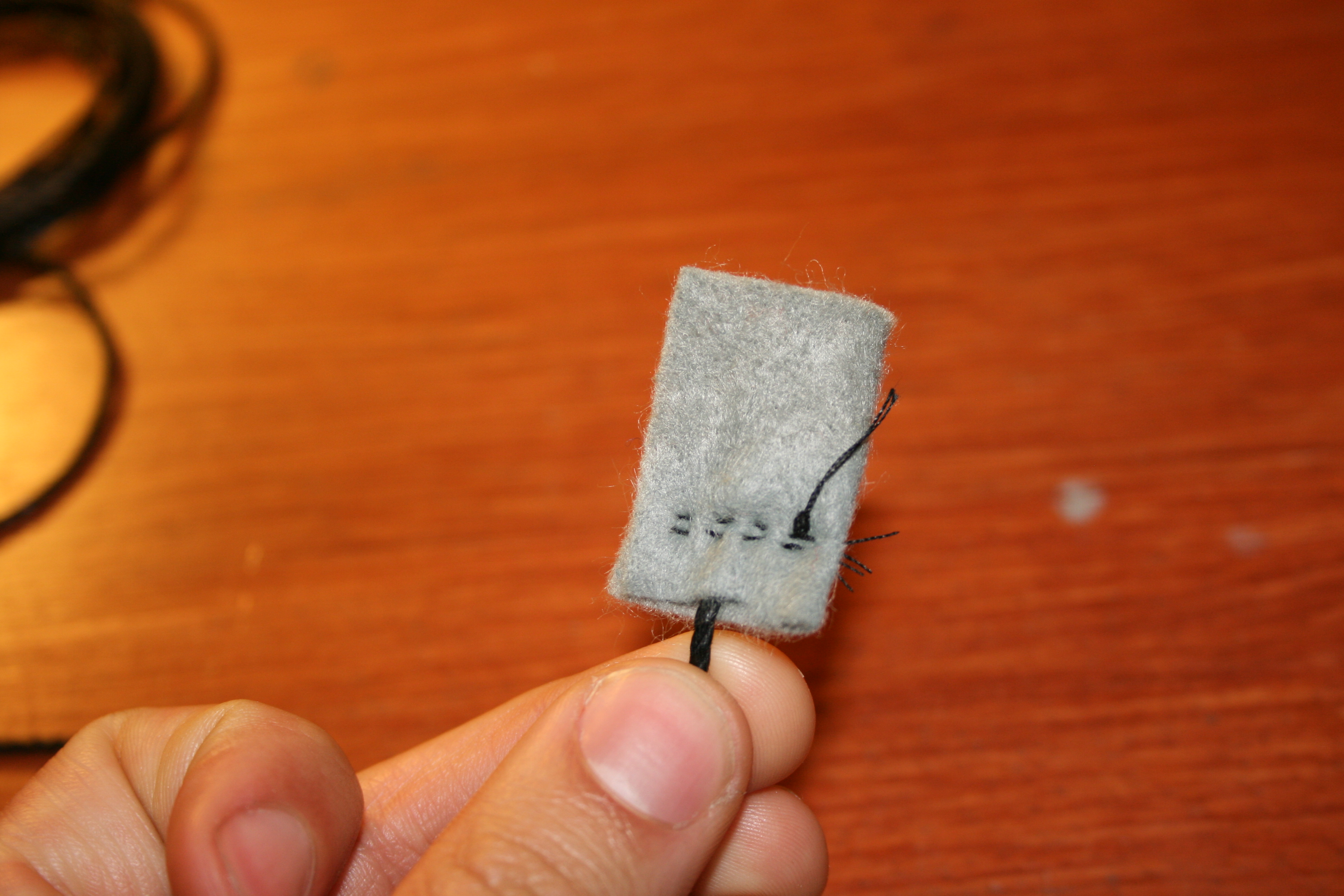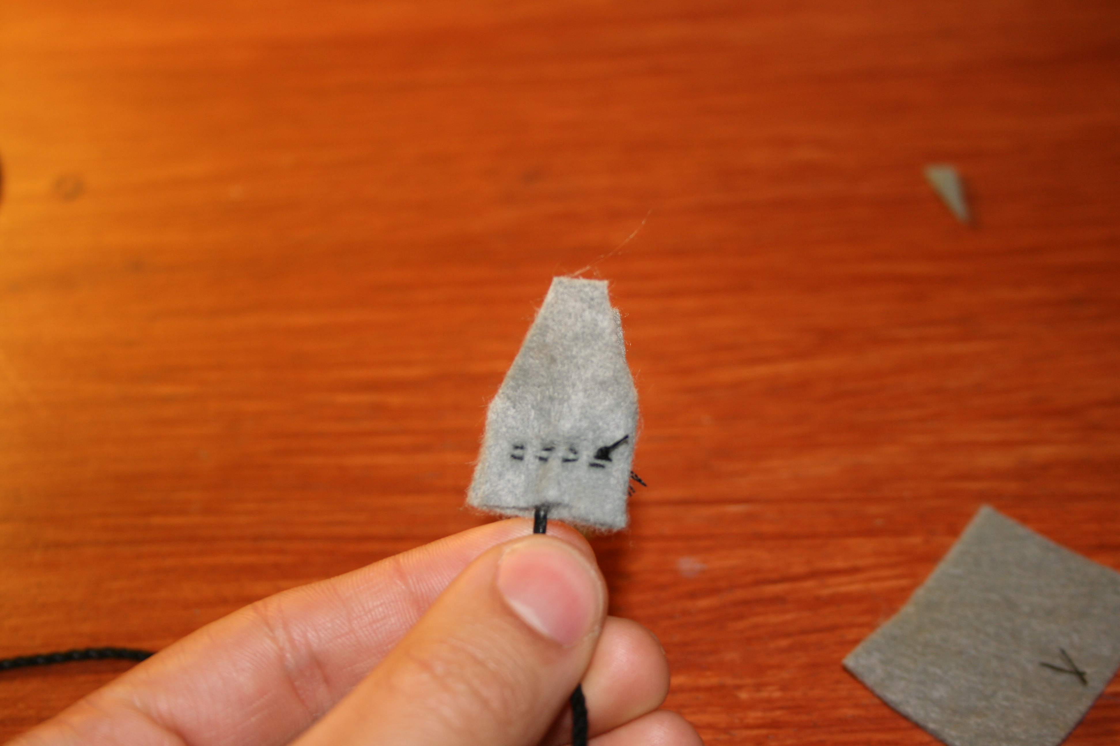 Start by taking your jewelry cord and tying a thick knot at one end. Clip out some gray fabric about one by one and a half inches. Fold it in half over the knot in your cord and stitch across just below the knot. Keep an extra tight stitch so the fabric will not pull off the end of the cord. This will become your first alligator clip.