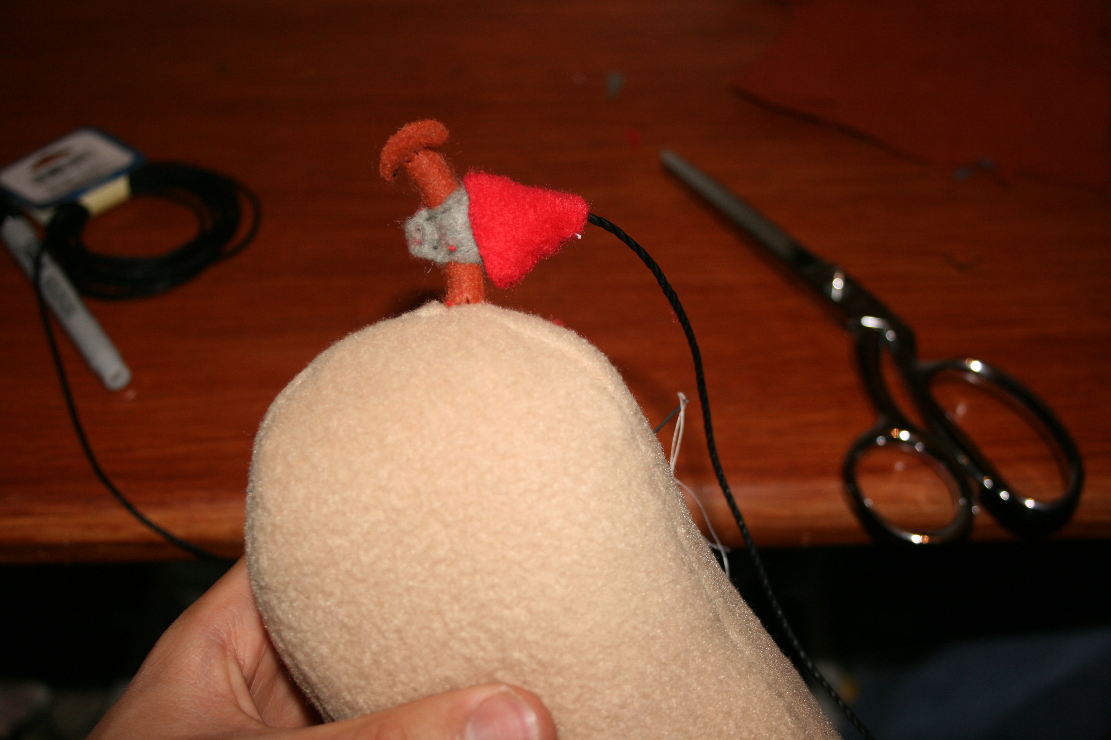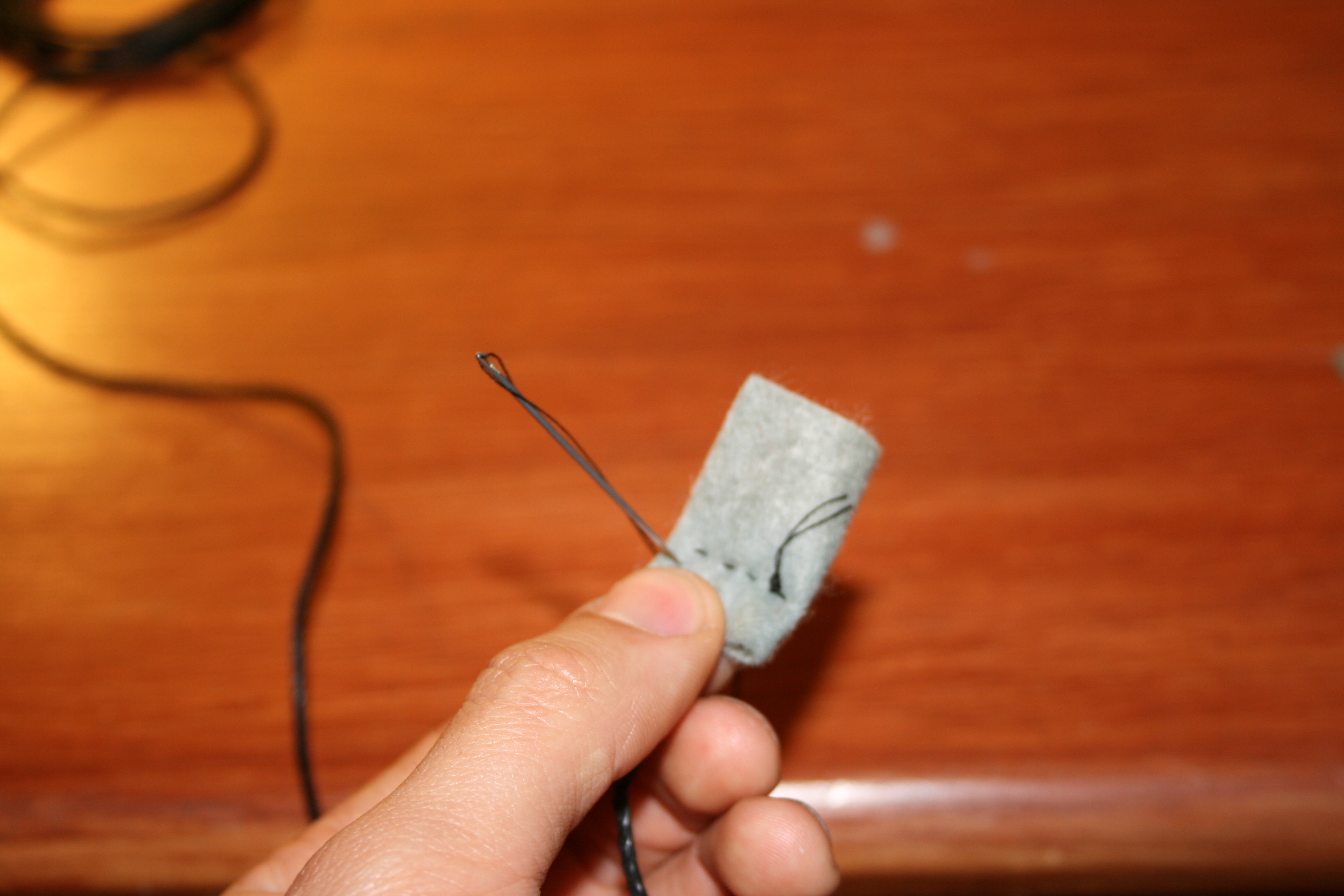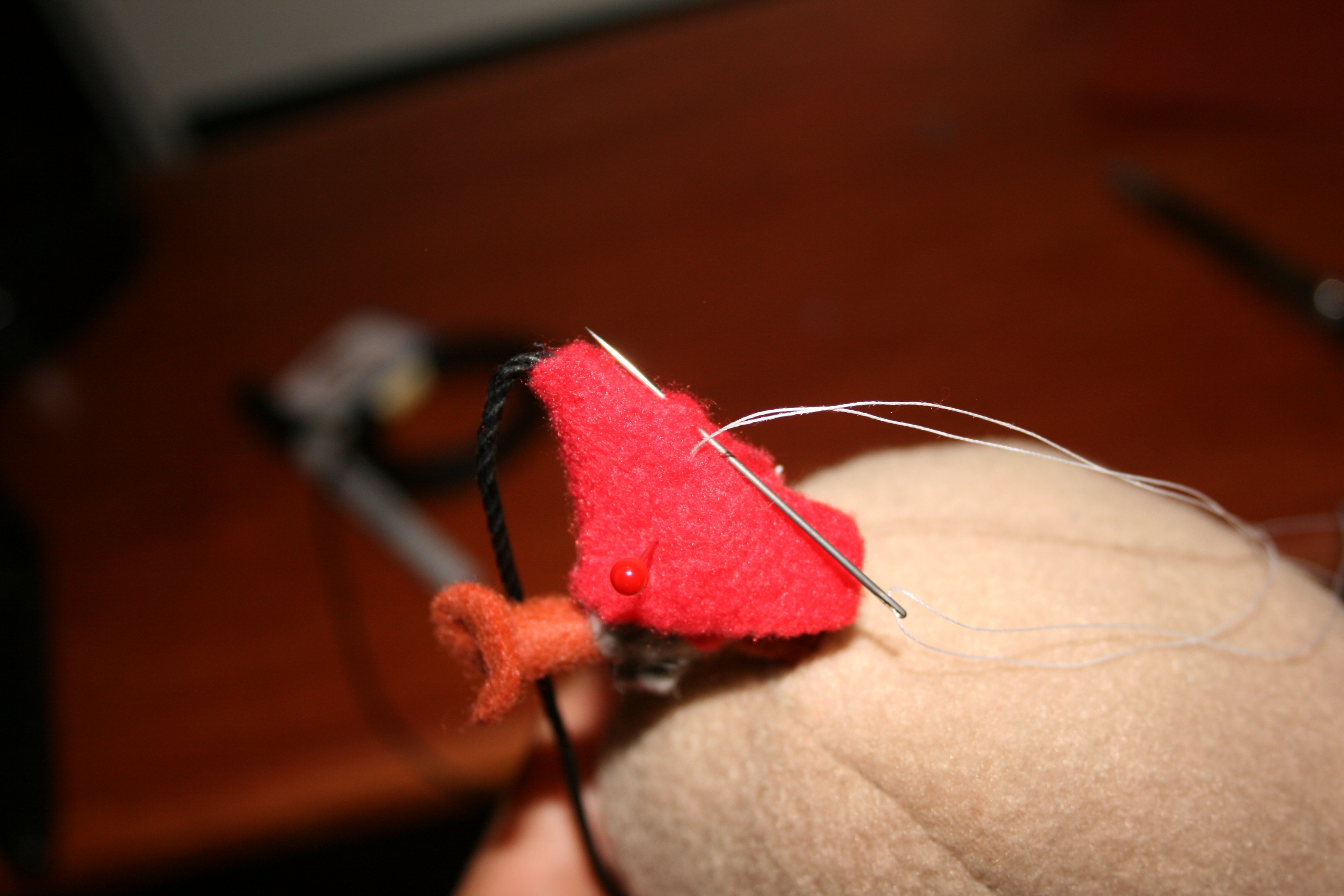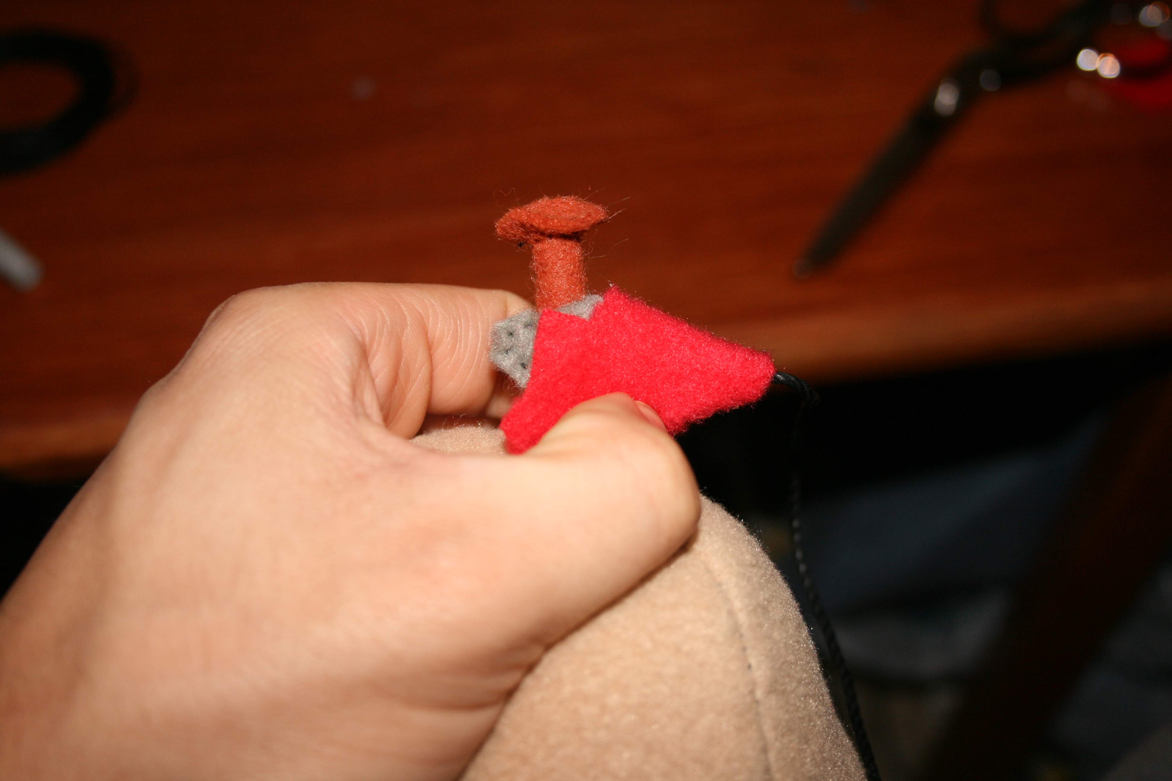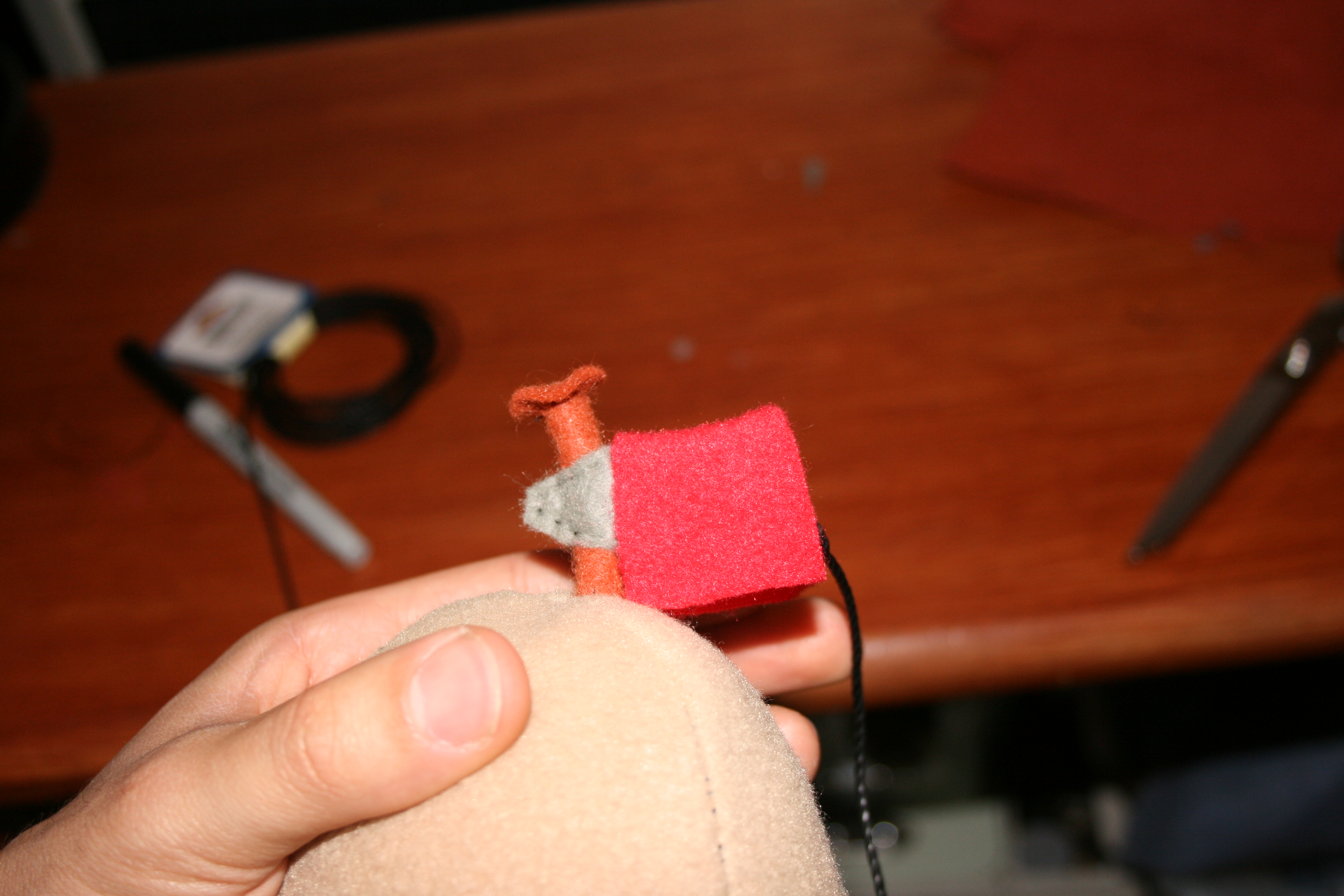 Cut out a rectangle of red fabric about one by two inches and fold it over the bottom of the alligator clip. Tuck in the the free ends on the opposite side of the fold and stitch it up with a slip stitch, creating a sleeve over the gray fabric. Try to make the sleeve tight and fit to the shape of the clip, tapering down to where it becomes the cord.