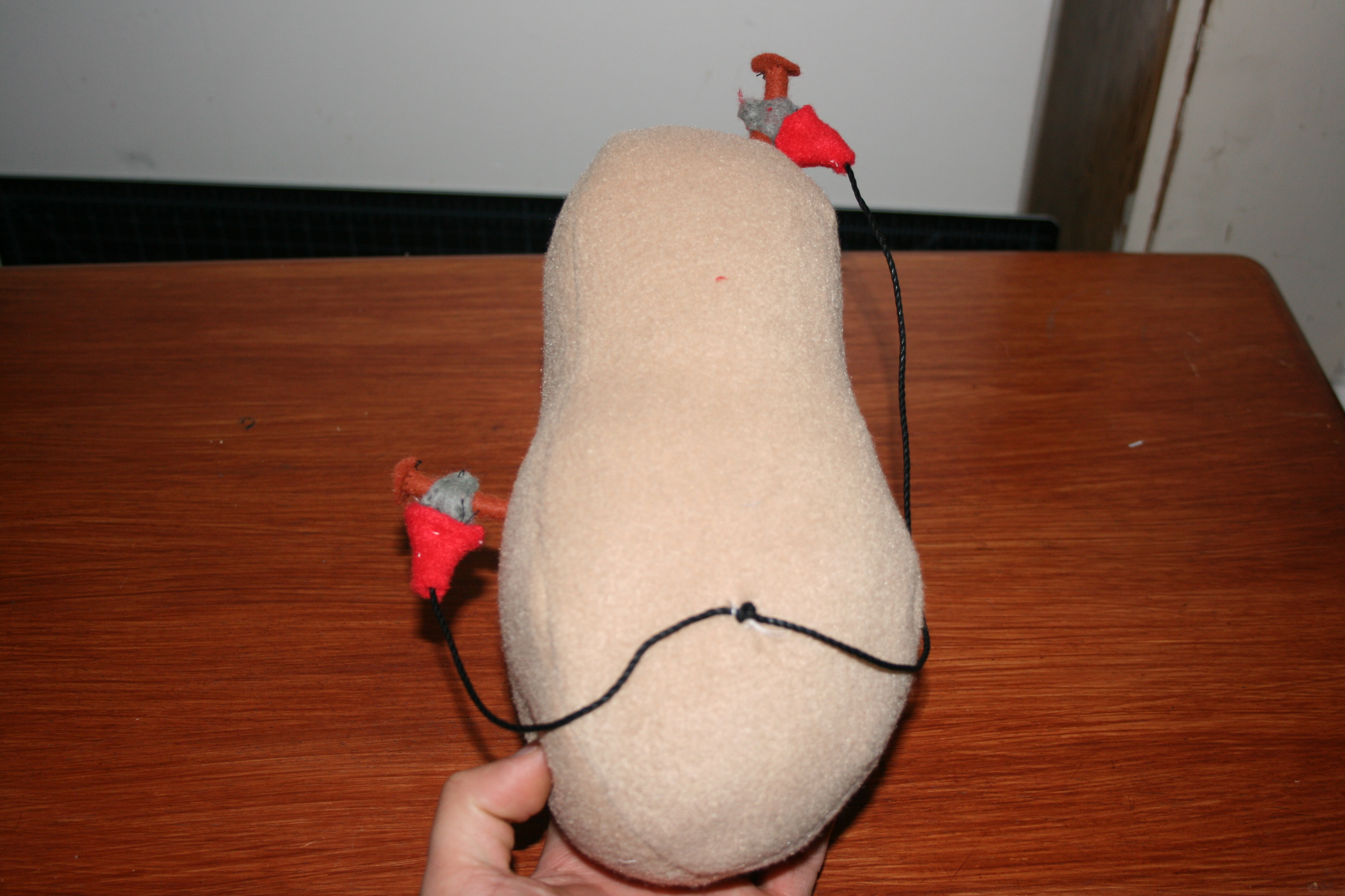 You should now have two nails to stitch onto the potato at its top and side as shown.