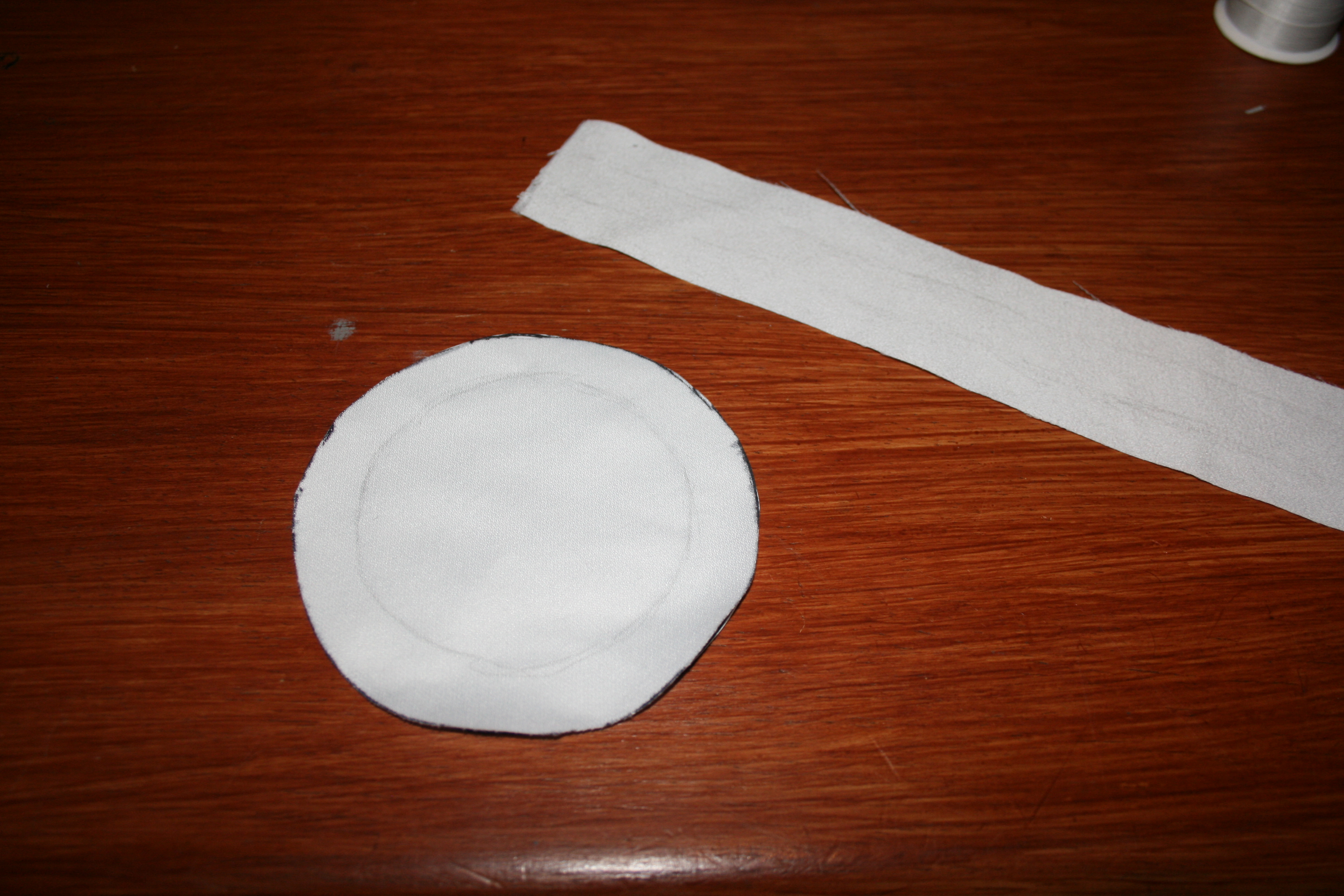 Take the parts that make up GLaDOS' face (the large circle and the long rectangular strip). With the good sides of the fabric facing in, align the outer edge of the long strip with the edge of the circle, bending it to fit all the way around. Pin it in place and stitch all the way around one half inch inside the edge (along the dotted line). Shave off the excess seam allowance and turn inside out. Be careful not to clip off the extra fabric too close to the seam, or the edge will fray and pull open at the seam.