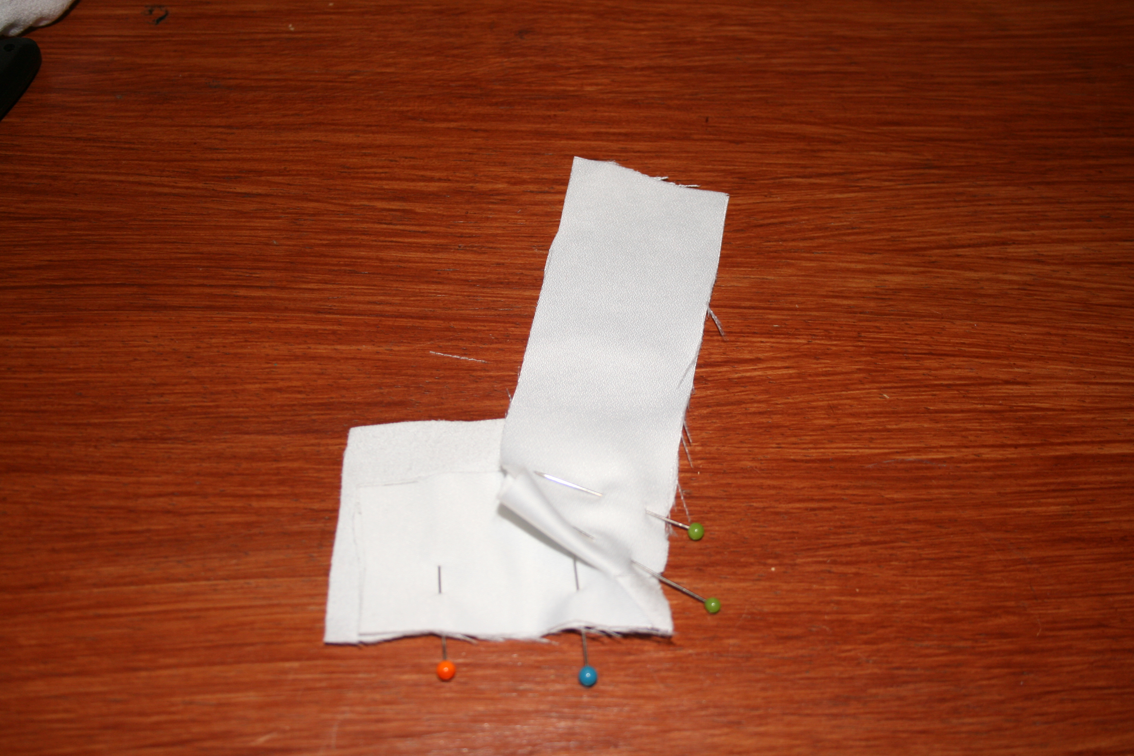 Take the second two pieces (the rectangle and the shorter strip) and align their edges similarly to the way you did the face. Start by lining up one side and pinning in place. When you get to a corner, cut a line on the side strip from the outer edge to the dotted line where it will bend to match the dotted line on the rectangle. Stitch around one half inch inside the edges (along the dotted line), being careful not stitch over any folded layers on the edge strip. You needle should only be passing through two pieces of fabric at any time: one layer of the front panel, and one layer of the side panel. When you've stitched all the way around, turn inside out.