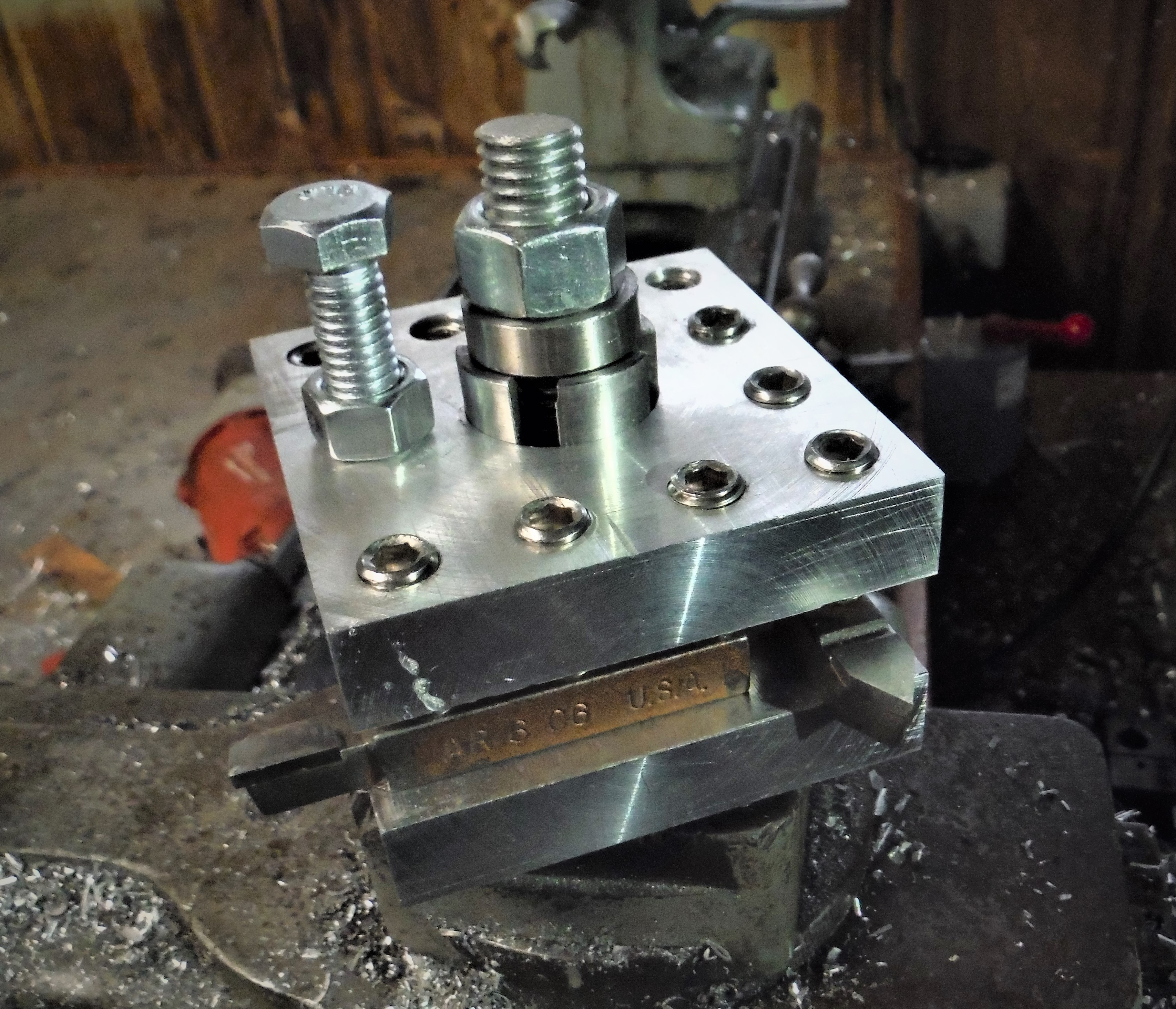 Use a 1/2-13 tap to cut threads into the hole in the base of the tool post, then insert a 4" length of 1/2" threaded rod.