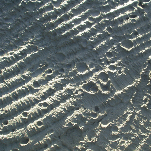 To create the rough texture, while still wet a stiff broom is used to leave a ripple pattern. On top of that, droplets of cement are "rained" down by a flicking motion with the gloved hand. That superimposes a crater effect on the ripple pattern.