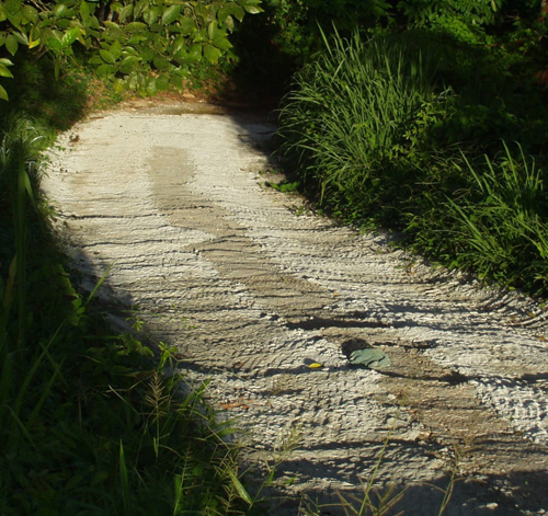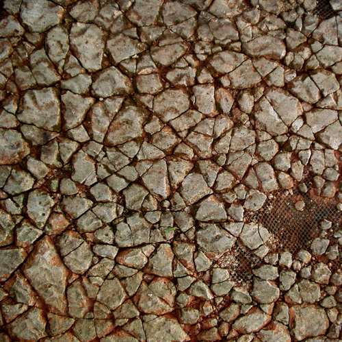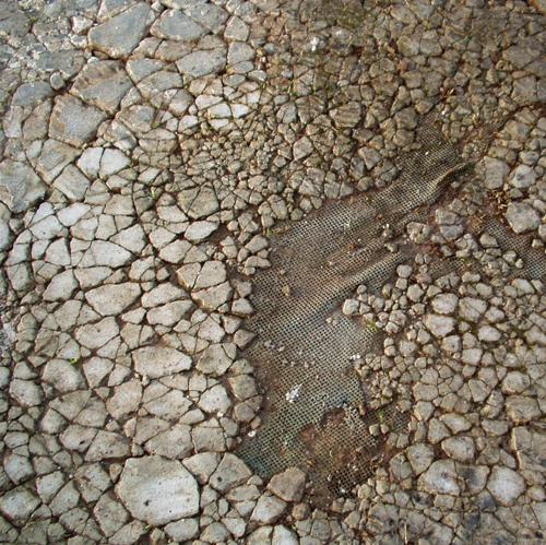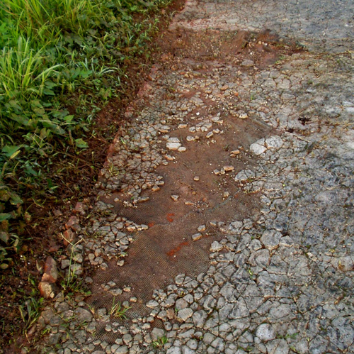 This is the condition of the driveway after many years of use. The rate of deterioration was slow at first, but accelerated. I imagine that the more cement that was missing, the more the remaining cement was unsupported sideways, allowing the fishnet to stretch and more cement to fragment and fall out.