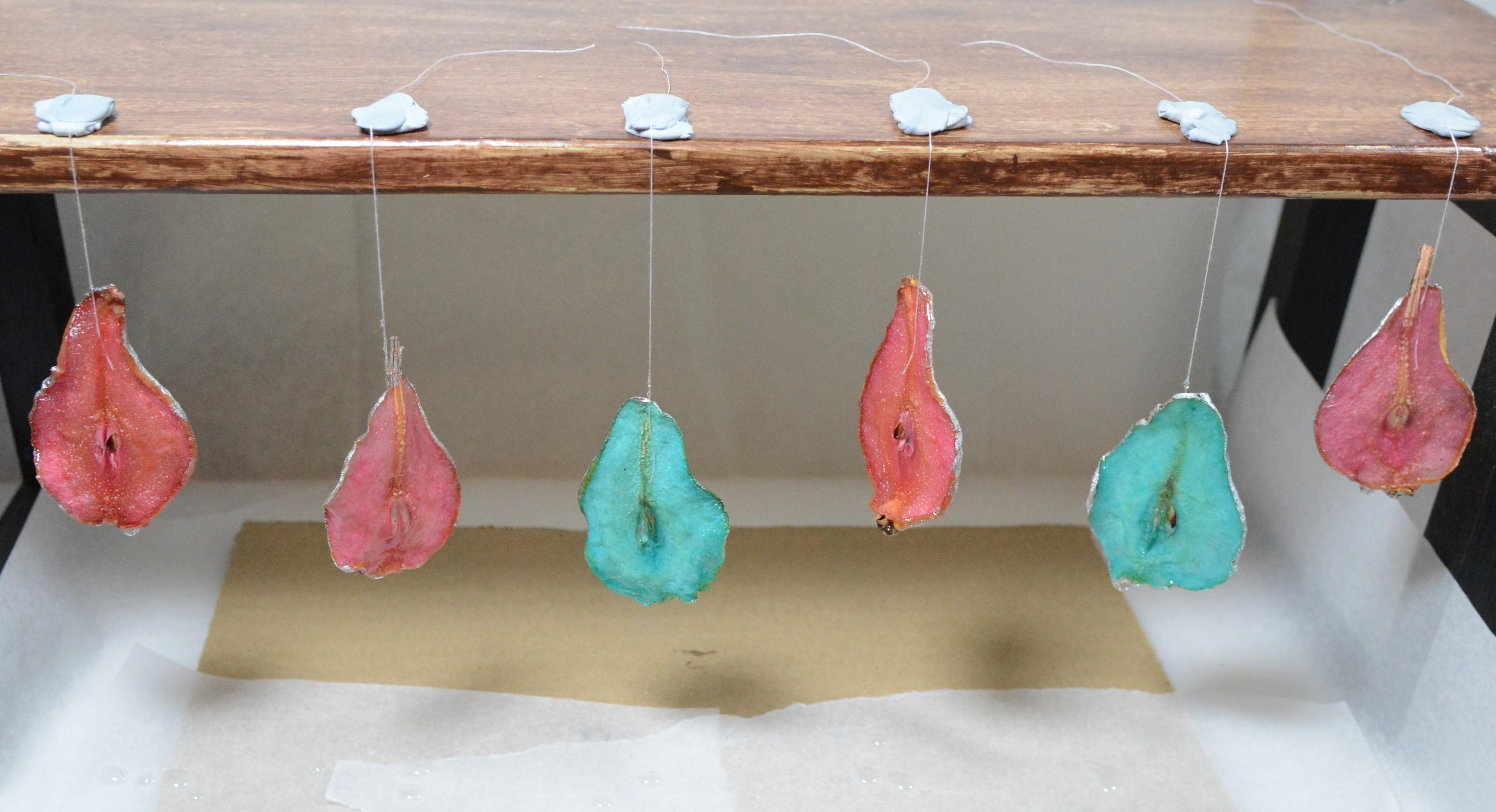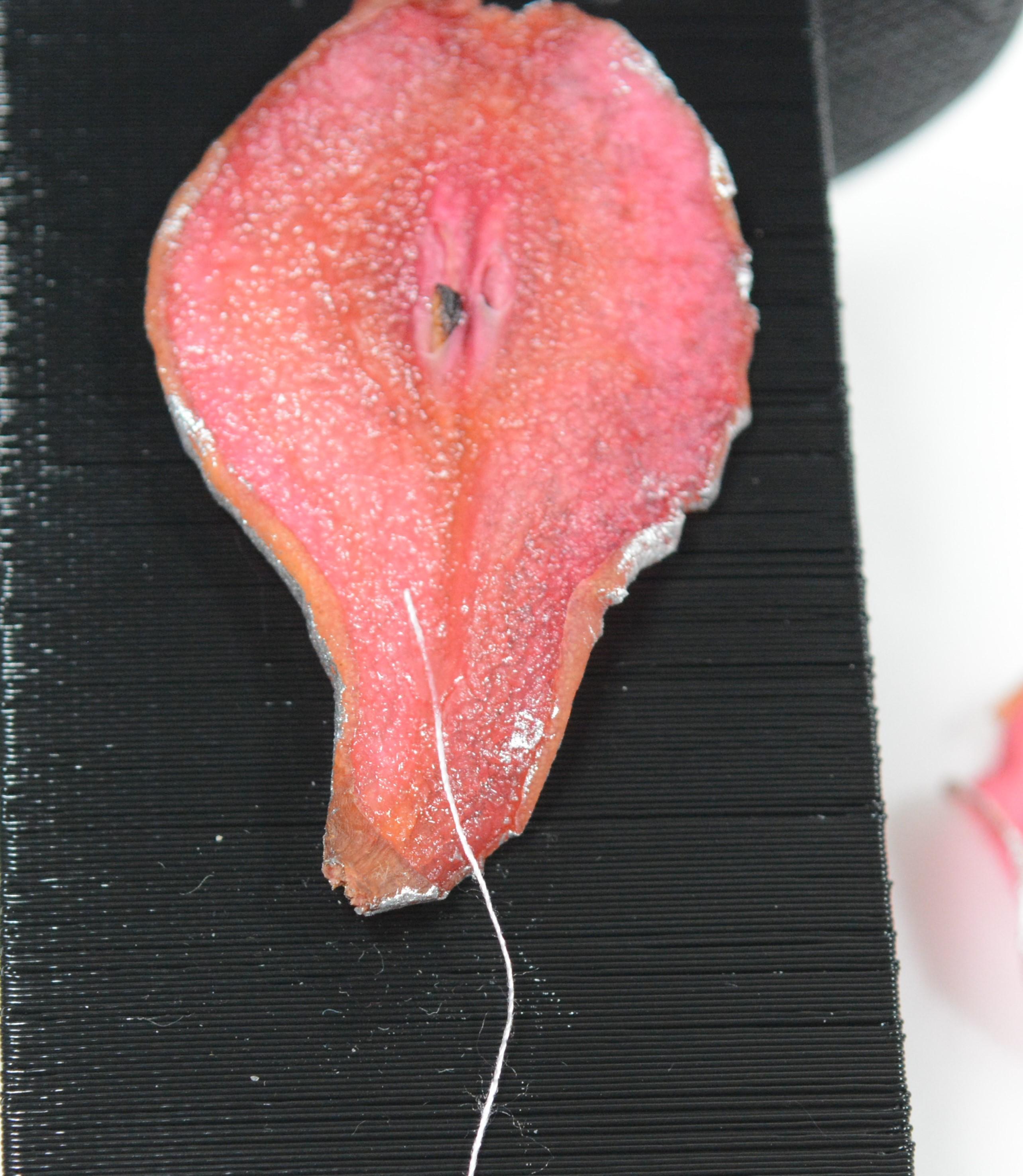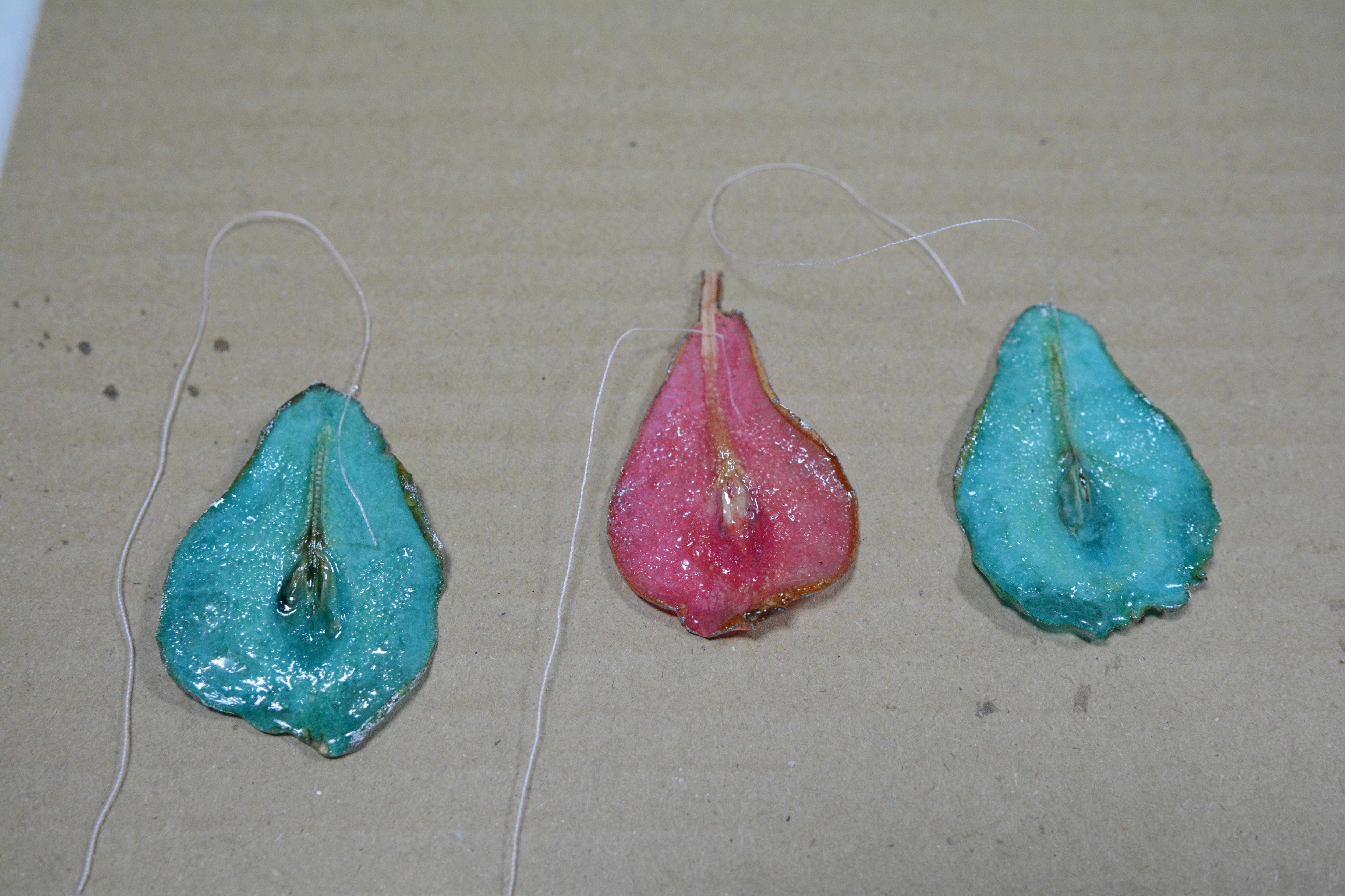 Use the tiniest amount of super glue to attach a sewing thread to the back of each slice. We will use that to hang the pears to allow excess resin to drip down.