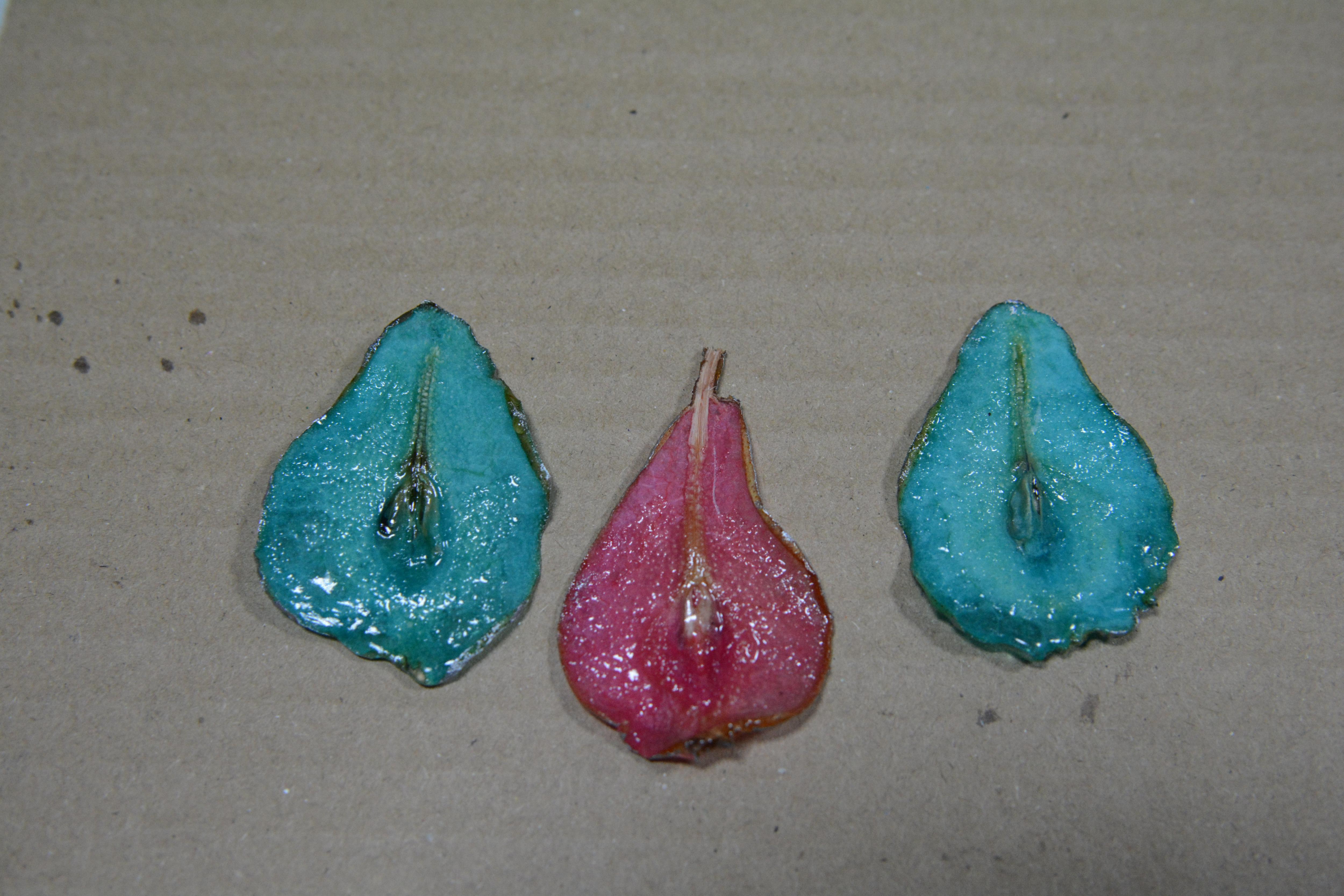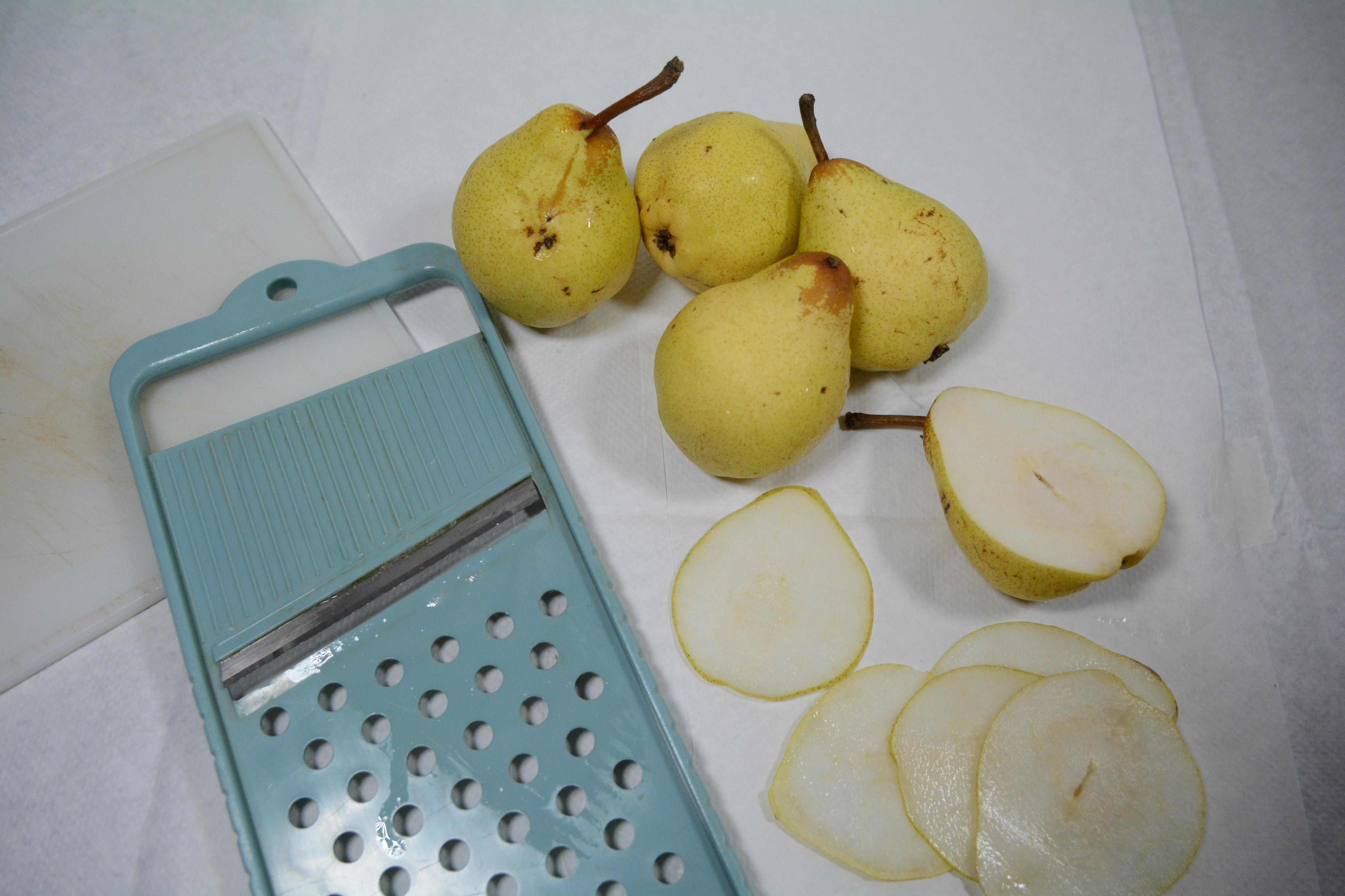 Wash the pears and slice them into thin slices. You are only interested in the middle part of the fruit where you can see the core and the seeds, the rest of the fruit can be eaten. Each small pear will probably produce only 4-6 slices, so you will need to cut at least 3-4 pears in order to choose the best looking slices.