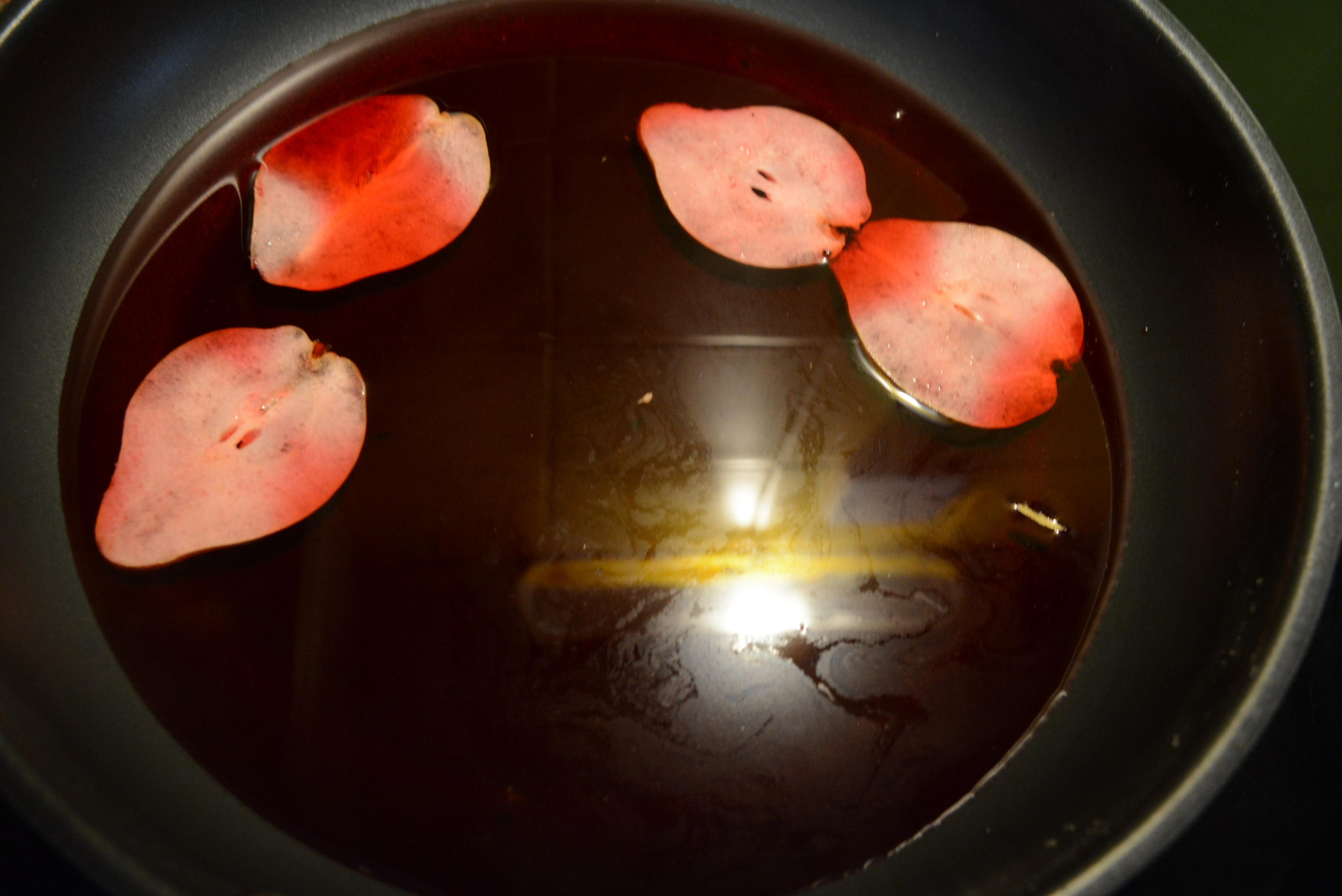 Mix sugar and water in 1:2 ratio. One cup of sugar and 2 cups of water will suffice for a small saucepan and a few pear slices. Heat until the sugar dissolves and take it off the stove.