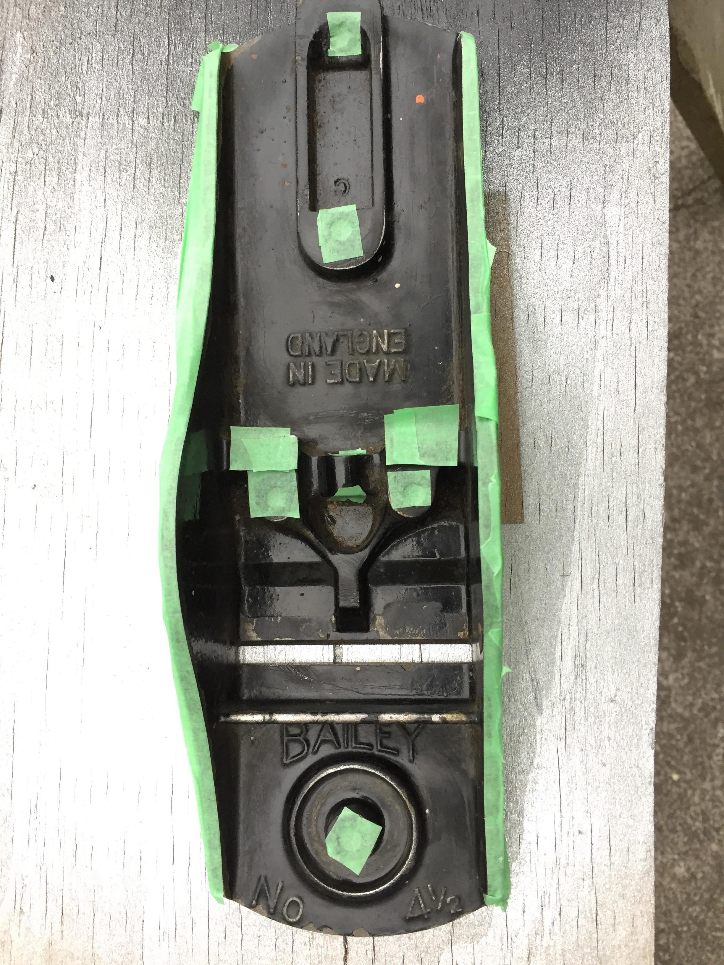 I didn't take a picture of doing this with the frog of the plane (the part on which the blade rests) but the principle is the same. Cover all the areas not painted (untouched steel) with painter's tape. These areas should be easy to define simply by observation. Cover screw holes as well to avoid getting paint in them.