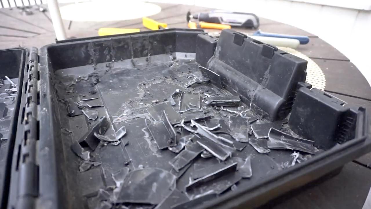 We’ll be using a chemical product called paint stripper. It’s a very caustic liquid, so it could be too harsh for your container if it’s made of a less durable kind of plastic. Luckily, most half-decent cases are made to withstand strong chemicals on jobsites (that's the case for boxes made out of polyethylene). To see if your case will survive the treatment, you can put some paint stripper on a piece of plastic you removed in the previous step, to see if the chemical modifies its rigidity.