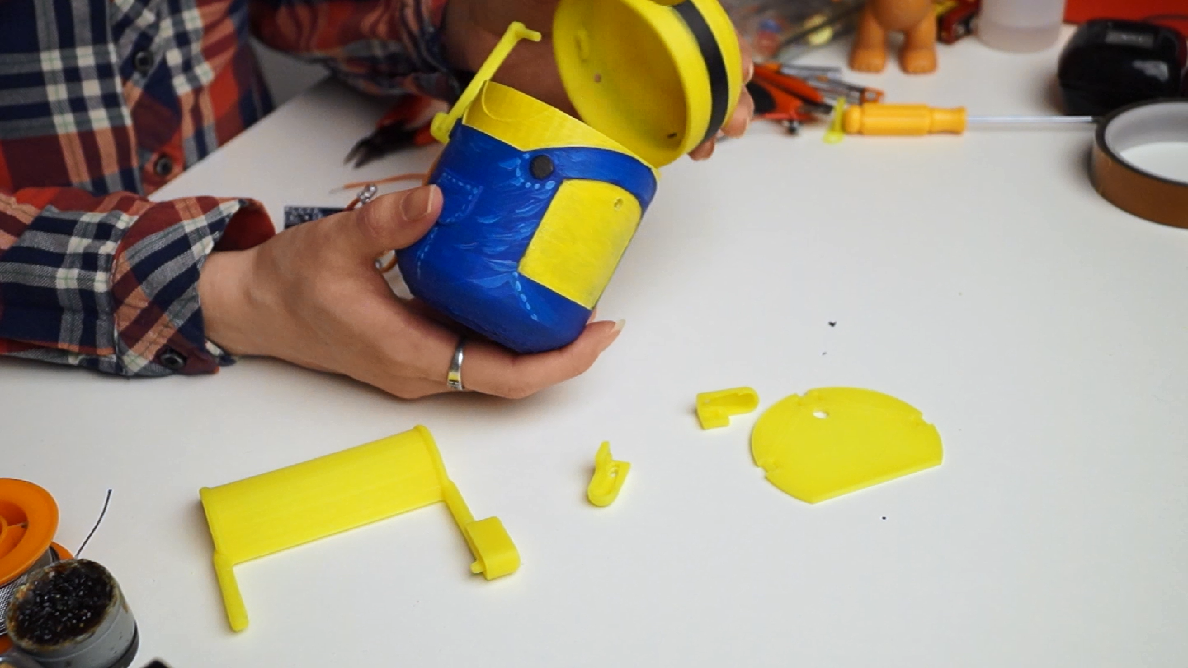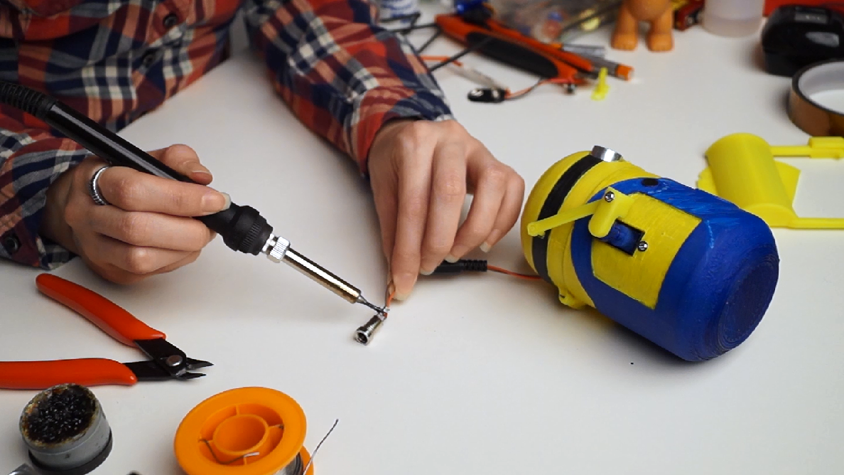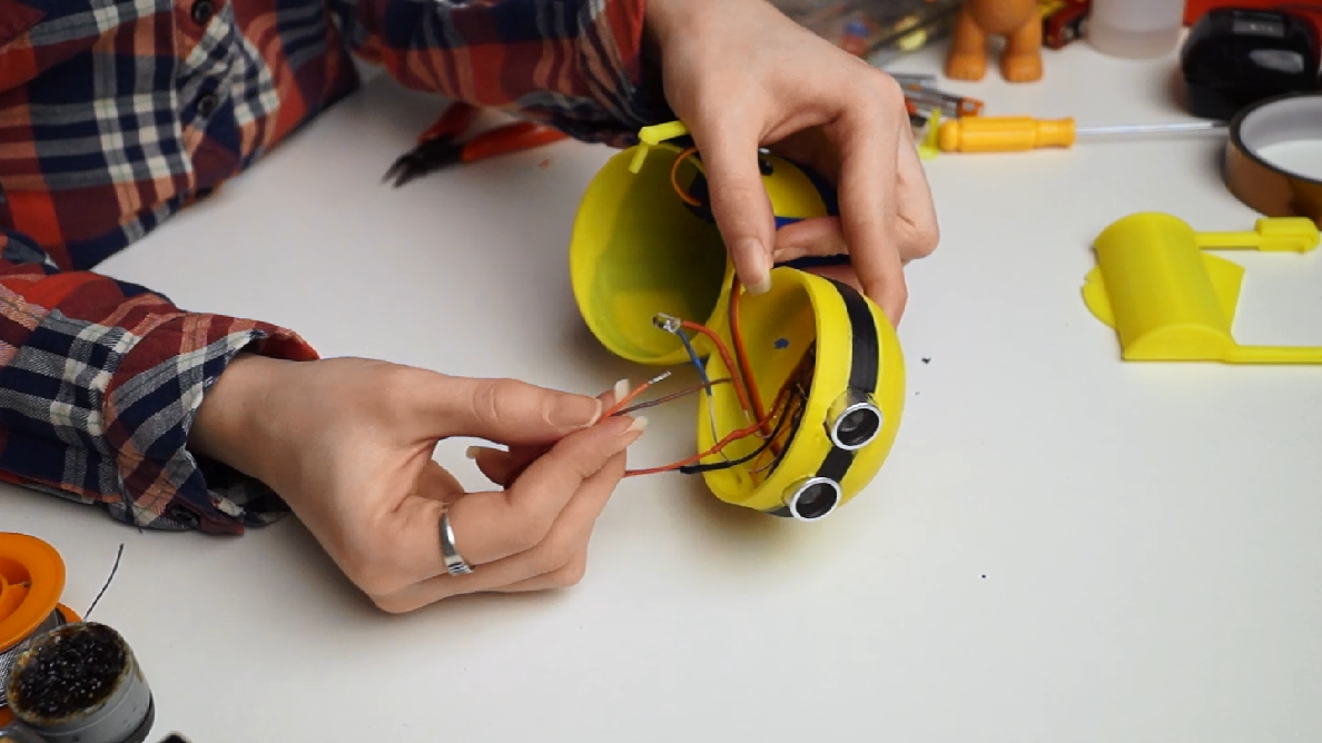 In the final version of the project, we abandoned the battery. On the back of the robot's head, we drilled a hole to install the power supply connector.