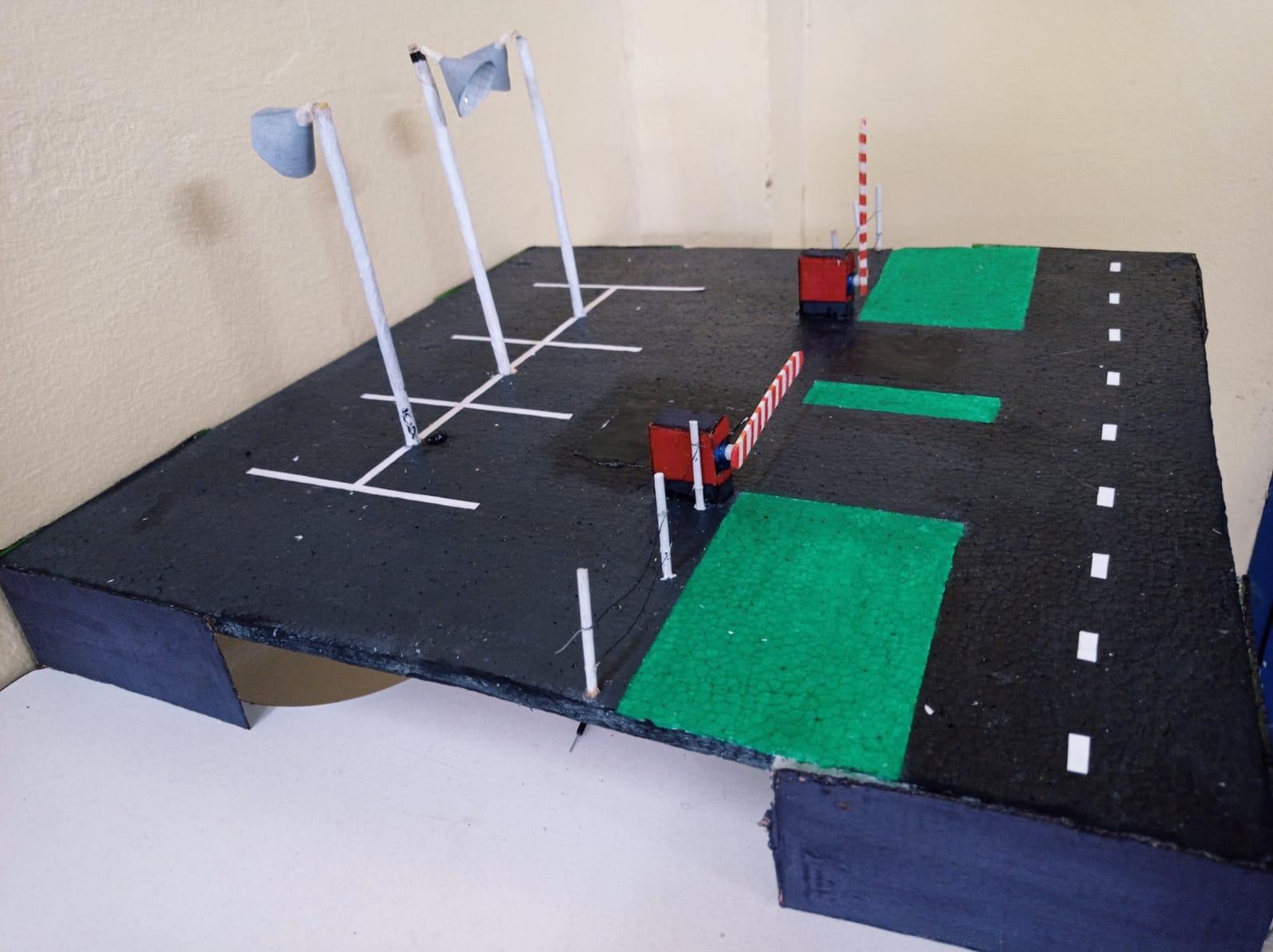 -Pintamos la maqueta y usamos cinta para simular los pasos peatonales y las rayas de transito de la ruta