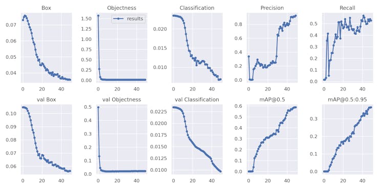 In the output, we can see that we have trained our model using 50 epochs. After training, we need to check our trained model’s metrics to get an insight as to whether the model is performing well on unseen data or not. Navigate to run/train/yolo_safety_helmet_detection# and determine the file called results.png.