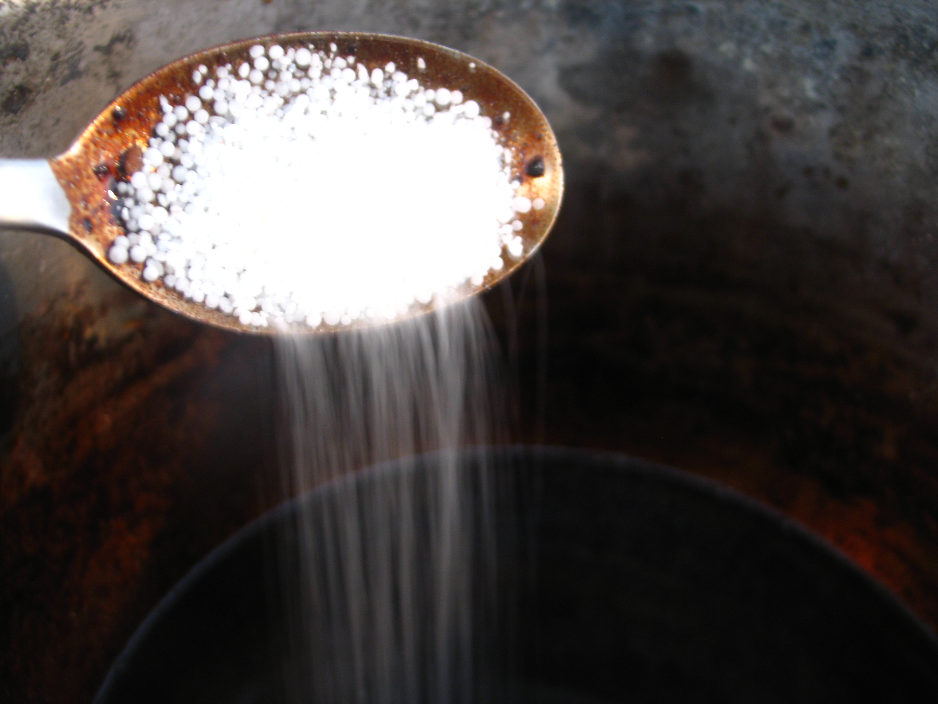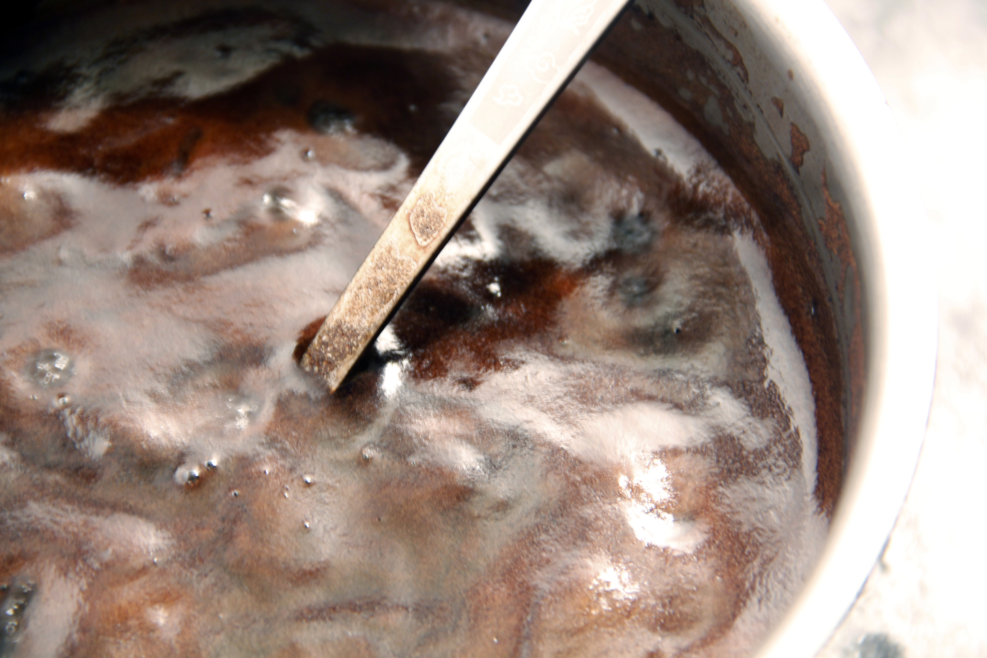 - Slowly pour the lye into the pine reduction and stir until the lye has dissolved.