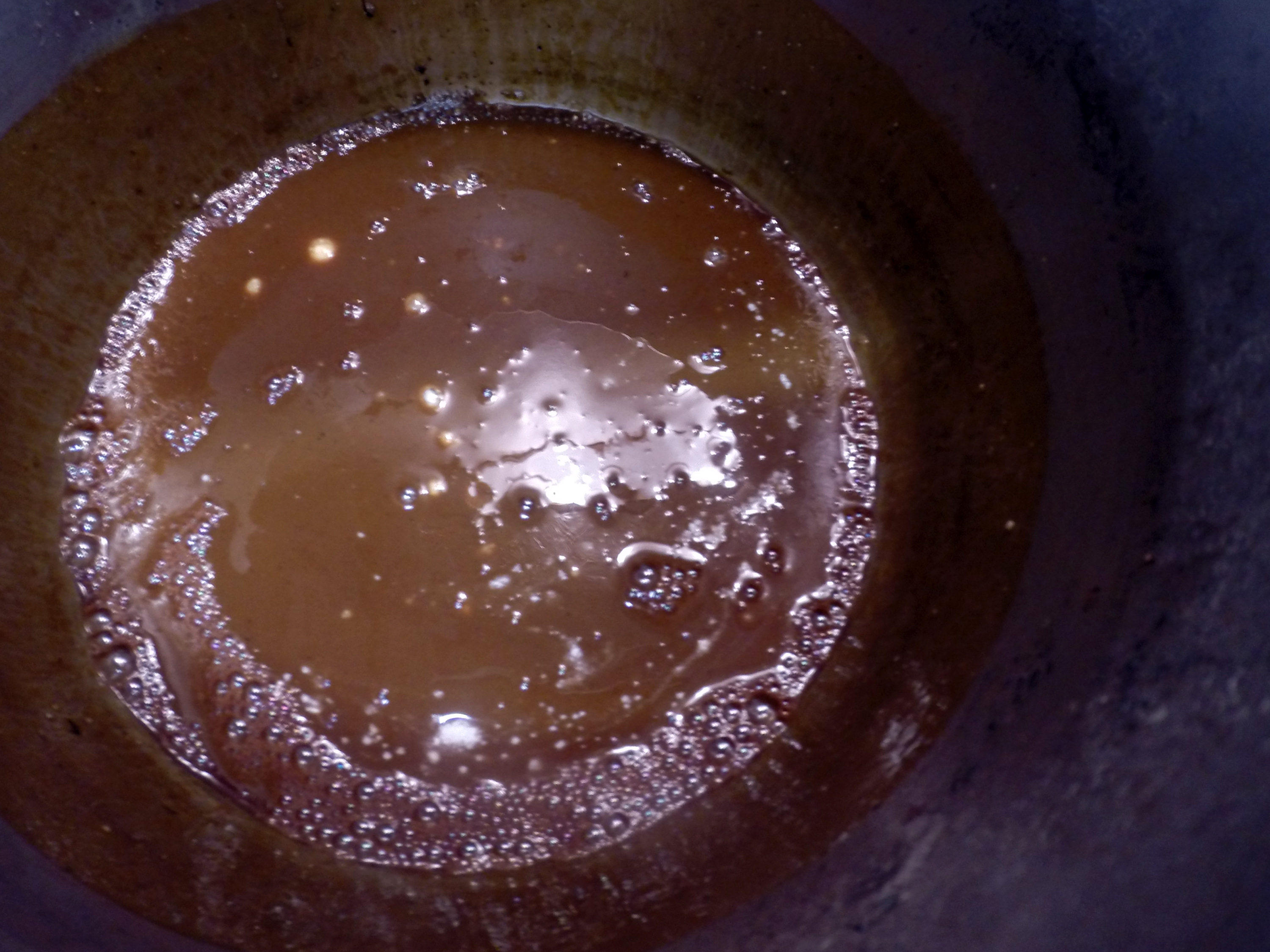 Remove the pot's lid after the pine has boiled for an hour and reduce the liquid until you have 200 grams of a substance which should look something between chocolate milk and thick balsamic vinegar.