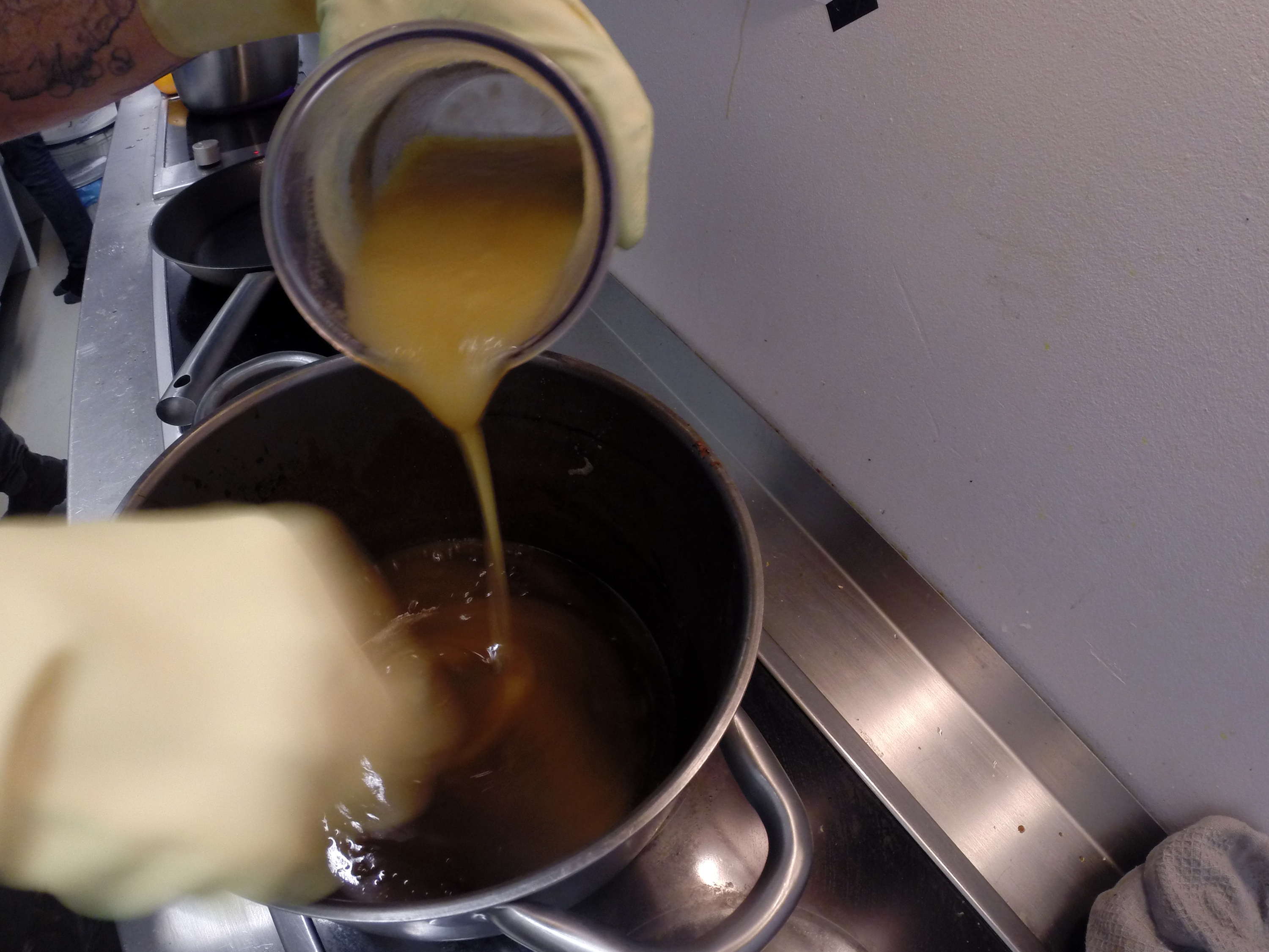 At this point there should be a chemical reaction happening between your pine reduction and the lye causing the mixture to become warm/hot. While this is happening, gather your fats: