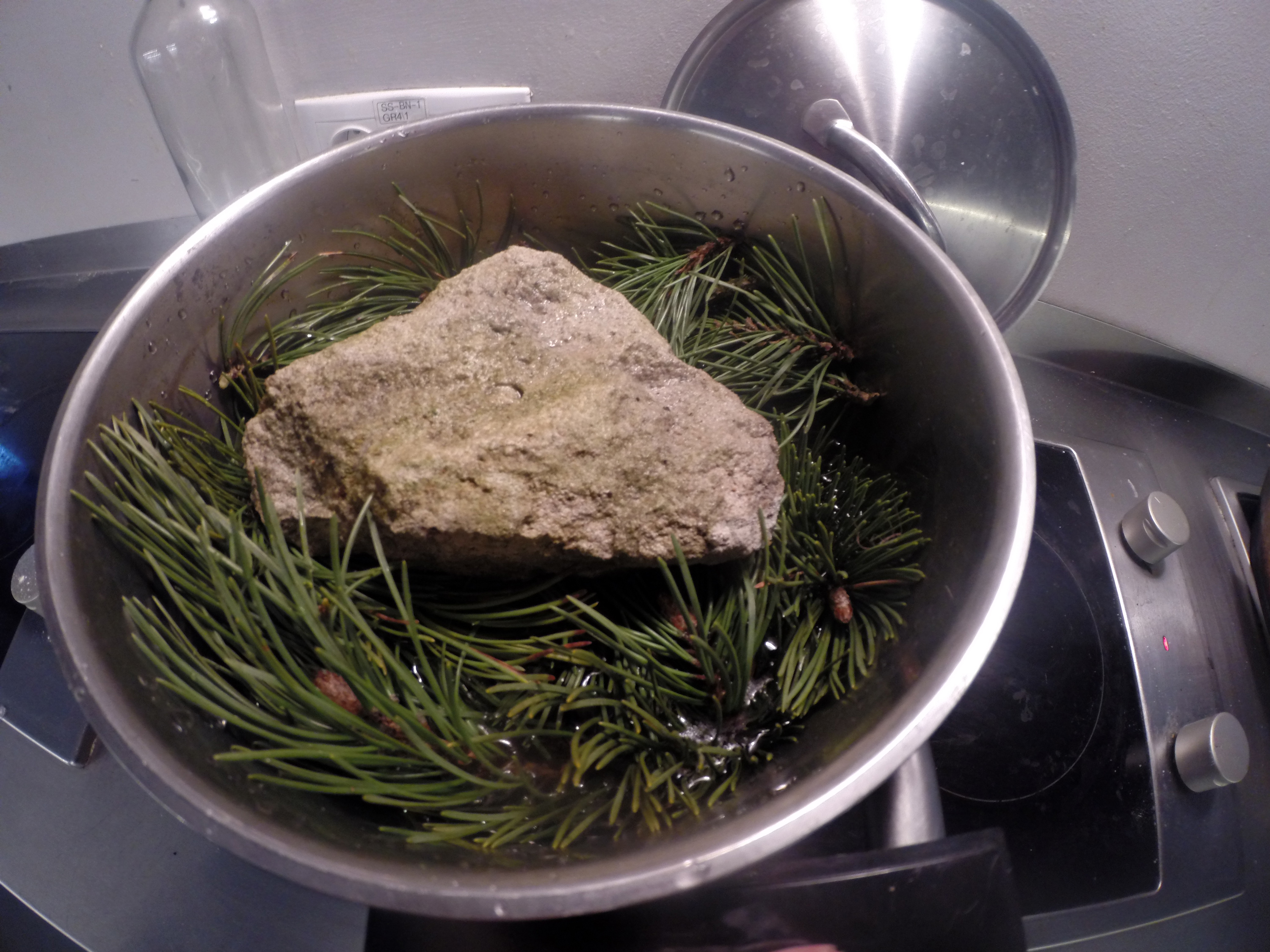 The first thing you'll need to do is to go pick some pine needles, cones and branches. Put your pine parts in a big pot, place a heavy stone on them to weigh them down, fill the pot with water until the pine is mostly submerged with water and let it boil for a minimum of one hour with the lid on the pot.