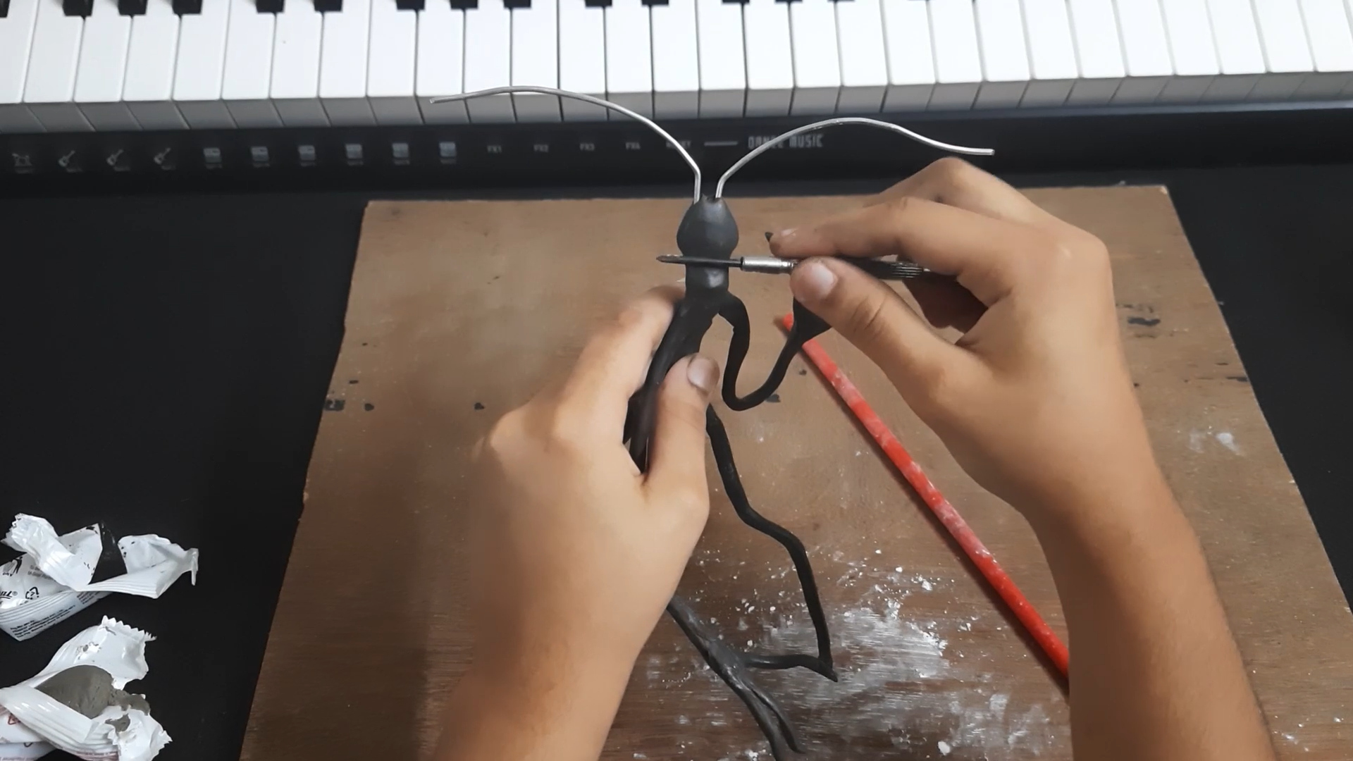 Now we can start adding the clay to wire frame model. I first shaped the clay into a basic form to serve as the foundation , then I added the surface features using a screwdriver. Talcum powder was employed to prevent my hand from sticking to the epoxy clay[ M-seal epoxy].